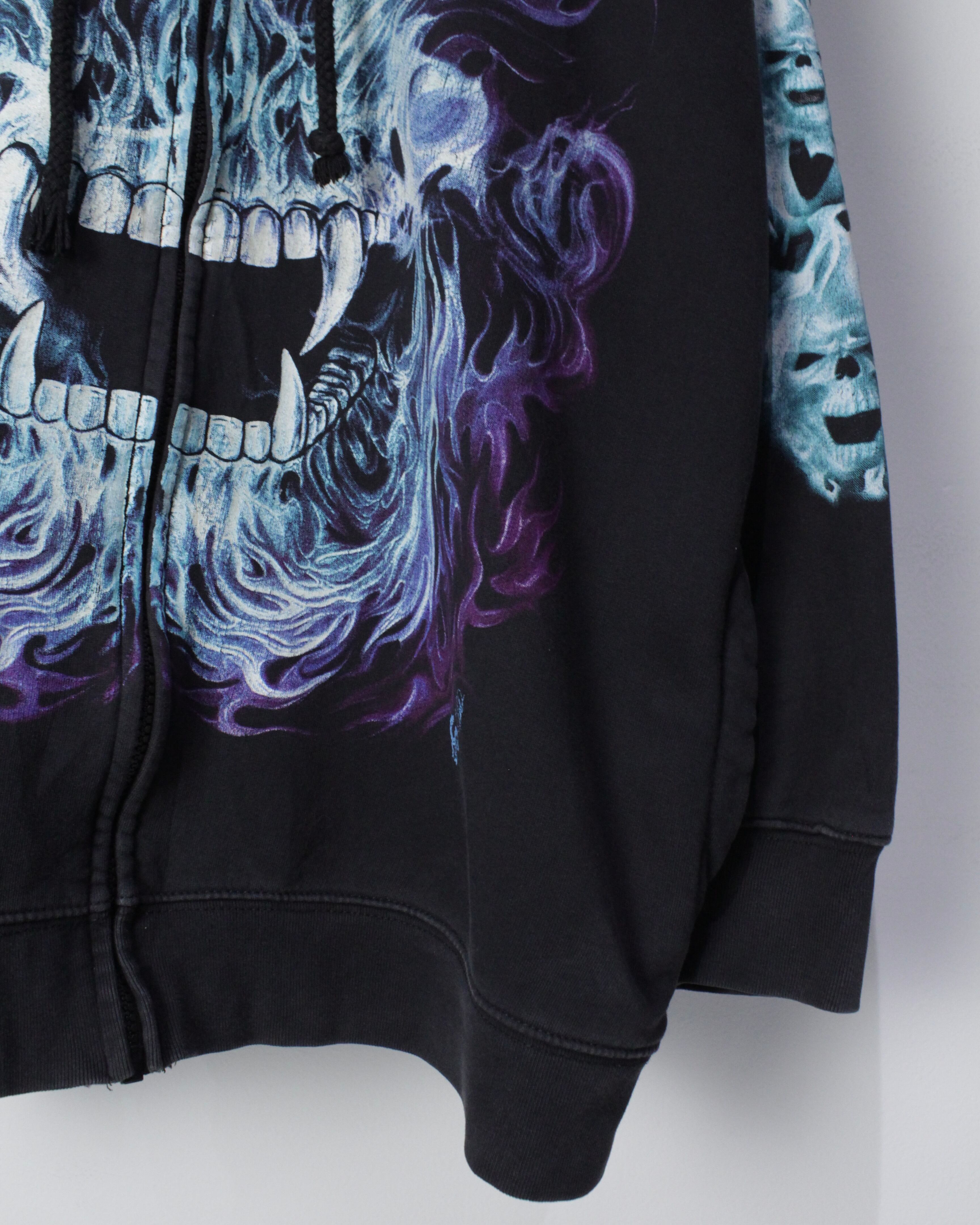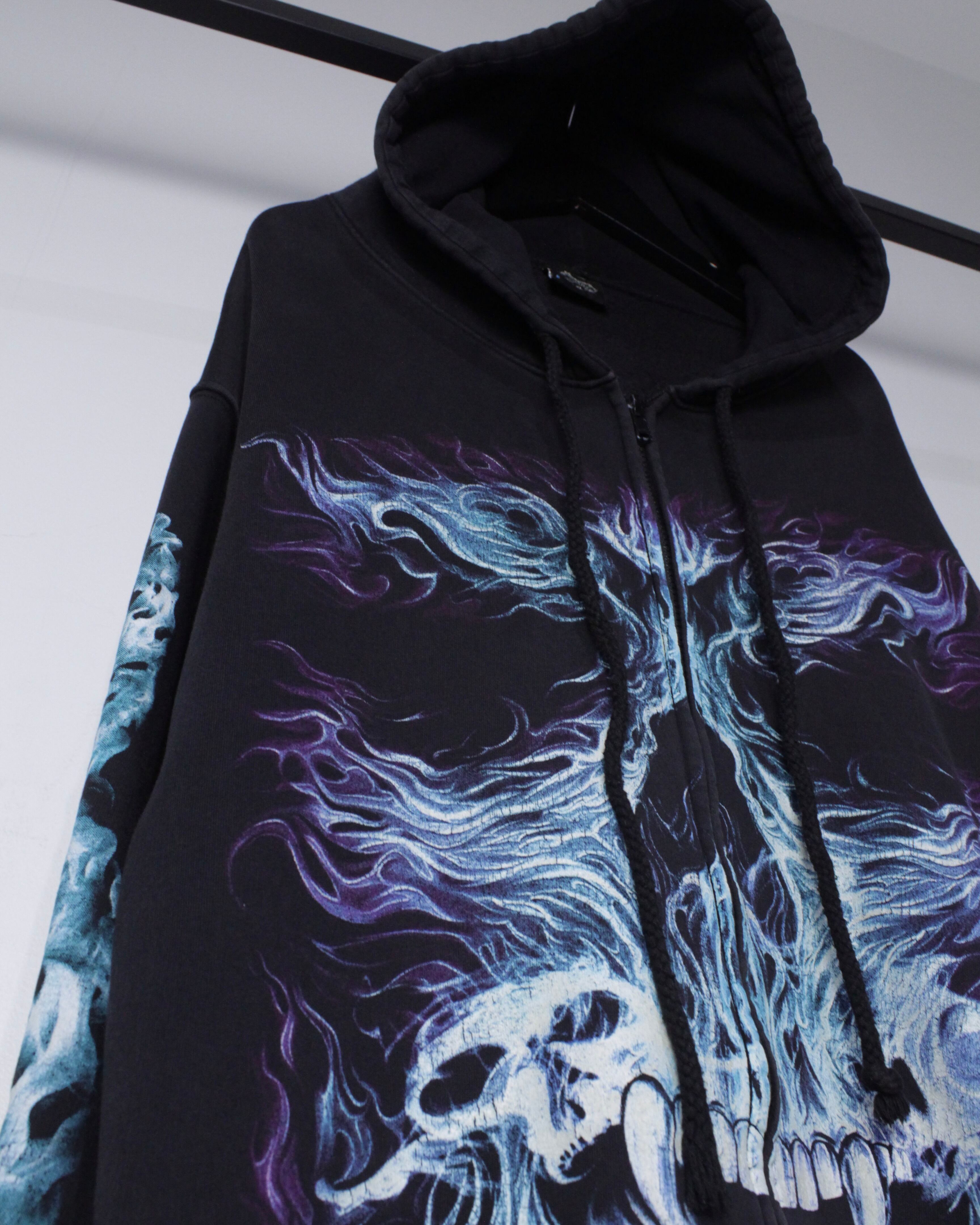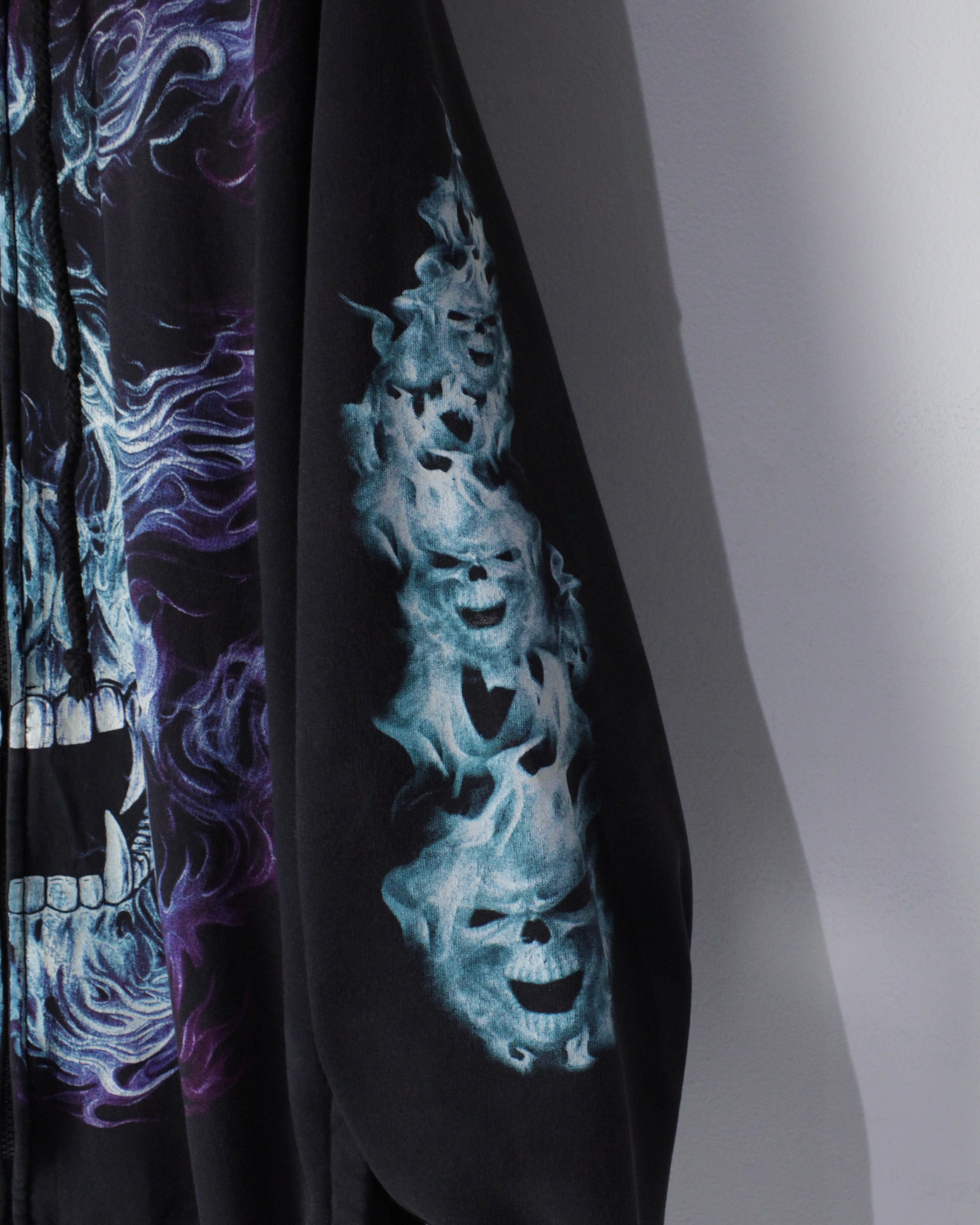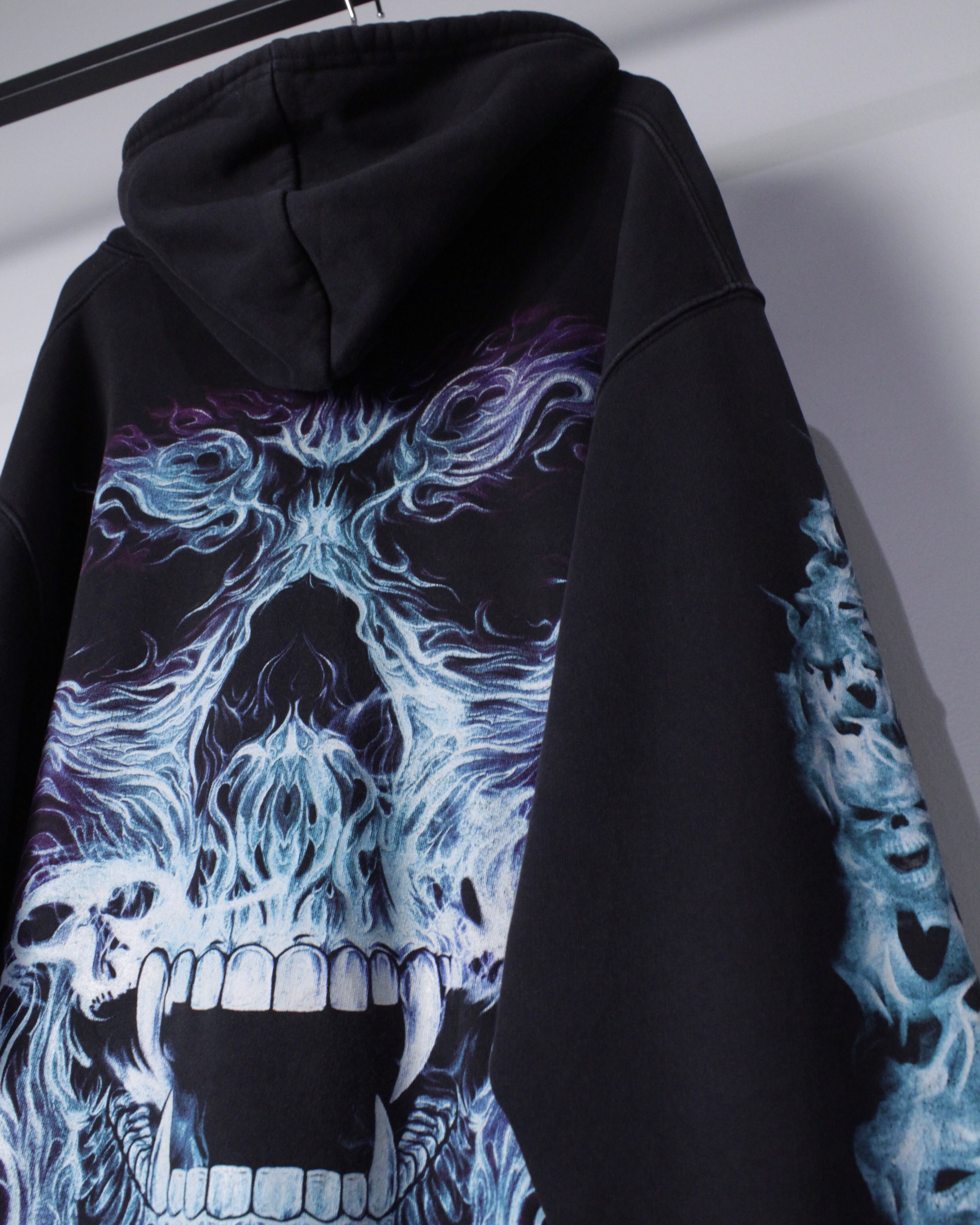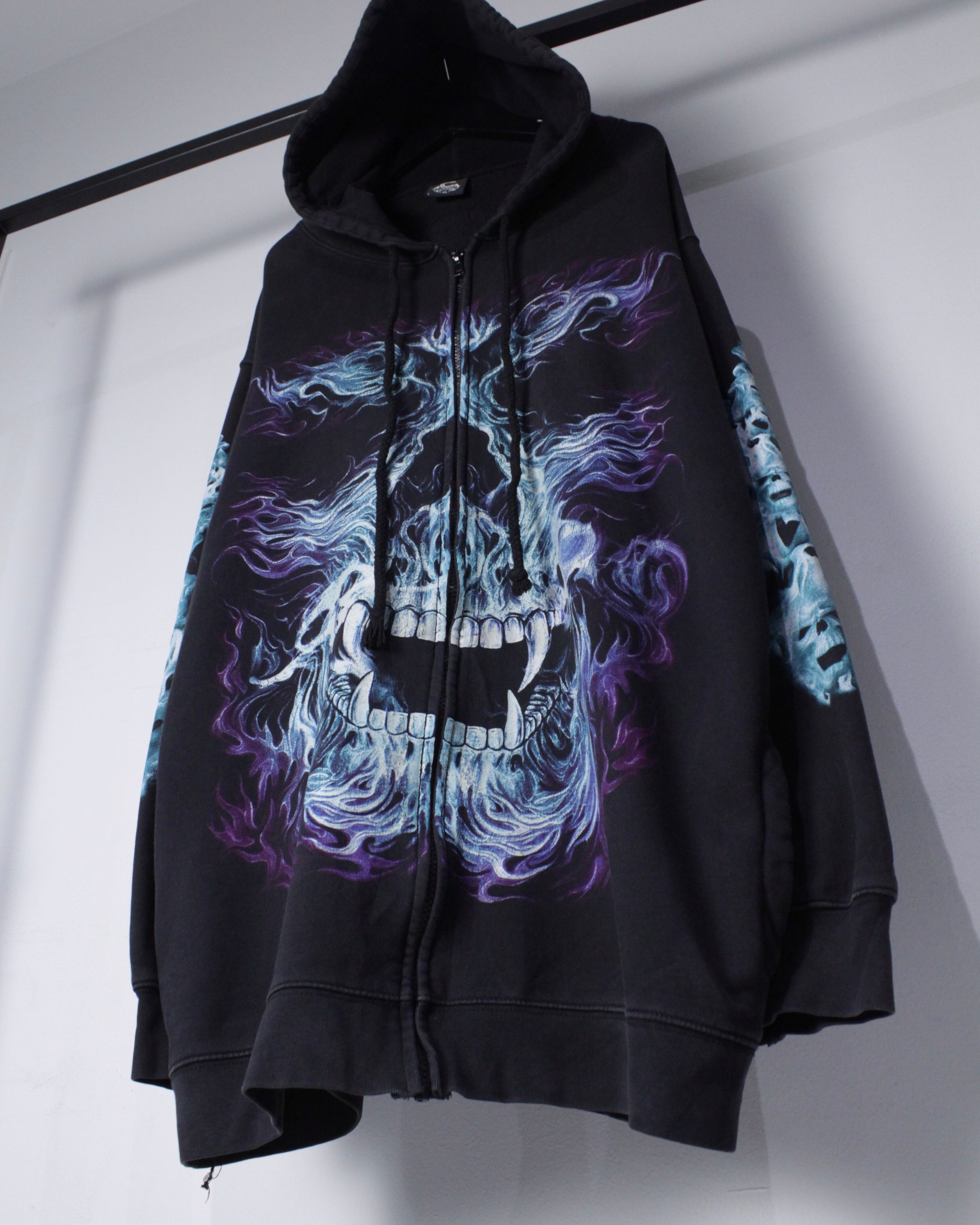 しっかりとしたコットンボディをベースに、フロントはジップ仕様で着脱もしやすく、フーディーデザインのためレイヤードにも取り入れやすいのが魅力。ストリートやバンドTシャツとの相性も抜群で、唯一無二の存在感を演出します。