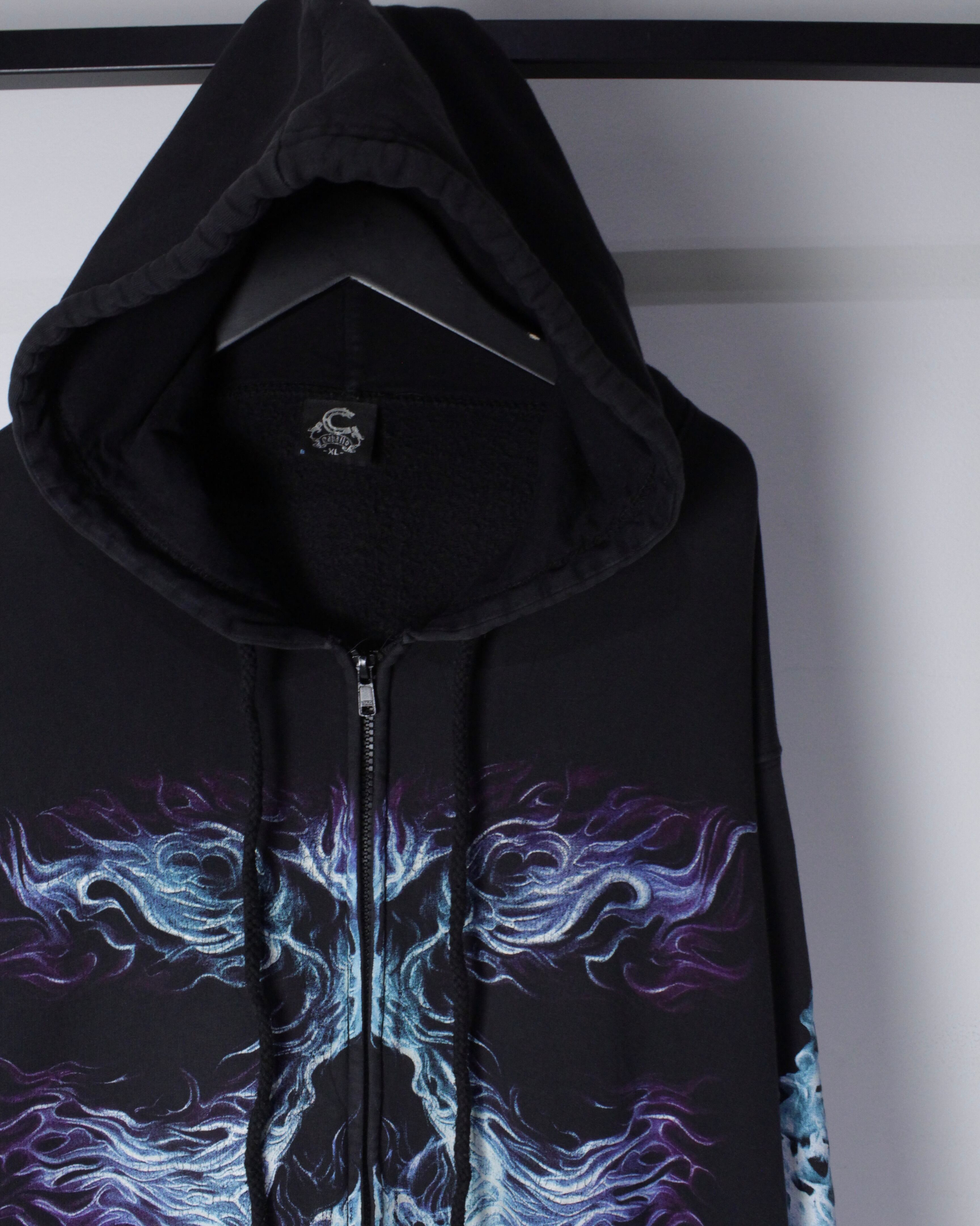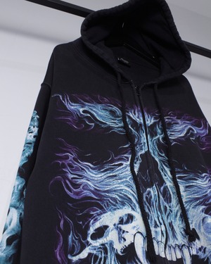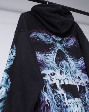 ボディ全面に施された迫力のあるスカルプリントは、まるで炎が揺らめくかのように描かれたアートワーク。ブルーからパープルにかけてのグラデーションが妖艶で、フロント、背面ともに視線を奪うインパクトを放っています。