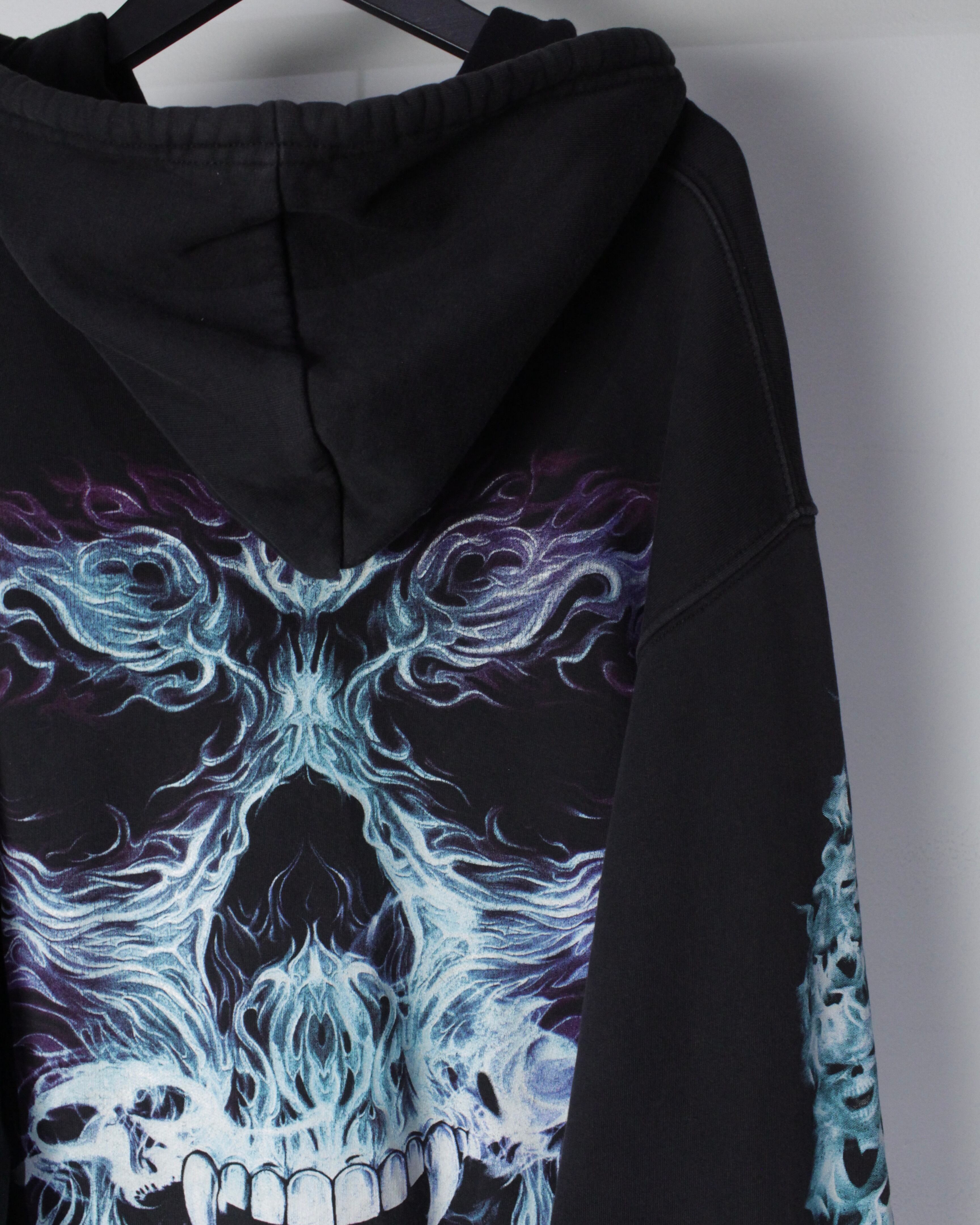 さらに両袖にも同様のスカルモチーフが配され、全方位で抜かりのないデザイン性を誇る一枚。