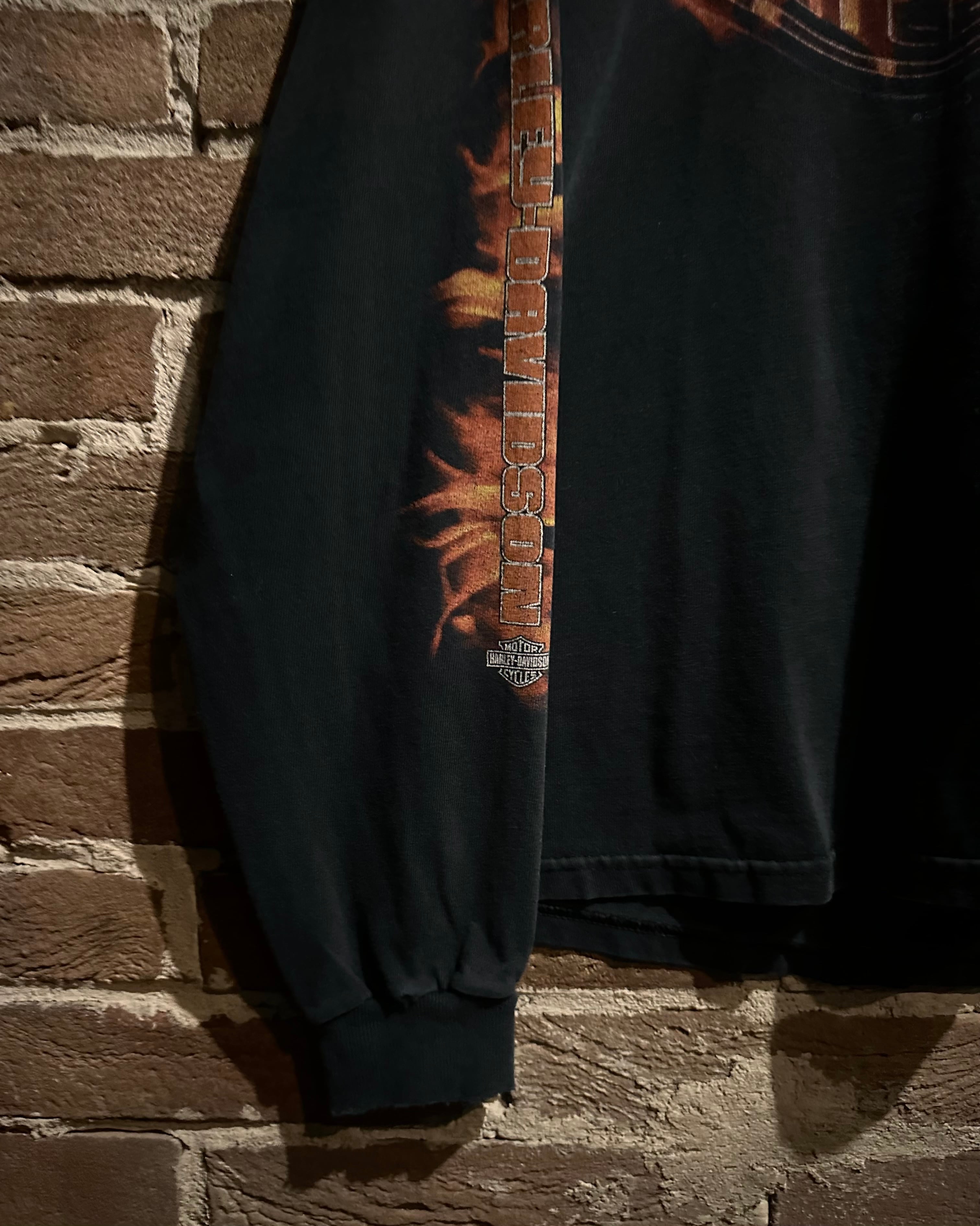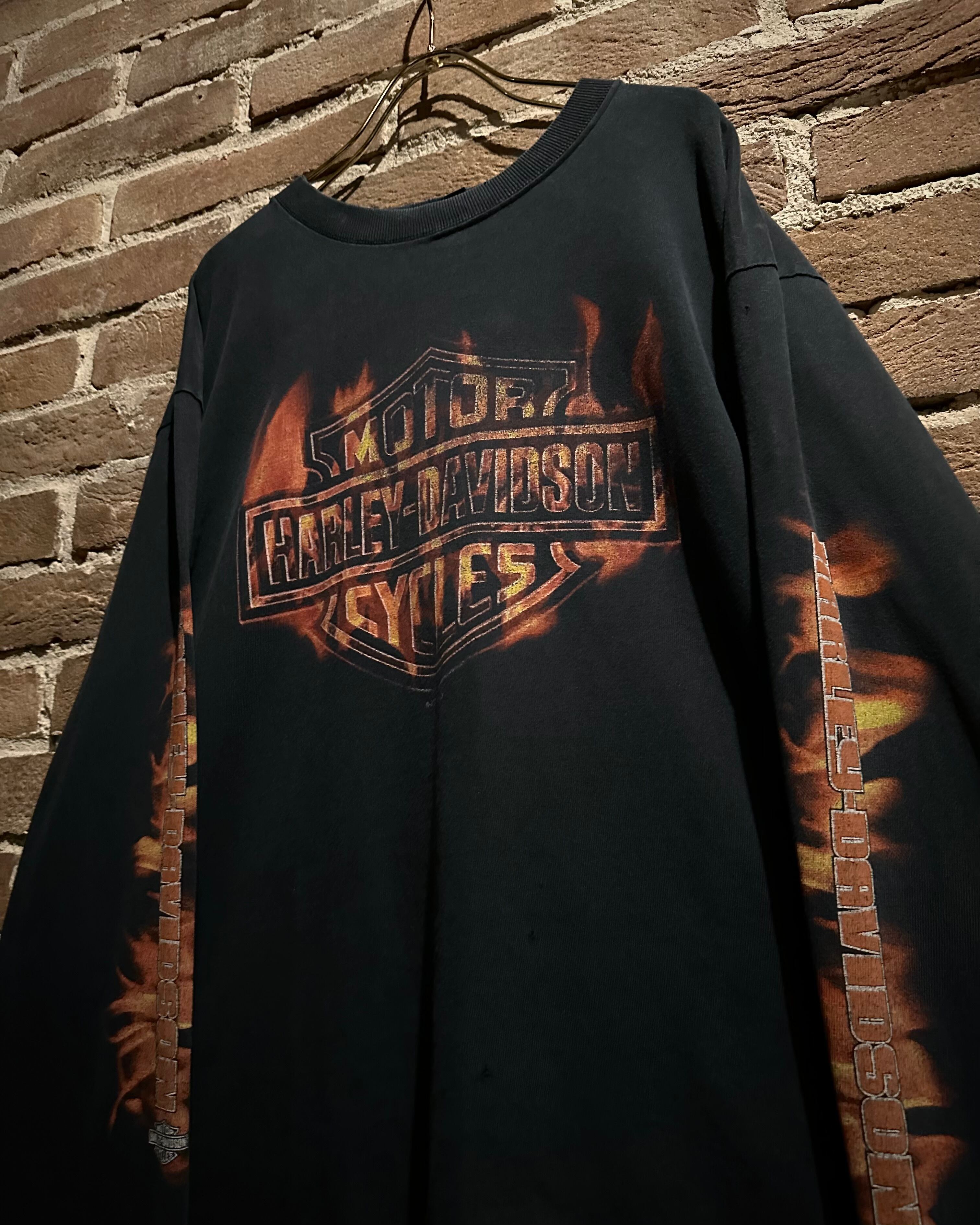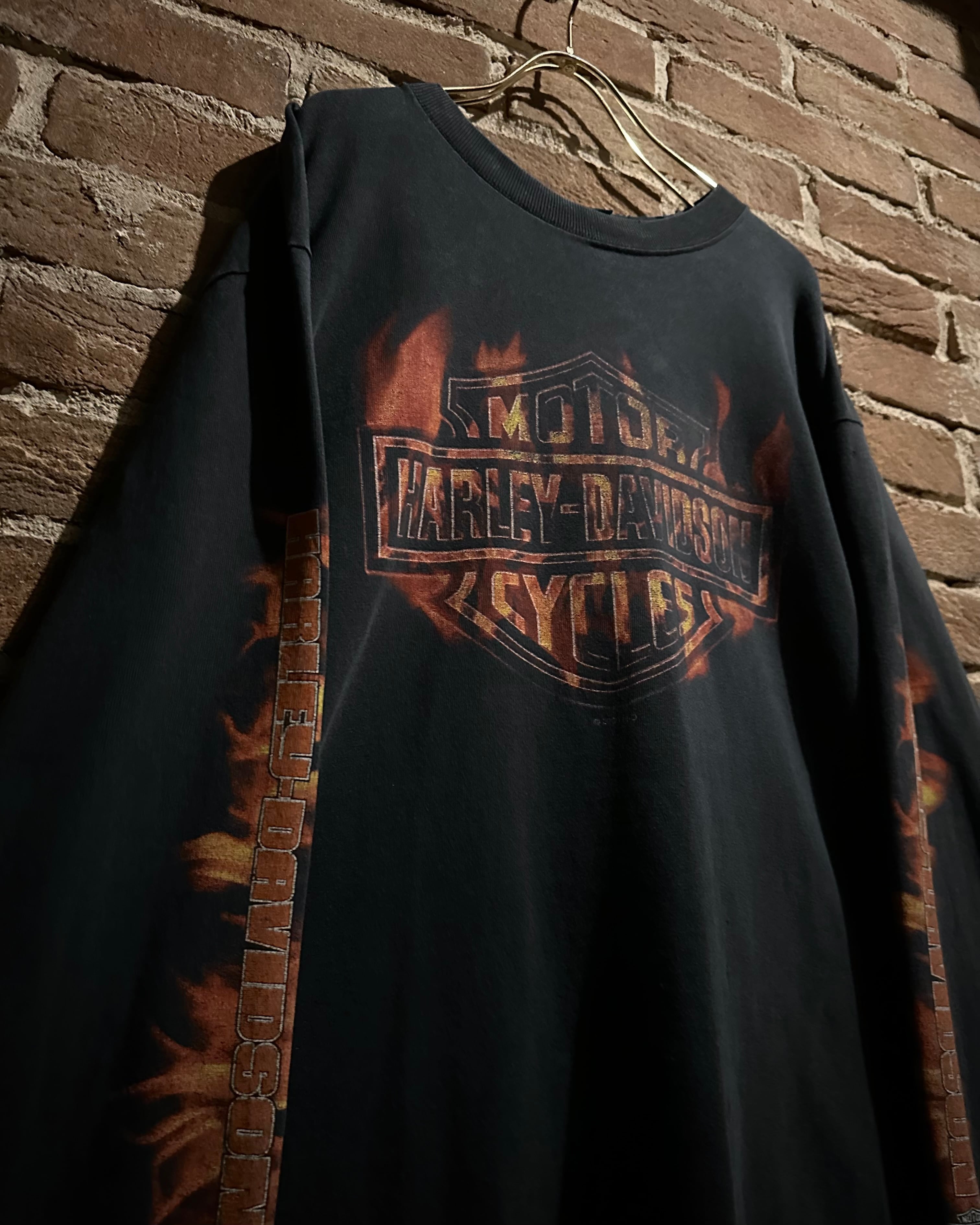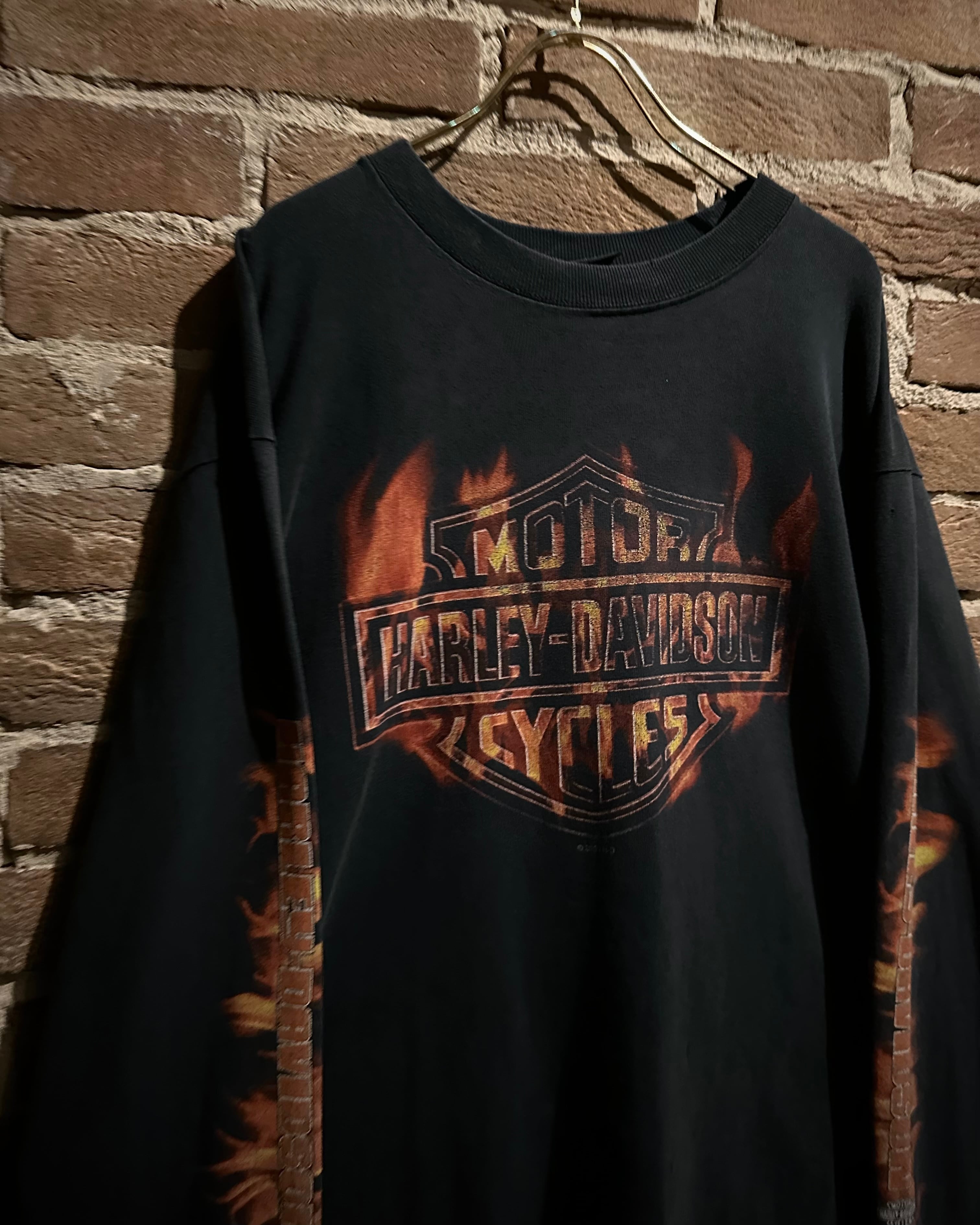 漆黒のボディに浮かび上がるフレイムプリントが圧倒的な存在感を放つ、“HARLEY DAVISON”のロングスリーブTシャツ。