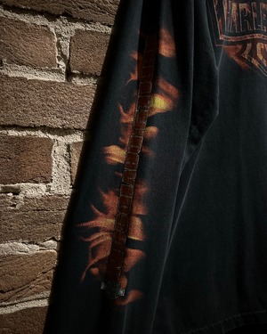ボディは着込まれたことでブラックが程よくフェードし、経年によるプリントの掠れや退色が、ヴィンテージならではの深みと武骨さを演出。新品では決して再現できない、この退廃的な雰囲気こそが古着ファンの心を掴むポイントです。タフで肉厚なコットンボディは、まだまだ着込むほどに風合いを増し、時間をかけてさらなる経年変化を楽しめる仕様。