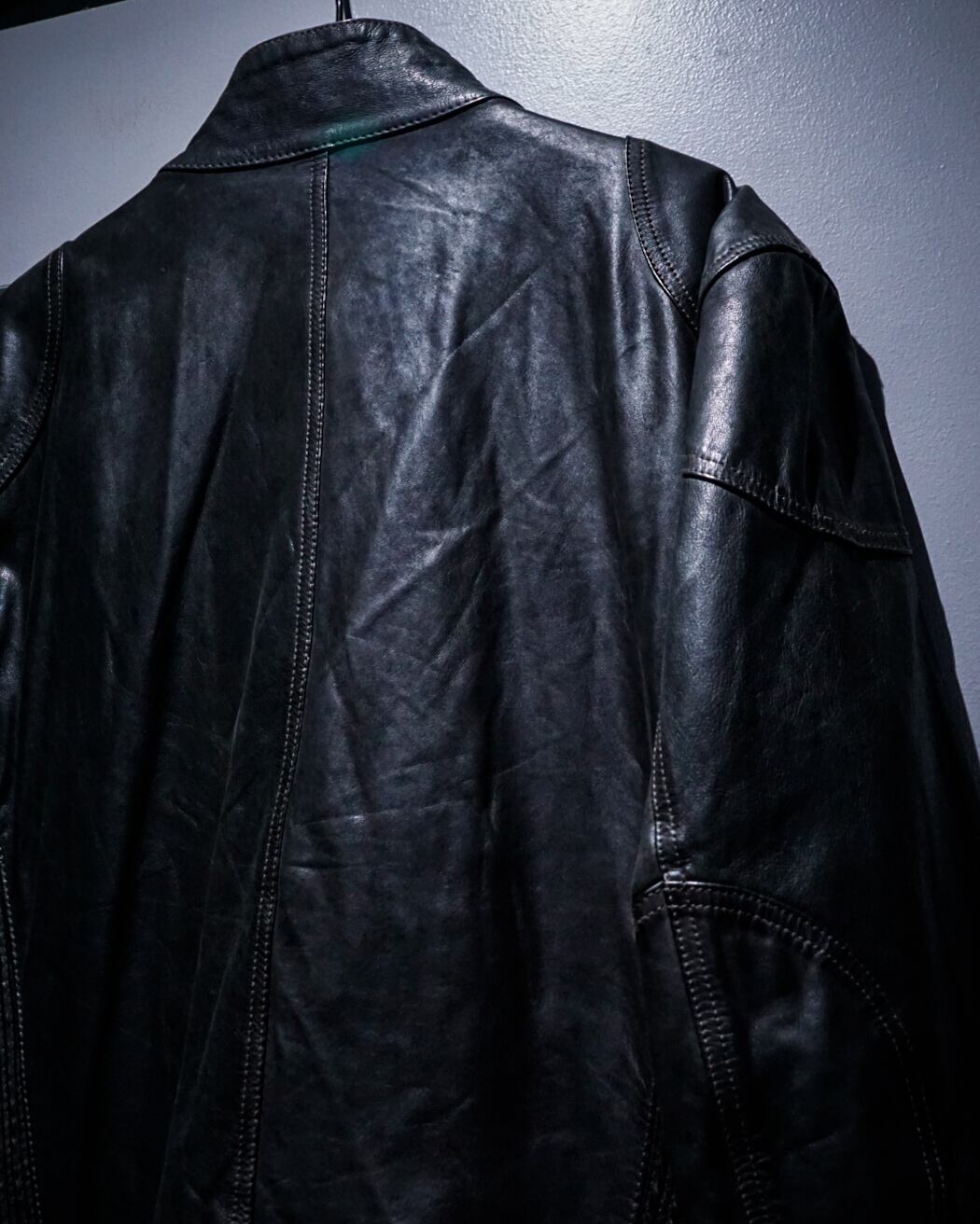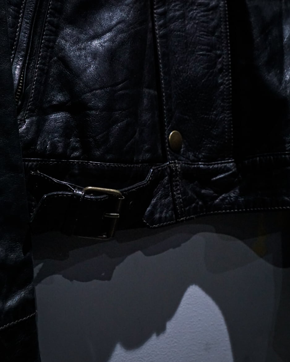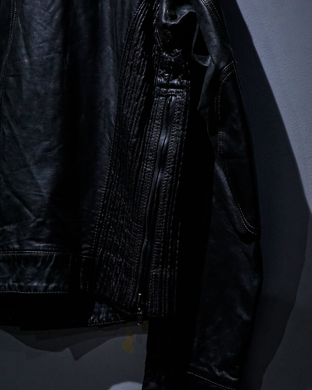 まず目を引くのは、艶感あるブラックレザーが持つ独特の鈍い光沢。しなやかで薄手の質感は、フェイクでは到底再現できないリアルレザーならではの迫力を纏っています。