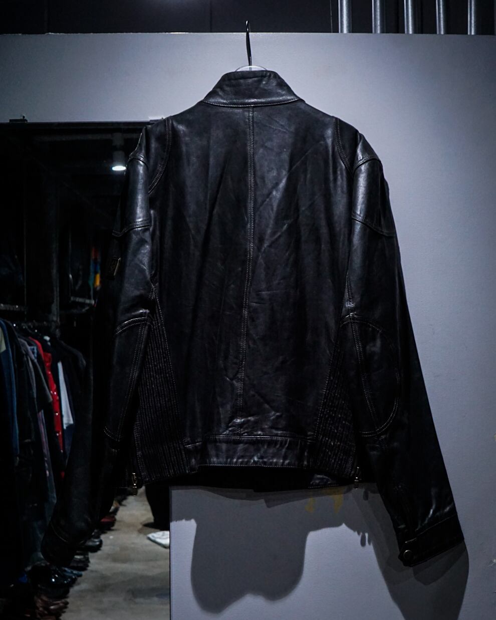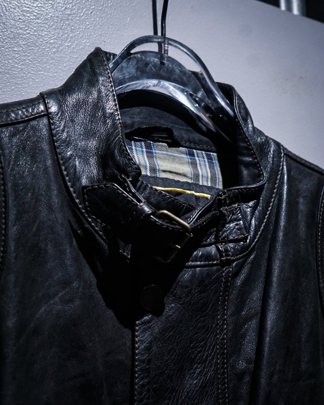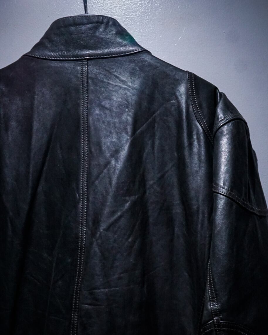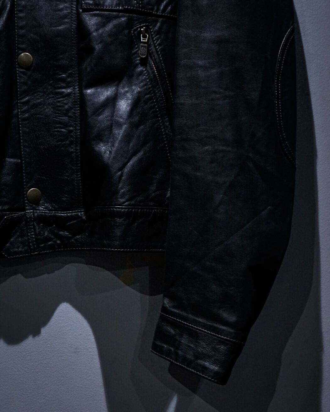まず目を引くのは、艶感あるブラックレザーが持つ独特の鈍い光沢。しなやかで薄手の質感は、フェイクでは到底再現できないリアルレザーならではの迫力を纏っています。