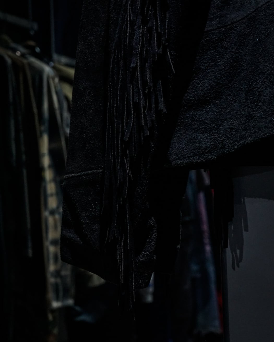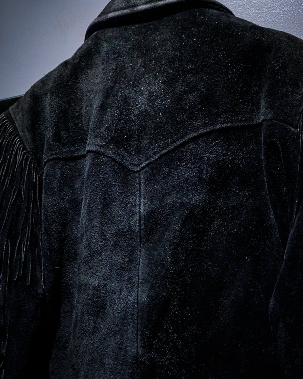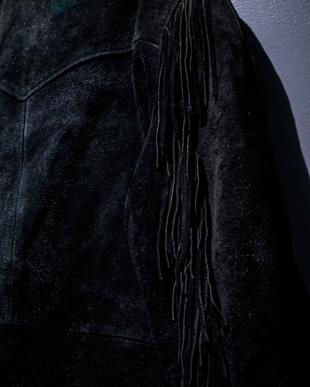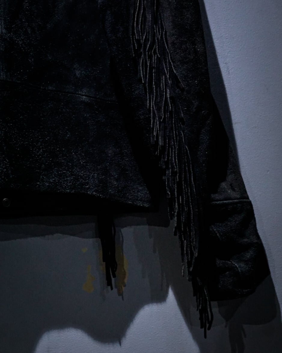 肩から前身頃にかけて大胆に配されたフリンジは動きに合わせて揺れ動き、独特のリズムを生み出す仕掛け。スエード特有のしっとりと起毛だった質感が、フリンジの存在感をより一層際立たせています。