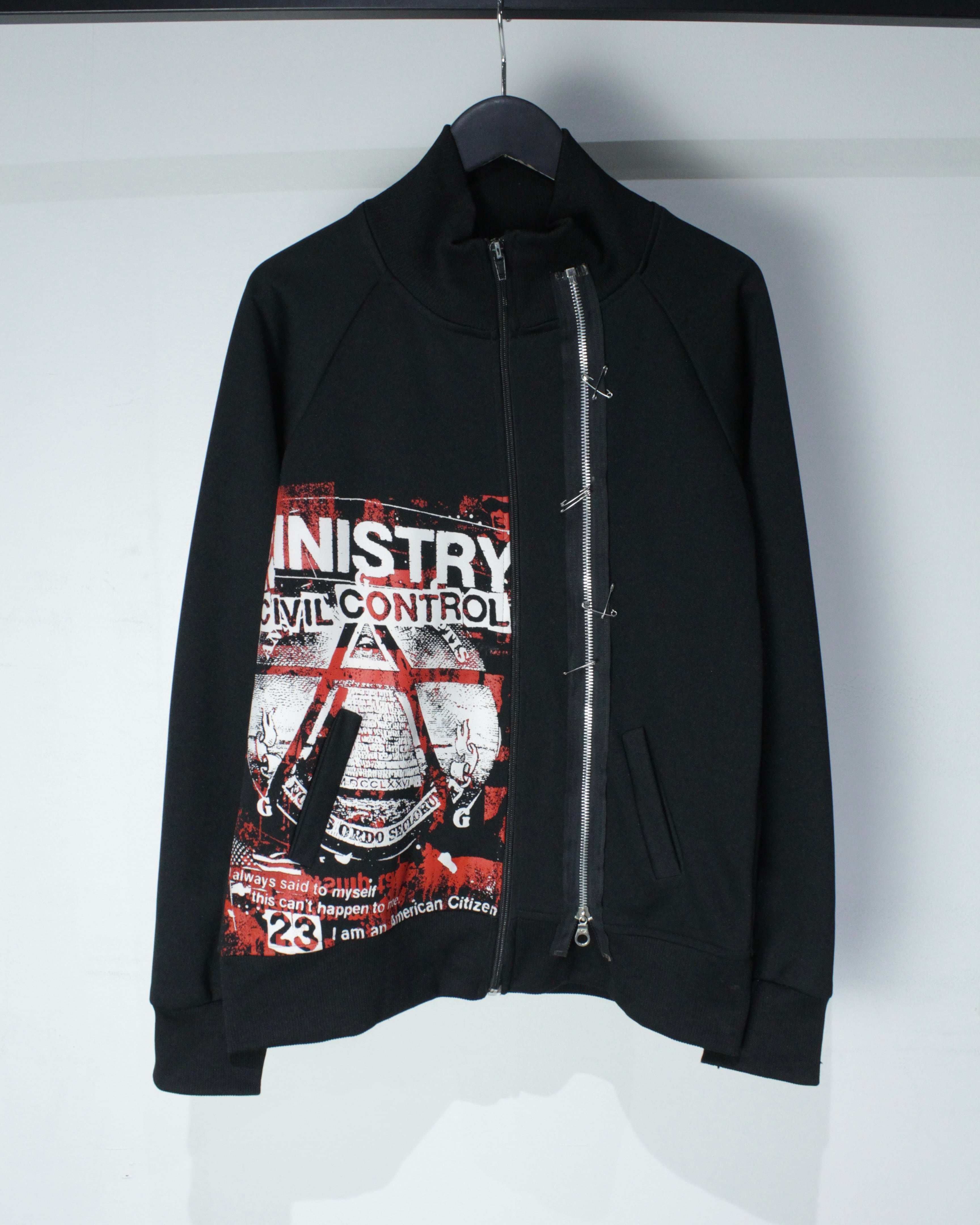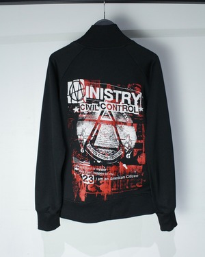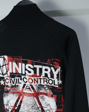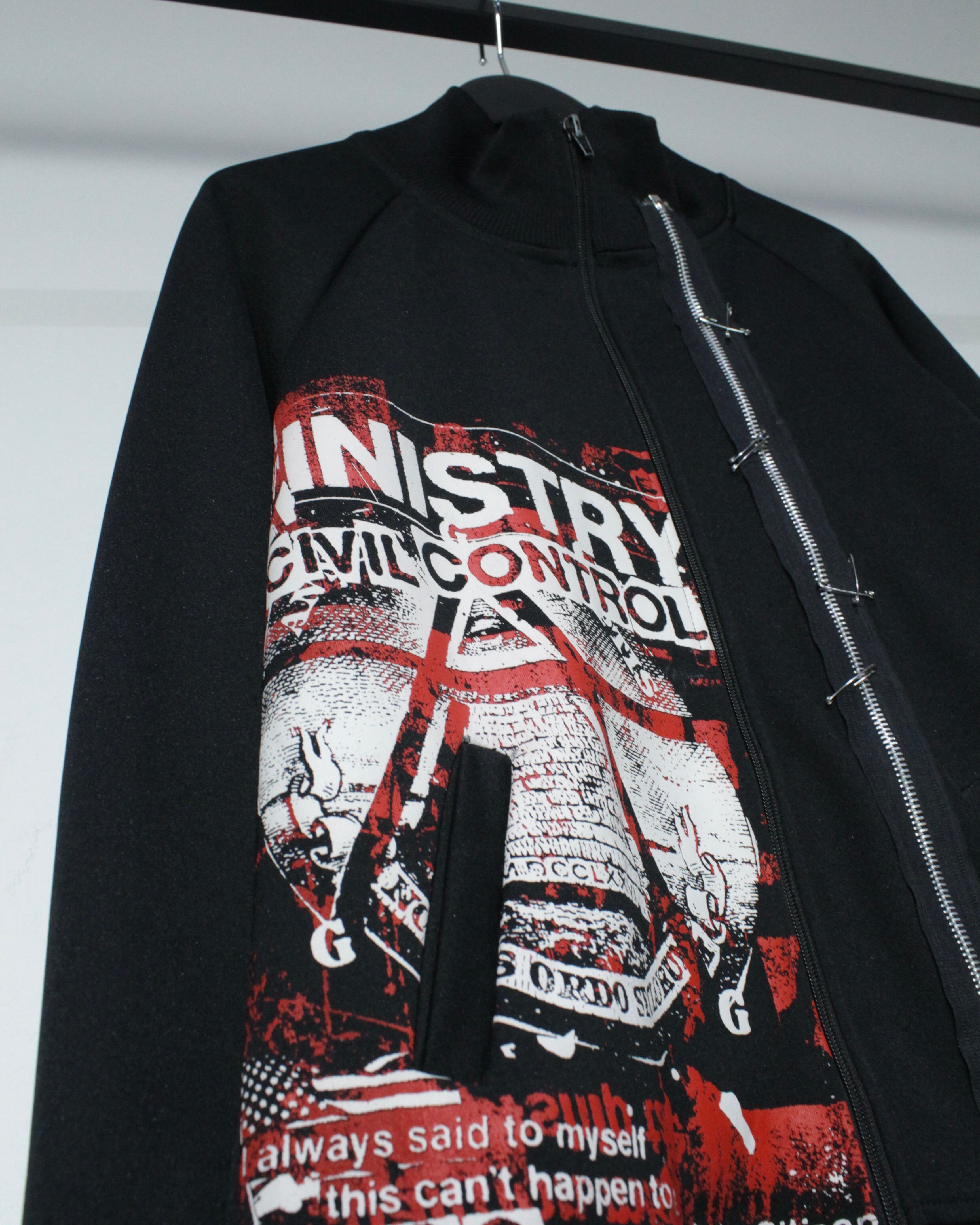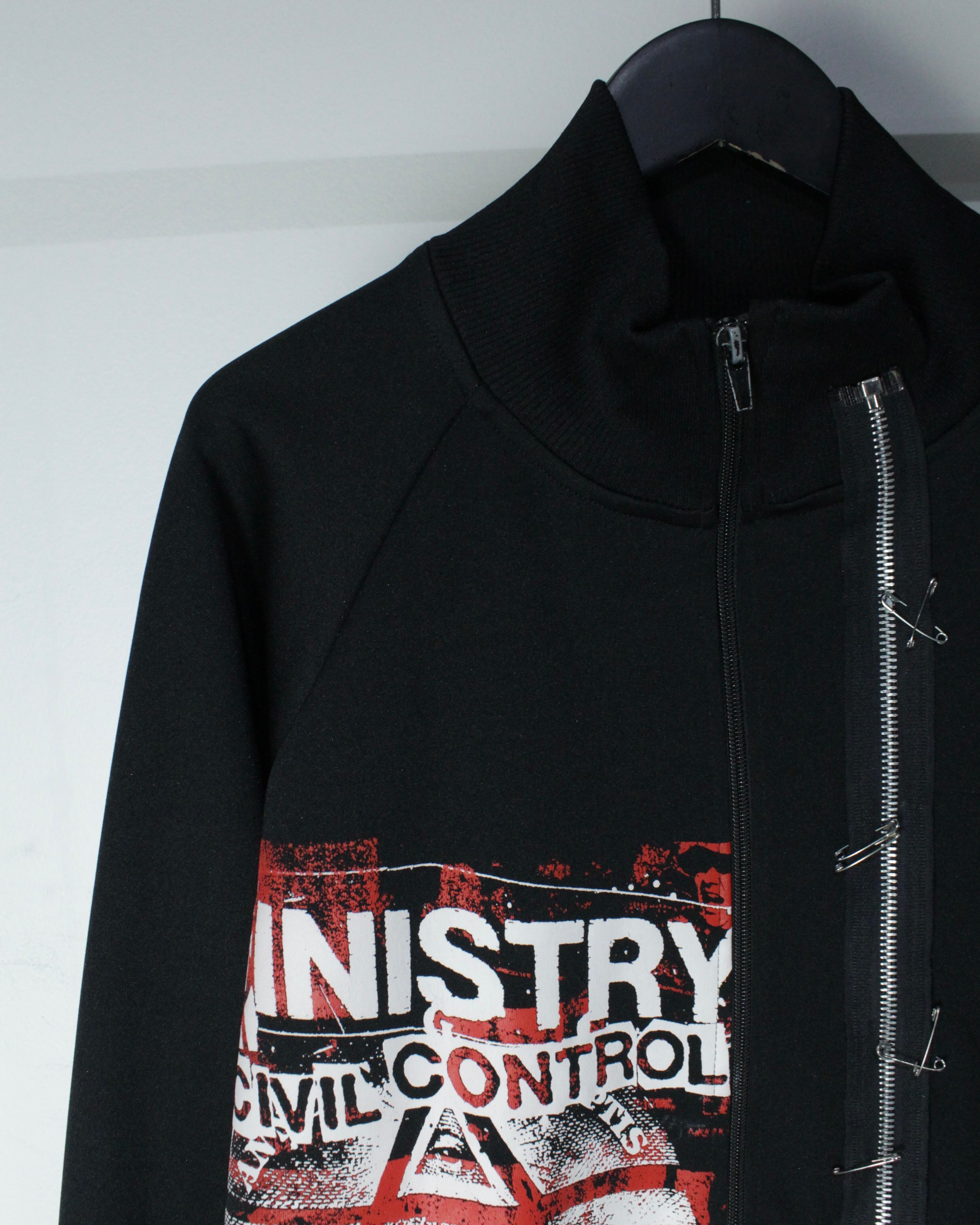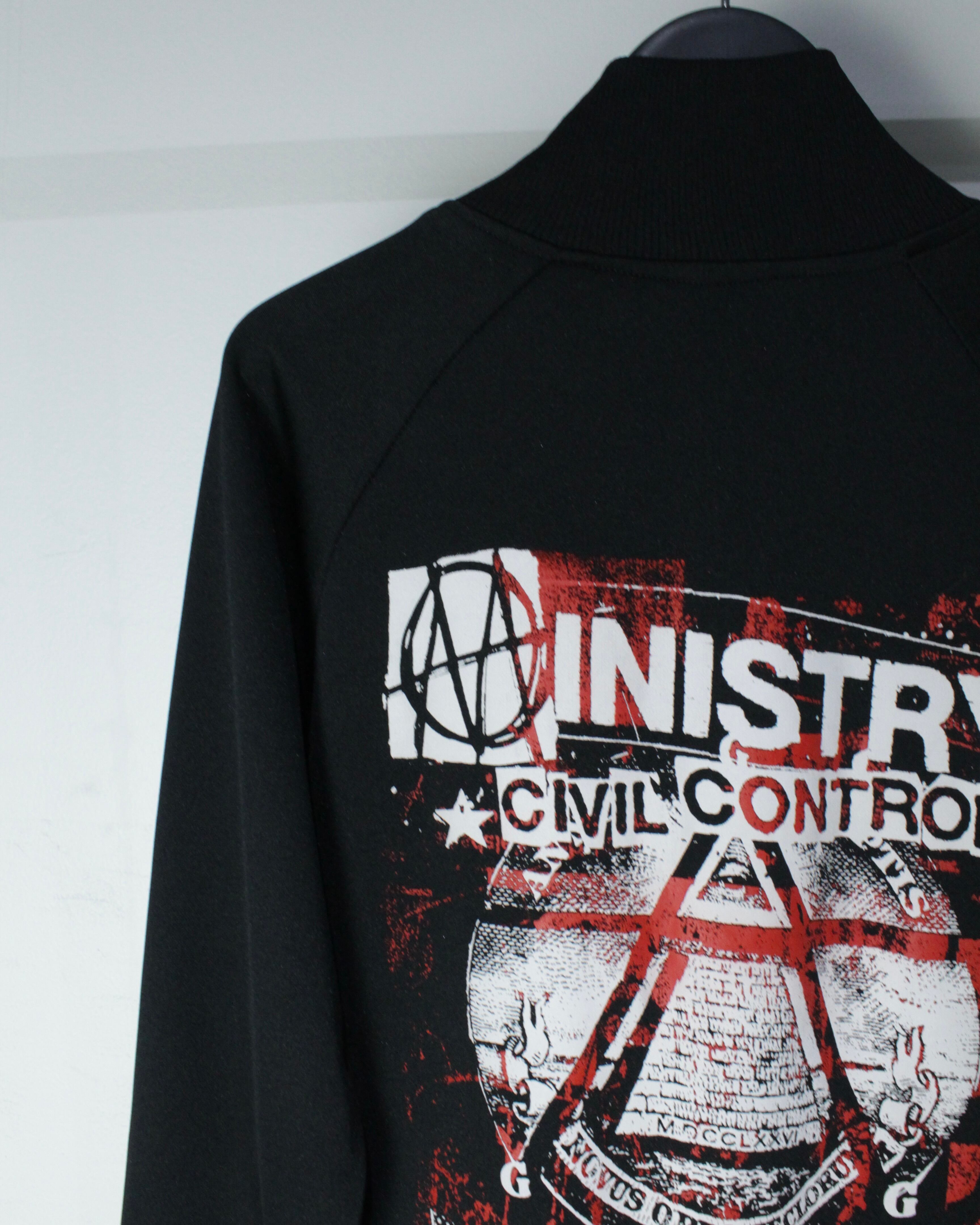 ブラックボディをベースに、フロントと背面へ大胆に走らせた「MINISTRY / CIVIL CONTROL」のグラフィックが、ダークな存在感を放つトラックジャケット。