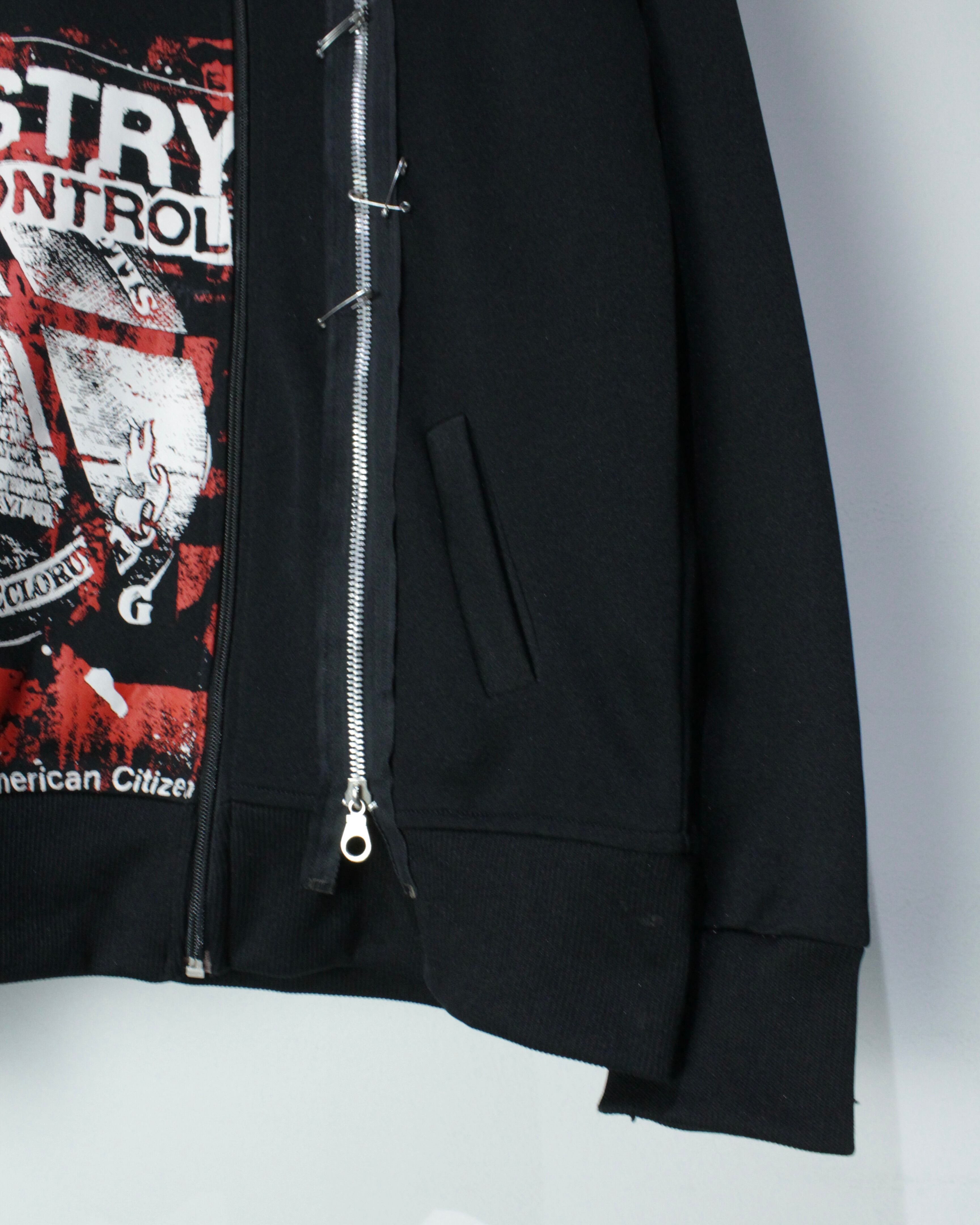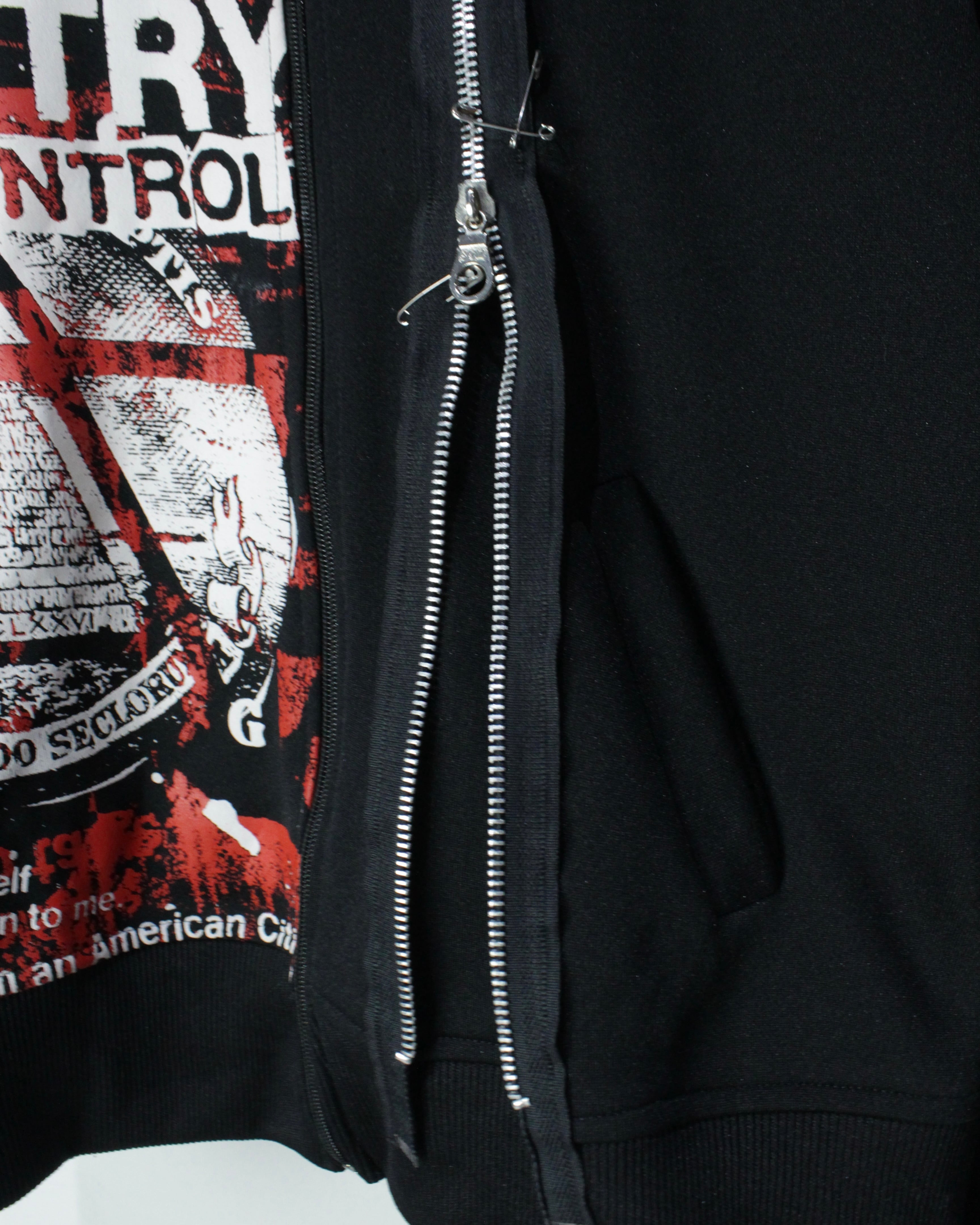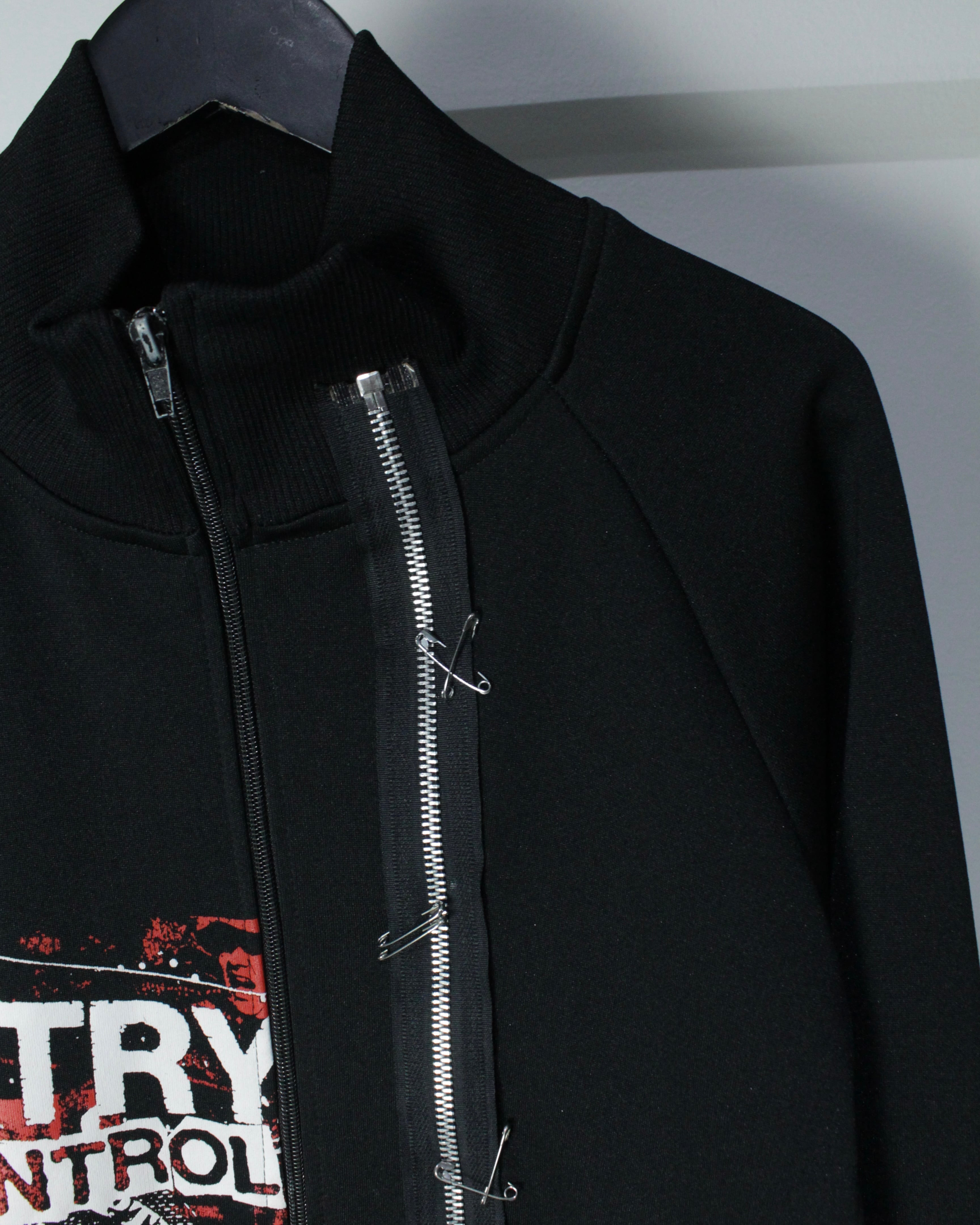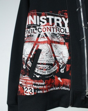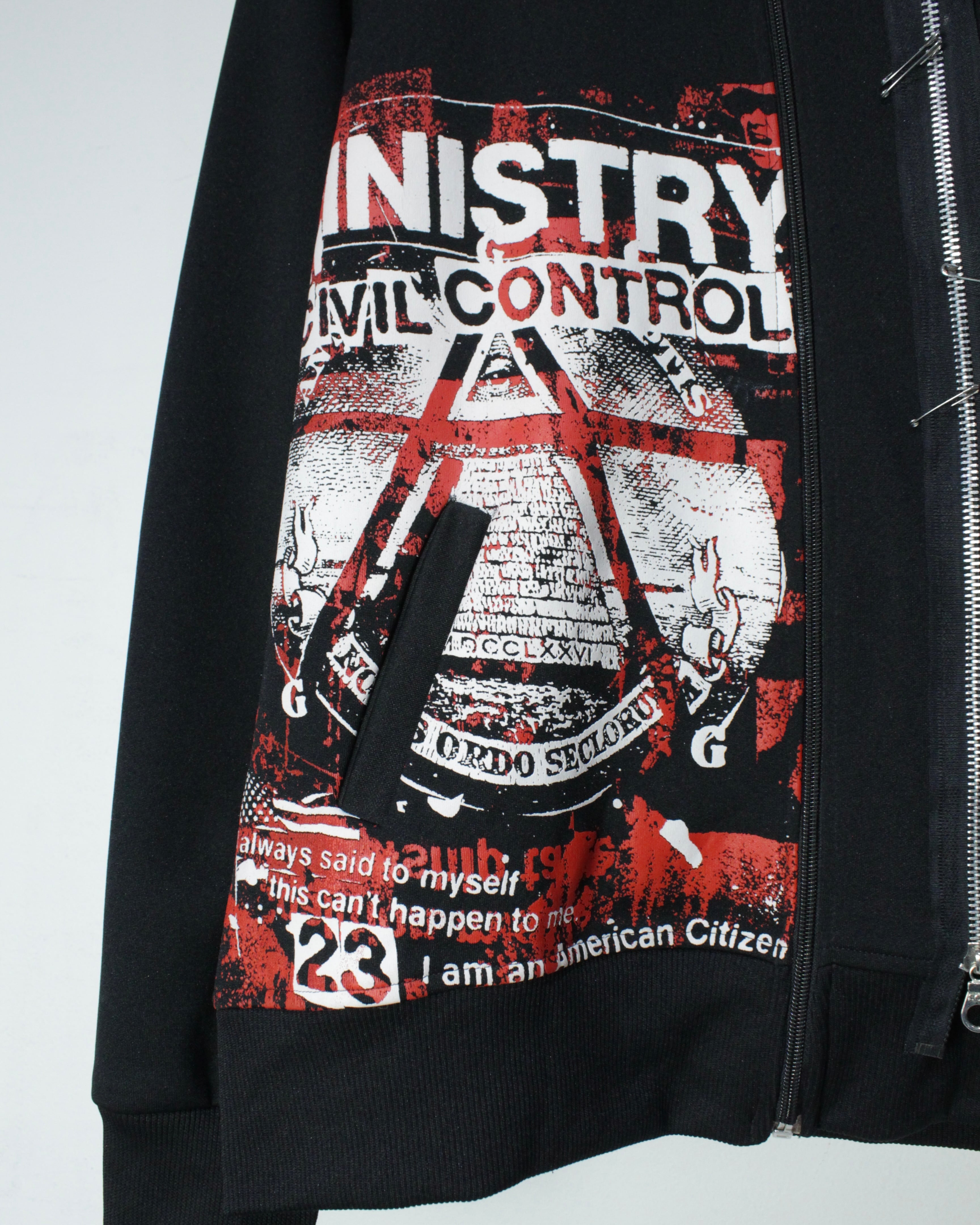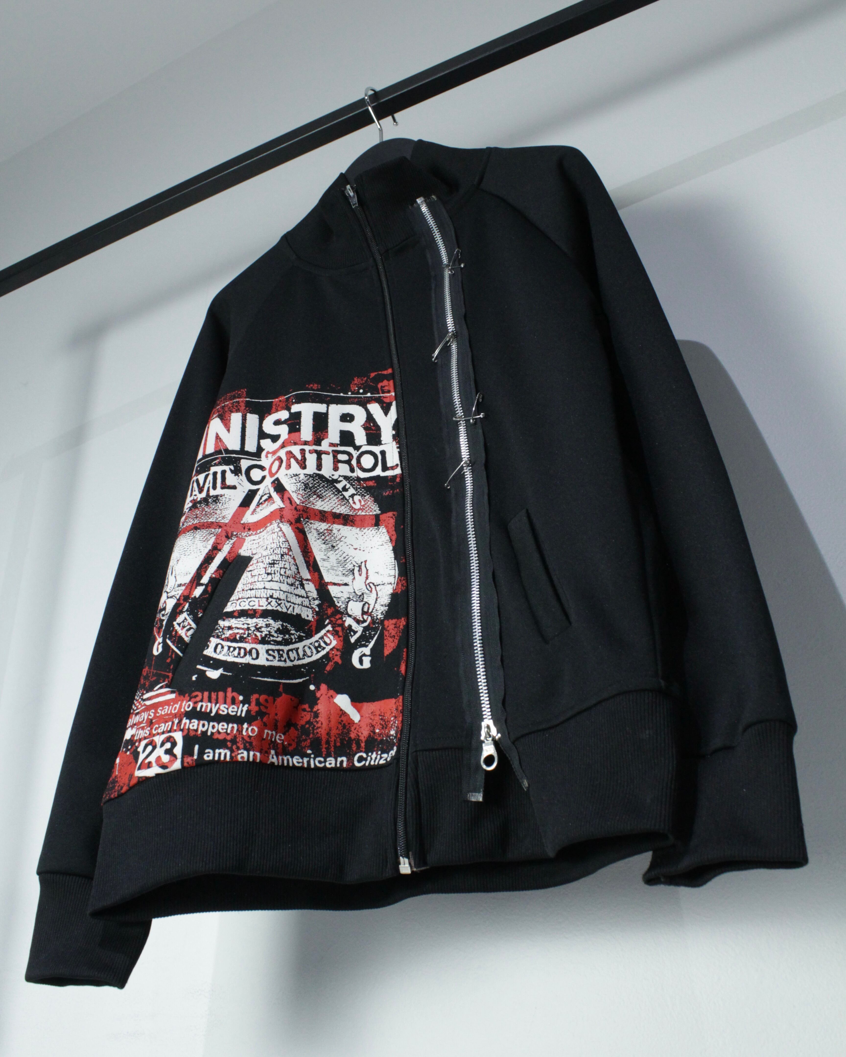 ブラックボディをベースに、フロントと背面へ大胆に走らせた「MINISTRY / CIVIL CONTROL」のグラフィックが、ダークな存在感を放つトラックジャケット。