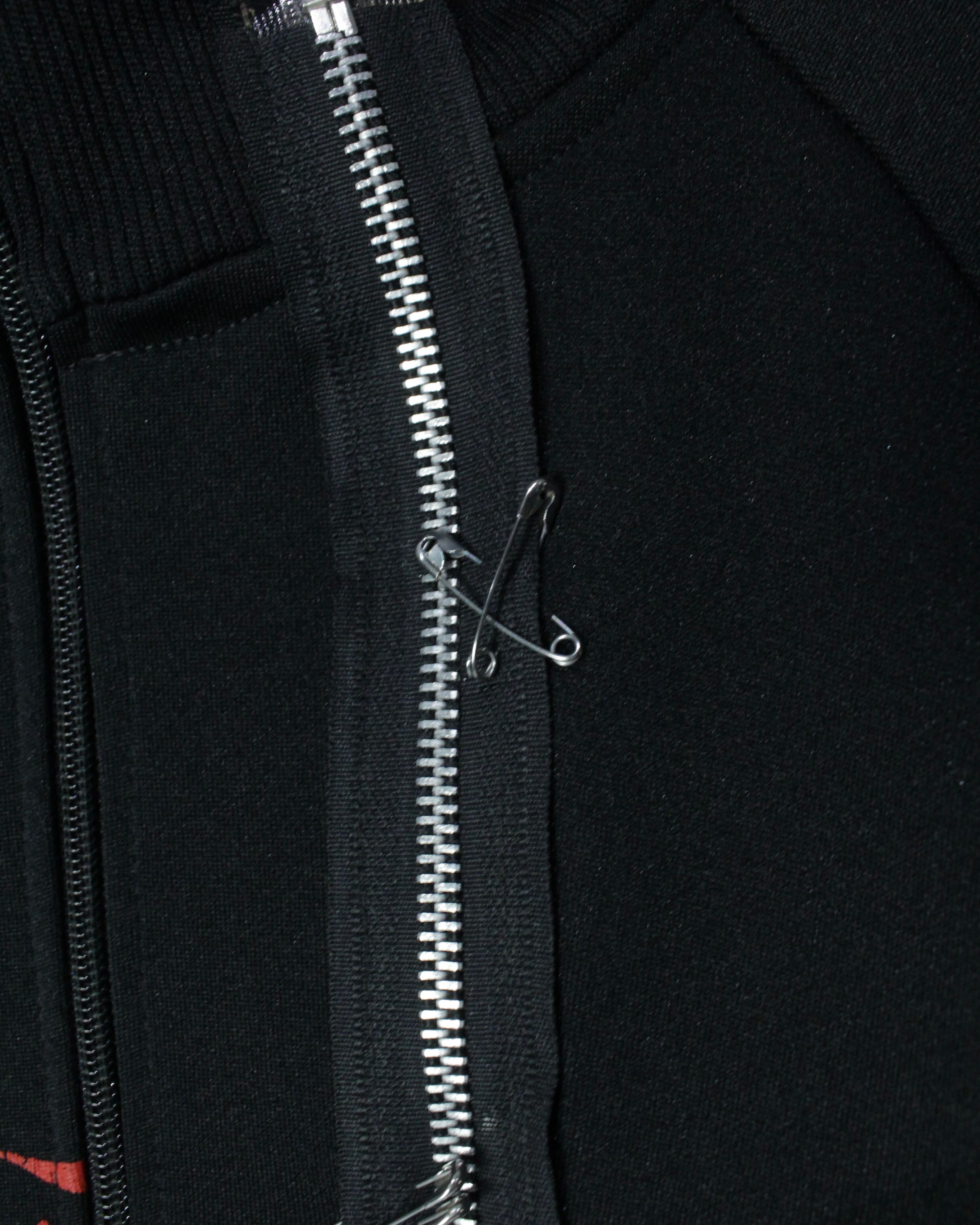 ボディ左側にはジップテープと安全ピンのカスタム。直線的なジップに無秩序なメタルの輝きを差し込み、ゴシックパンクを思わせるアイコニックなディテールへと昇華。