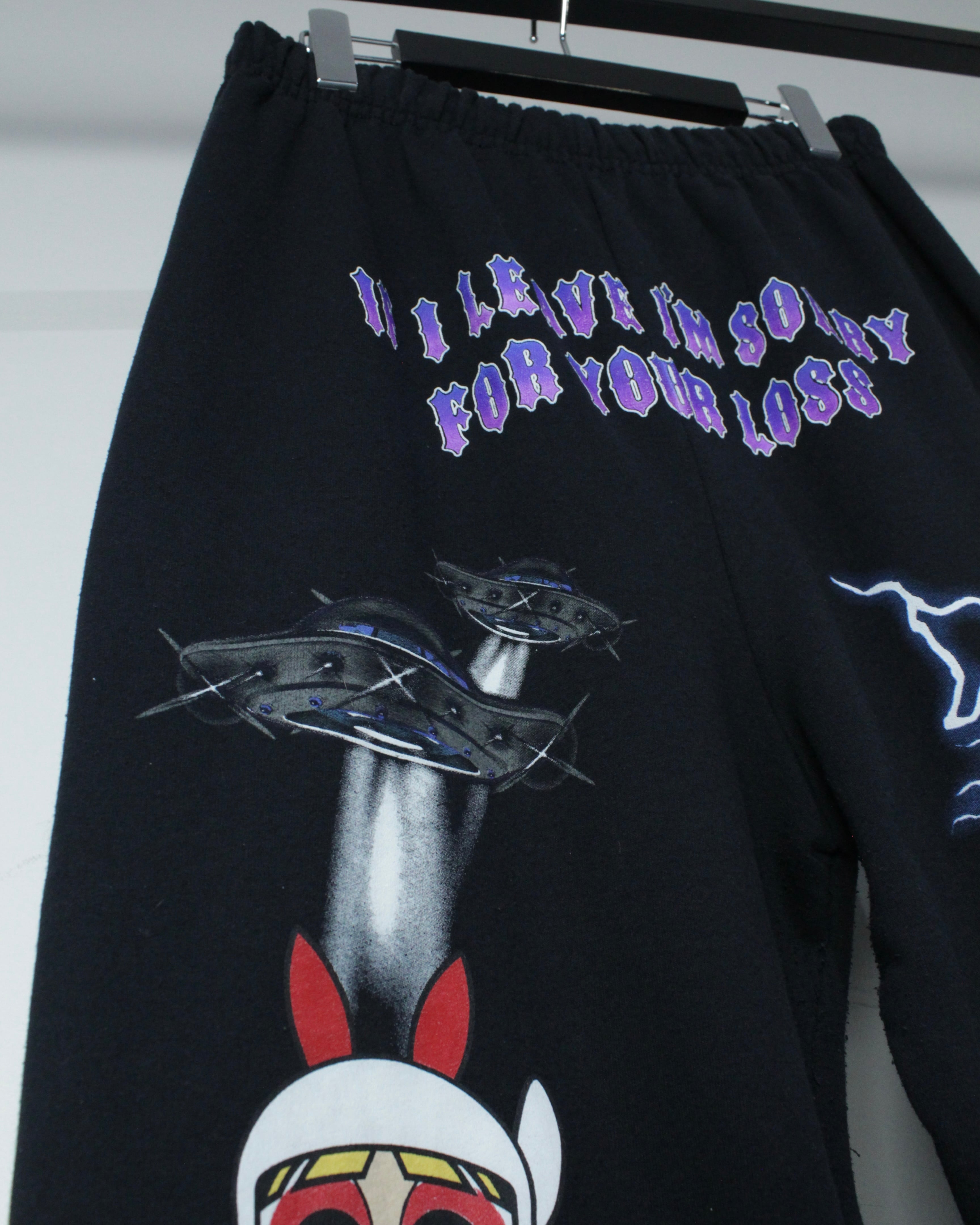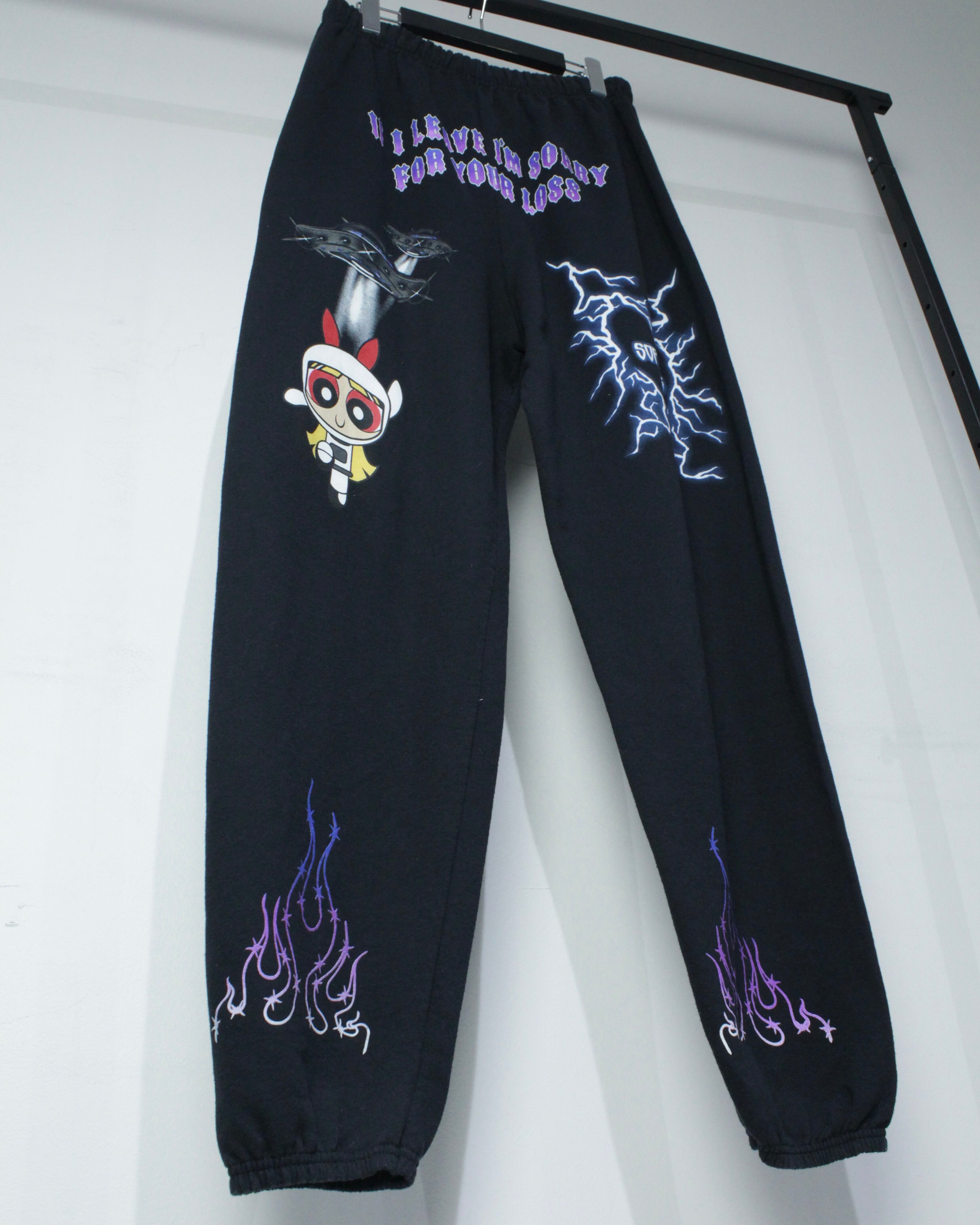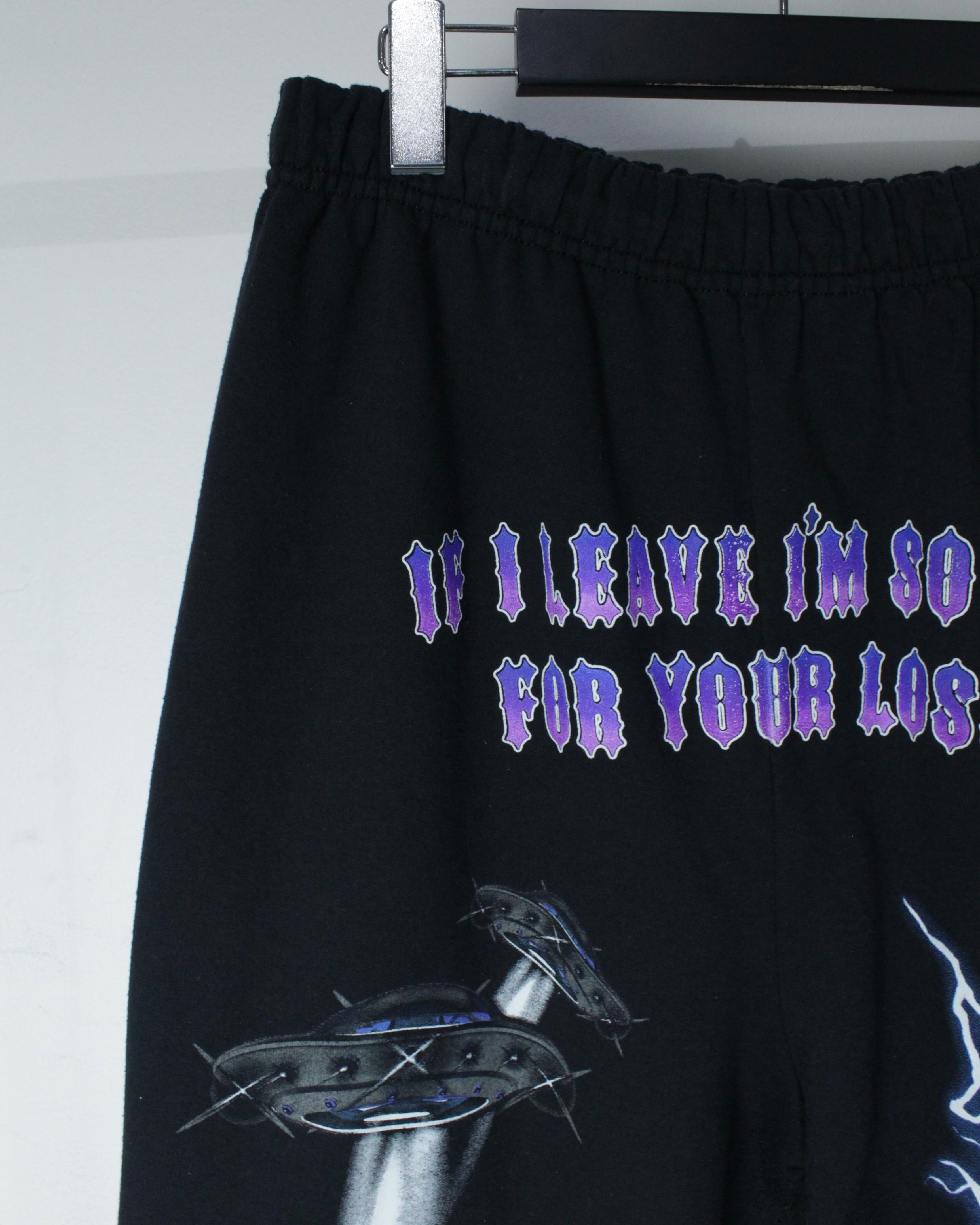 フロント中央には「IF I LEAVE I’M SORRY FOR YOUR LOSS」と光を放つようなパープルグラデーションのレタリングを大胆にプリントし、言葉そのものが持つメッセージ性と共に圧倒的な存在感を放っています。