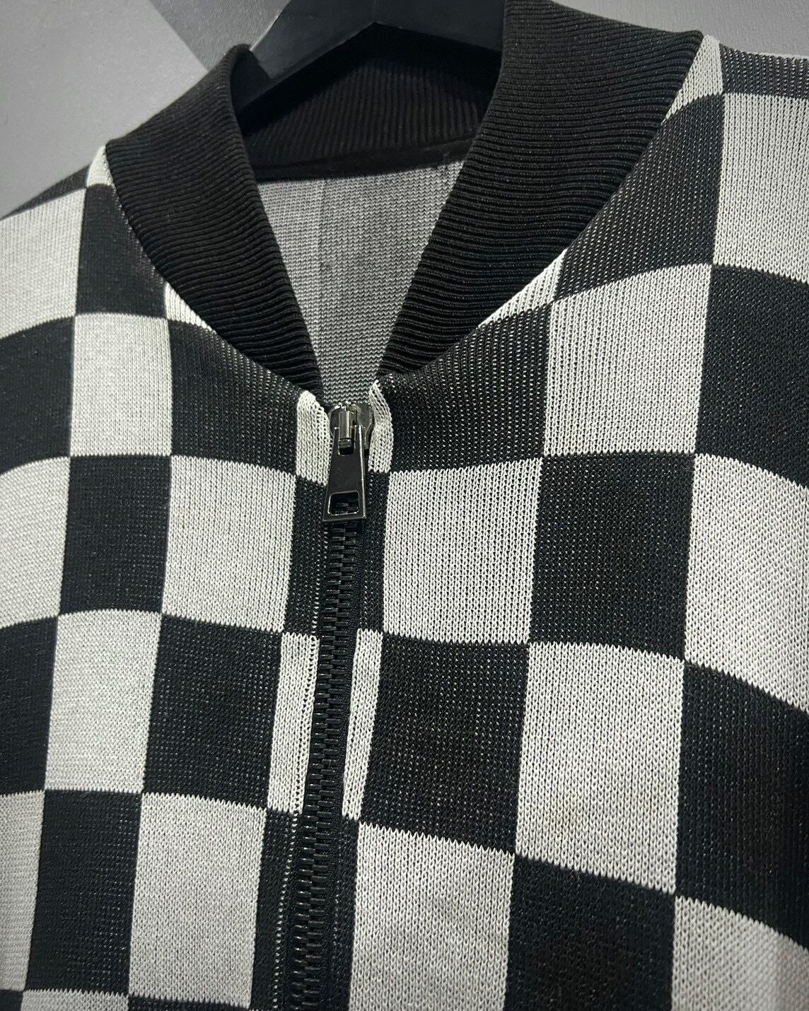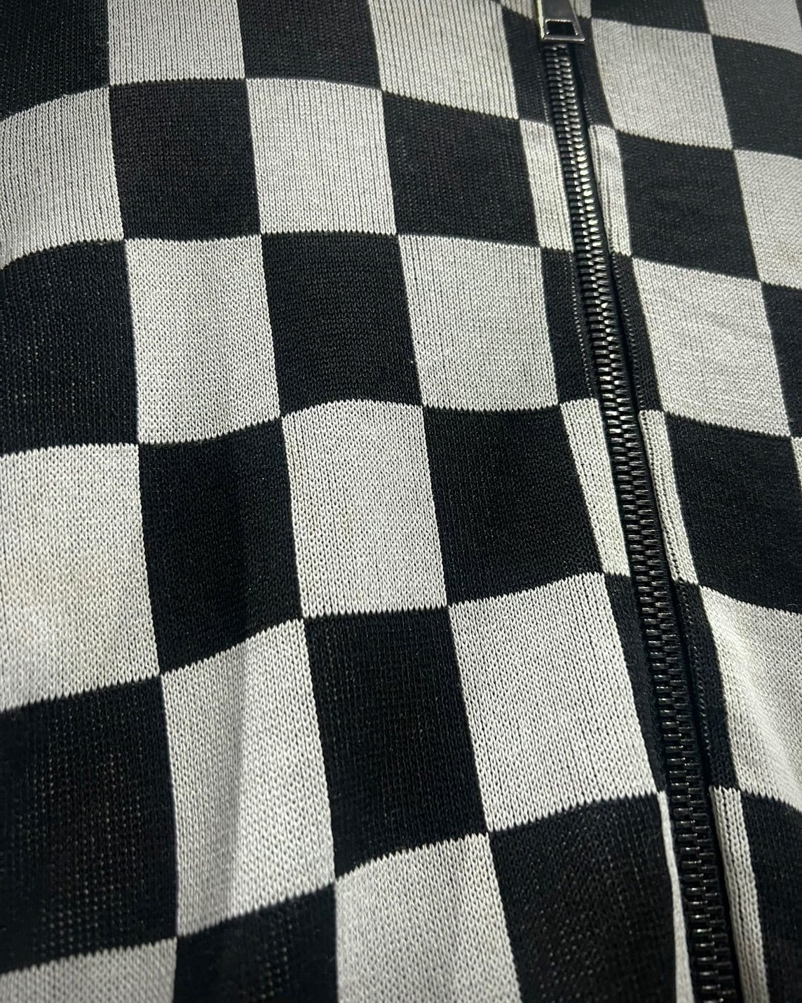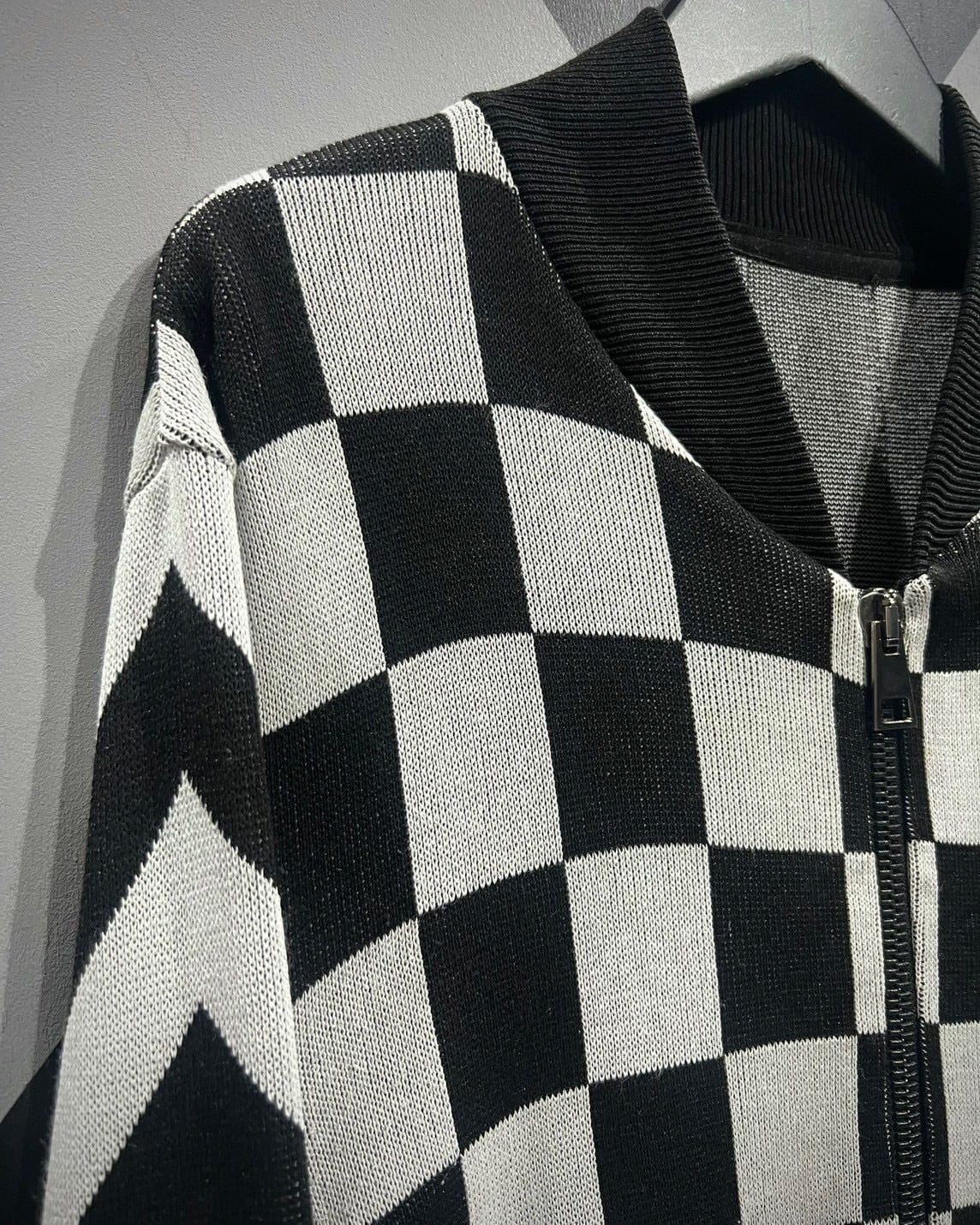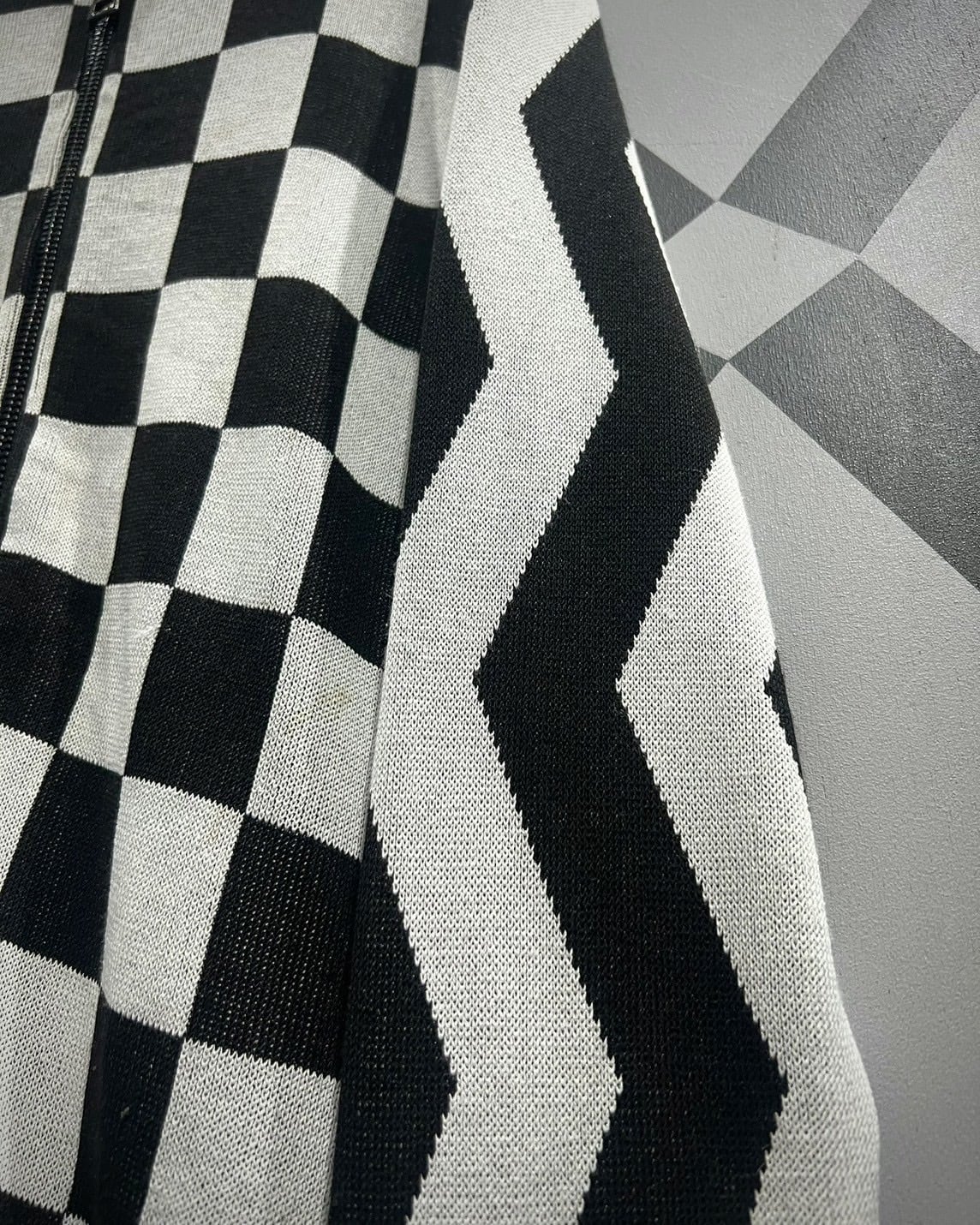 チェッカーフラッグ柄 × ジオメトリックデザインという、唯一無二の存在感を放つジップニットジャケット。