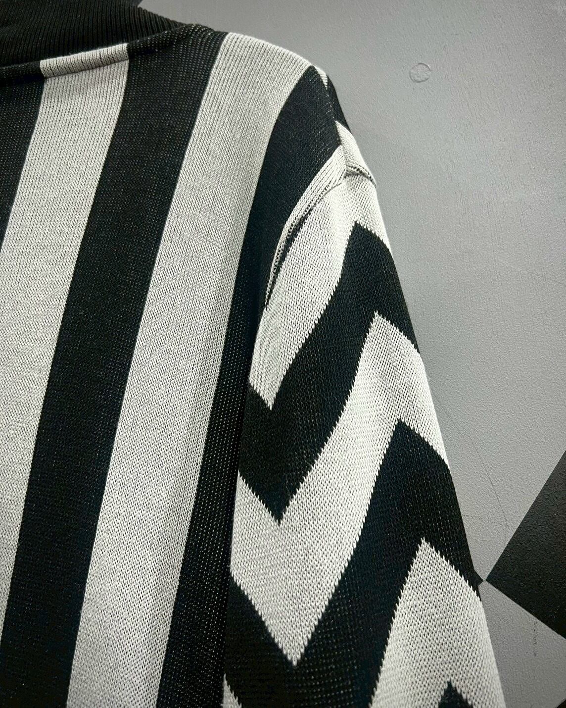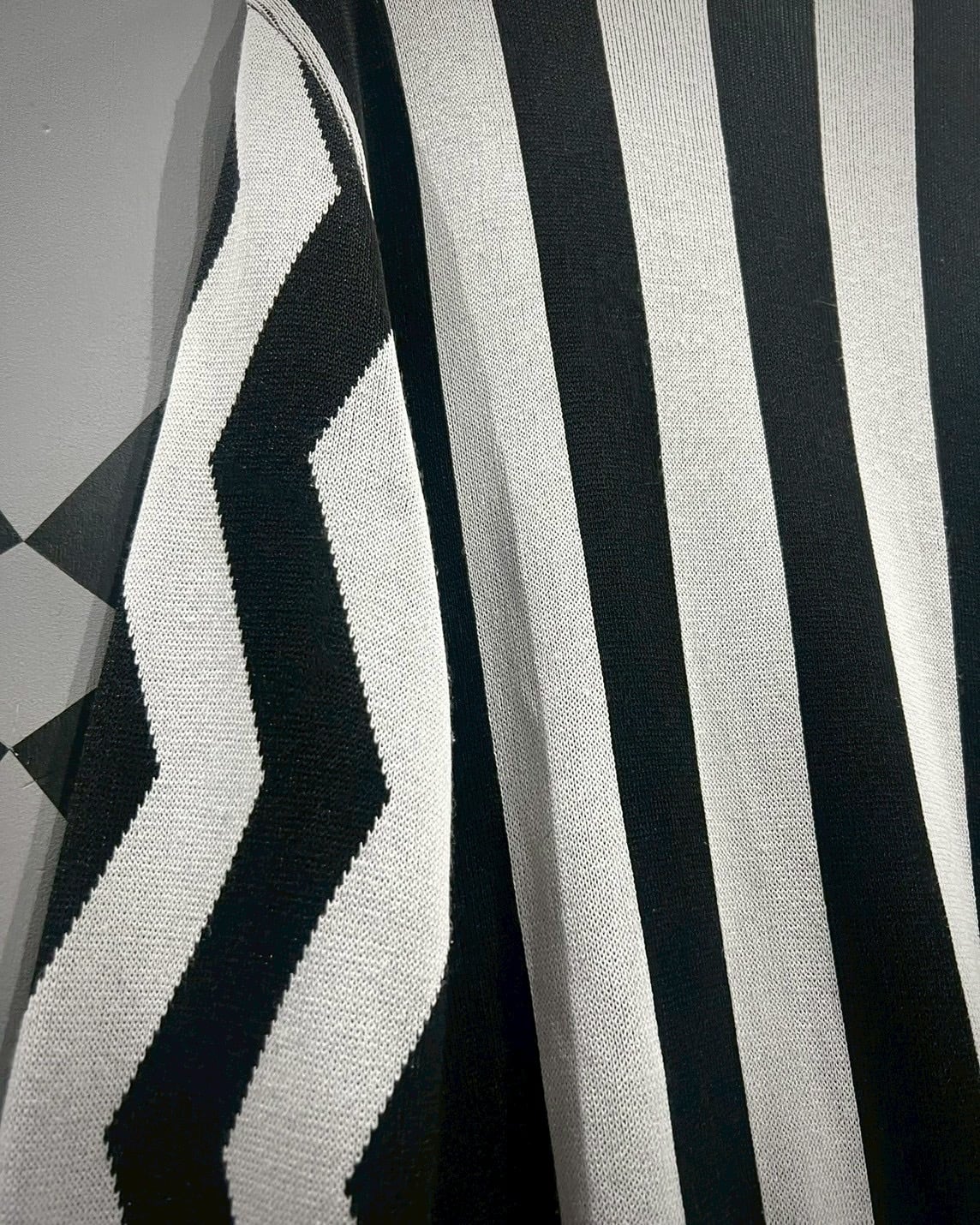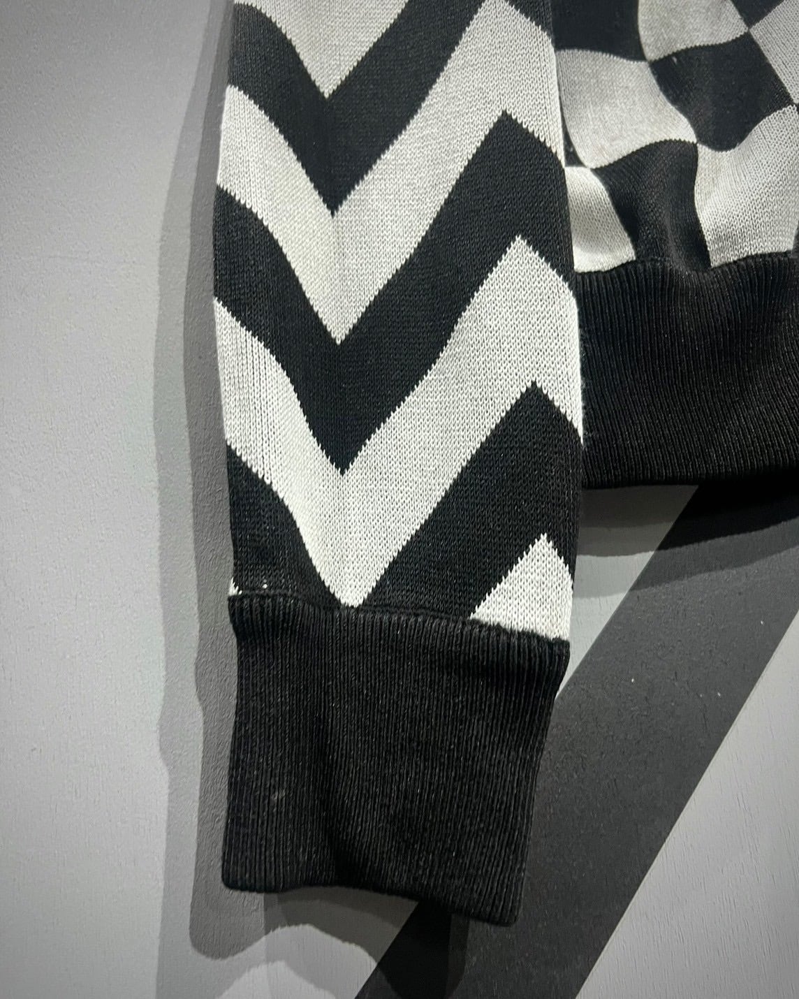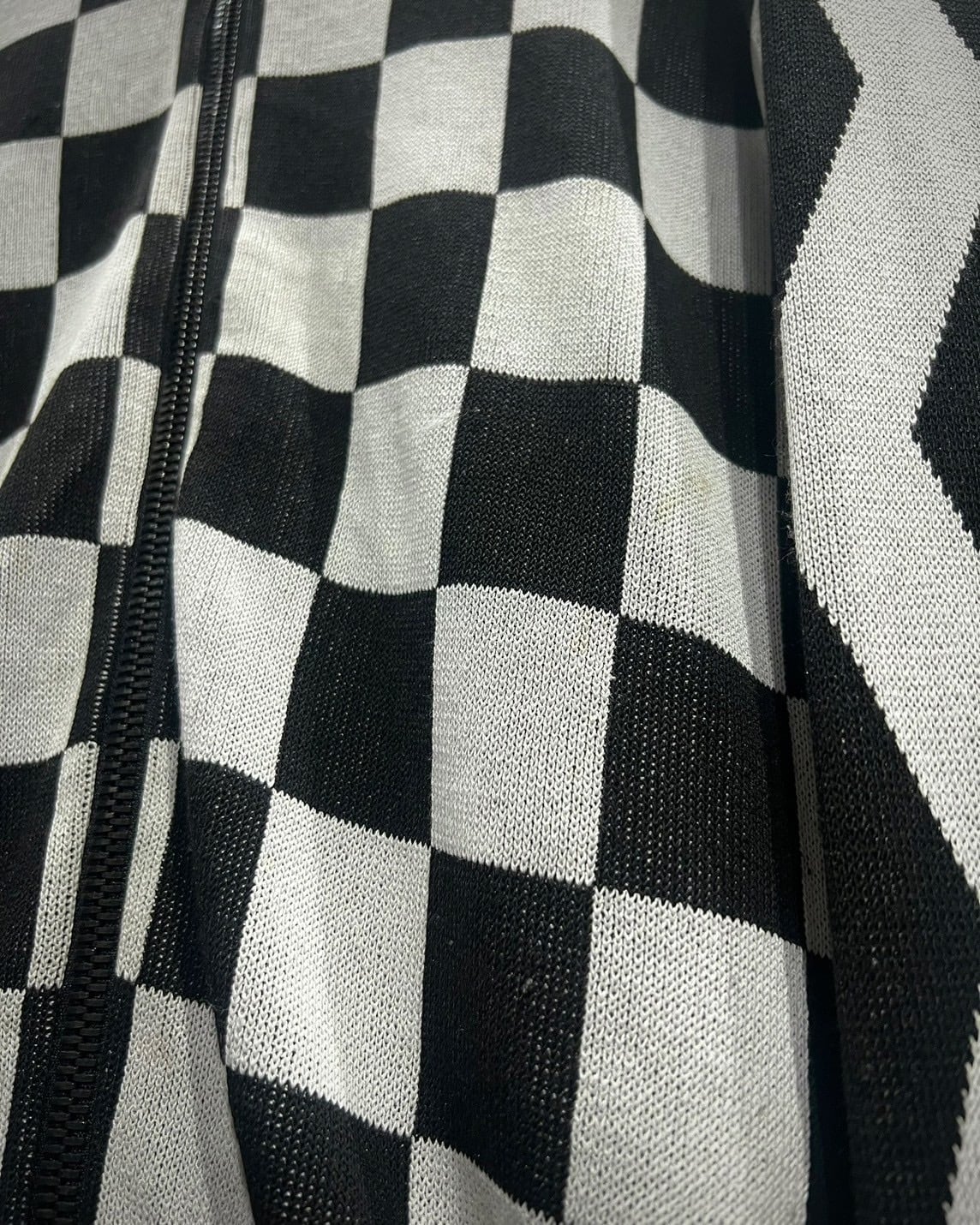 チェッカーフラッグ柄 × ジオメトリックデザインという、唯一無二の存在感を放つジップニットジャケット。