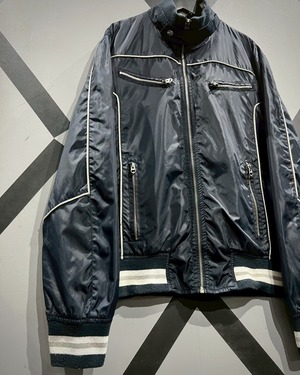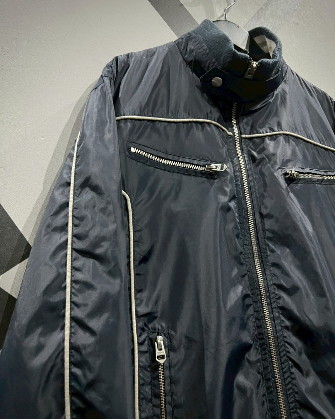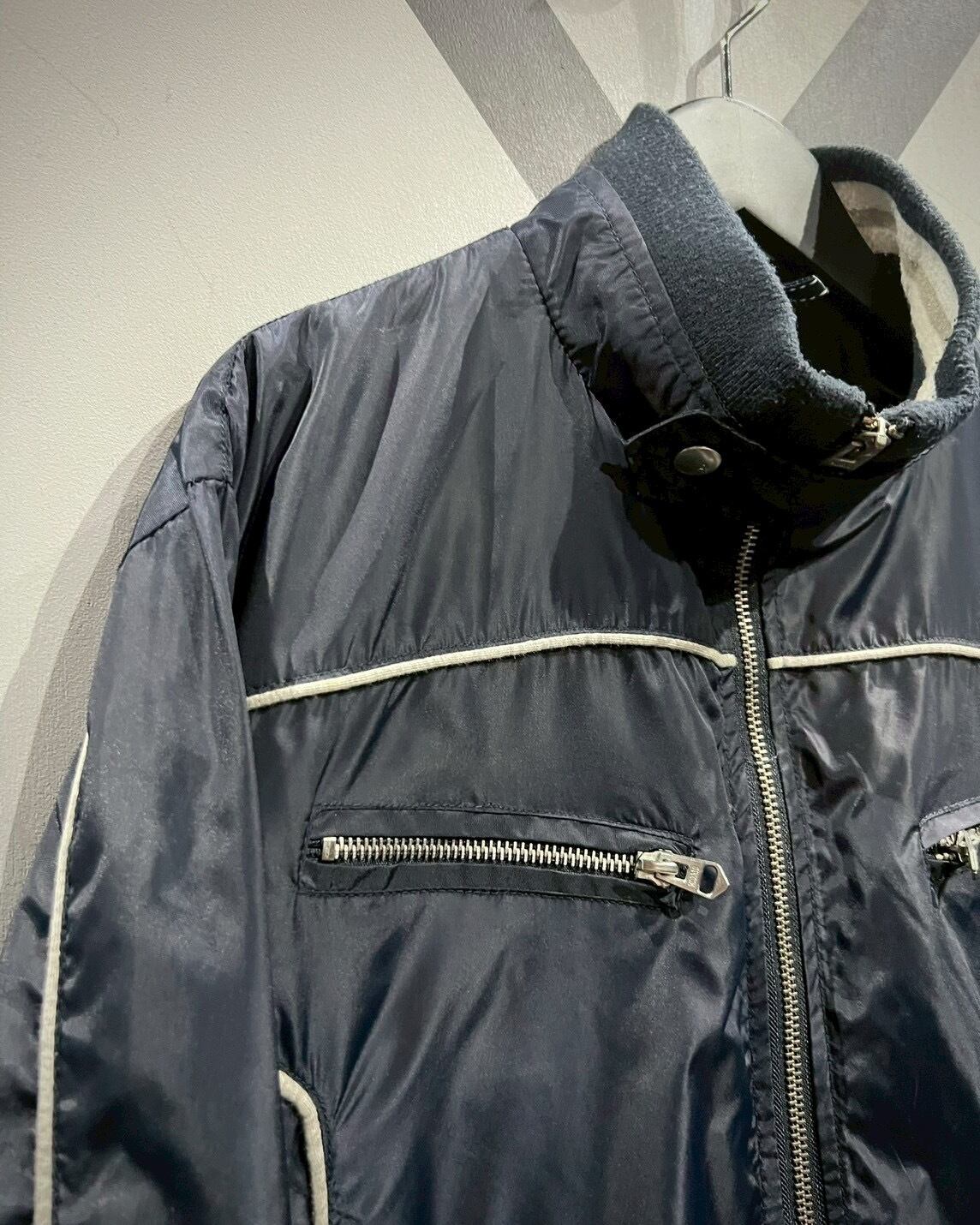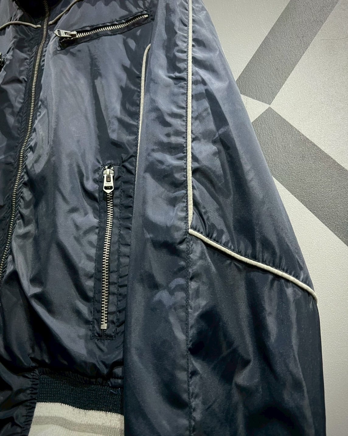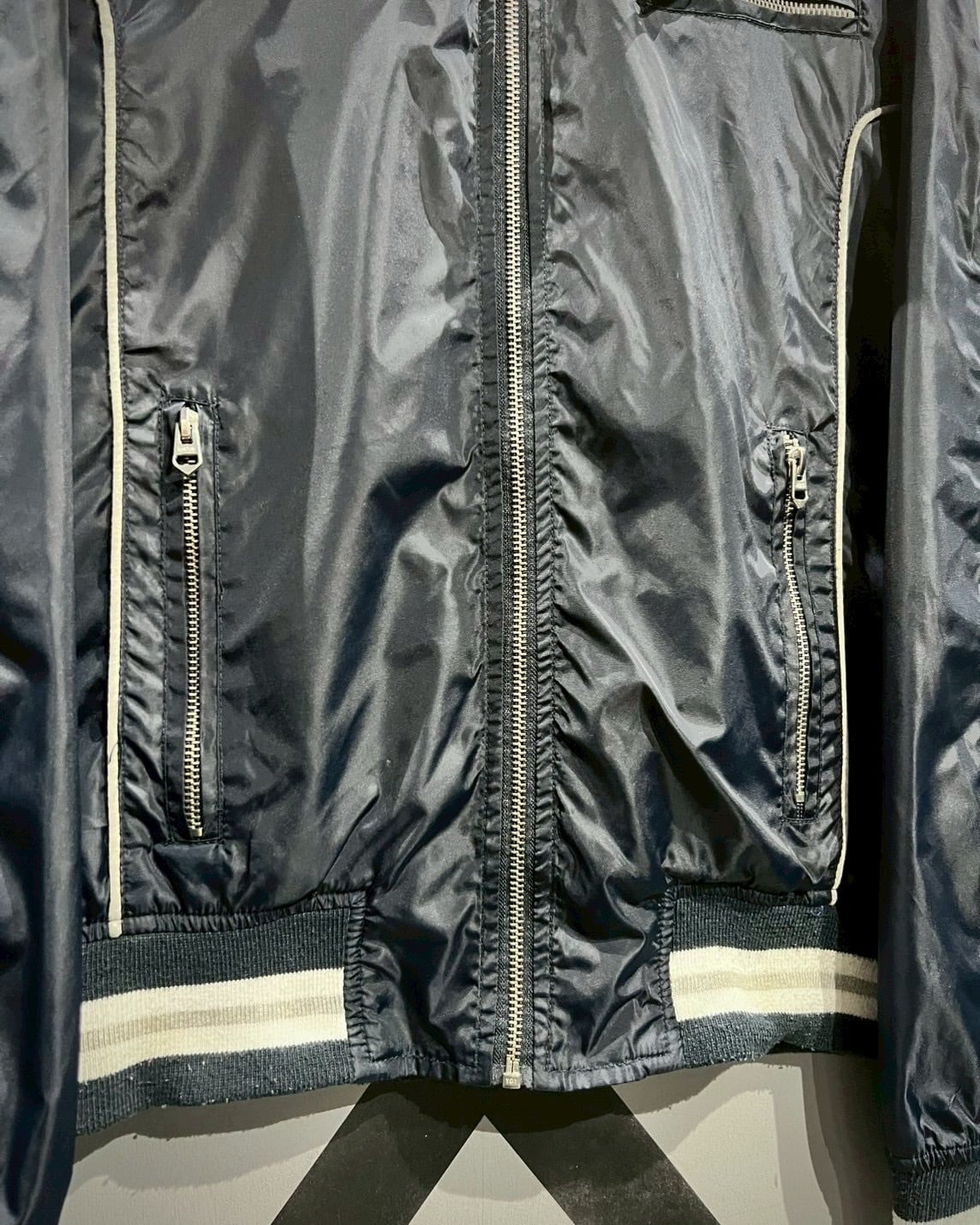 ボディは鈍い光沢を放つネイビーナイロンをベースに、随所にホワイトのパイピングを施すことで、立体感とメリハリを加えた1着。フロントに配置された4つのジップポケットは、単なる実用性にとどまらずデザインアクセントとしても機能し、洗練された表情を見せてくれます。
