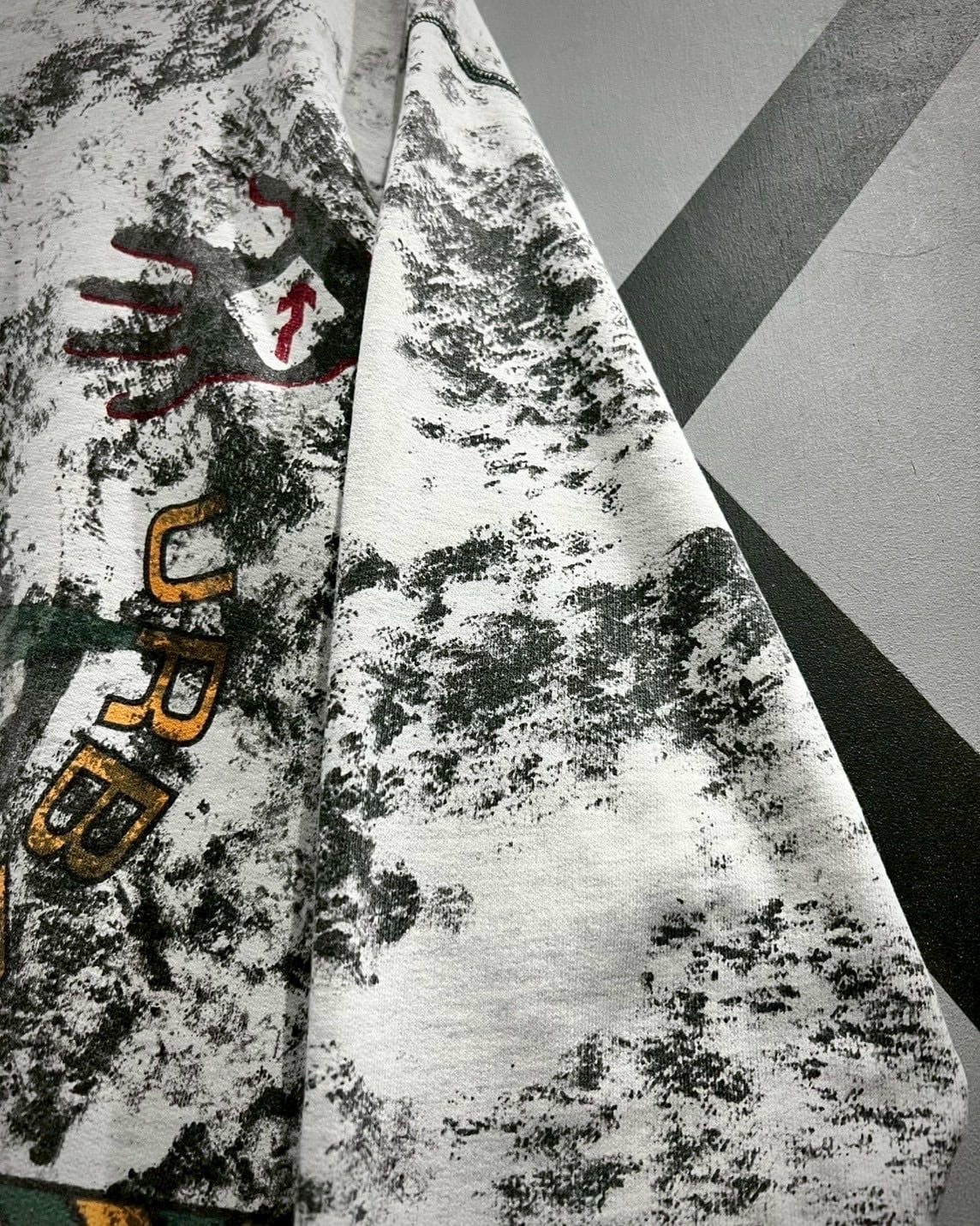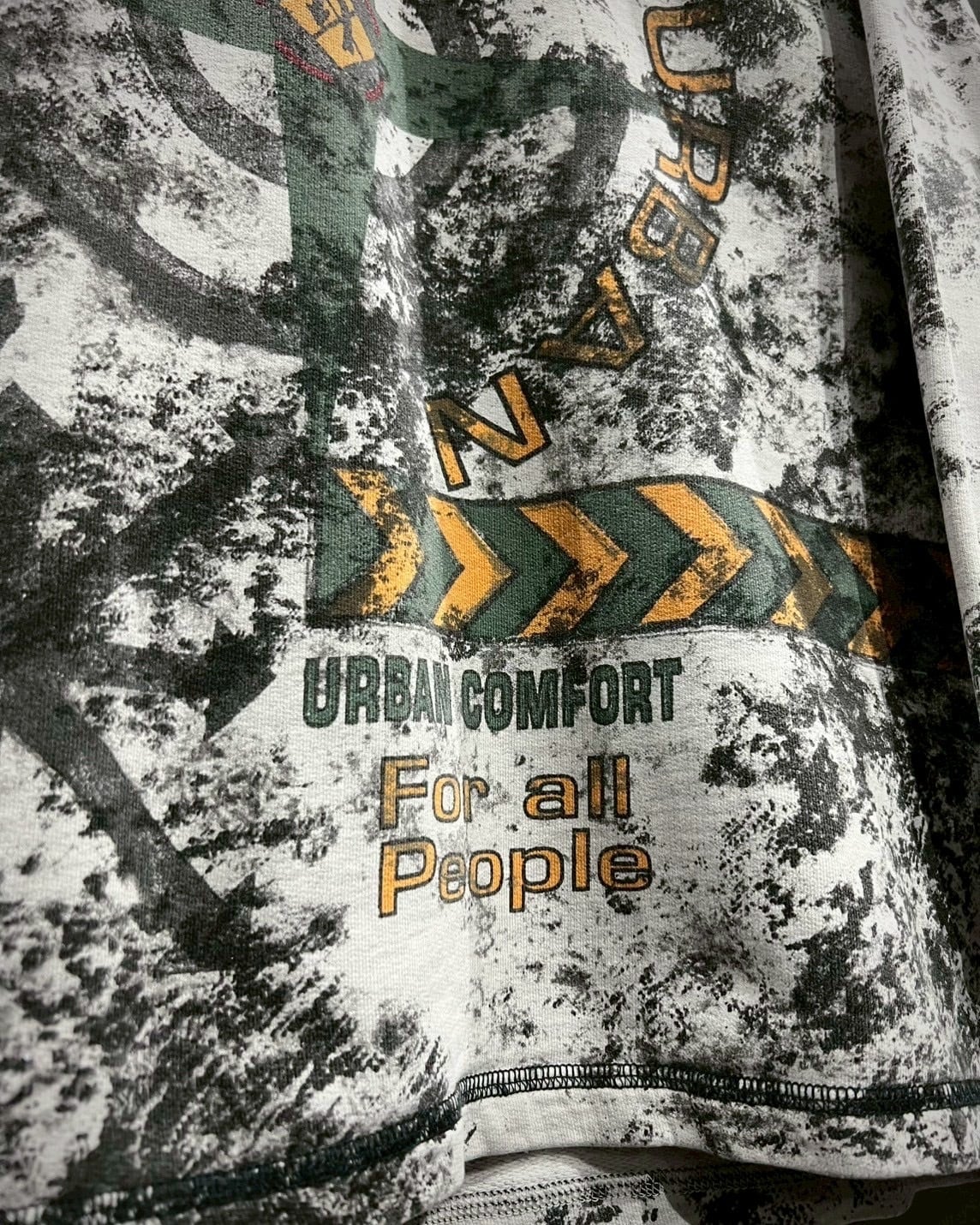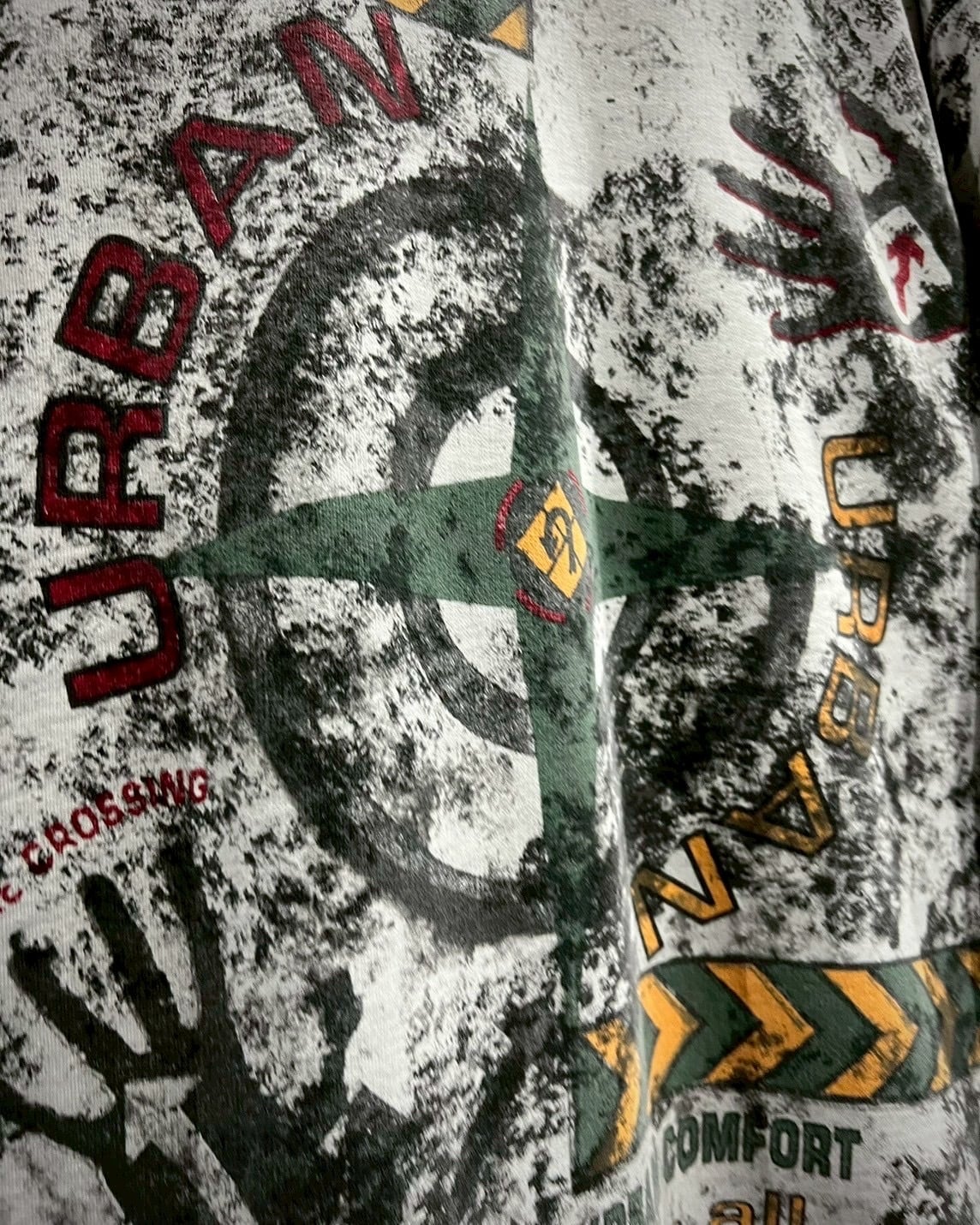 フロントには「URBAN」の文字や矢印モチーフ、方位磁針を思わせるロゴなど、スケートやストリートカルチャーを彷彿とさせるデザインがバランス良く配置され、さらにブラックペンキを飛ばしたようなテクスチャーを重ねることで唯一無二の存在感を放っています。