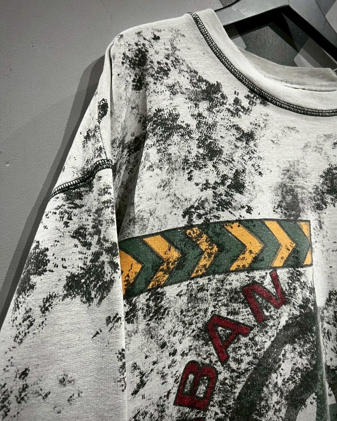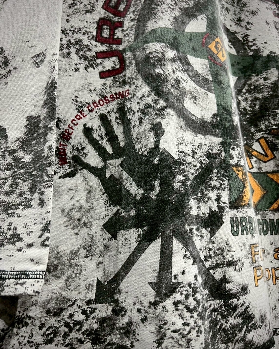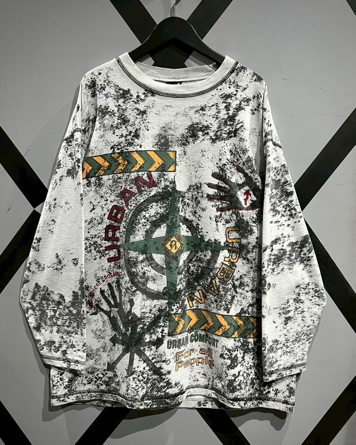 フロントには「URBAN」の文字や矢印モチーフ、方位磁針を思わせるロゴなど、スケートやストリートカルチャーを彷彿とさせるデザインがバランス良く配置され、さらにブラックペンキを飛ばしたようなテクスチャーを重ねることで唯一無二の存在感を放っています。