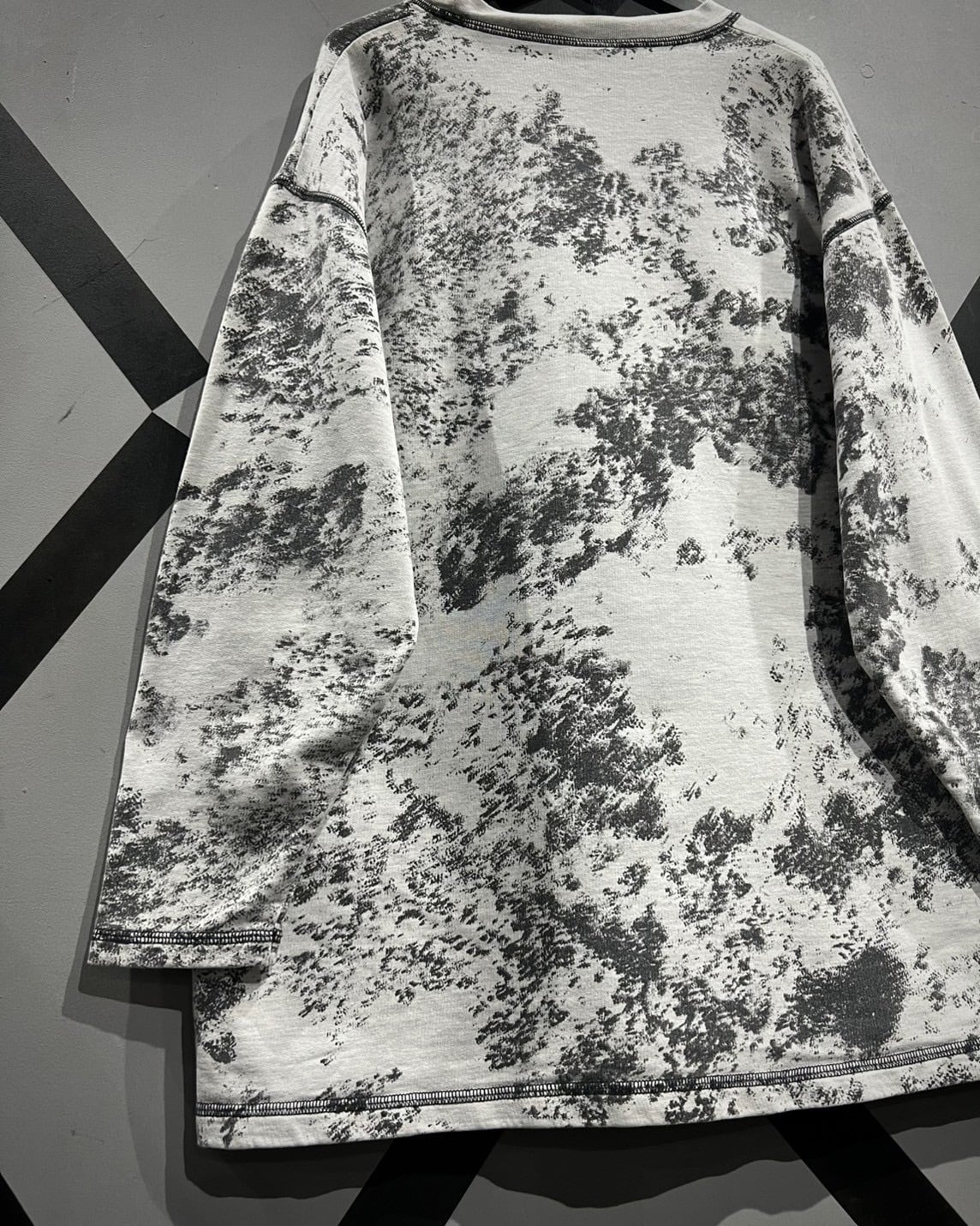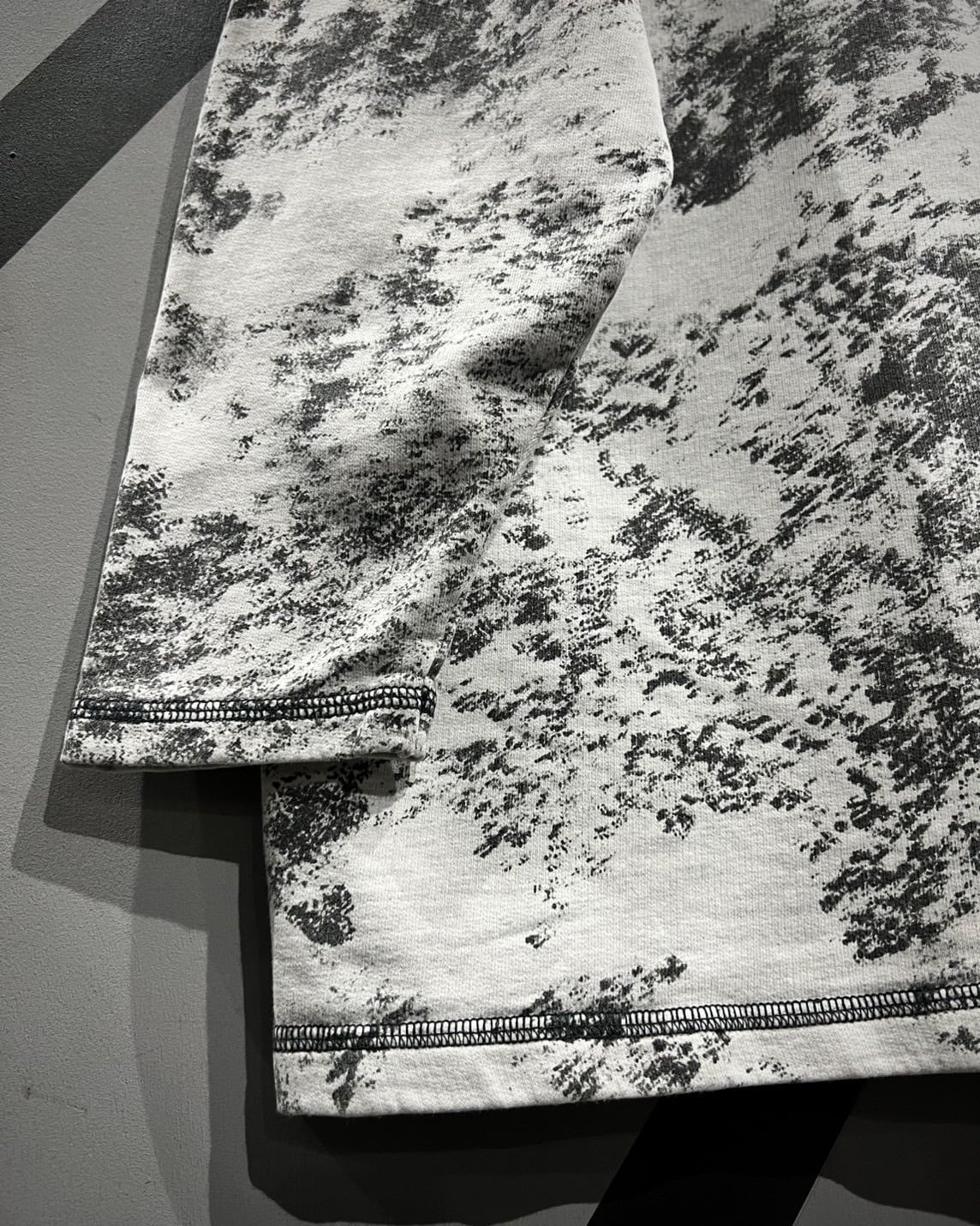 シルエットはルーズフィットで、身幅・アームともにゆとりを持たせた設計。裾にはリブを配さずボックス型に仕上げているため、肩からストンと落ちる抜け感のあるシルエットを楽しめます。リラックス感を残しながらも、都会的なストリートムードをしっかり演出。