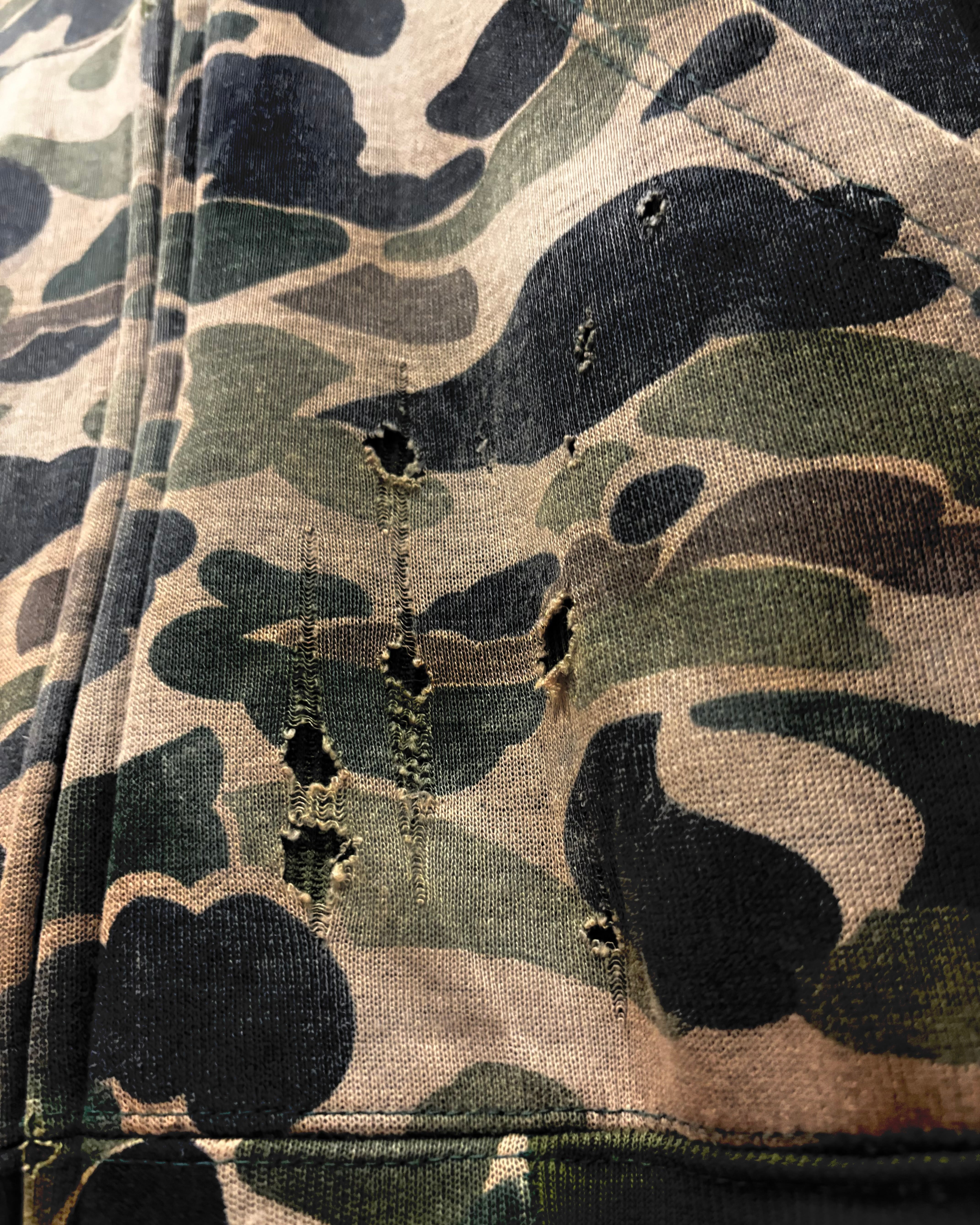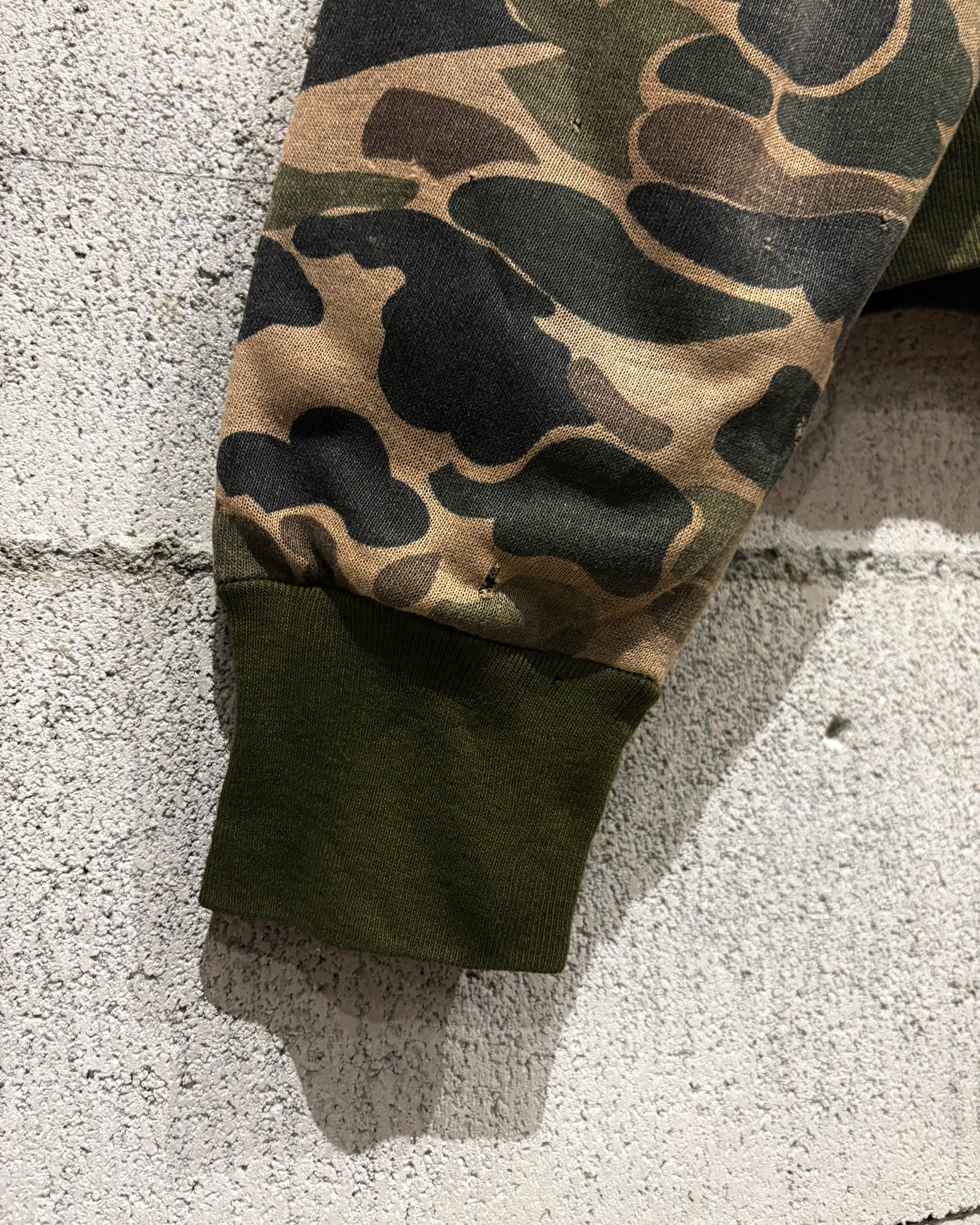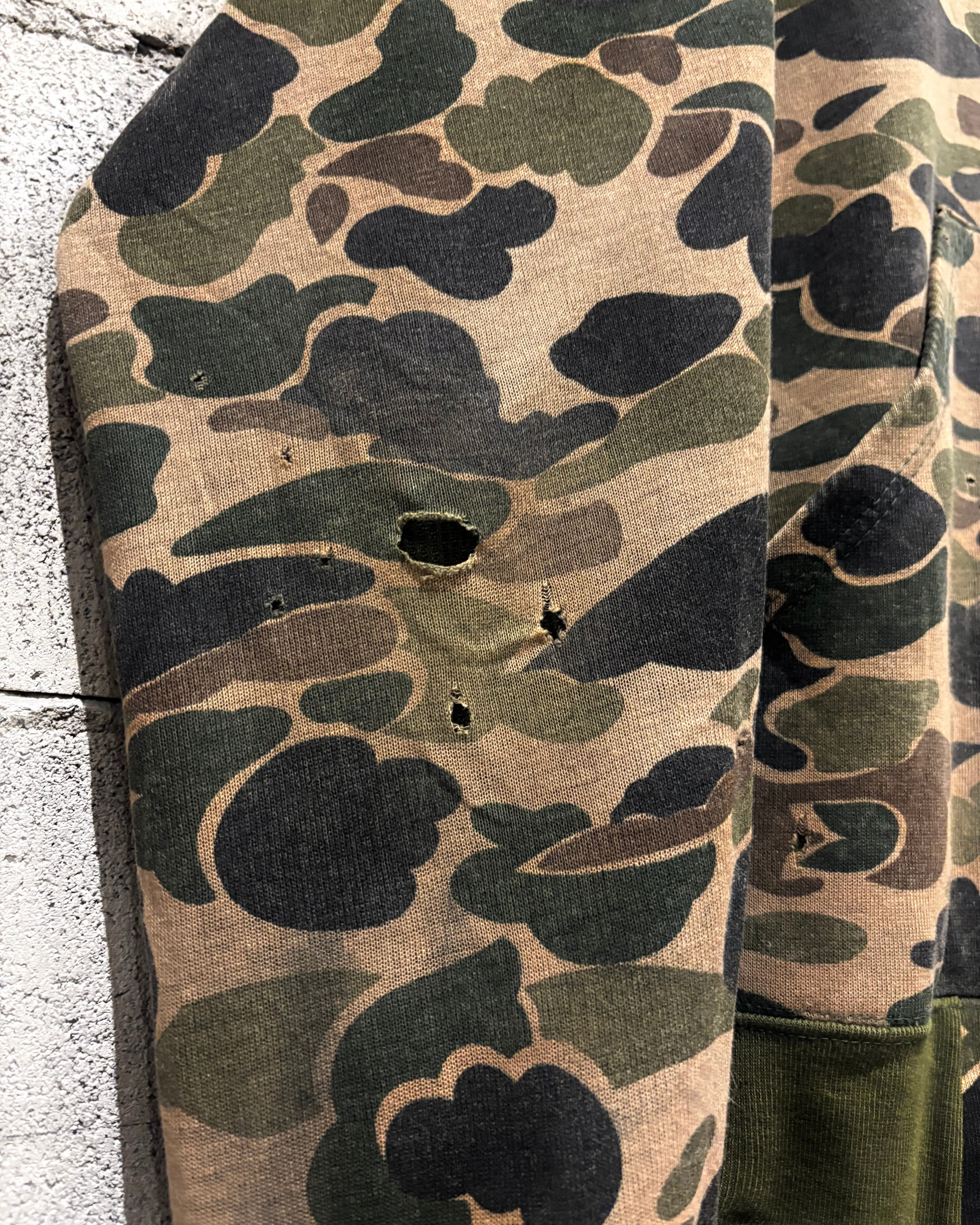 ヴィンテージミリタリーの世界で高い人気を誇る“ダックハンターカモ”は、第二次世界大戦期に実際に採用された歴史を持ち、その後ストリートやスケーターファッションの文脈でも高い評価を受け続けてきた由緒あるパターン。そんな背景を踏まえつつ、こちらは当時ならではの質感とストリート的なノリが絶妙に混ざり合った一枚に仕上がっています。