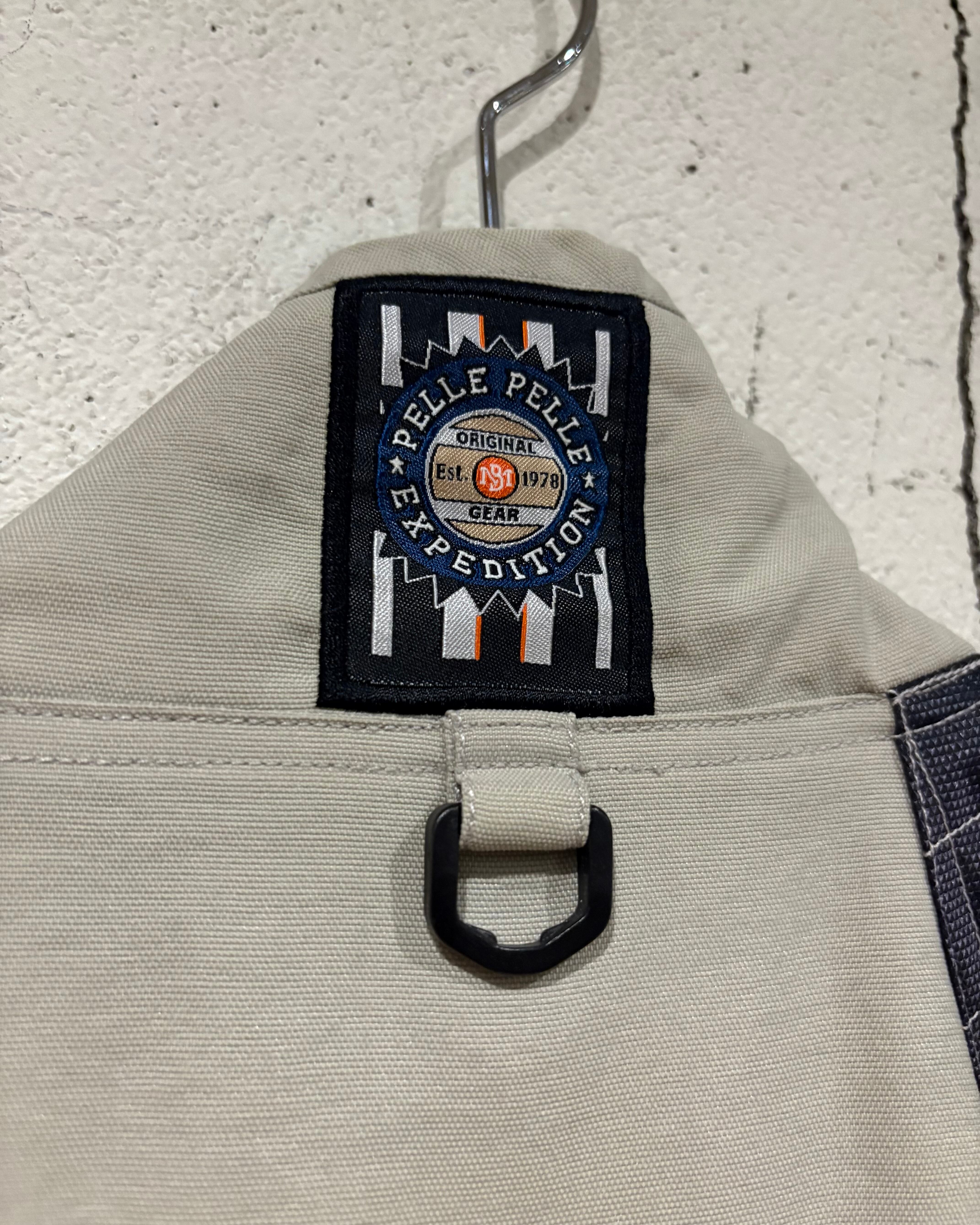 ショルダー部分にはナイロンのキルティング切り替え、フロントはジップアップ仕様に加え、バックルギミックも搭載。機能性を追求しつつもデザインとしてのアクセントになっており、PELLE PELLE特有のプロダクト感を体現。さらに背面下部には大容量ポケットも完備しています。