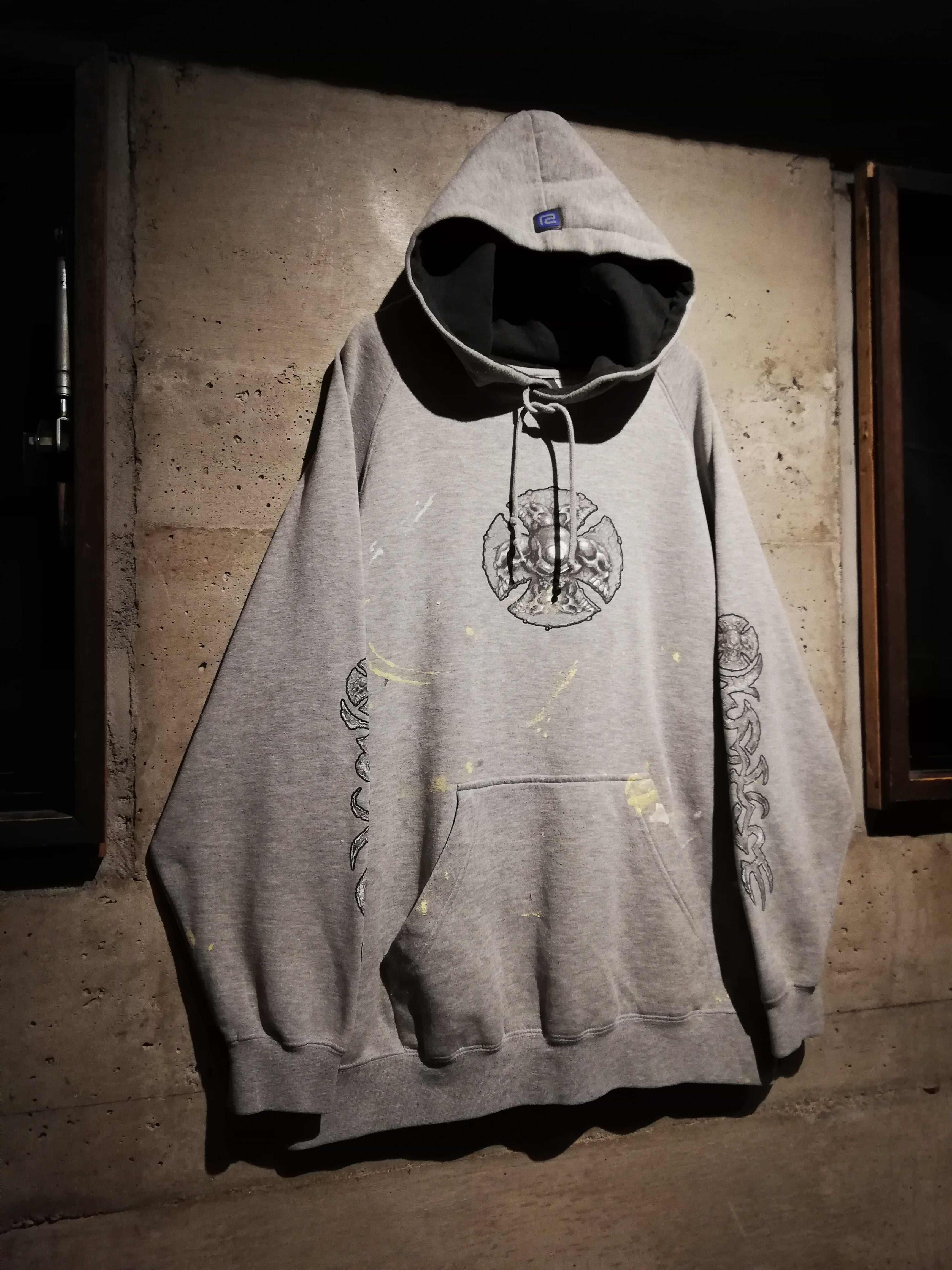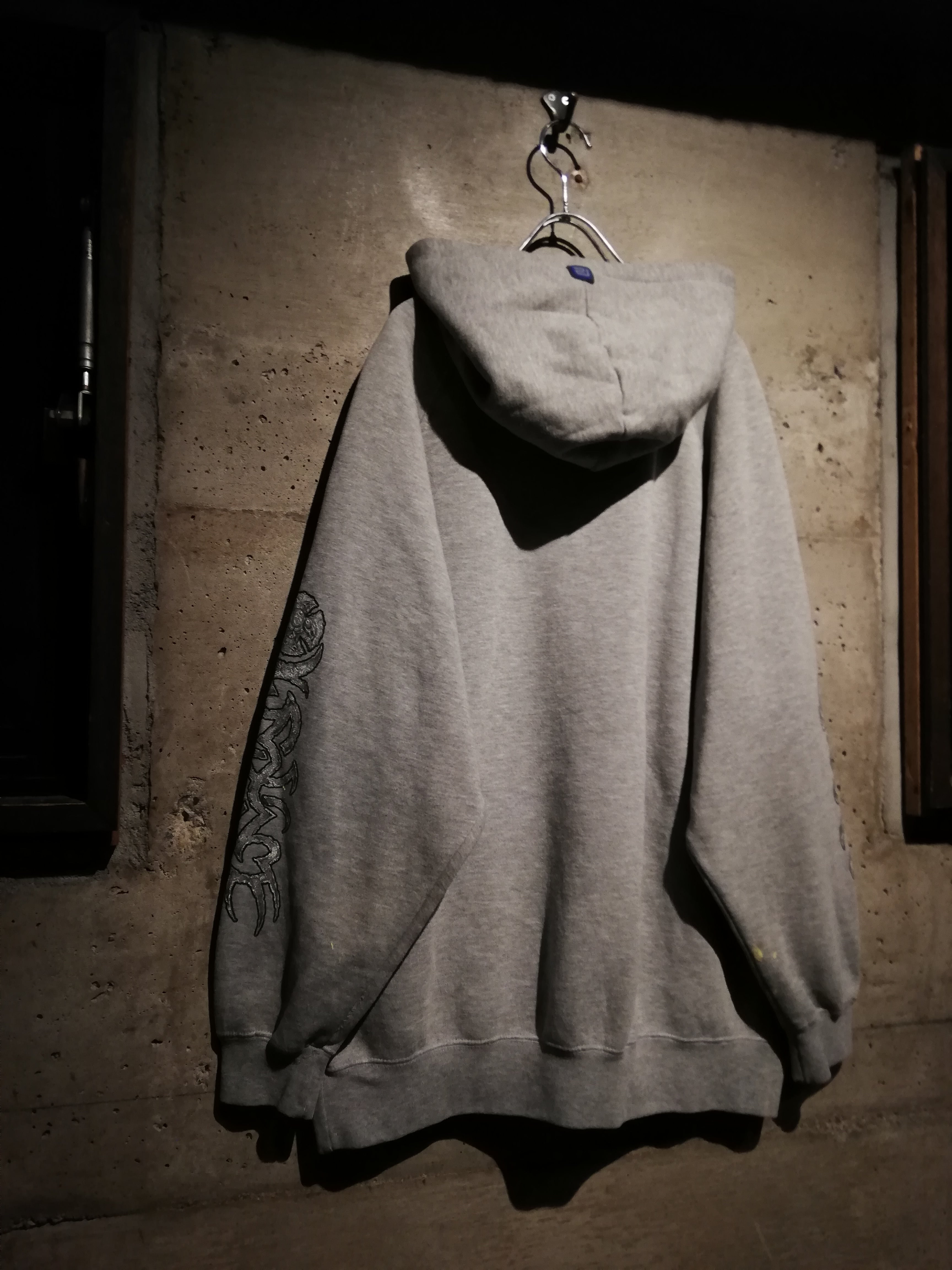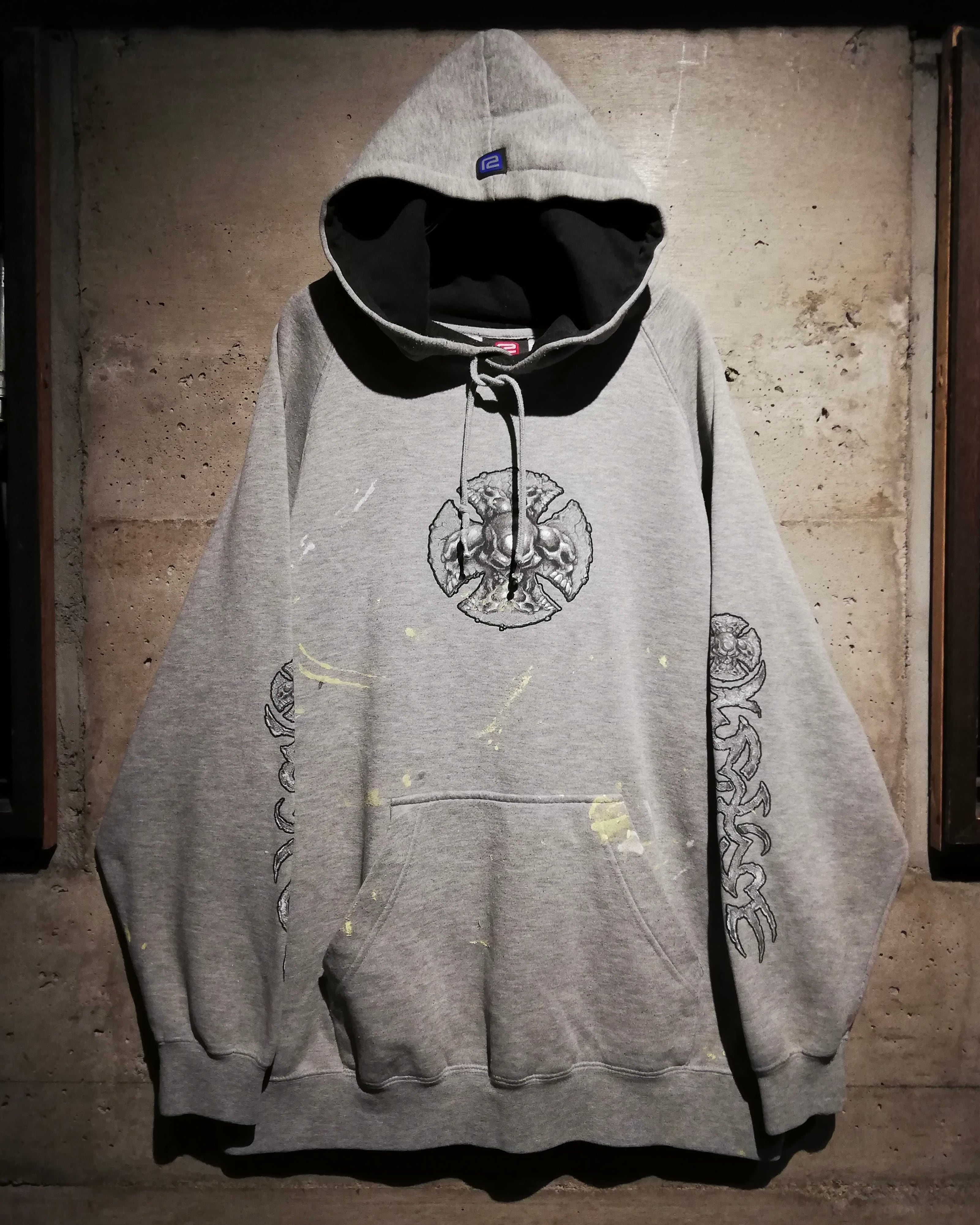グレーボディをベースに、フロントには立体的に描かれたスカル、アイアンクロスのデザインをON。両袖にはブランドらしいトライバルモチーフのプリントを大胆に施し、存在感を放つ仕上がりに。ボディ全体に散ったペイントが退廃感を漂わせ、非常に良い雰囲気を纏っています。