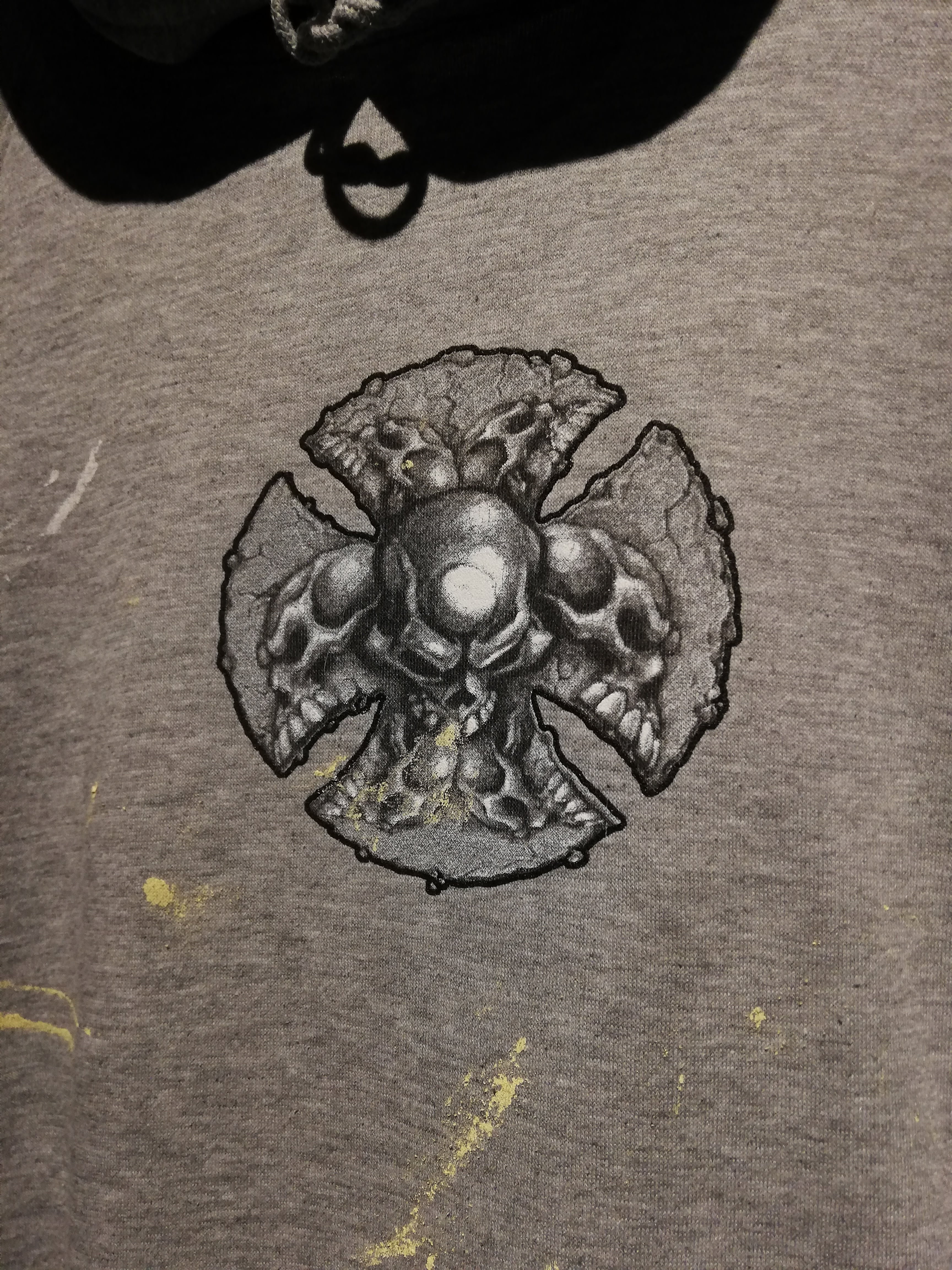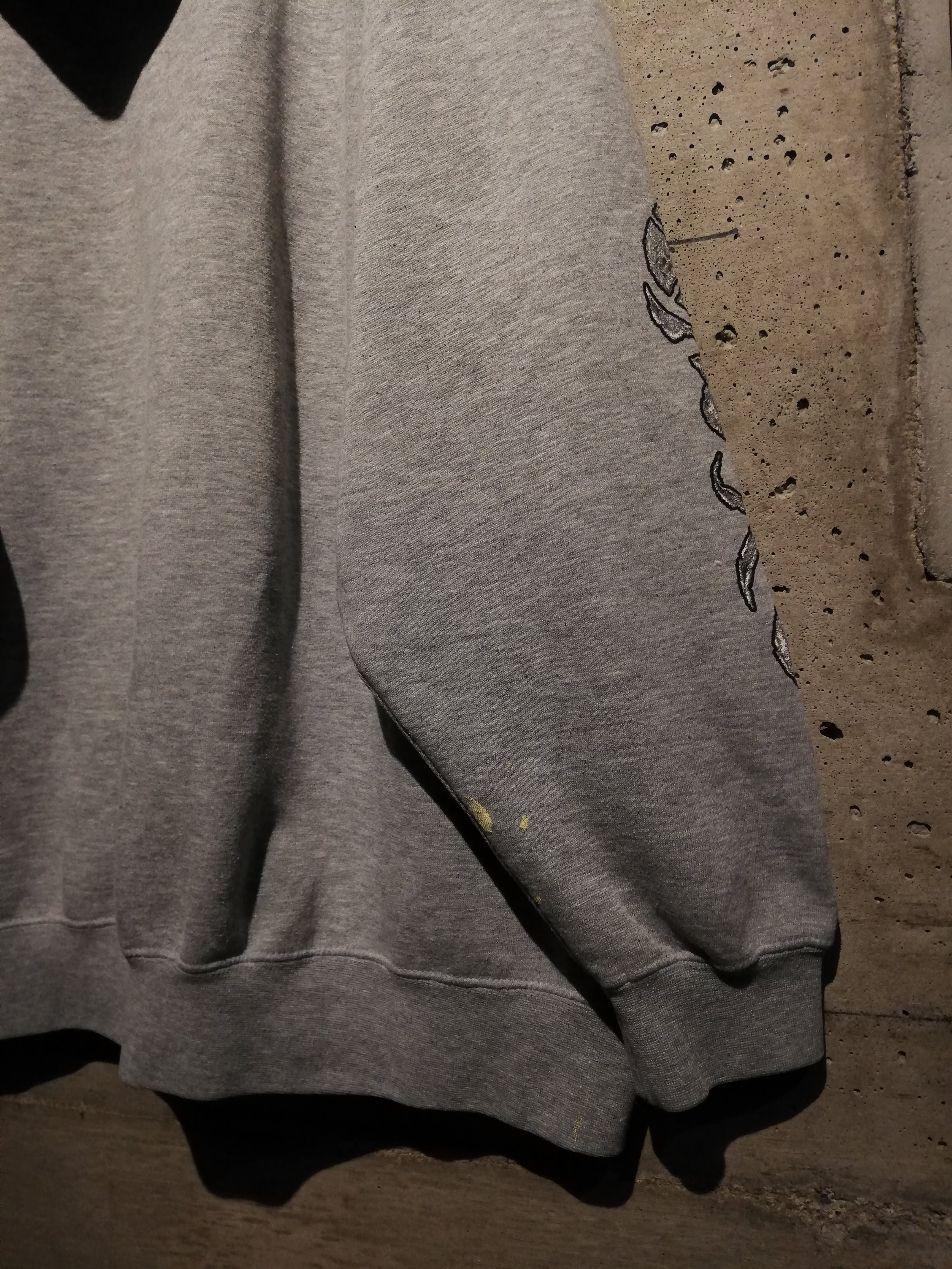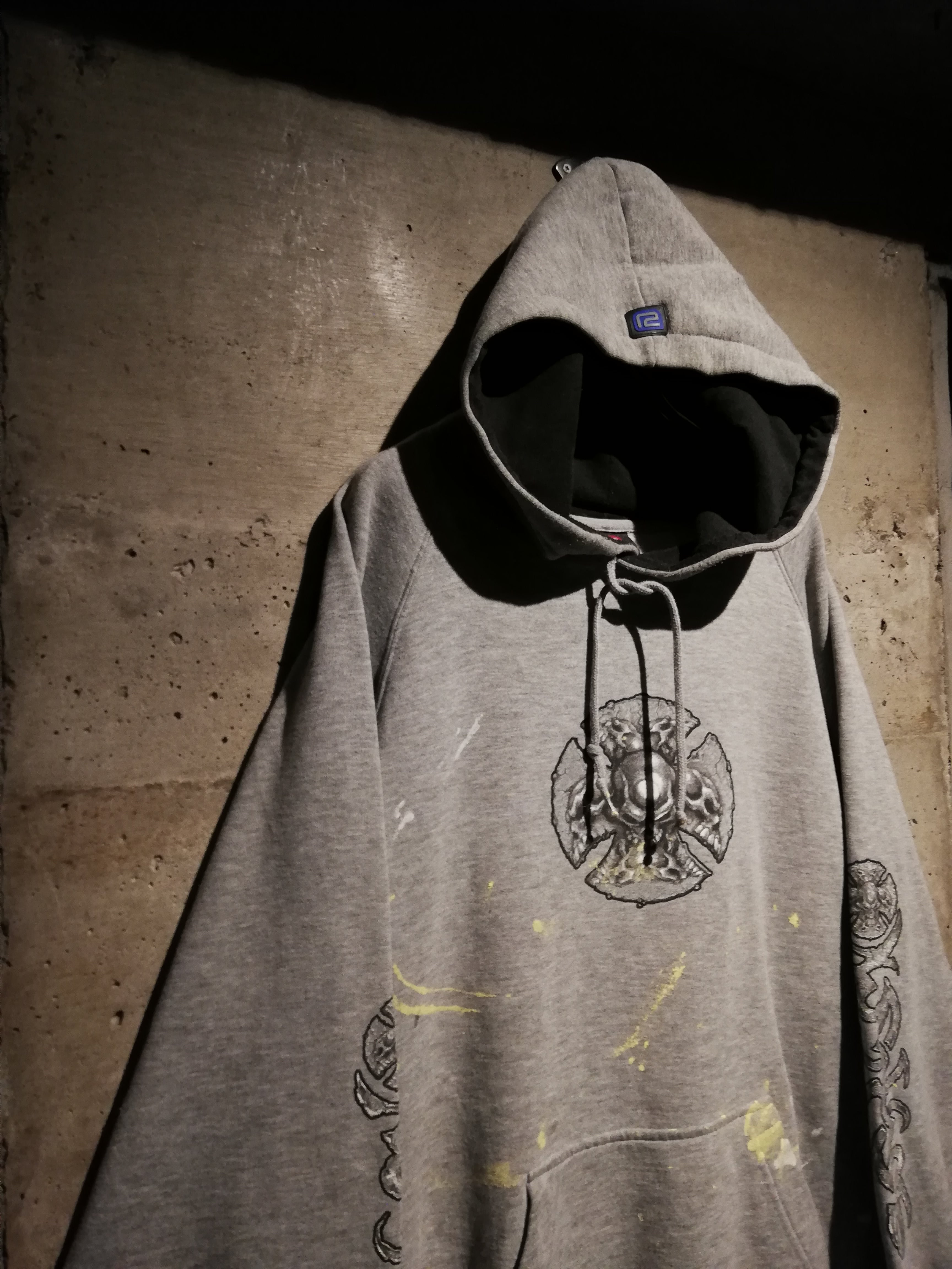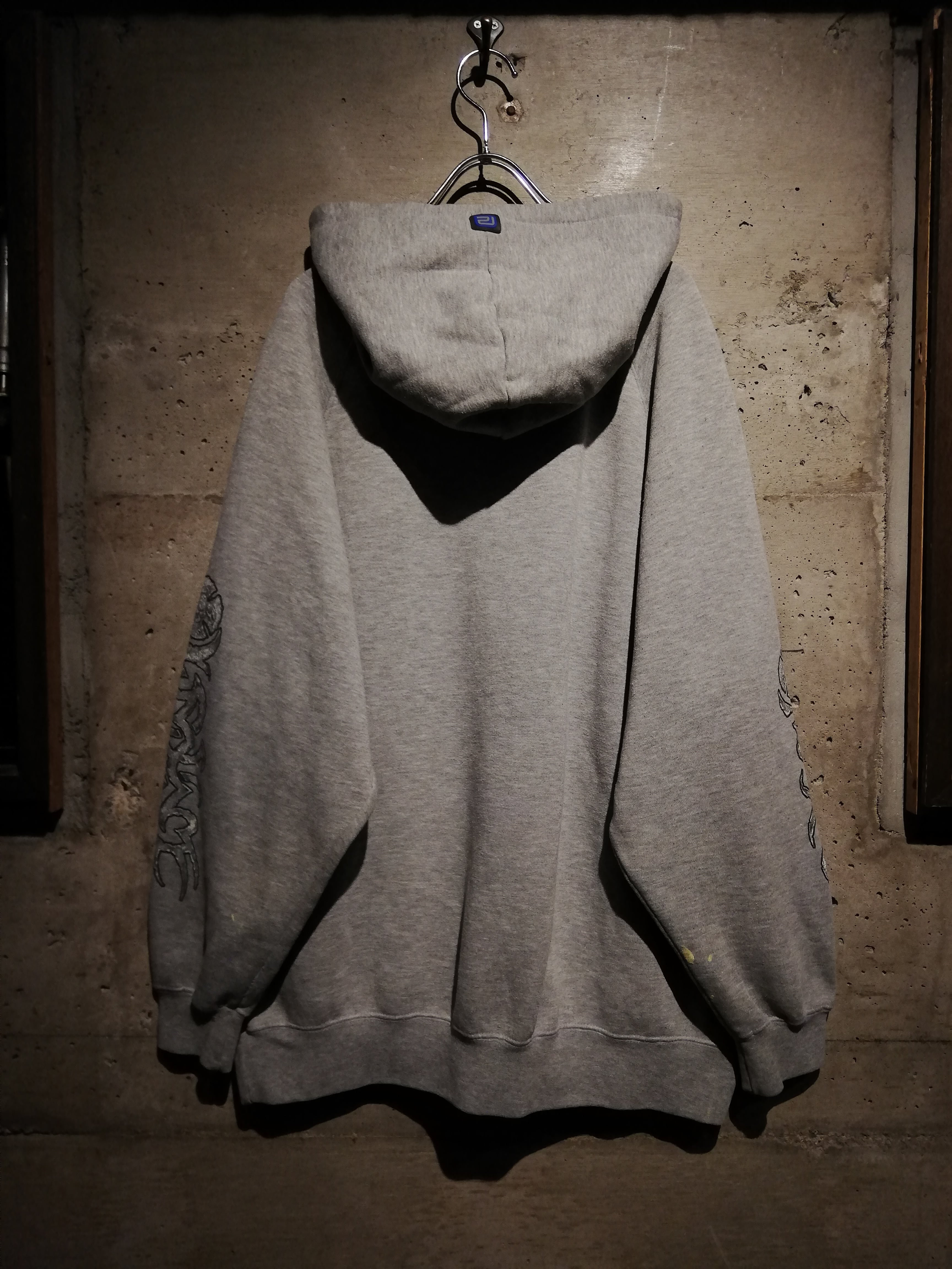 グレーボディをベースに、フロントには立体的に描かれたスカル、アイアンクロスのデザインをON。両袖にはブランドらしいトライバルモチーフのプリントを大胆に施し、存在感を放つ仕上がりに。ボディ全体に散ったペイントが退廃感を漂わせ、非常に良い雰囲気を纏っています。