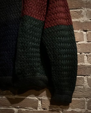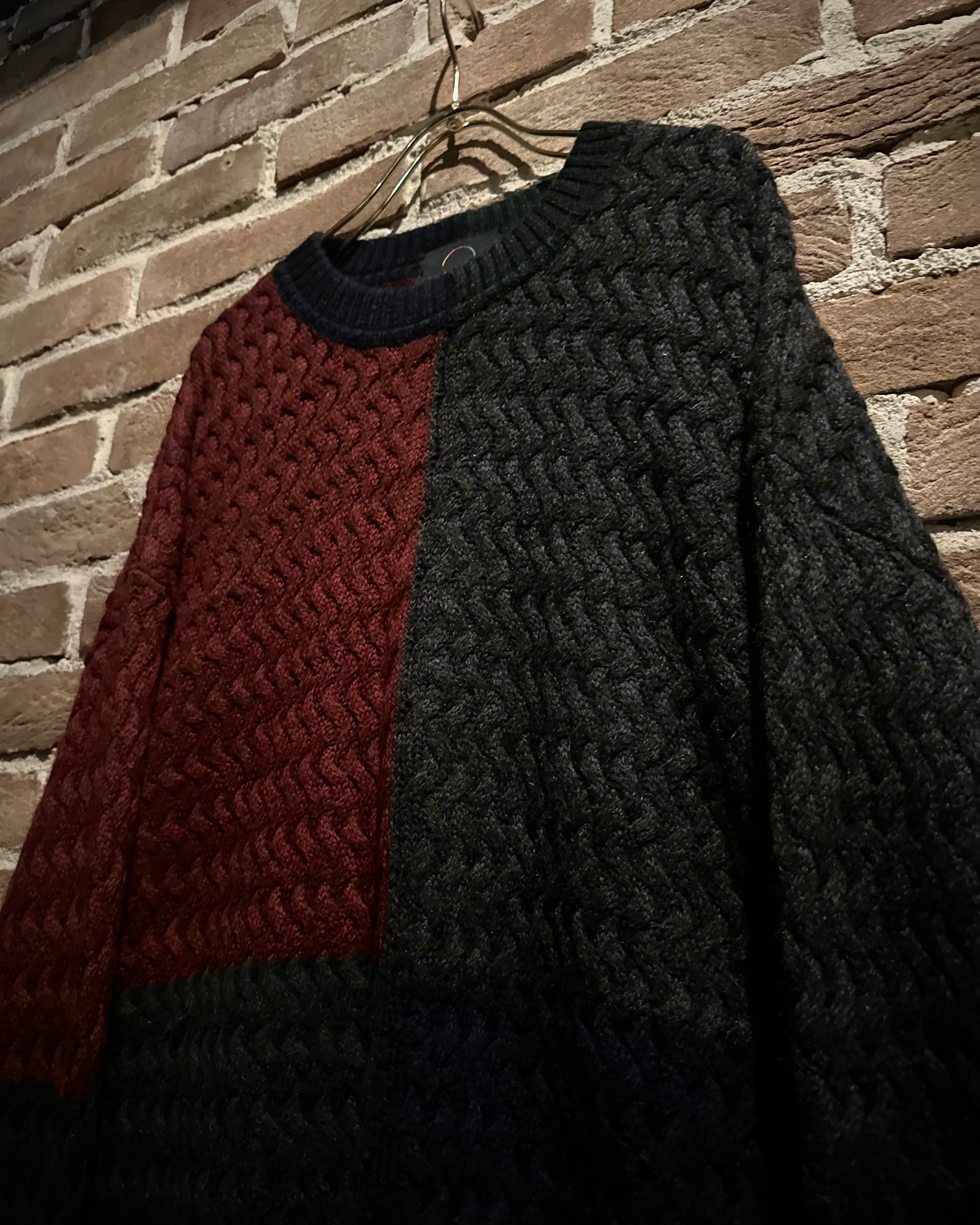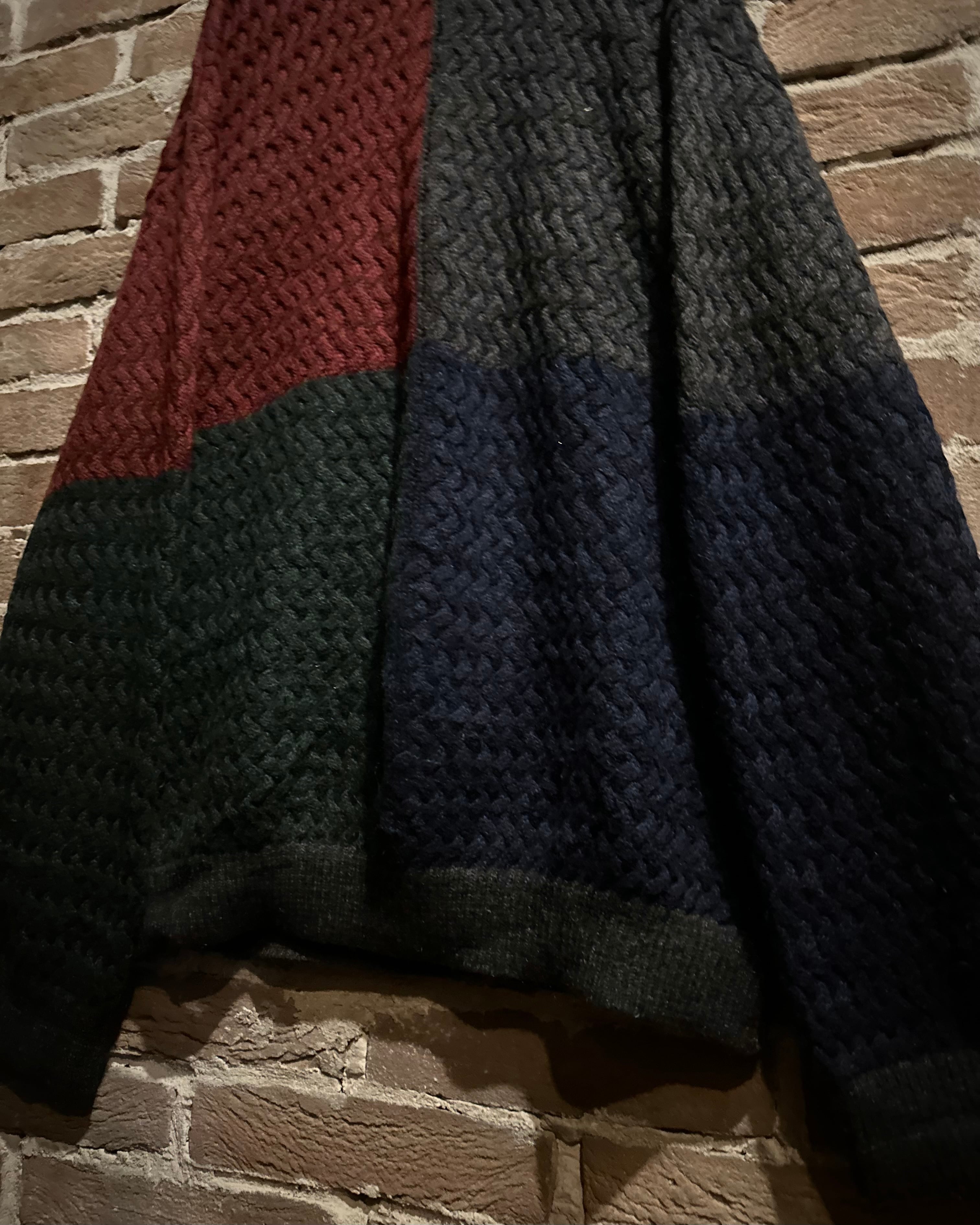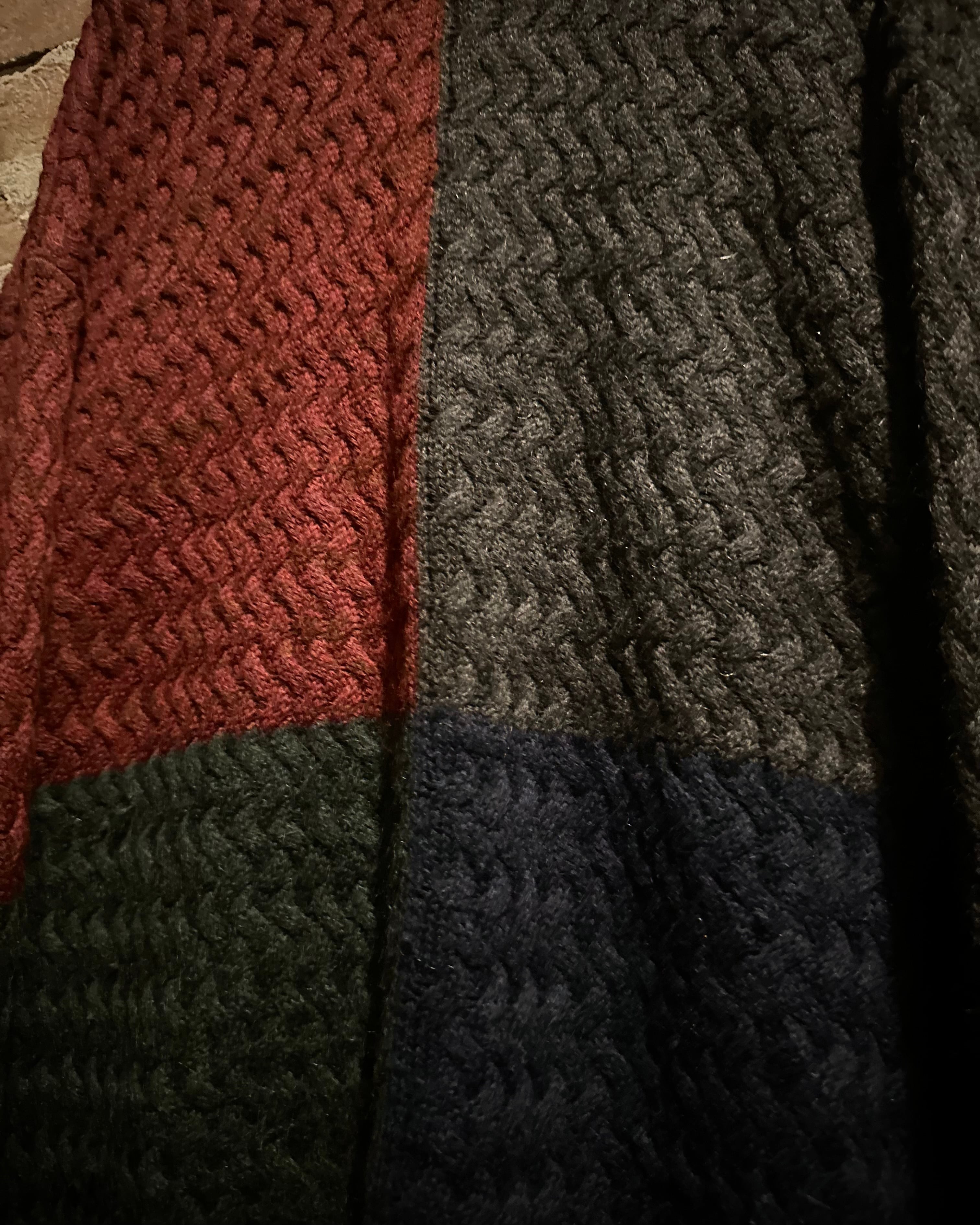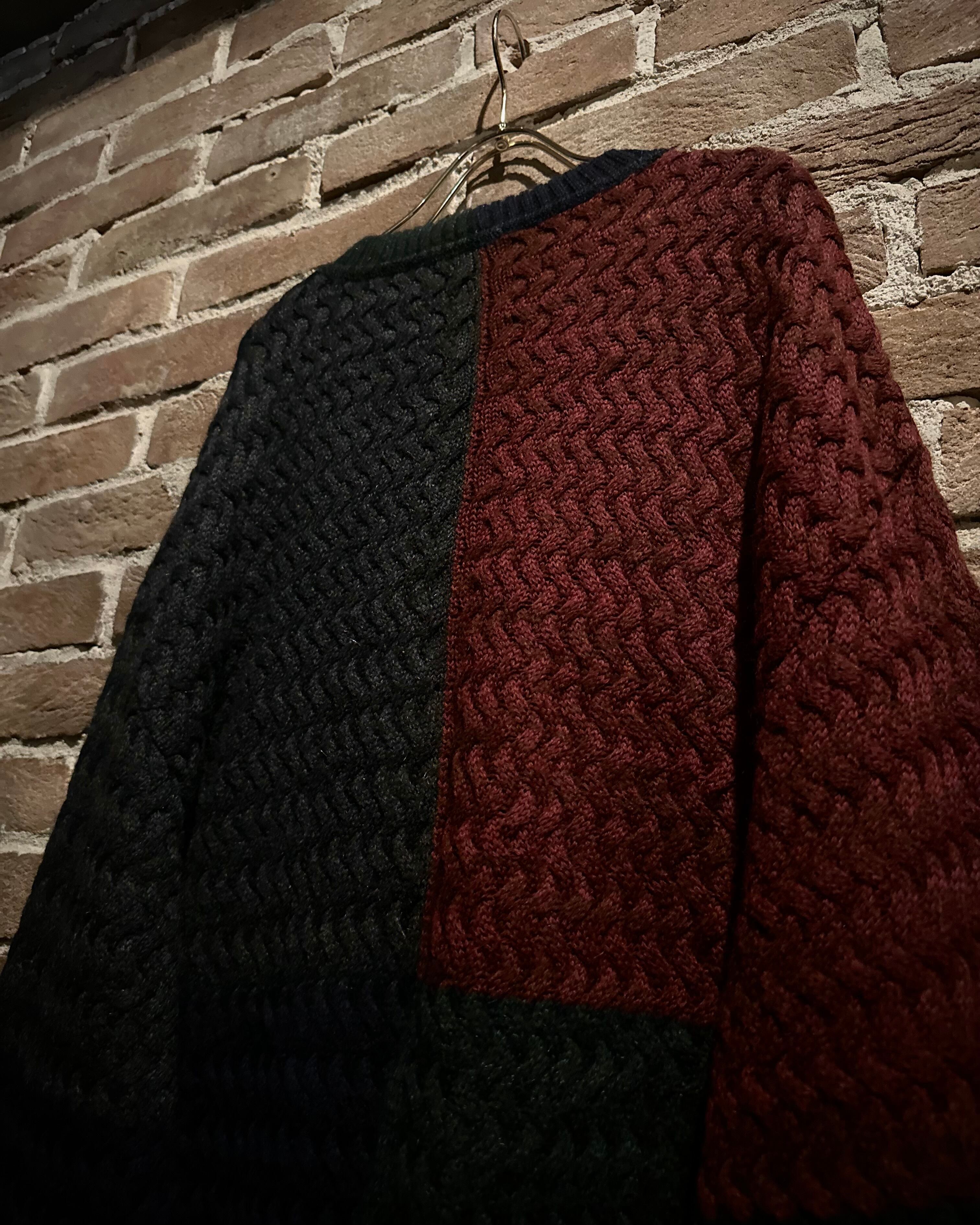 パネル状に切り替えたカラーは、深みのあるワインレッド・フォレストグリーン・ネイビーを組み合わせた重厚で遊び心ある配色。波打つようなケーブル編みがさらに奥行きを与え、視覚的にも豊かな表情を生み出します。