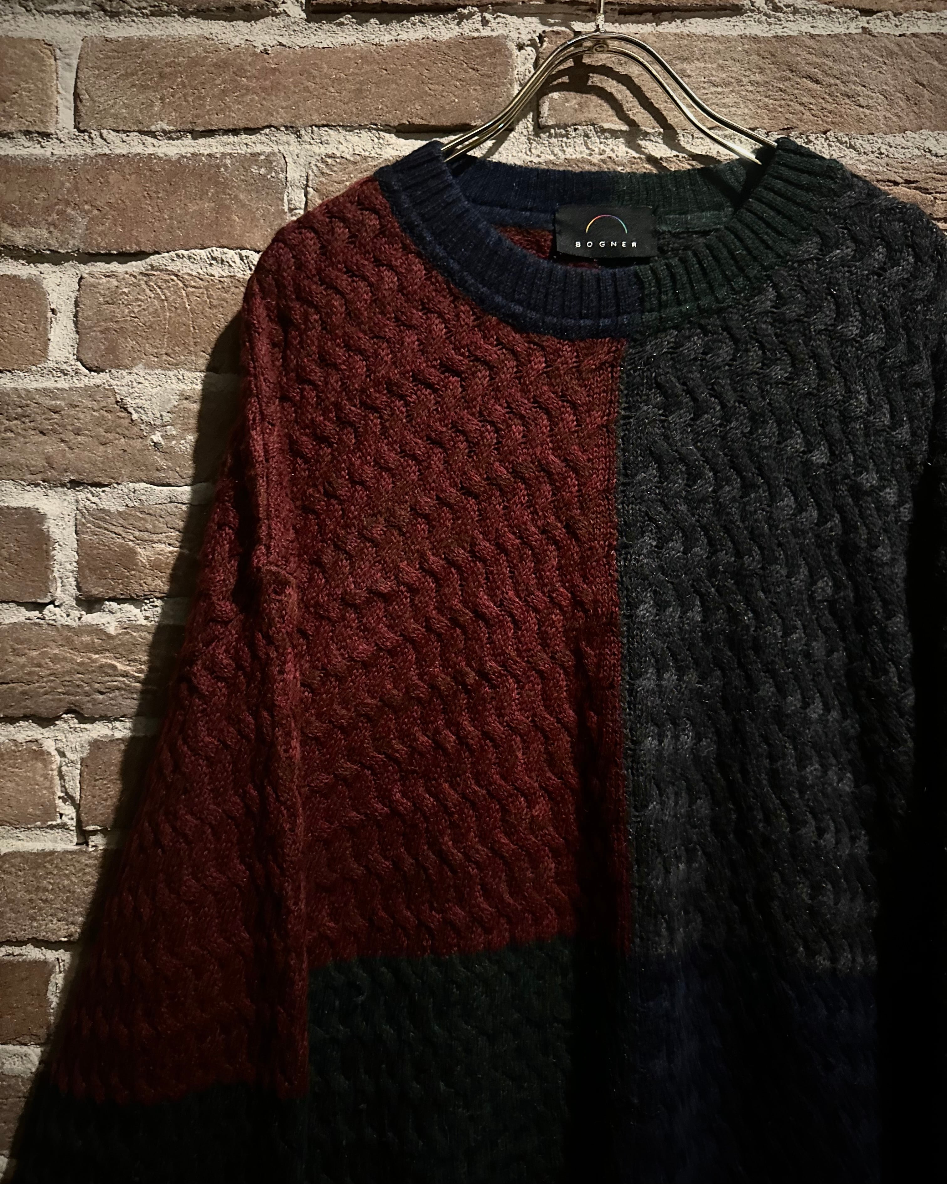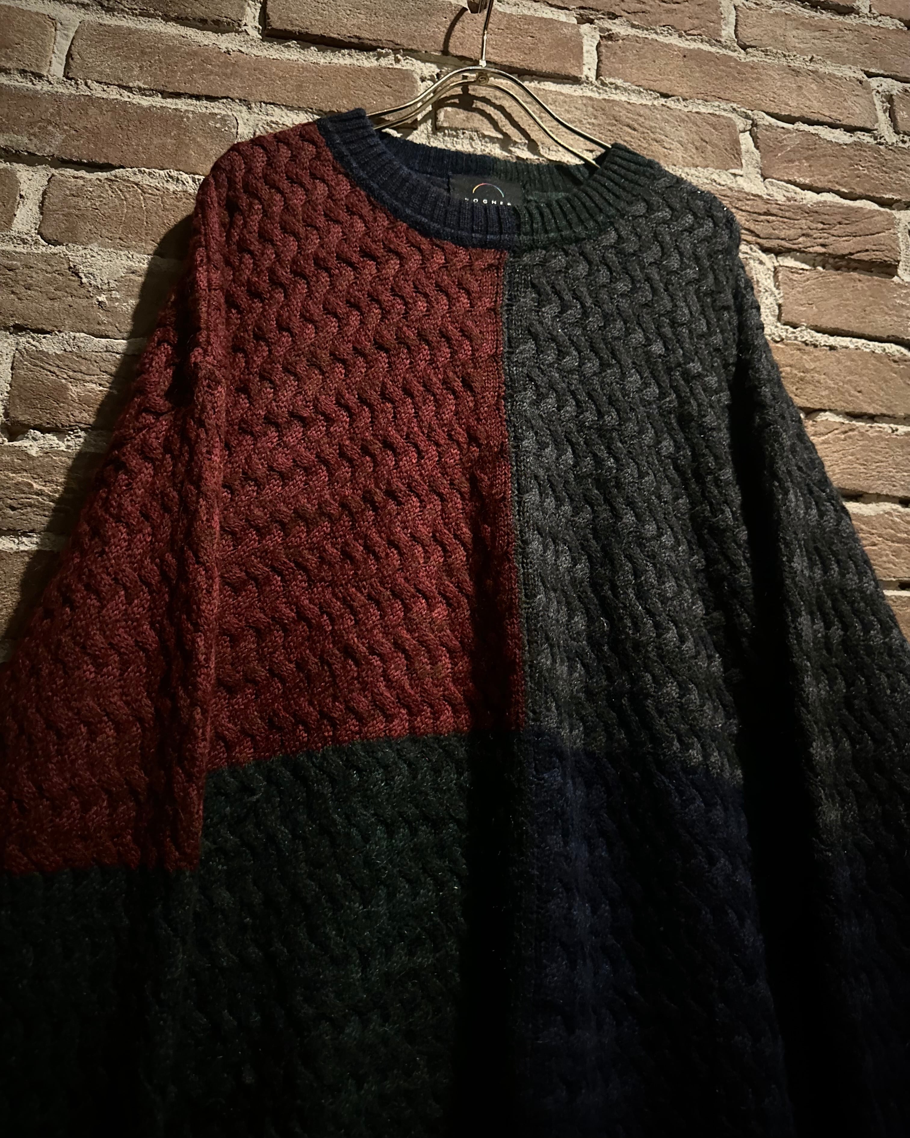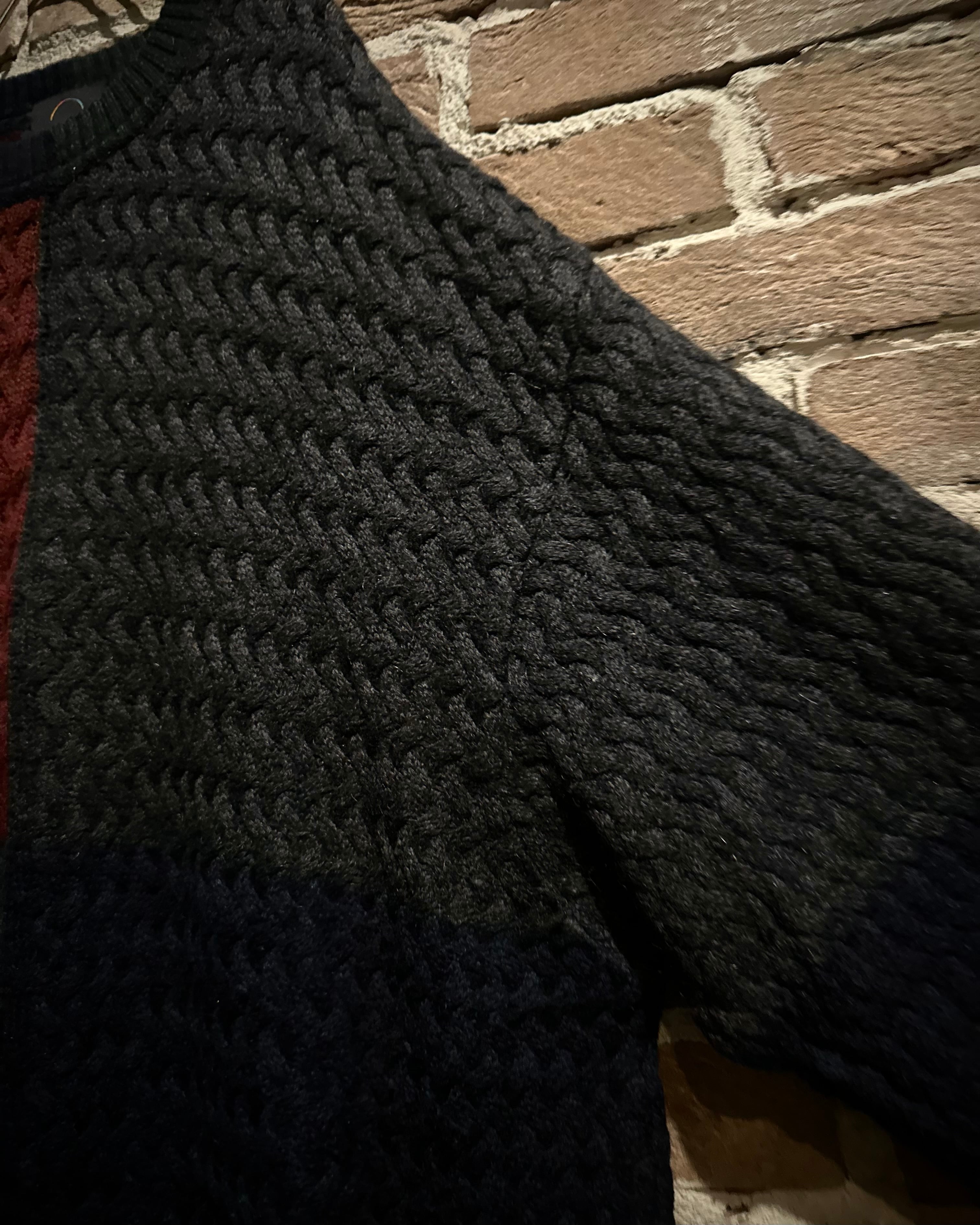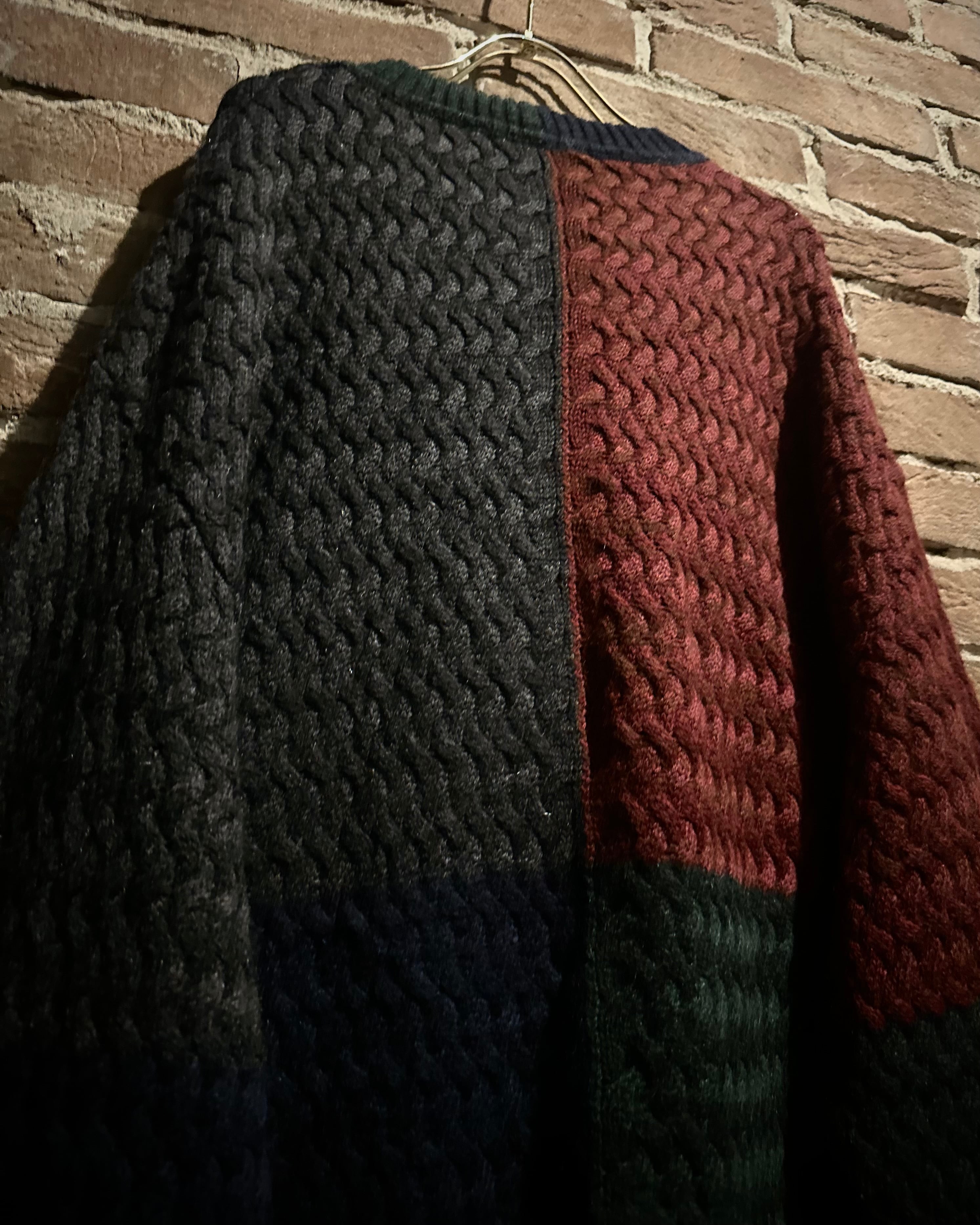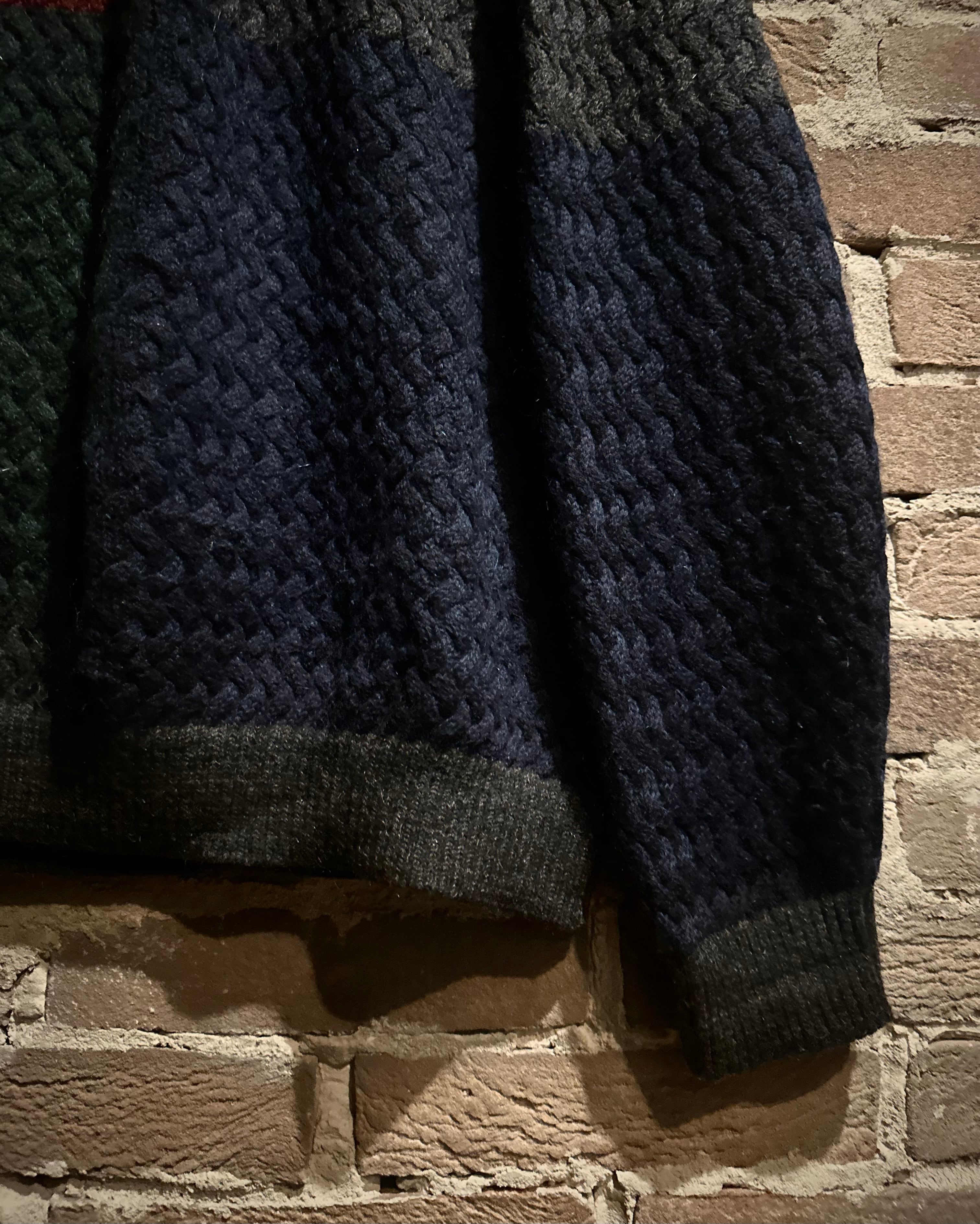 パネル状に切り替えたカラーは、深みのあるワインレッド・フォレストグリーン・ネイビーを組み合わせた重厚で遊び心ある配色。波打つようなケーブル編みがさらに奥行きを与え、視覚的にも豊かな表情を生み出します。