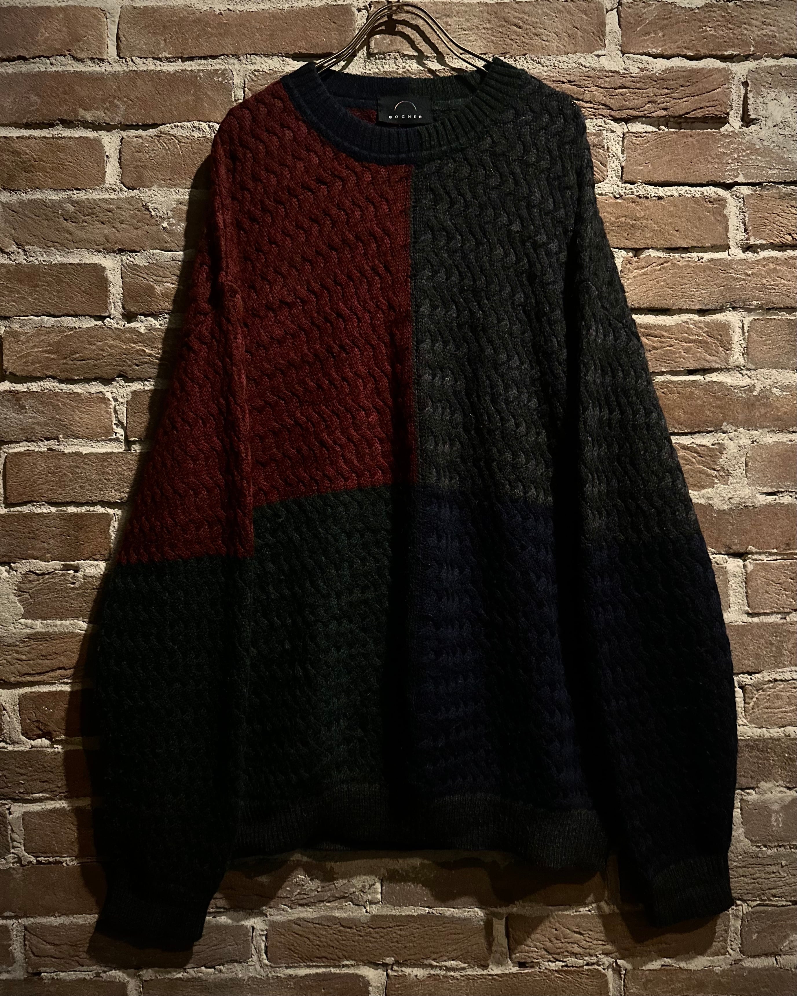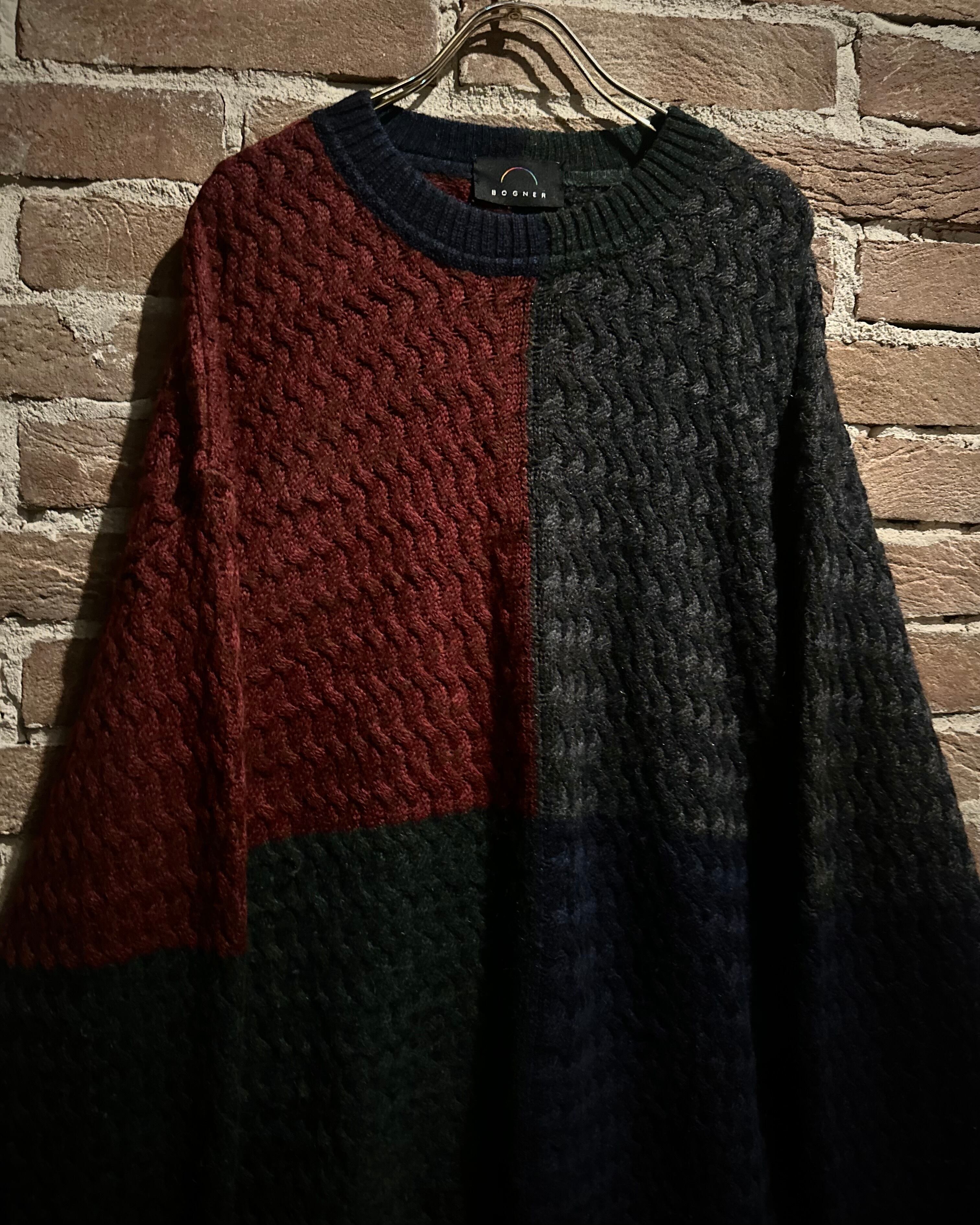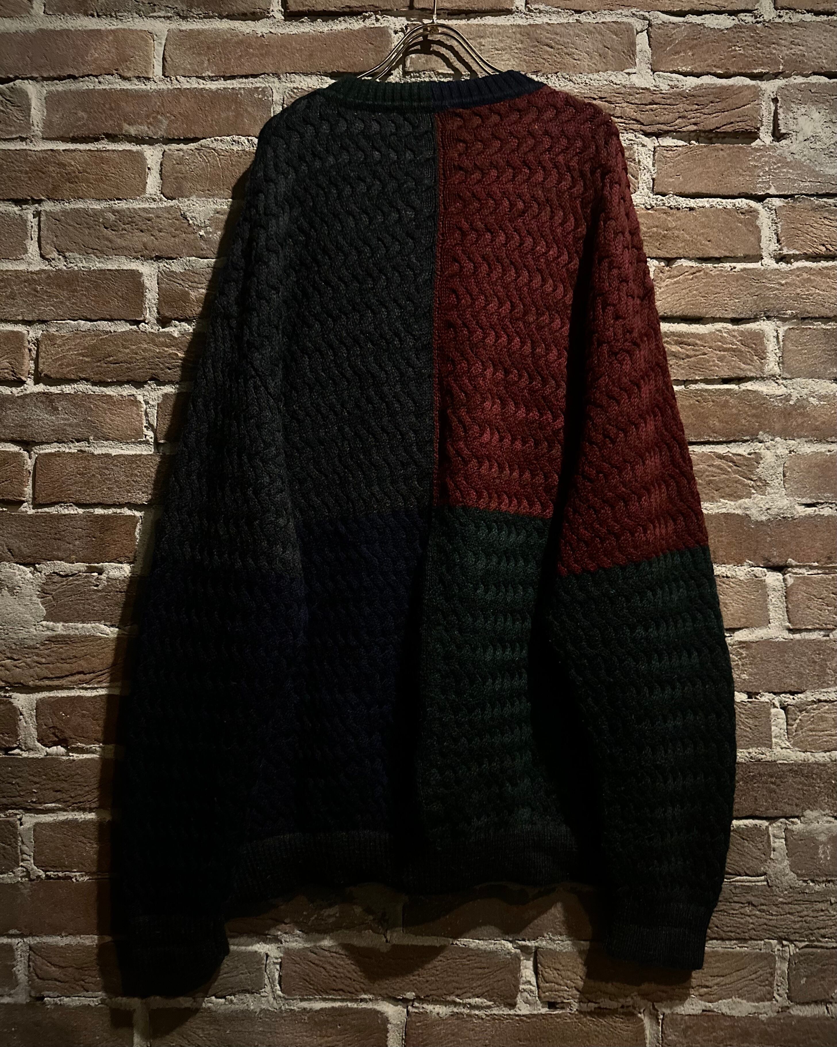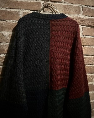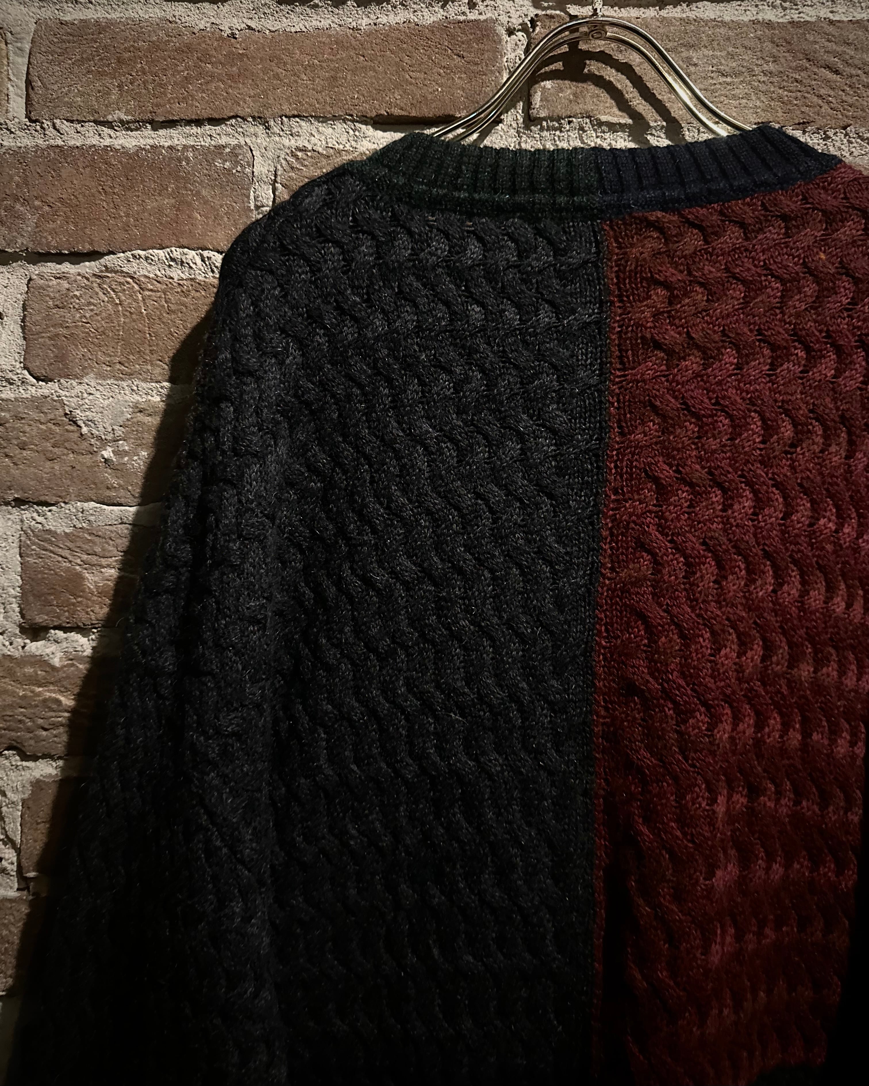 パネル状に切り替えたカラーは、深みのあるワインレッド・フォレストグリーン・ネイビーを組み合わせた重厚で遊び心ある配色。波打つようなケーブル編みがさらに奥行きを与え、視覚的にも豊かな表情を生み出します。