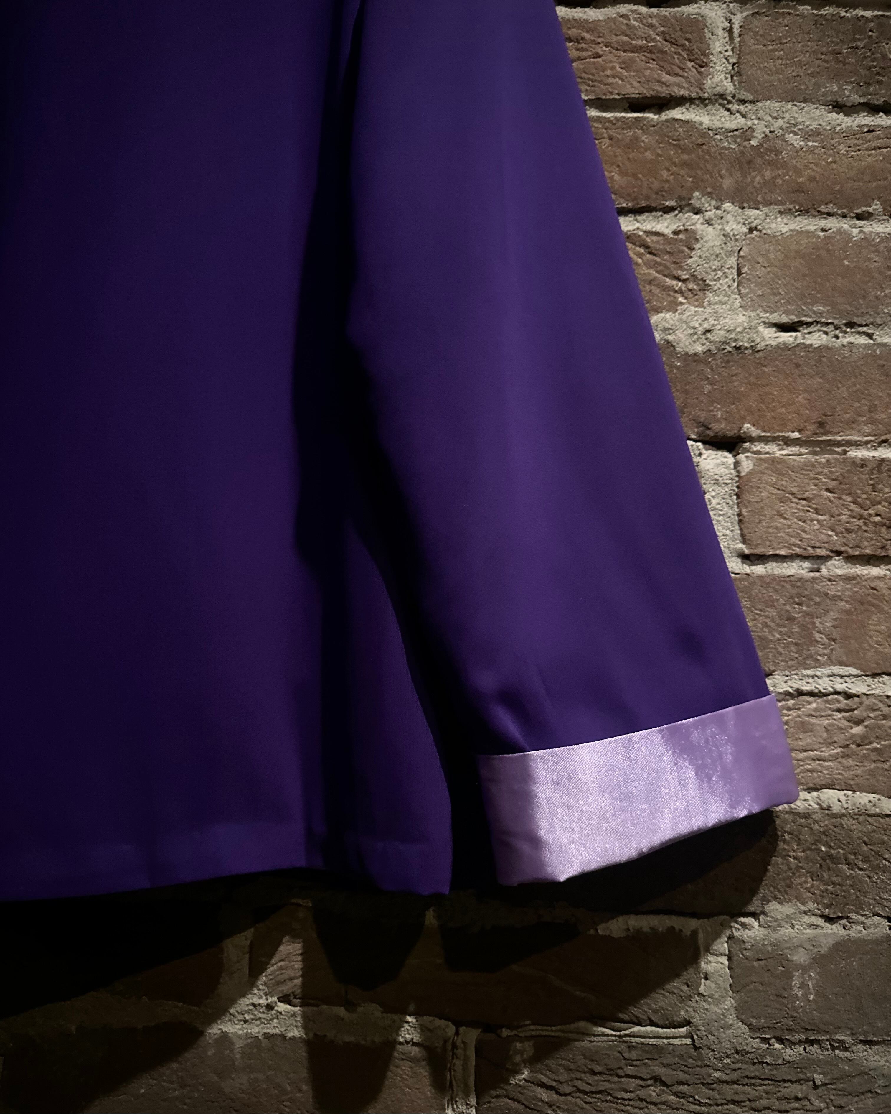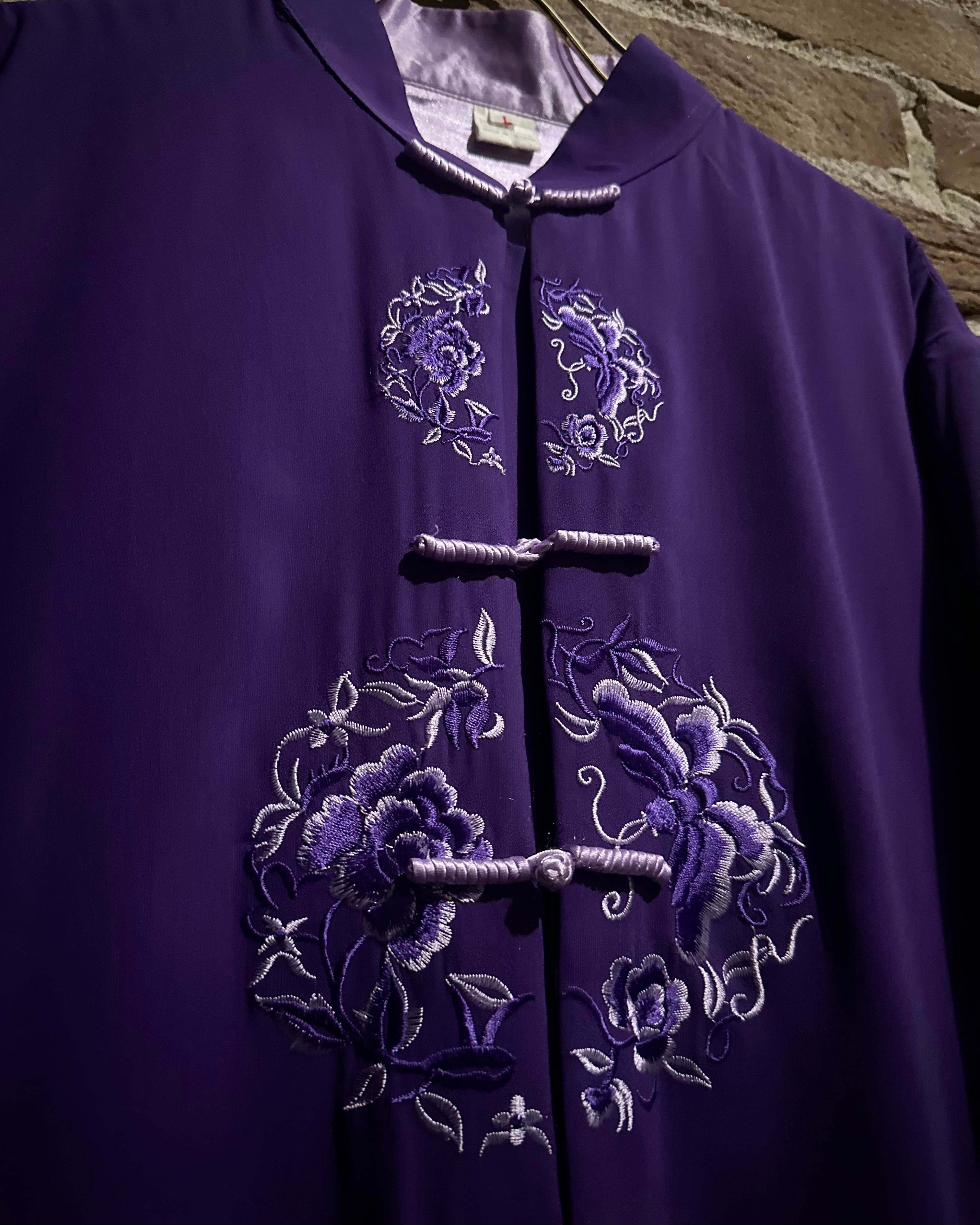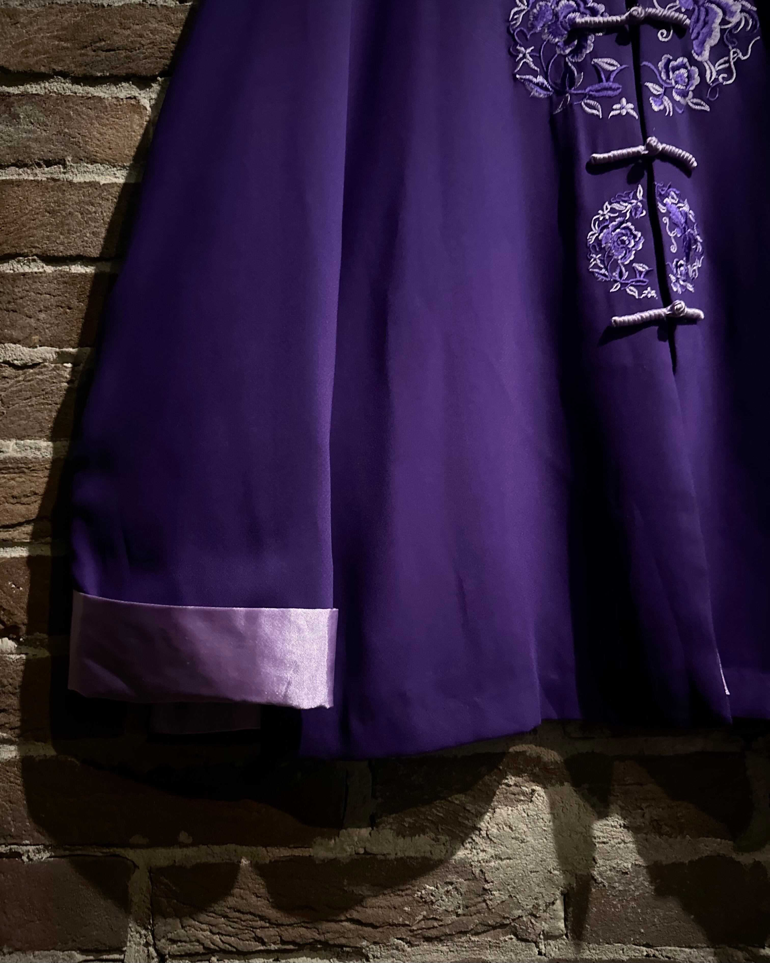 フロントにはチャイナボタンと花の刺繍をあしらい、同系色のパープル糸による刺繍は立体感とさりげない陰影を加え、余裕ある華やかさを演出。袖口を折り返すと現れるサテン地のライニングも見逃せないディテールです。