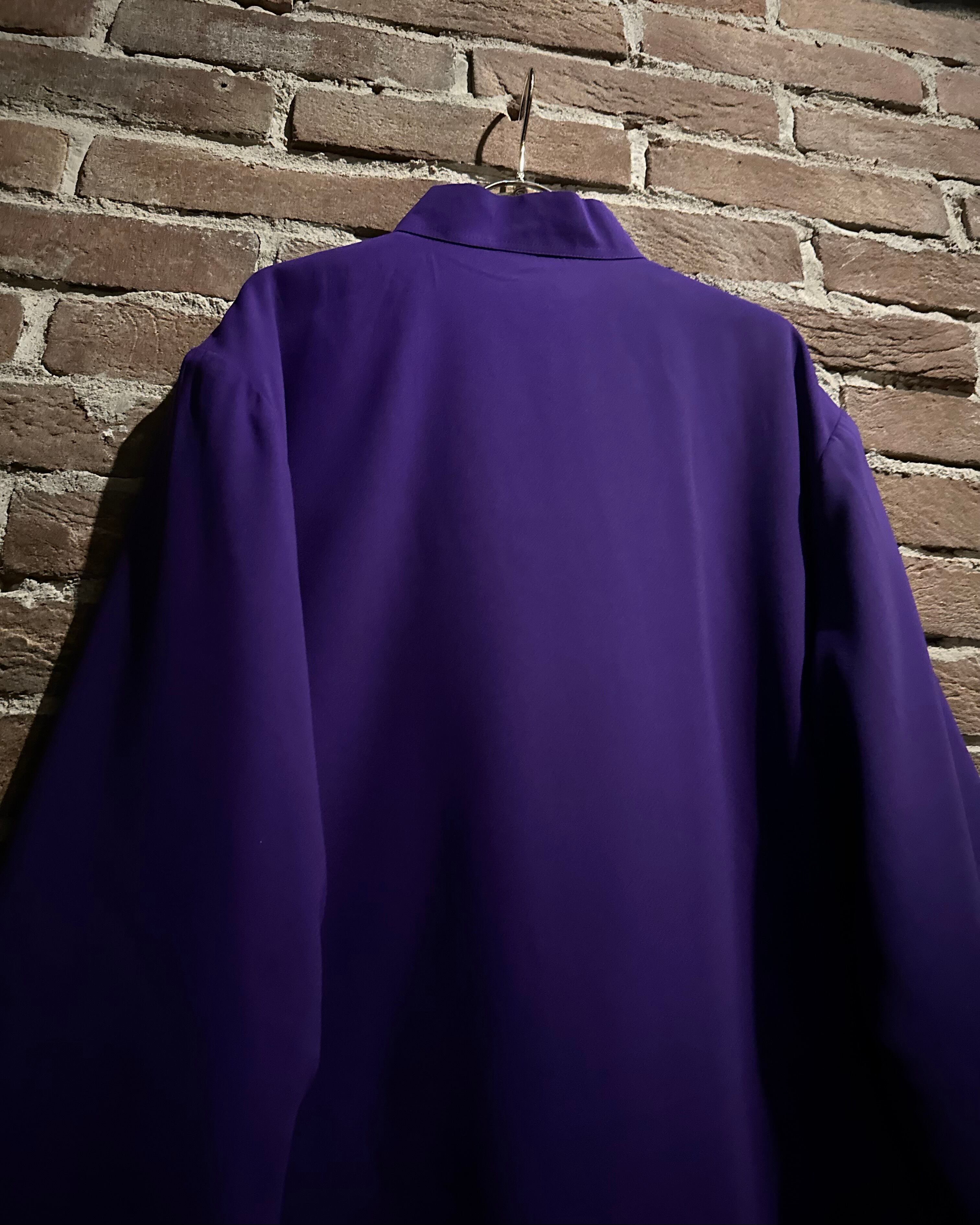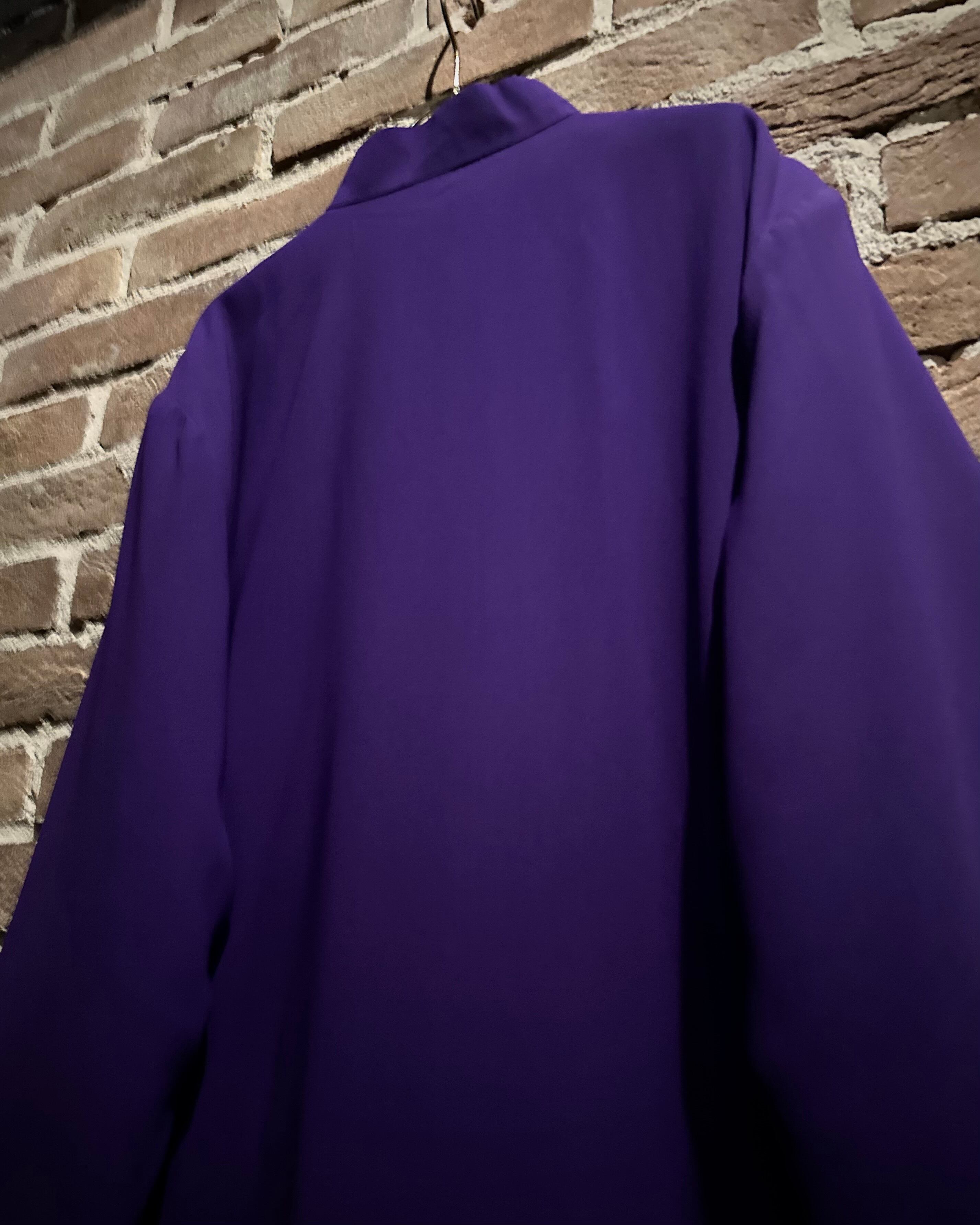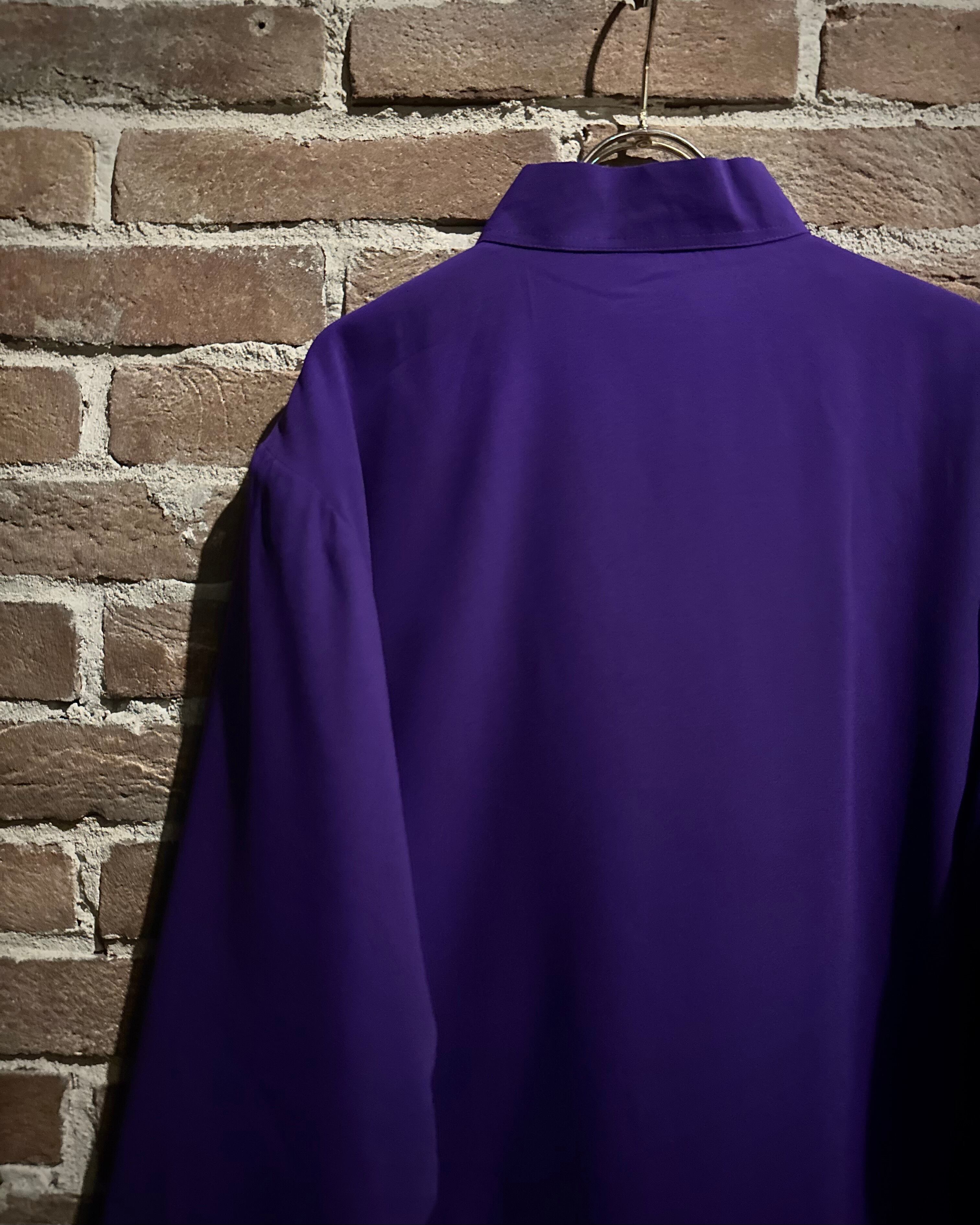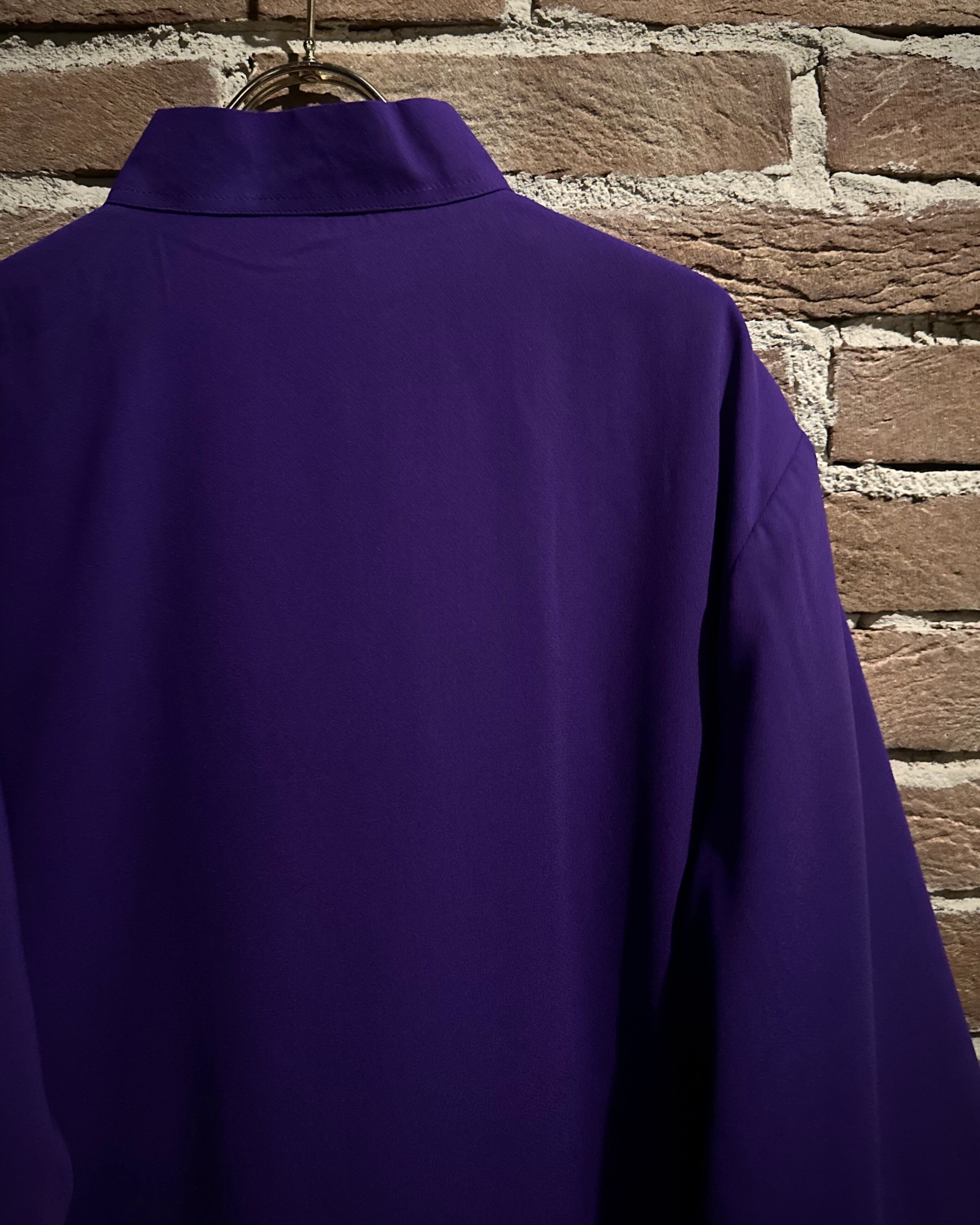深みあるパープルのボディは、光沢を抑えつつもしなやかに揺れる上質なシルク×ポリエステル混紡素材を採用。見る角度で艶感が浮かび上がり、インナーにもアウターにも映える存在感を放ちます。