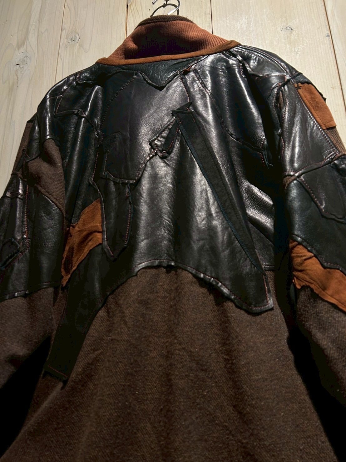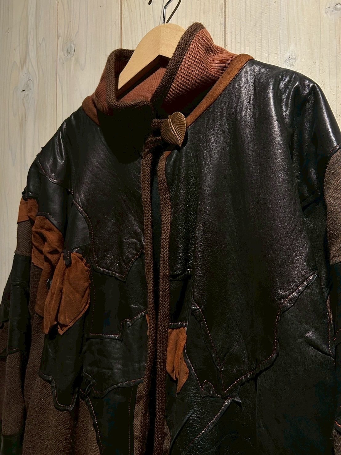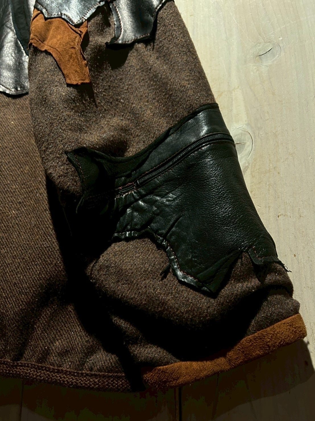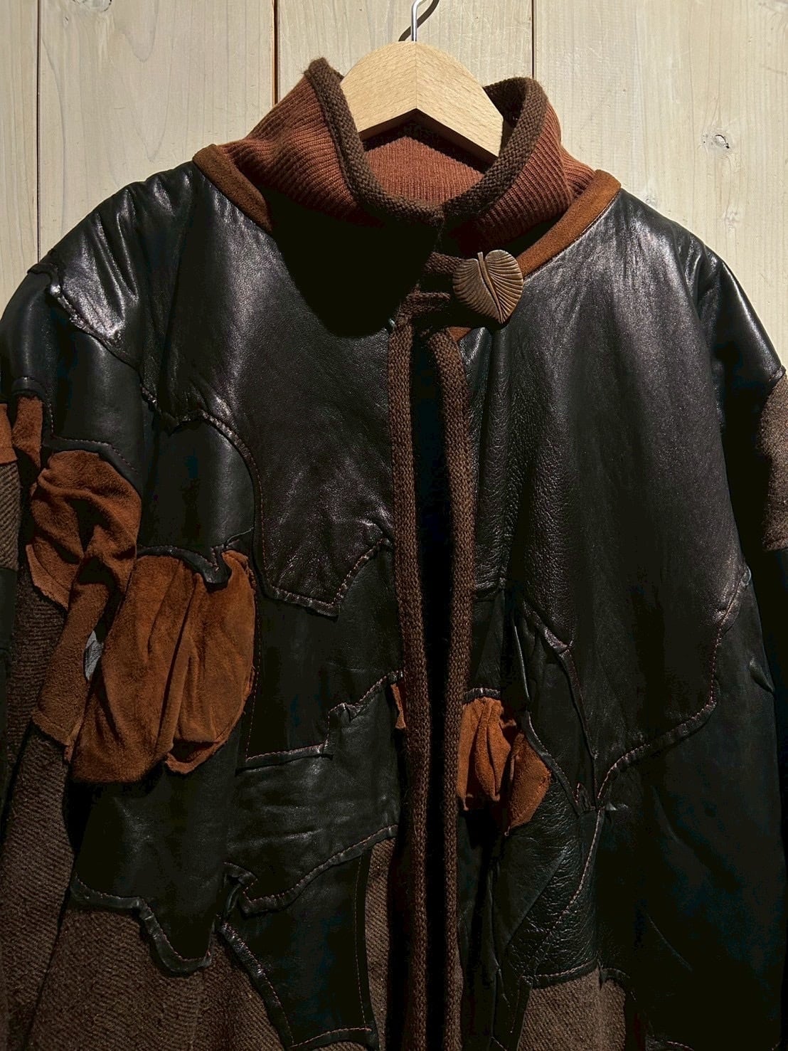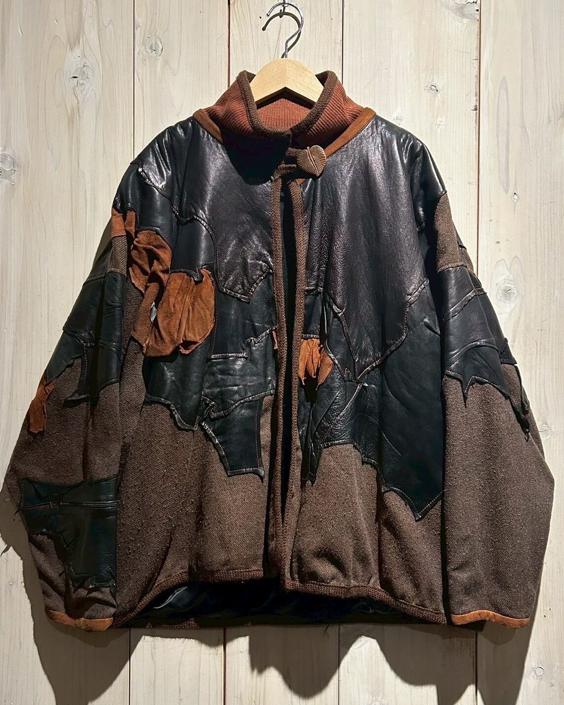 深みのあるブラウンウールをベースに、ブラックやブラウン、レンガ色といった異なるトーンのレザーを随所に重ね合わせることで、立体感と奥行きを生み出した圧巻の仕上がり。まるでアートピースのような存在感を放ち、他では決して出会えない唯一無二の一着に仕上がっています。