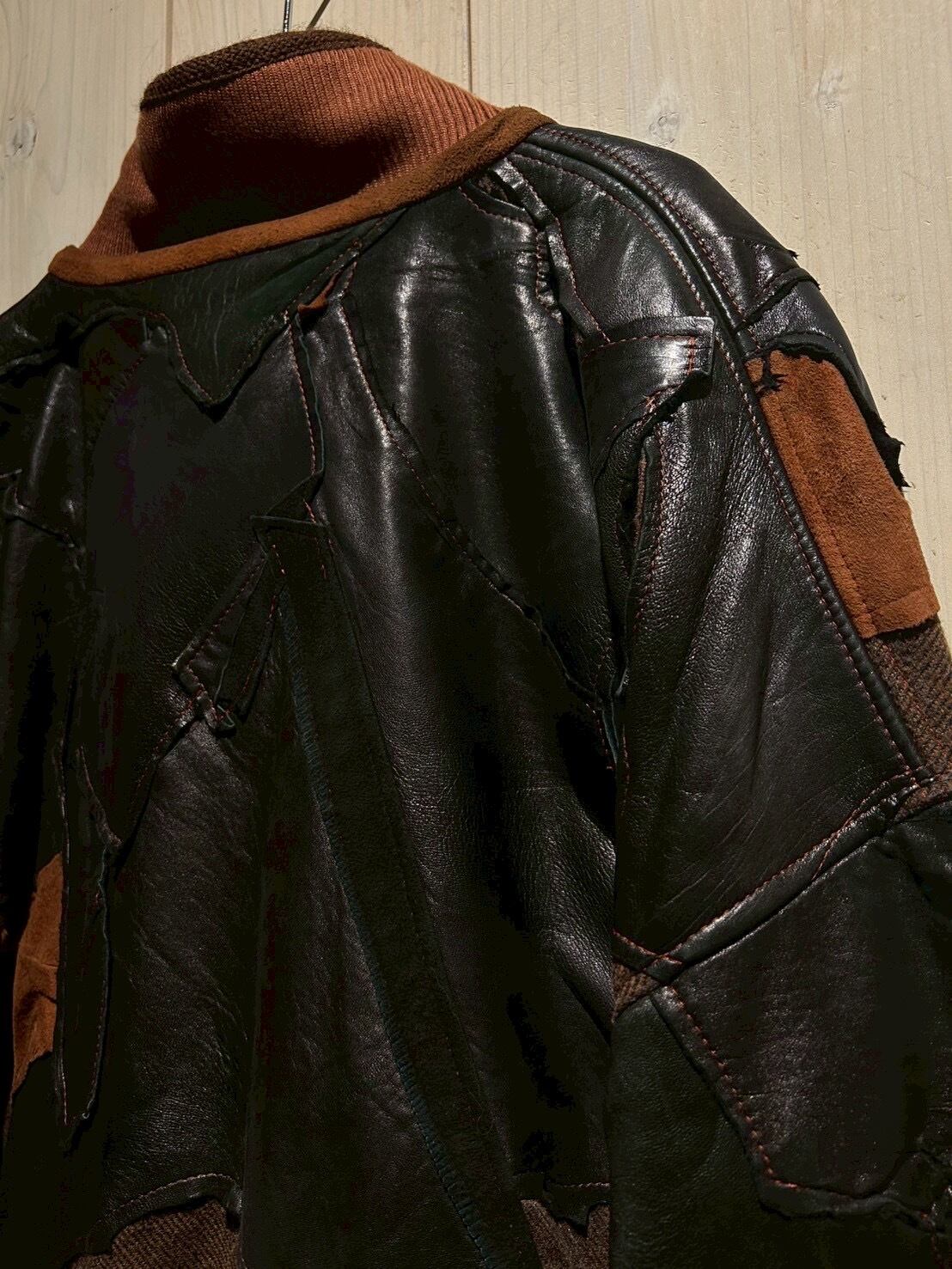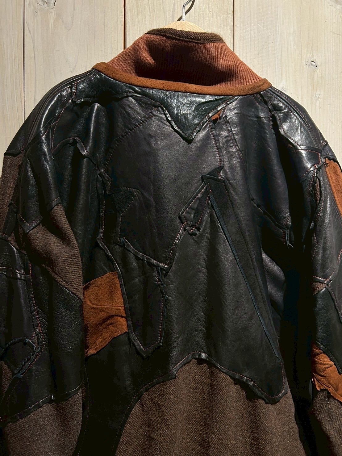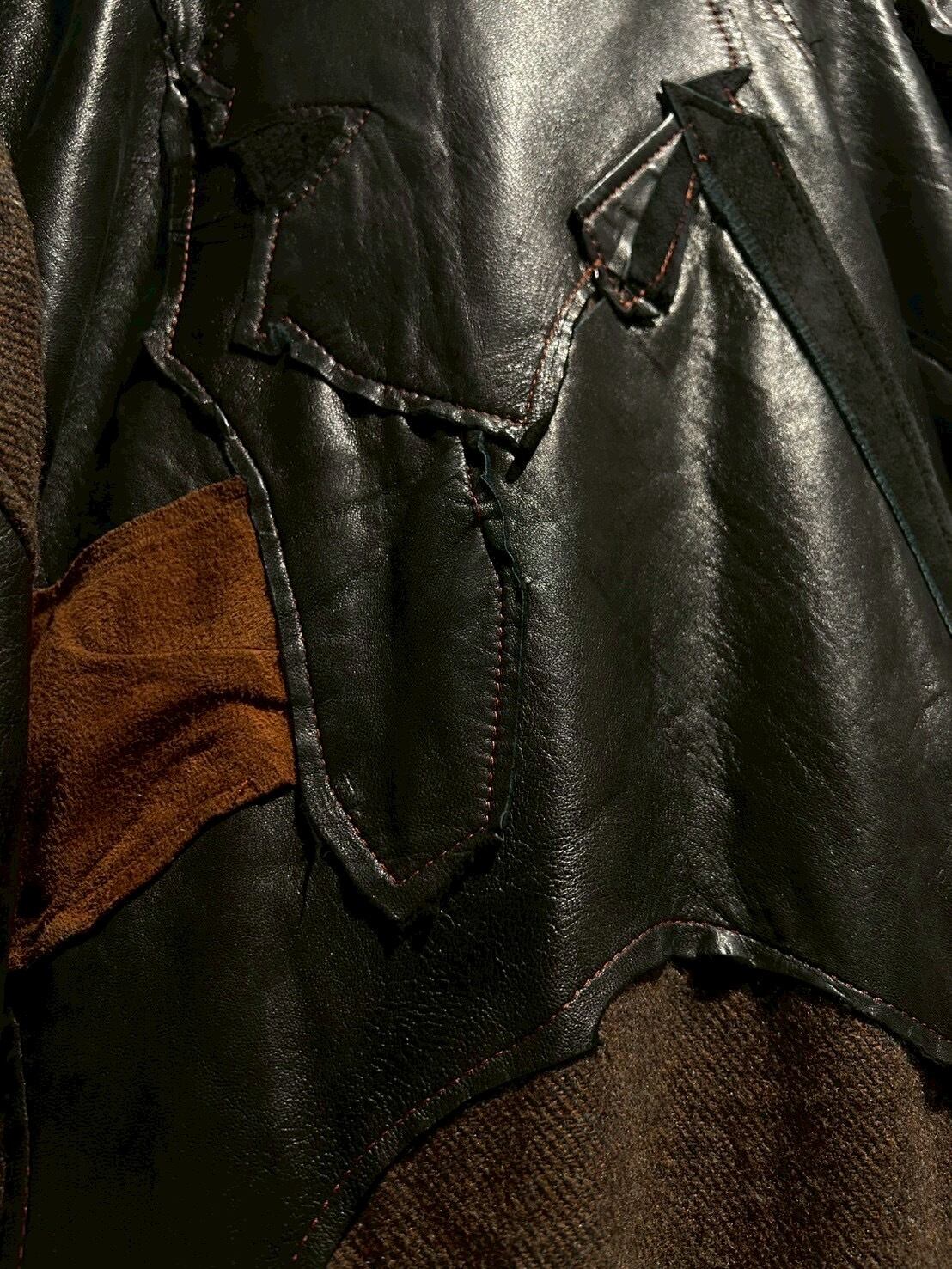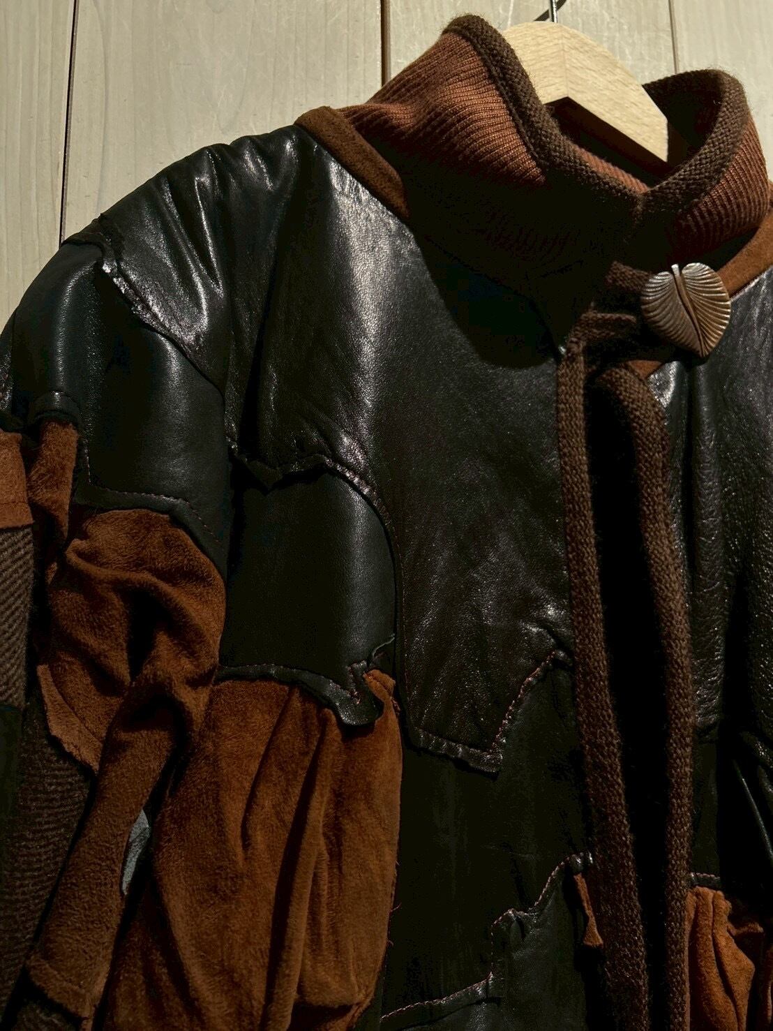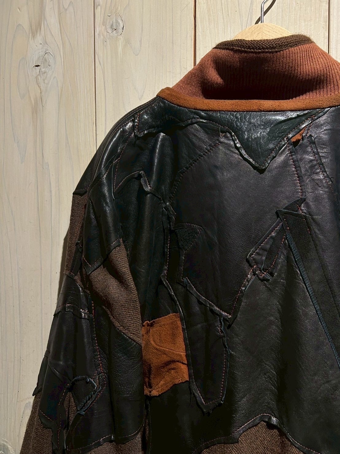 深みのあるブラウンウールをベースに、ブラックやブラウン、レンガ色といった異なるトーンのレザーを随所に重ね合わせることで、立体感と奥行きを生み出した圧巻の仕上がり。まるでアートピースのような存在感を放ち、他では決して出会えない唯一無二の一着に仕上がっています。