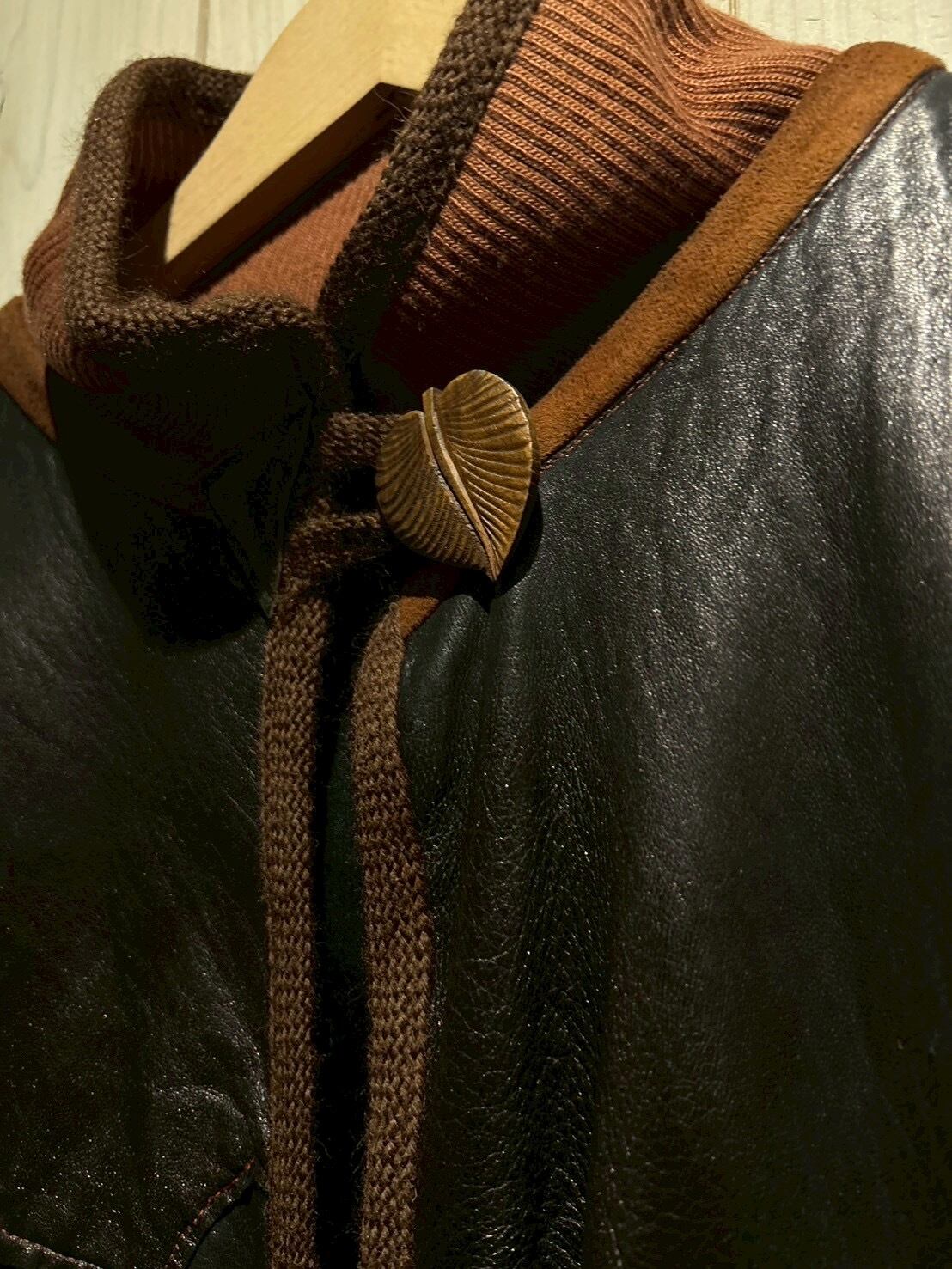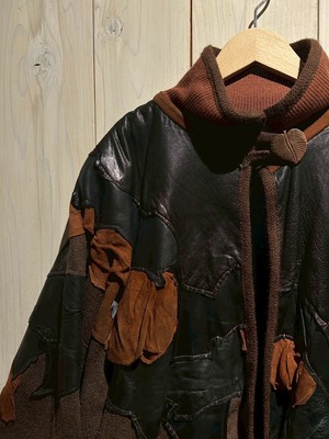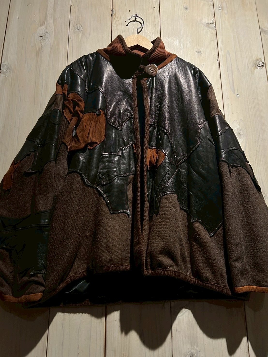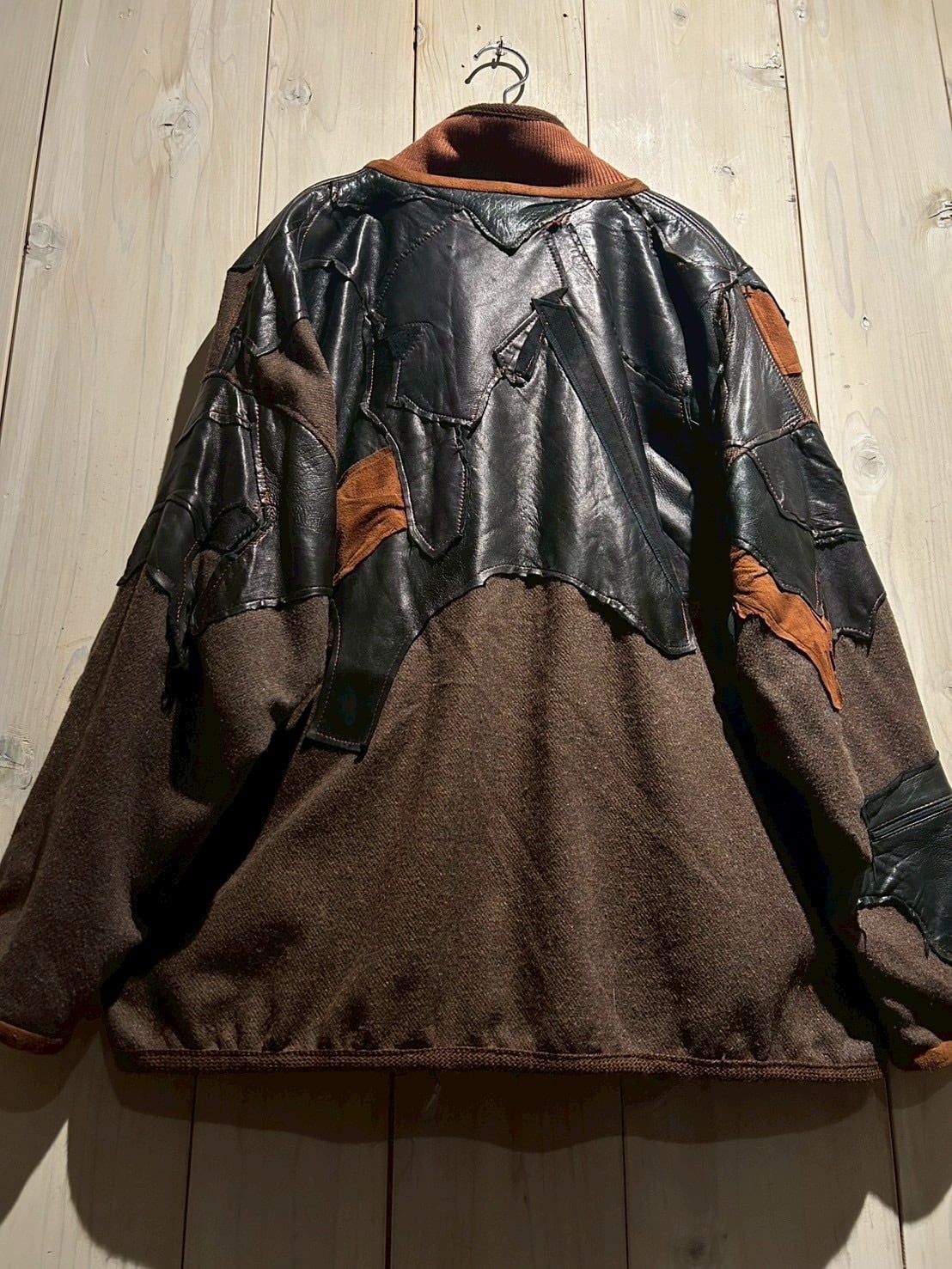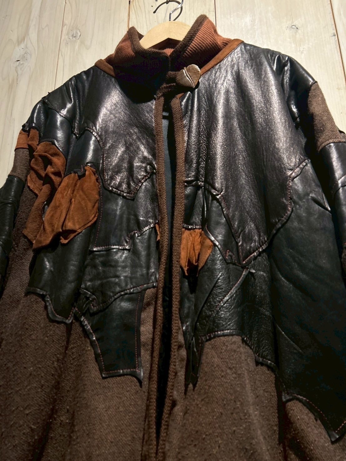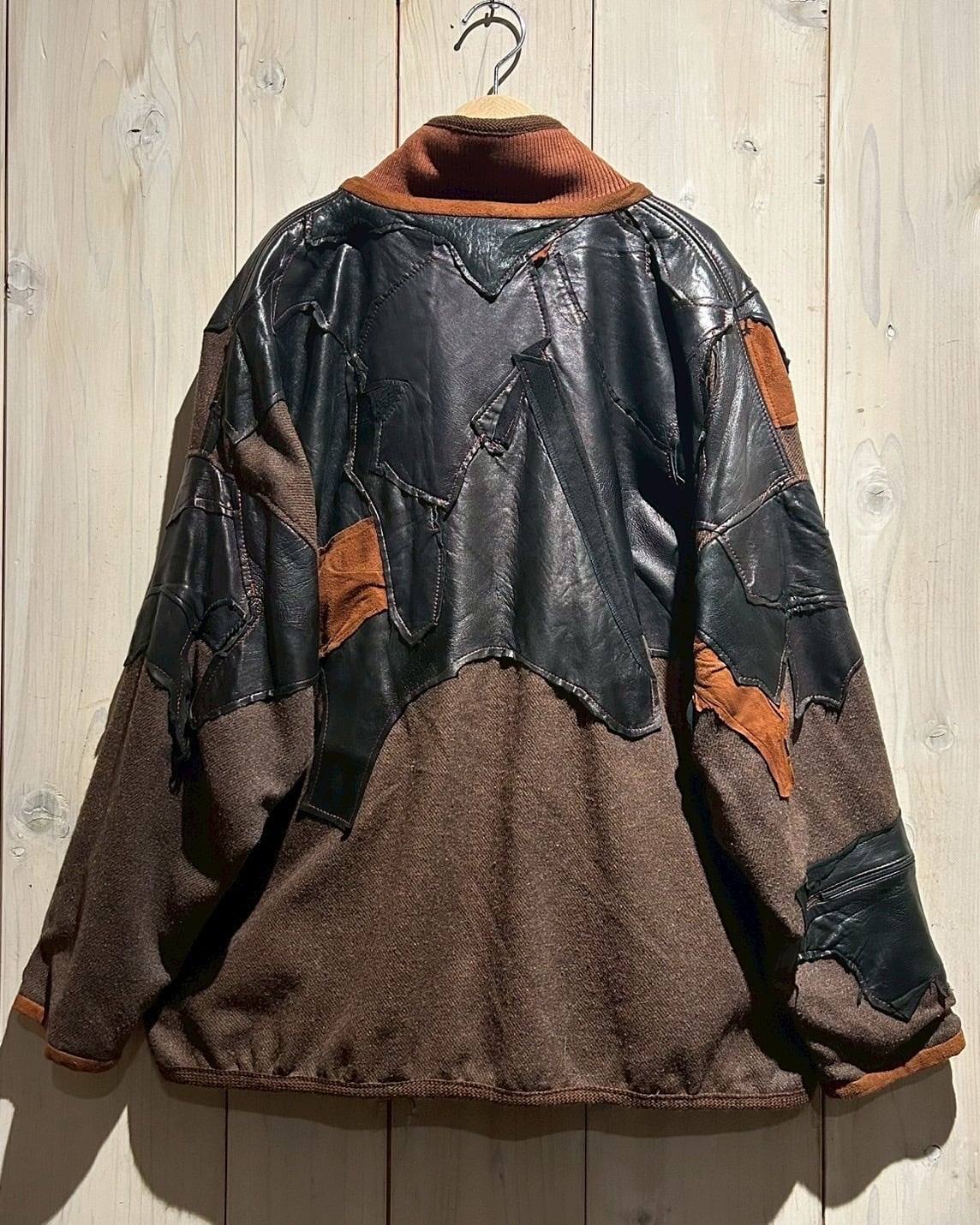 深みのあるブラウンウールをベースに、ブラックやブラウン、レンガ色といった異なるトーンのレザーを随所に重ね合わせることで、立体感と奥行きを生み出した圧巻の仕上がり。まるでアートピースのような存在感を放ち、他では決して出会えない唯一無二の一着に仕上がっています。