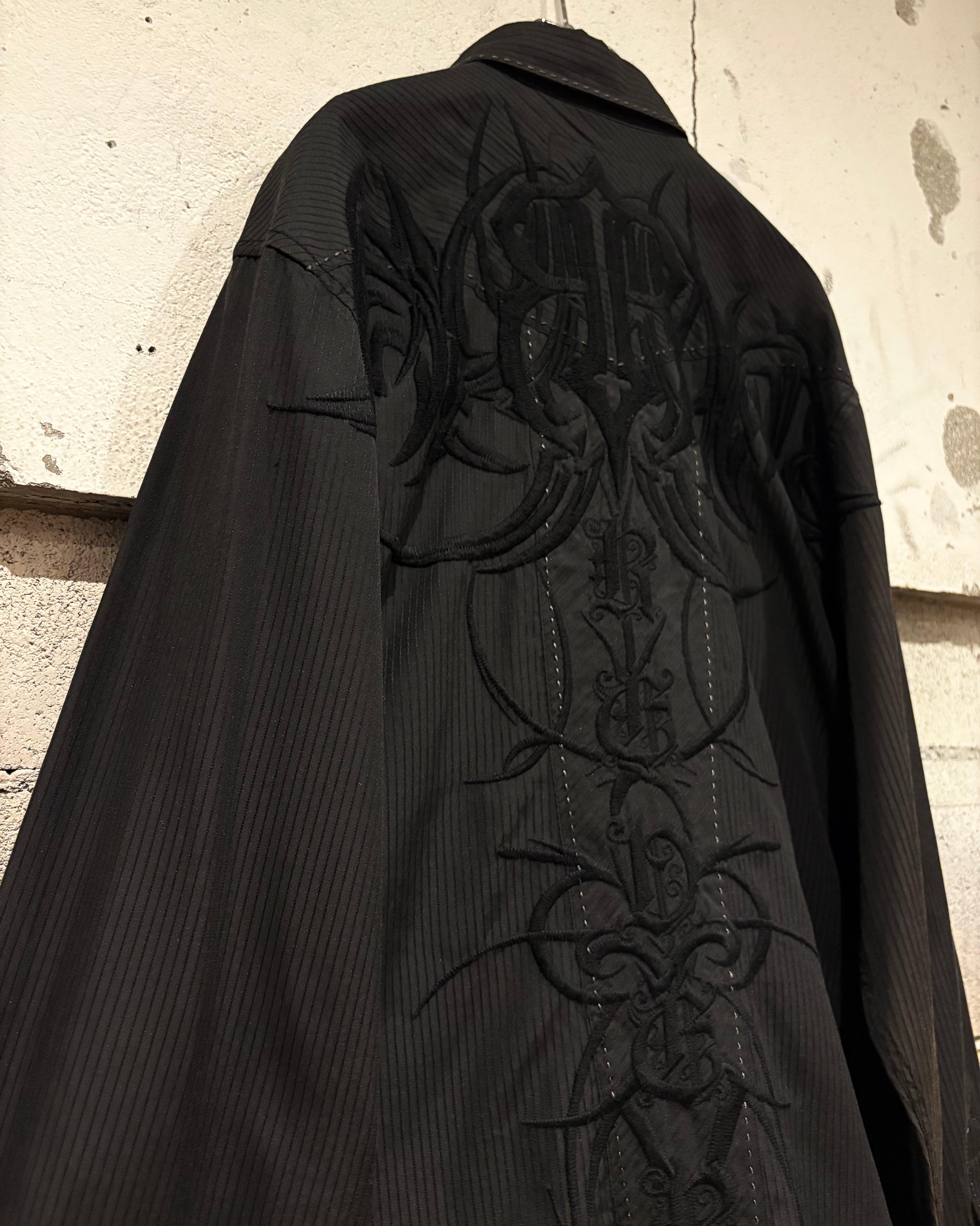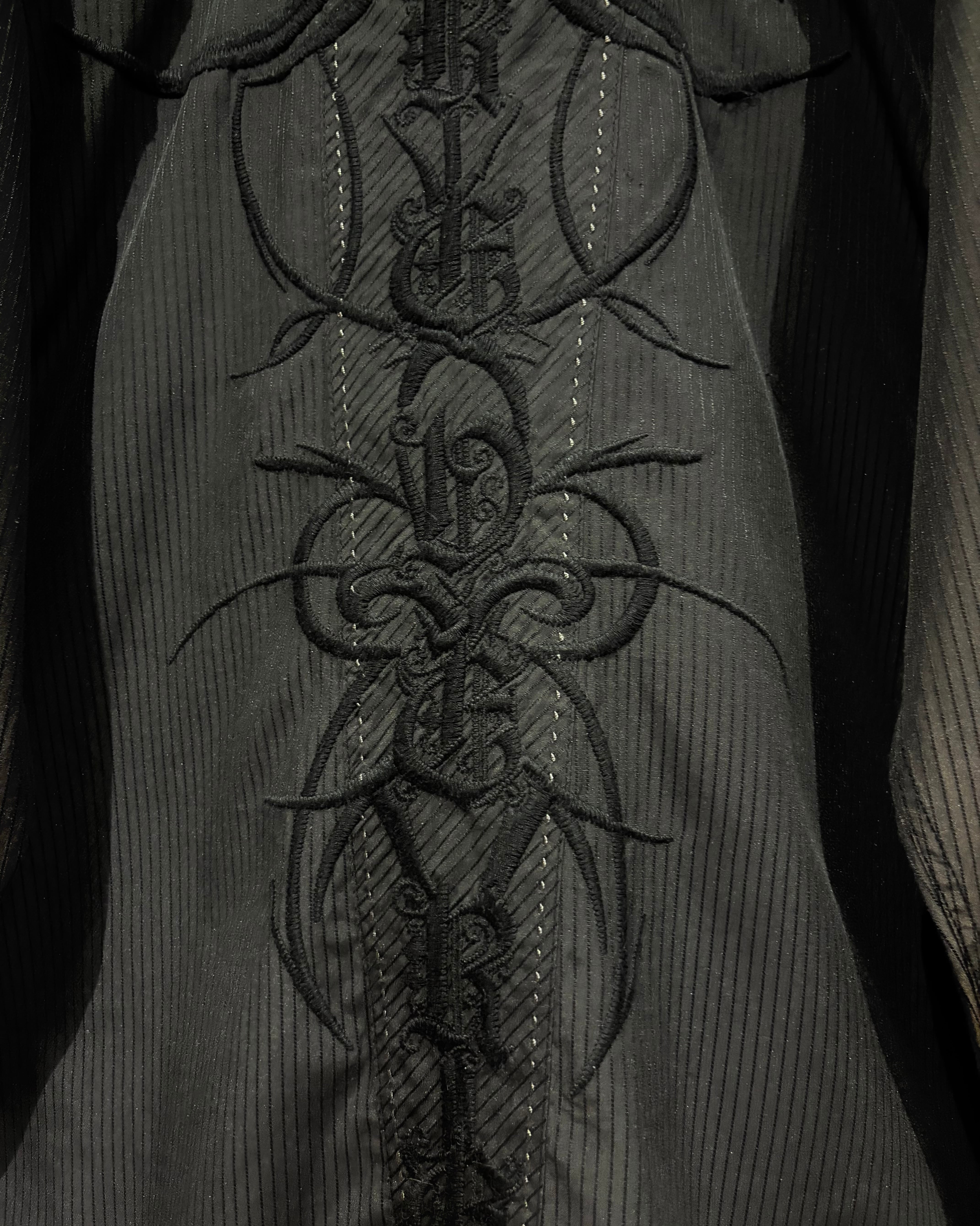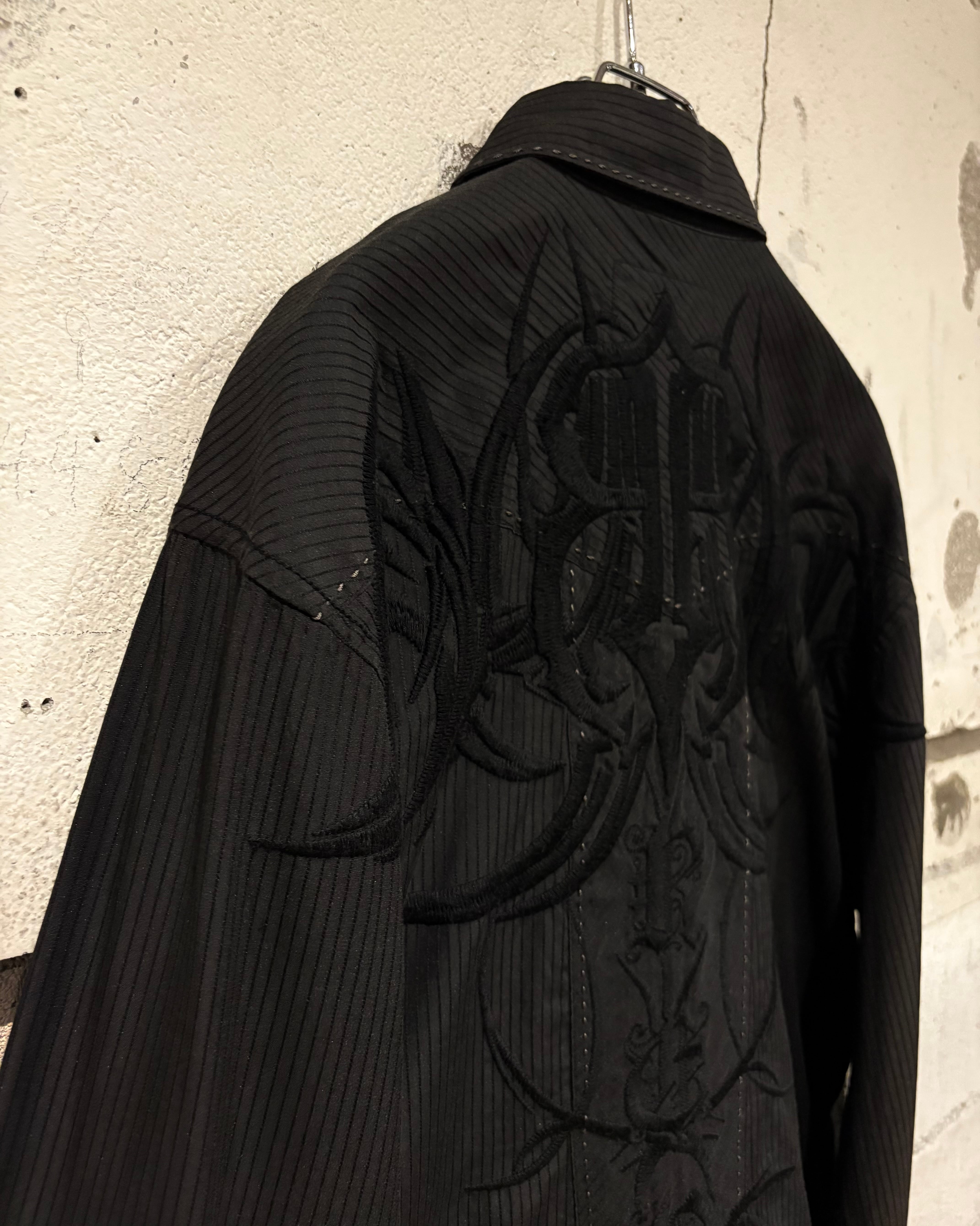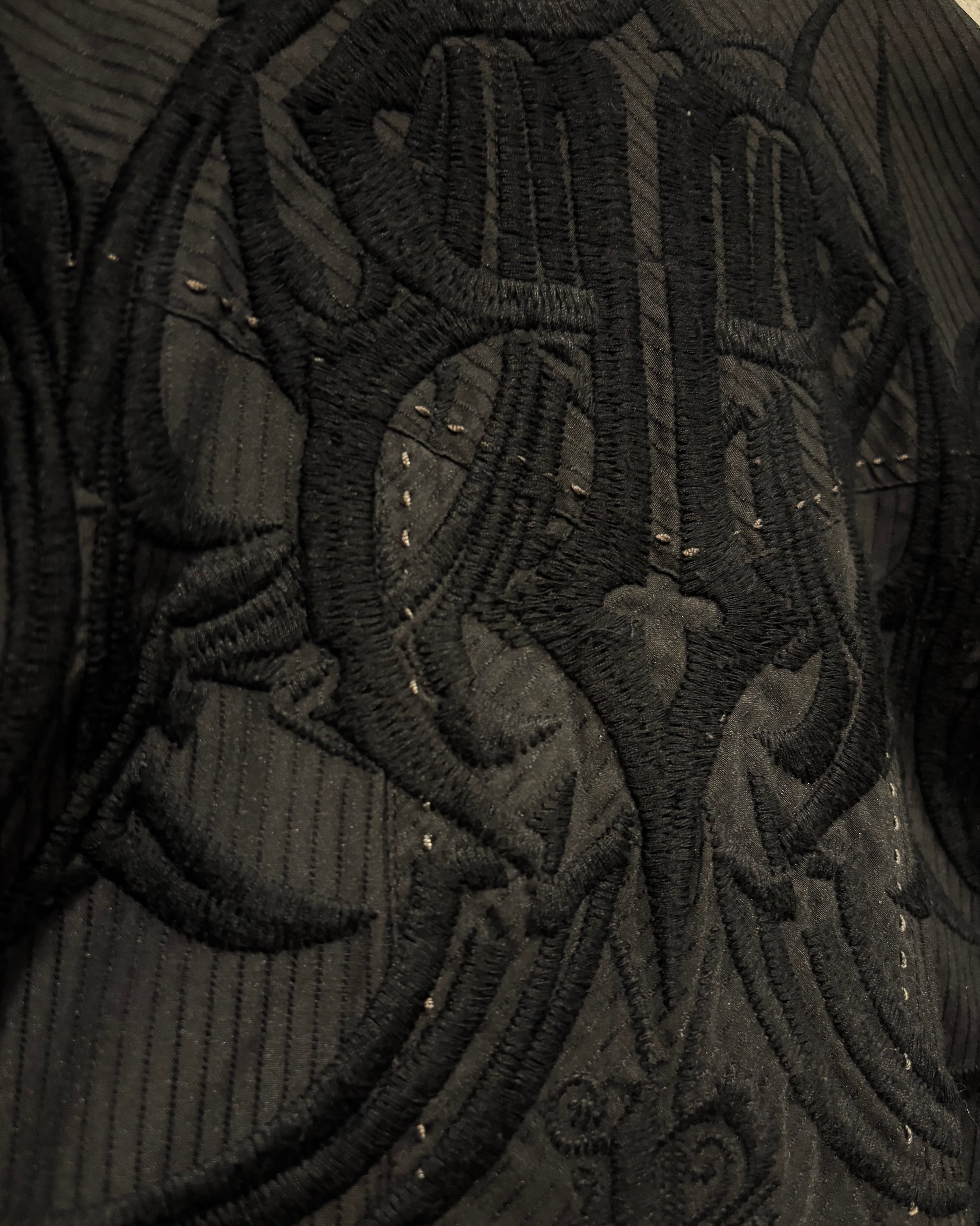 黒ボディにブラックストライプを走らせ、ステッチにはあえて白糸を使用することでコントラストを効かせたボディに、ゴシックなデザインを刺繍で表現した1着。