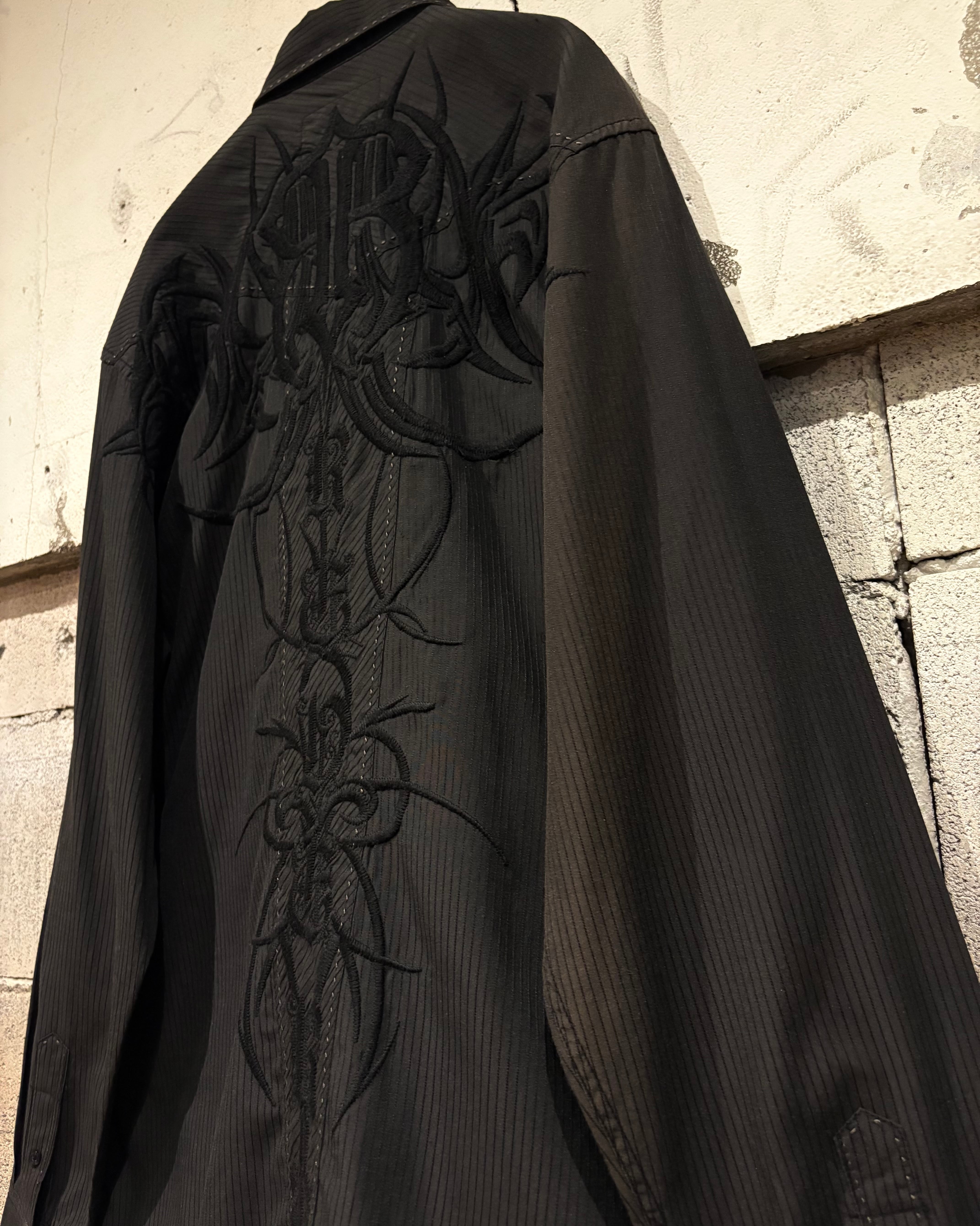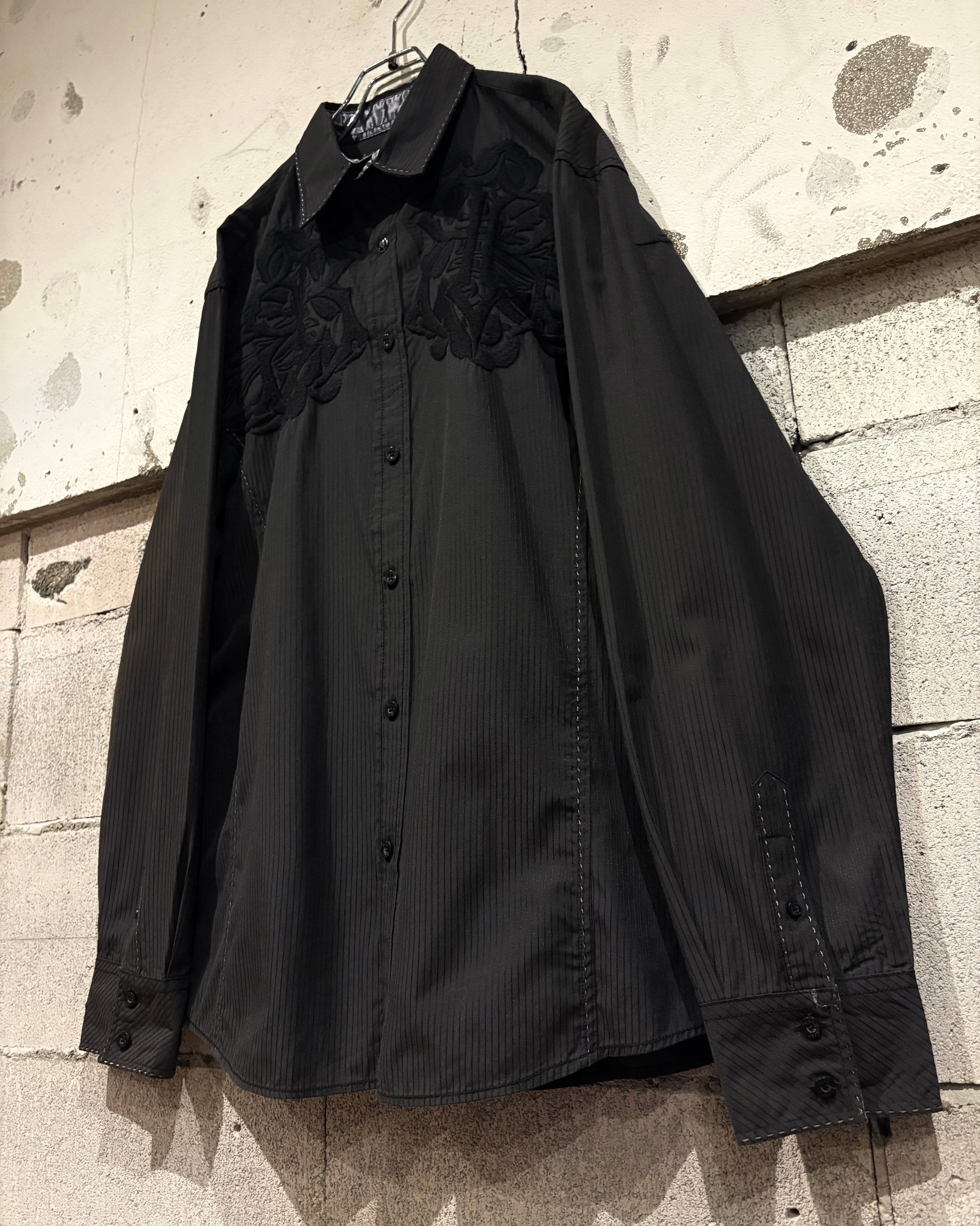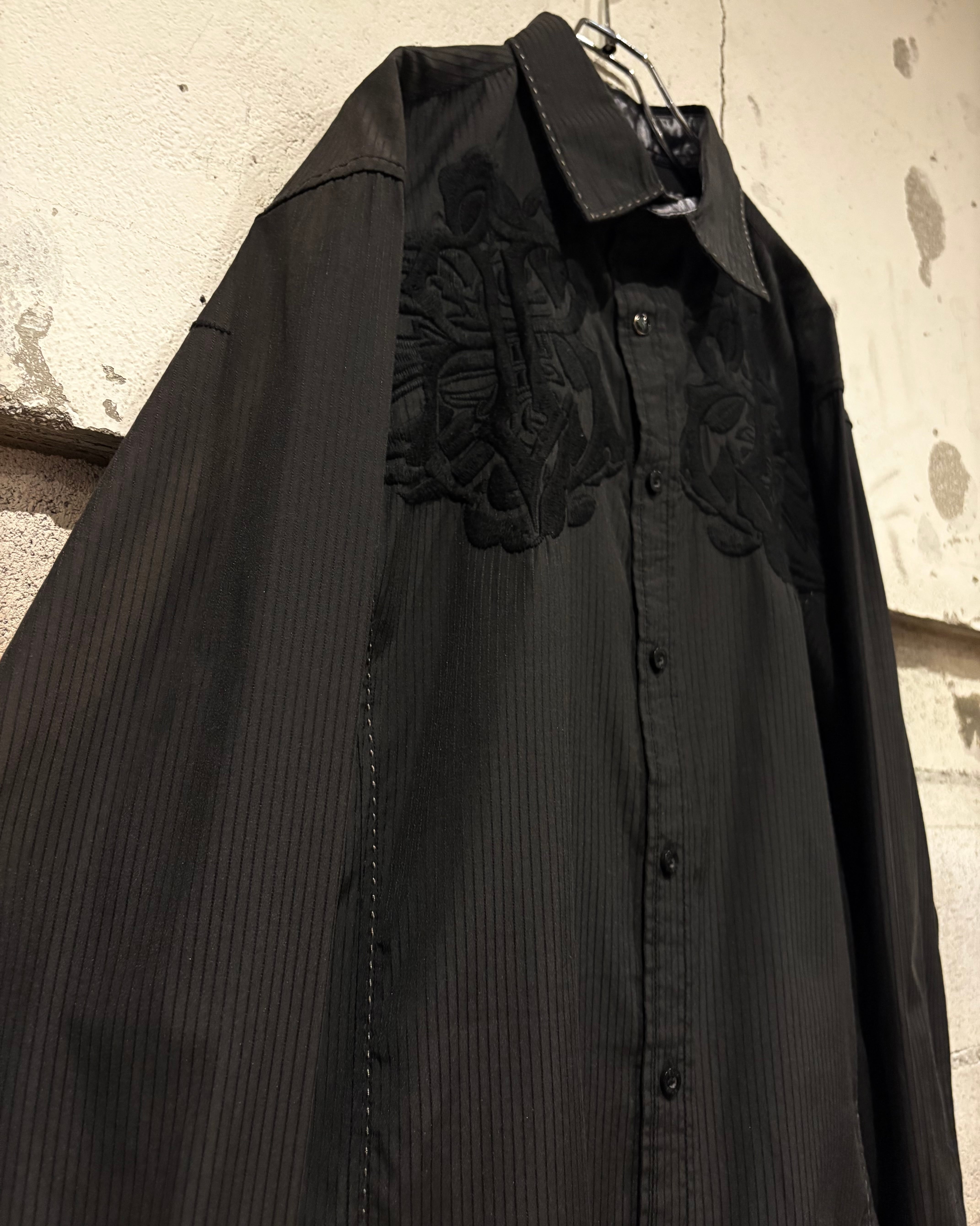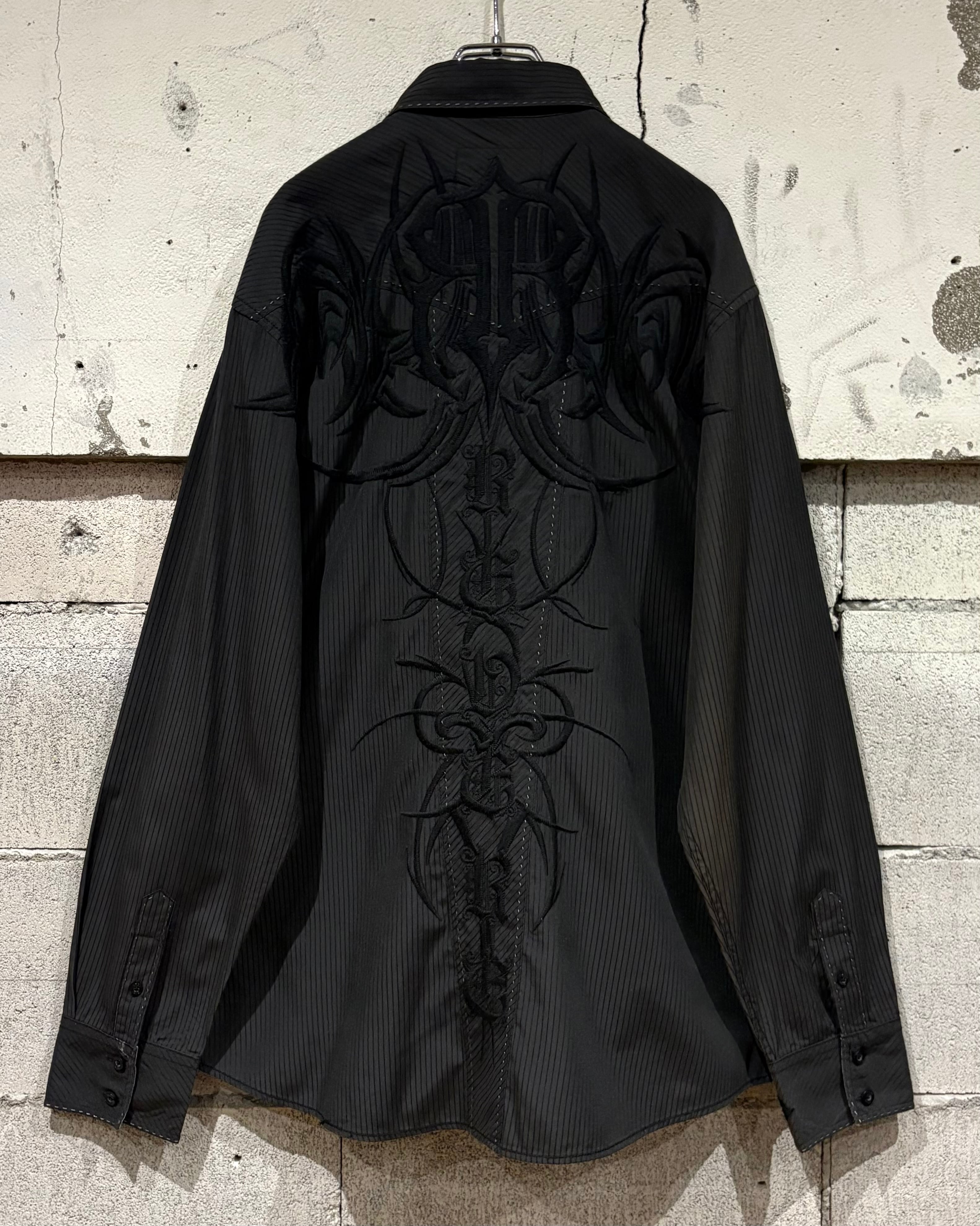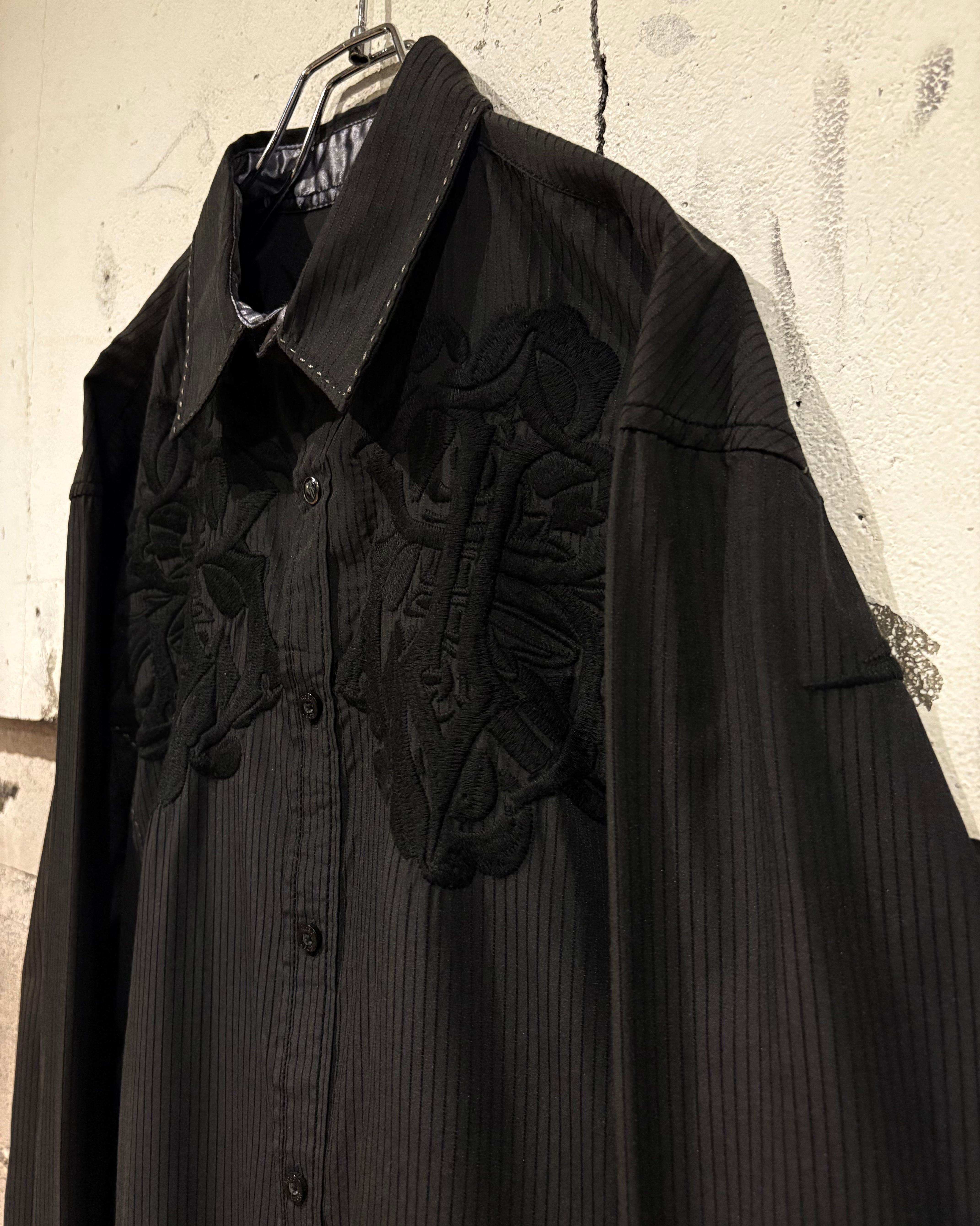 黒ボディにブラックストライプを走らせ、ステッチにはあえて白糸を使用することでコントラストを効かせたボディに、ゴシックなデザインを刺繍で表現した1着。
