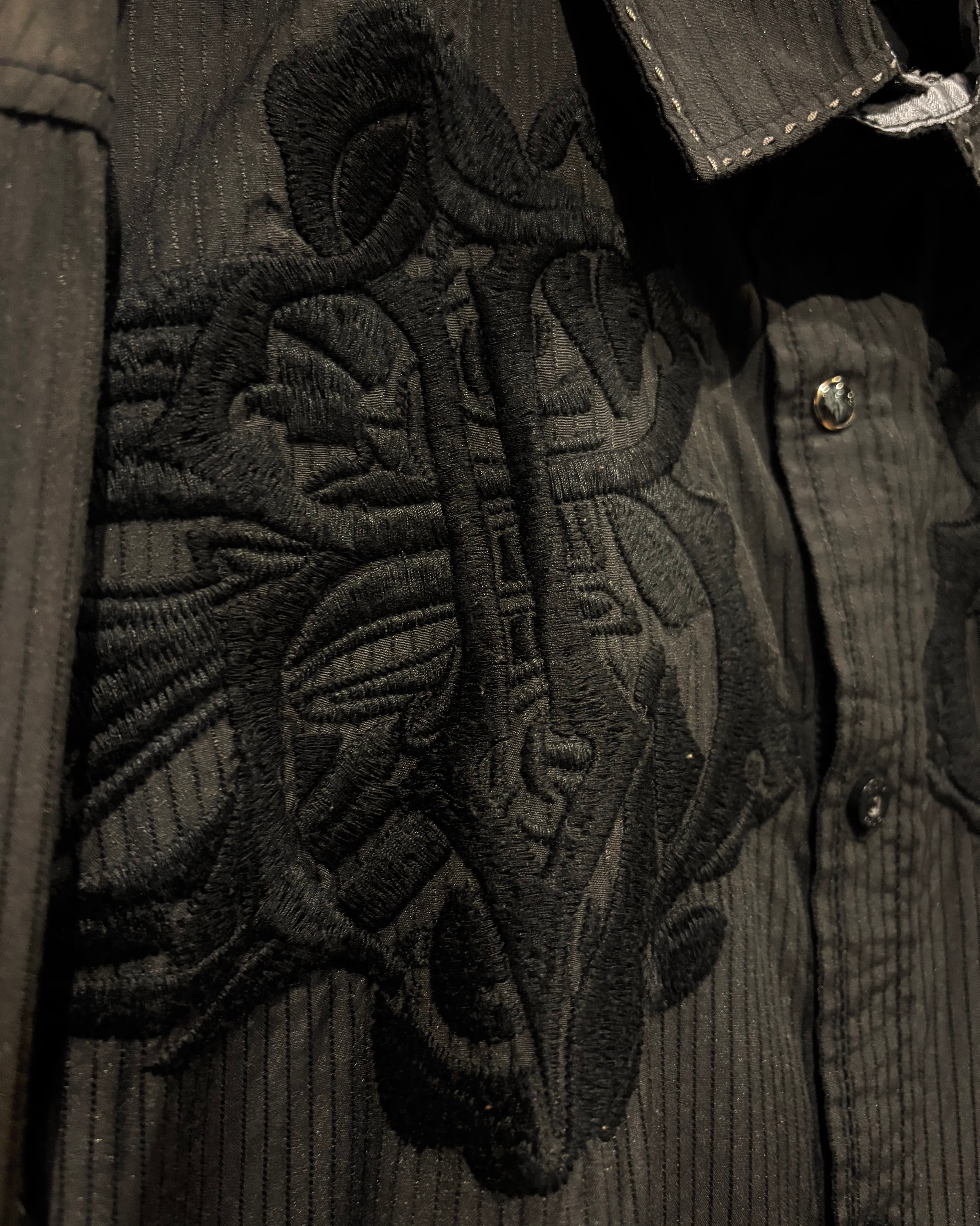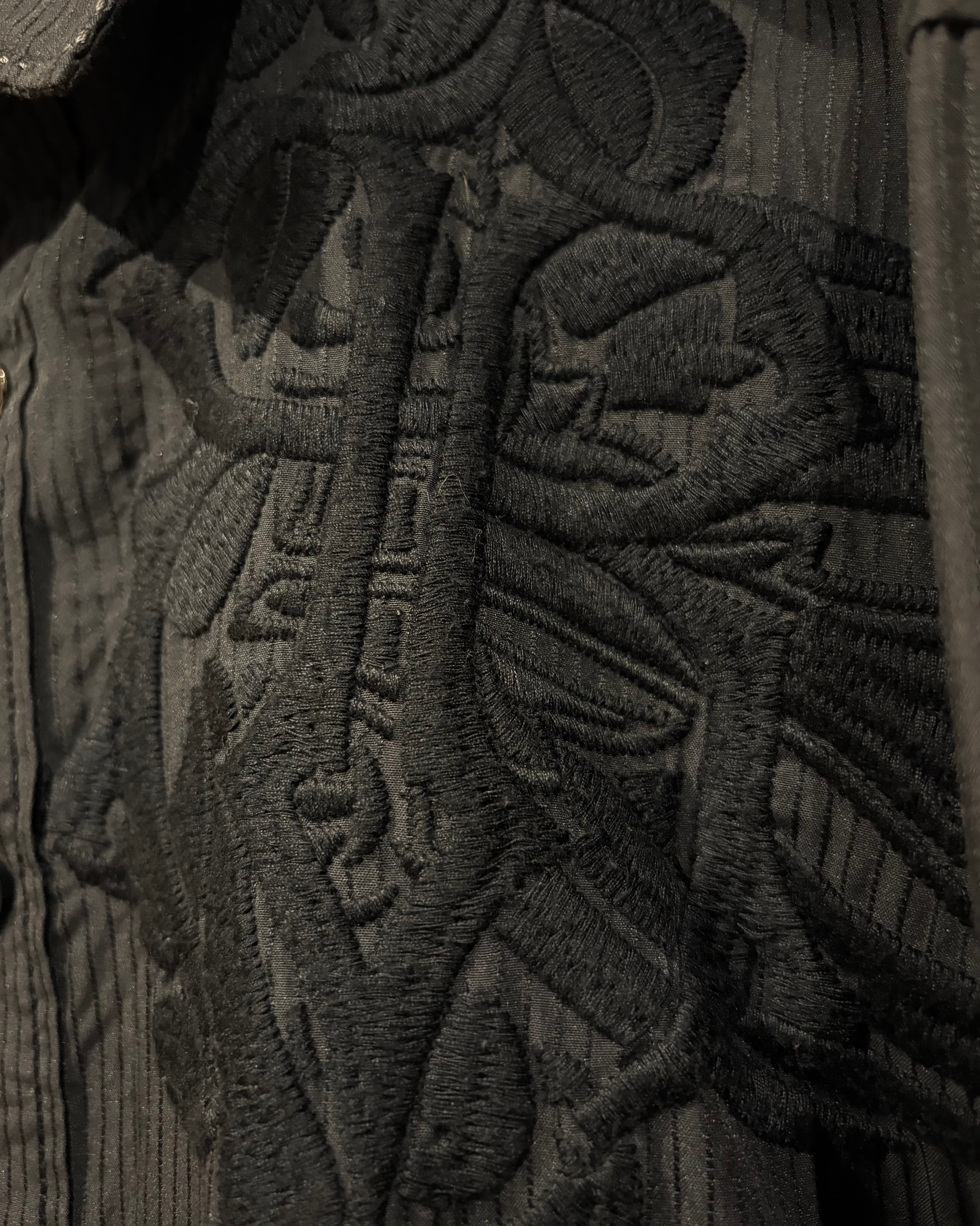 フロントには左右の胸に立体感ある刺繍が大きく配され、さらに背面には全面を覆うように刺繍デザインが落とし込まれています。漆黒のトーンに重厚な意匠が重なり、ゴシック調の存在感を余すことなく発揮。