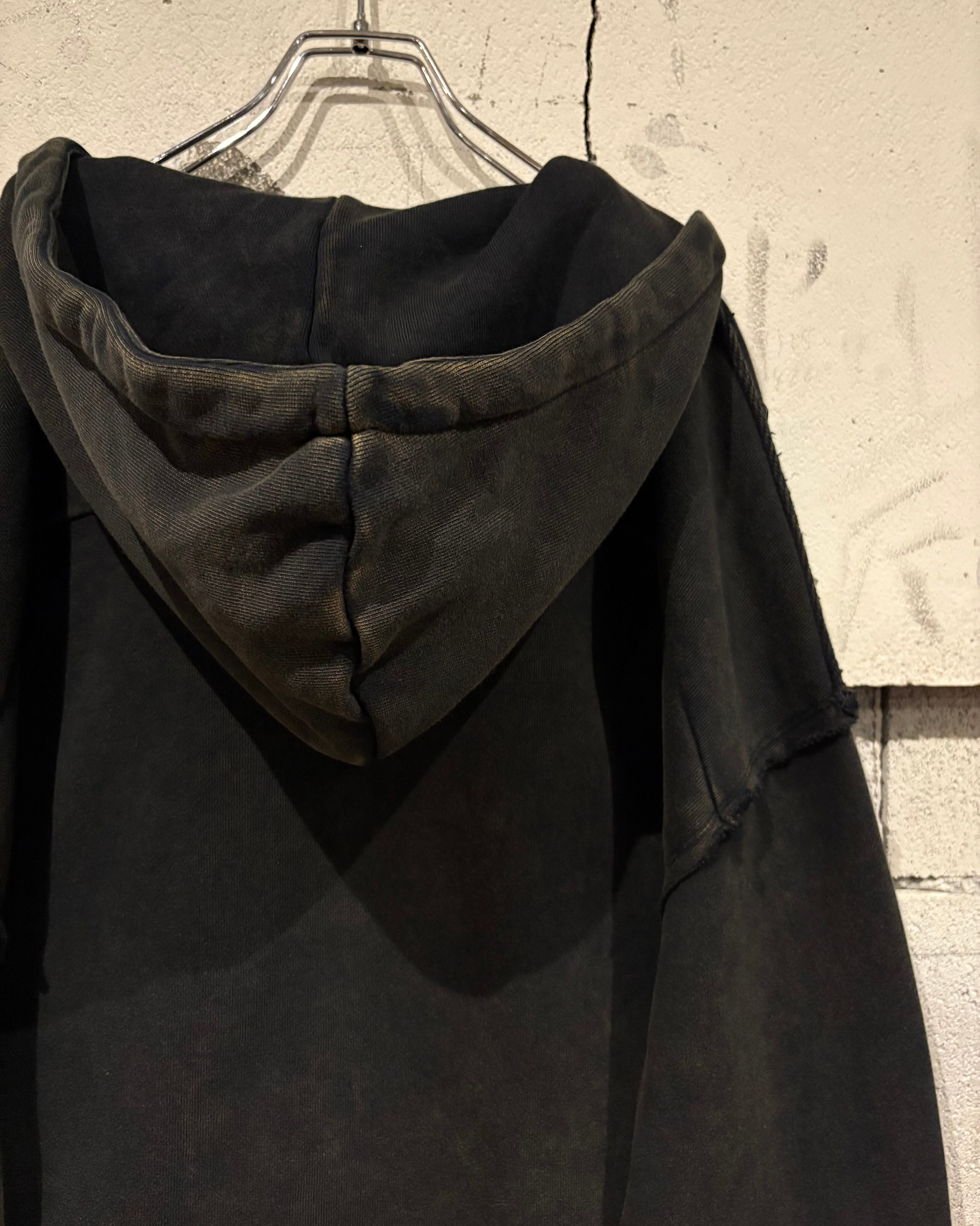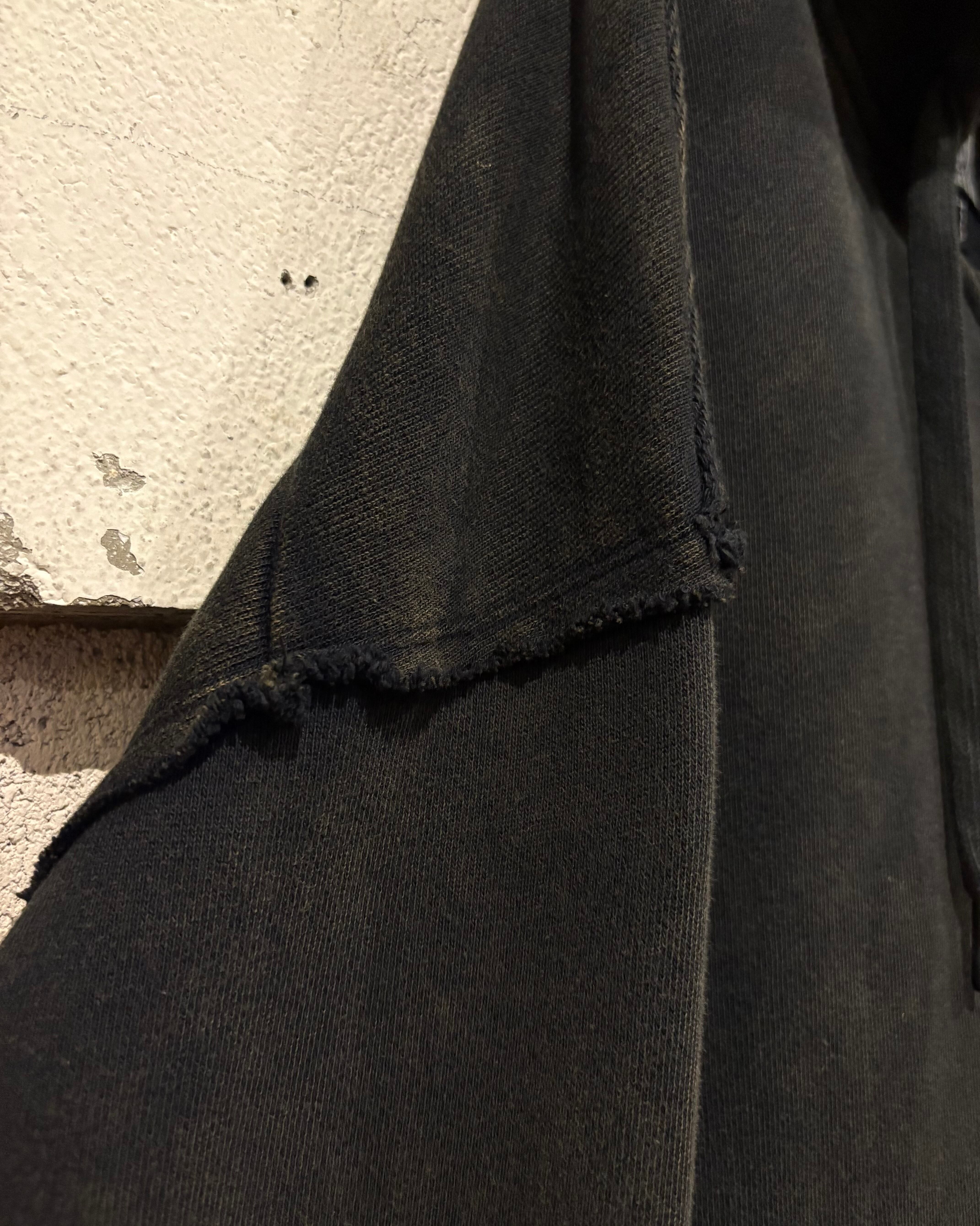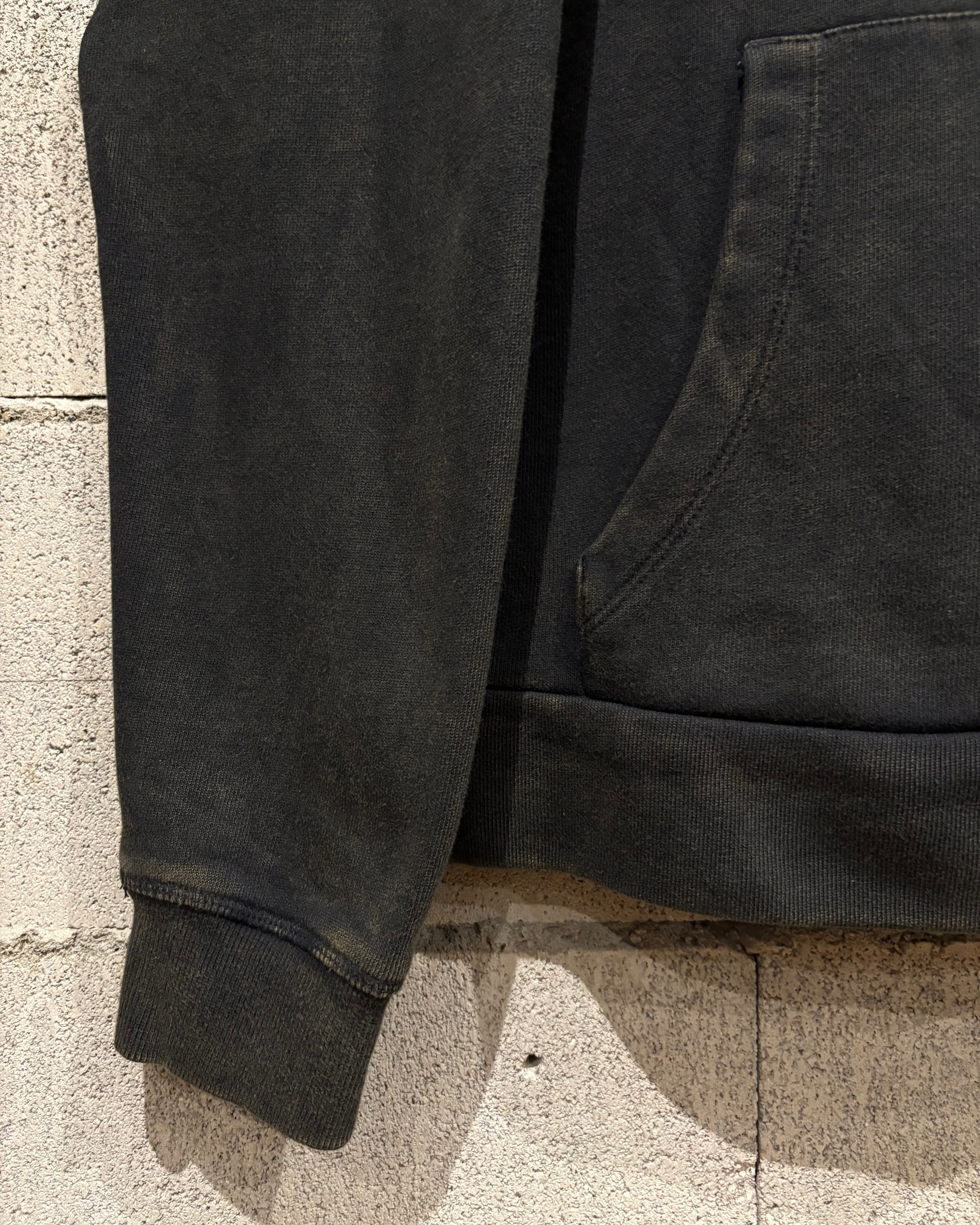 長年の着用と日焼けによって生まれたサンフェード特有の色落ちが随所に現れた、深いブラックがチャコール〜スモーキーなトーンへとフェードしたプルオーバーフーディ。