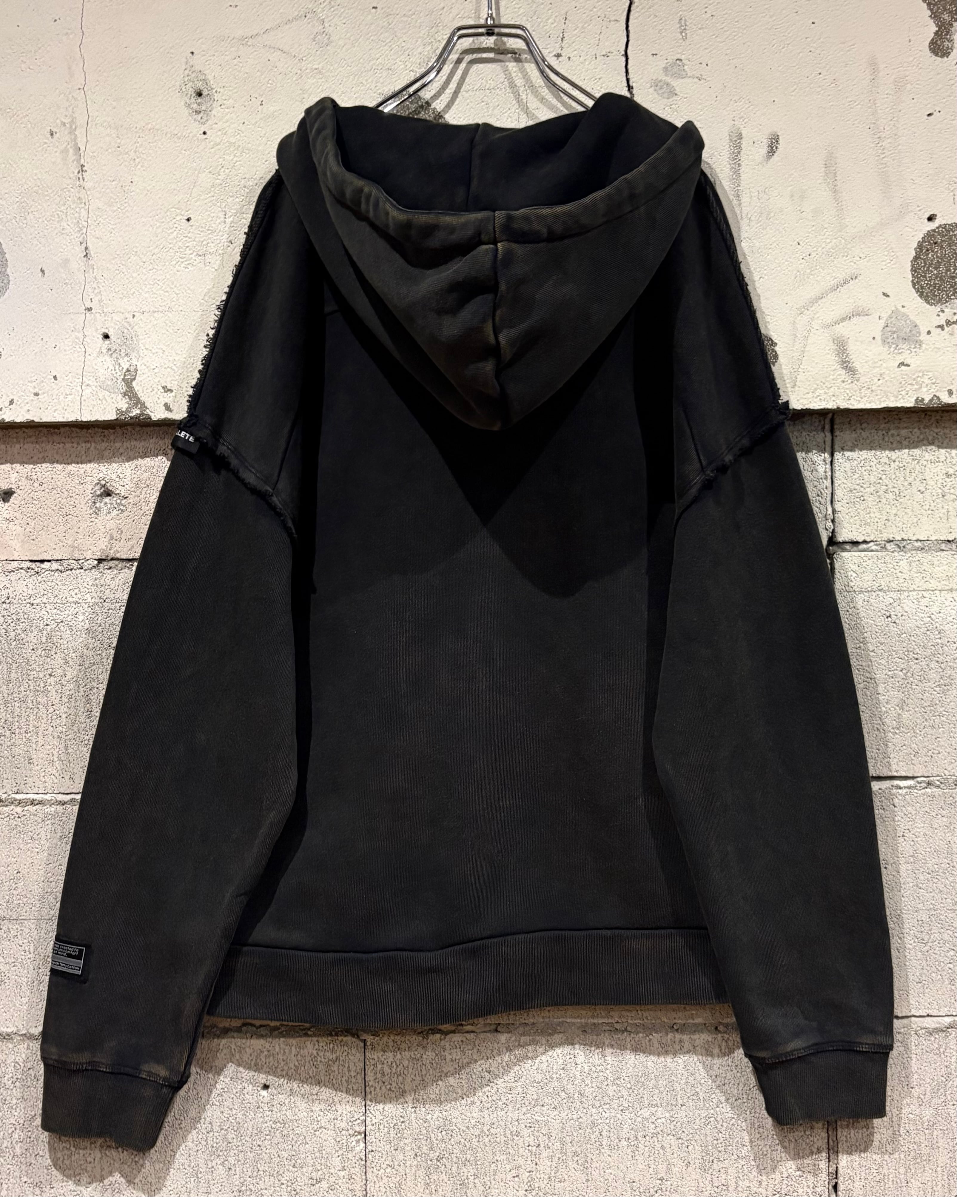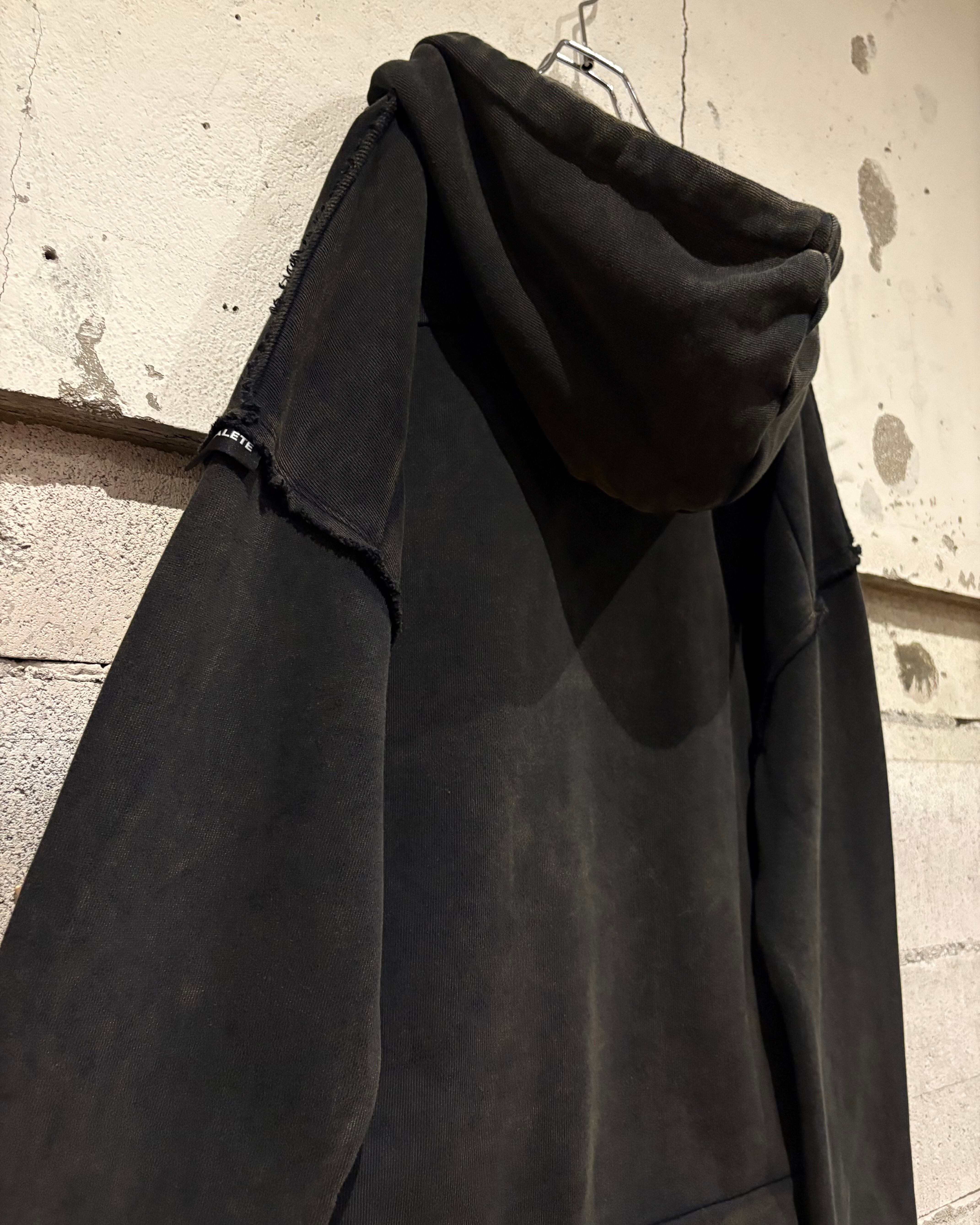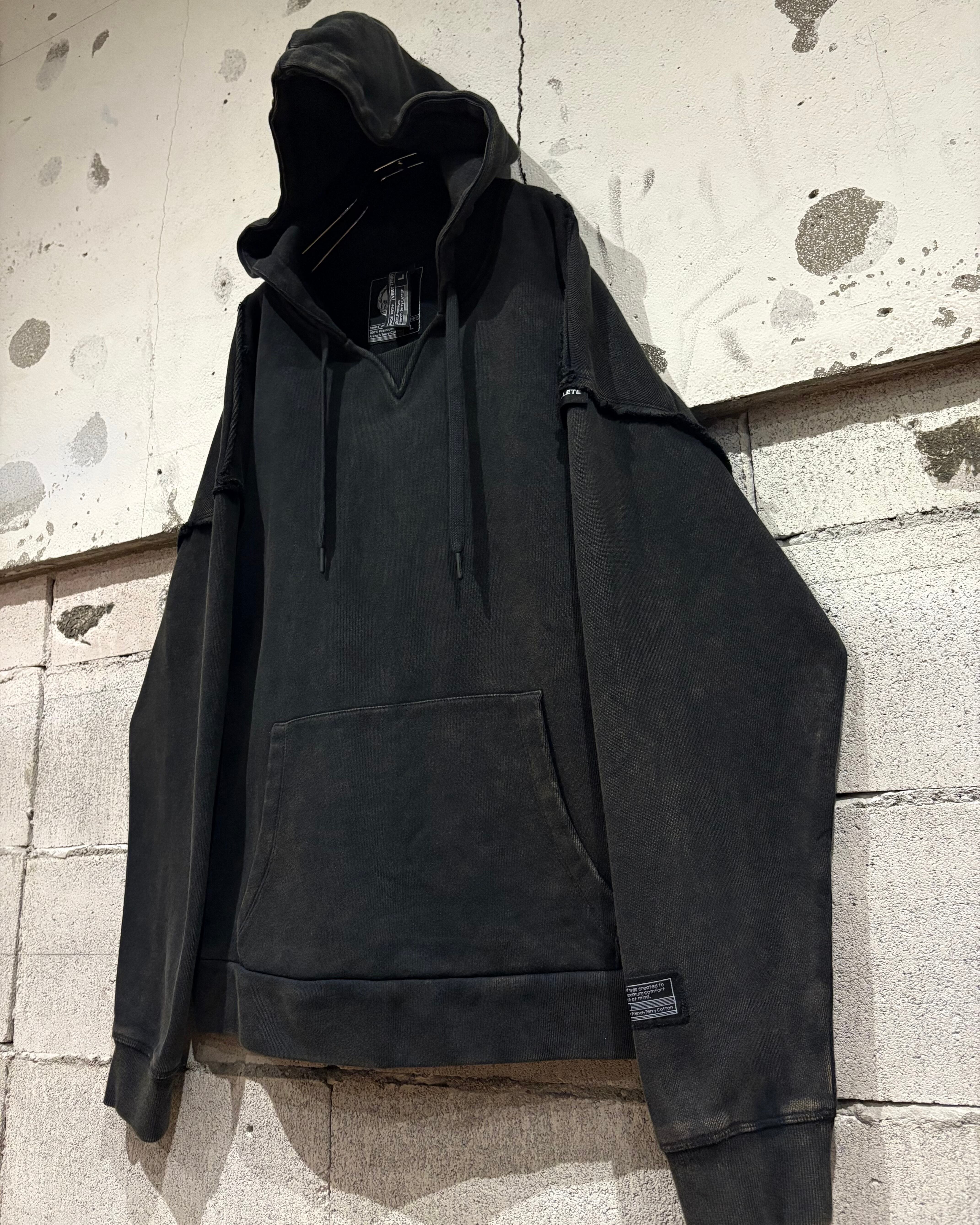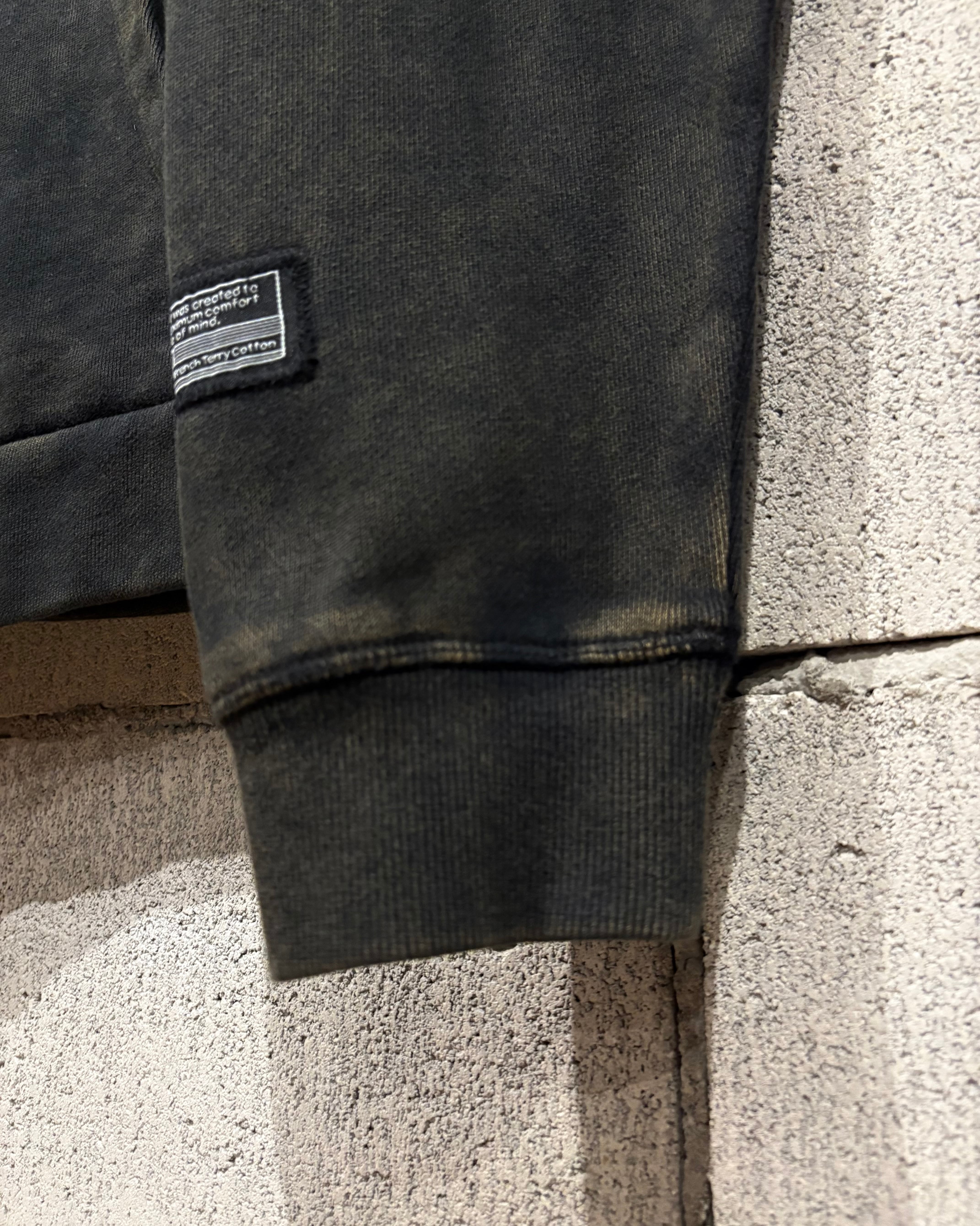 長年の着用と日焼けによって生まれたサンフェード特有の色落ちが随所に現れた、深いブラックがチャコール〜スモーキーなトーンへとフェードしたプルオーバーフーディ。