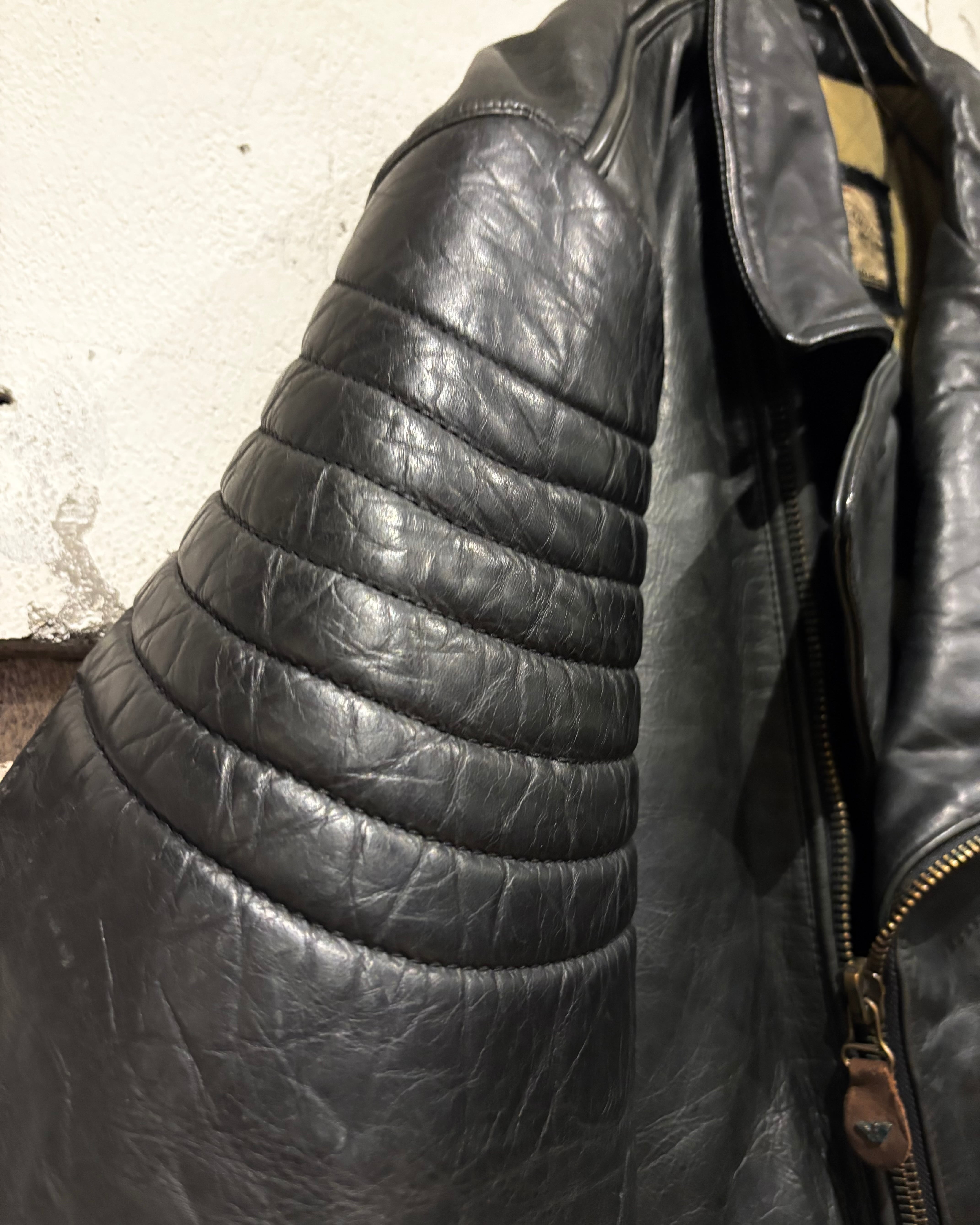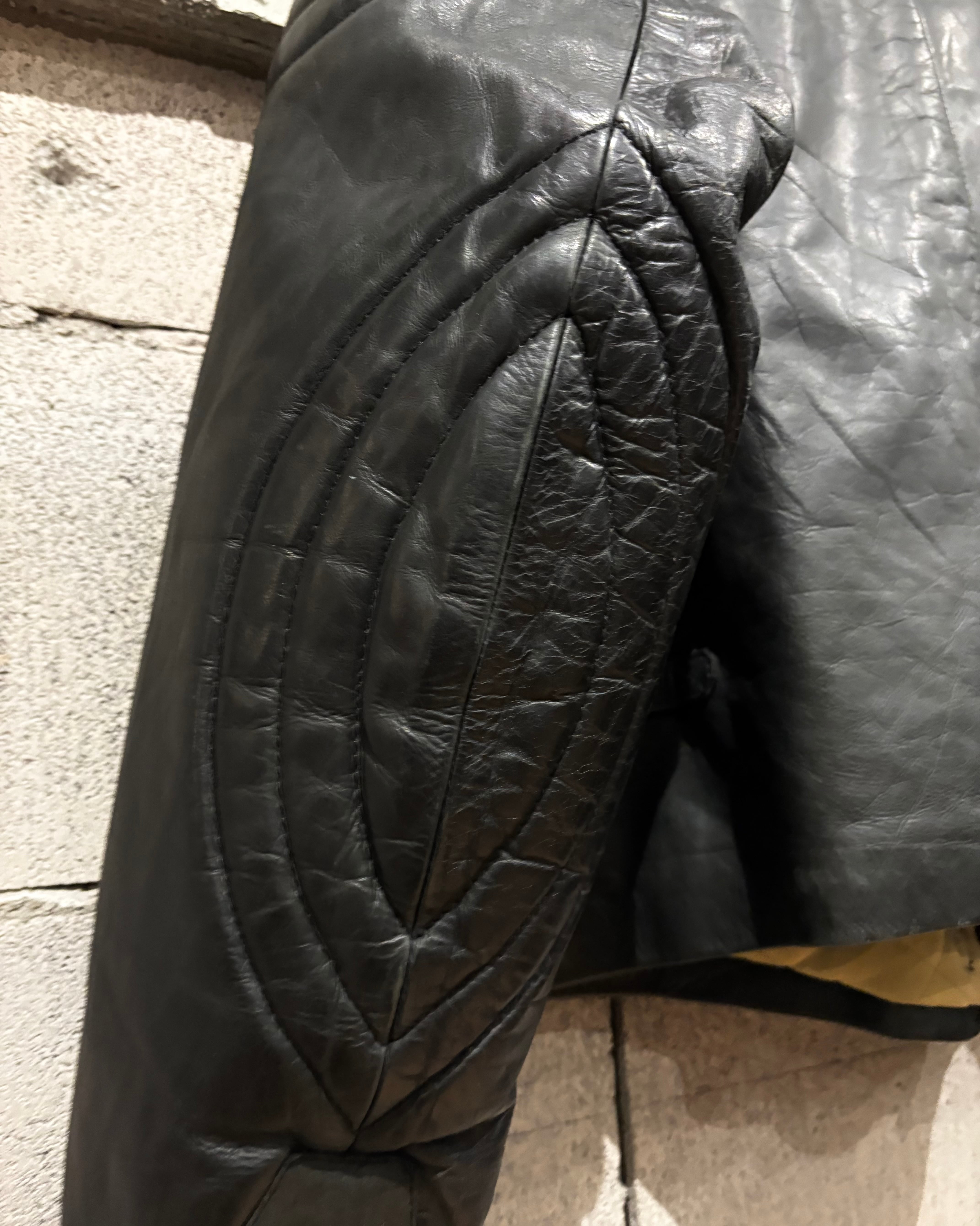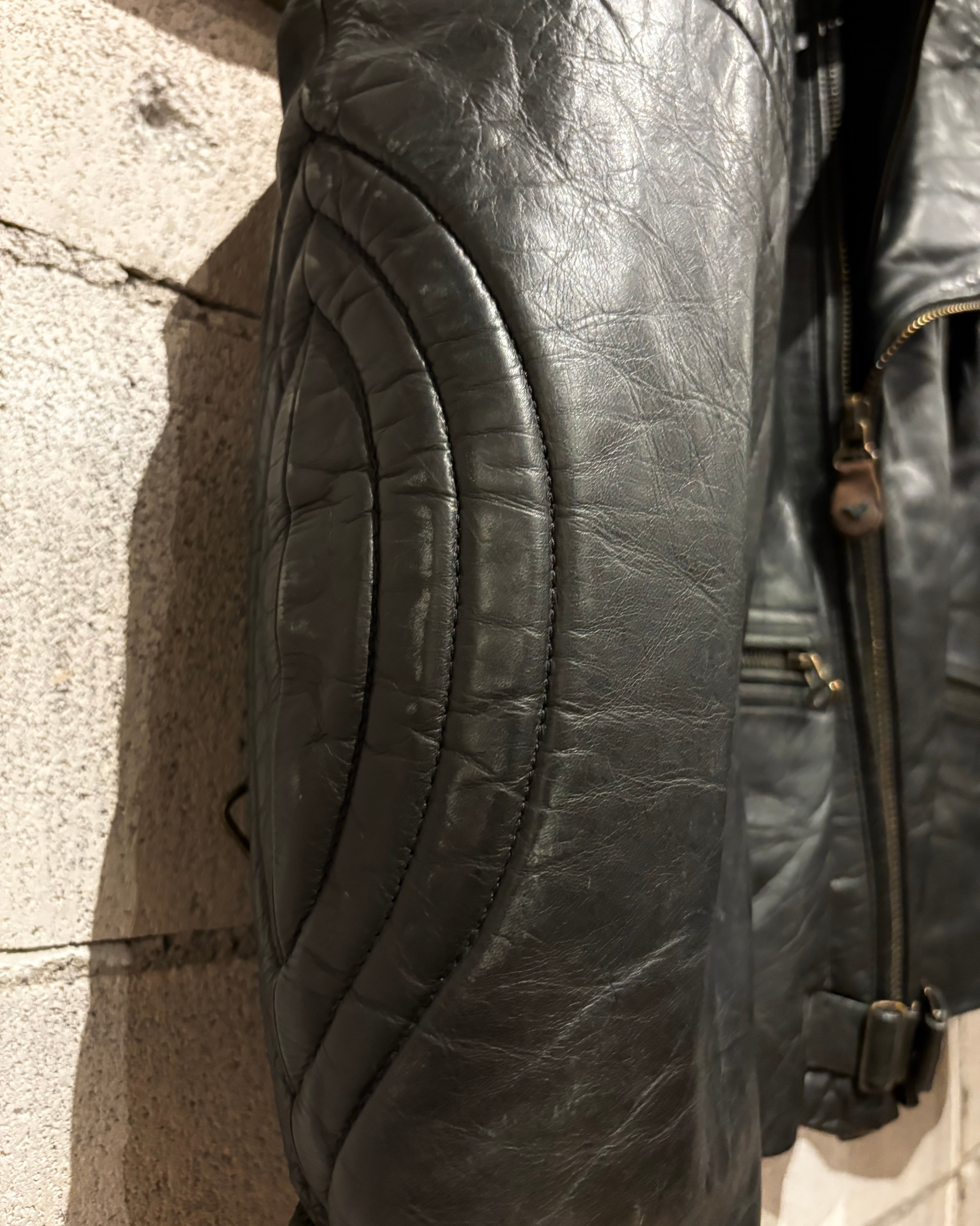 アルマーニが持つモードのエレガンスと、バイカージャケットのハードな要素が見事に融合したスペシャルな逸品。ヴィンテージレザージャケットの中でも頭一つ抜けた存在感を誇る1着です。