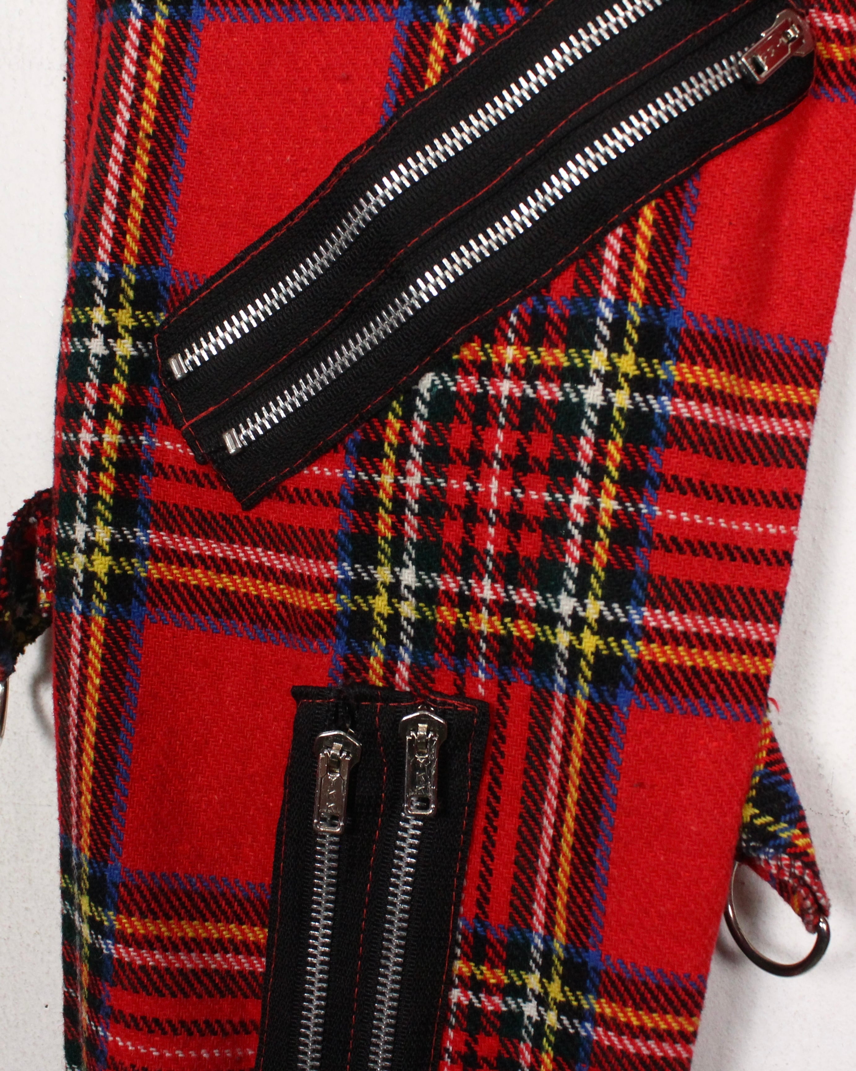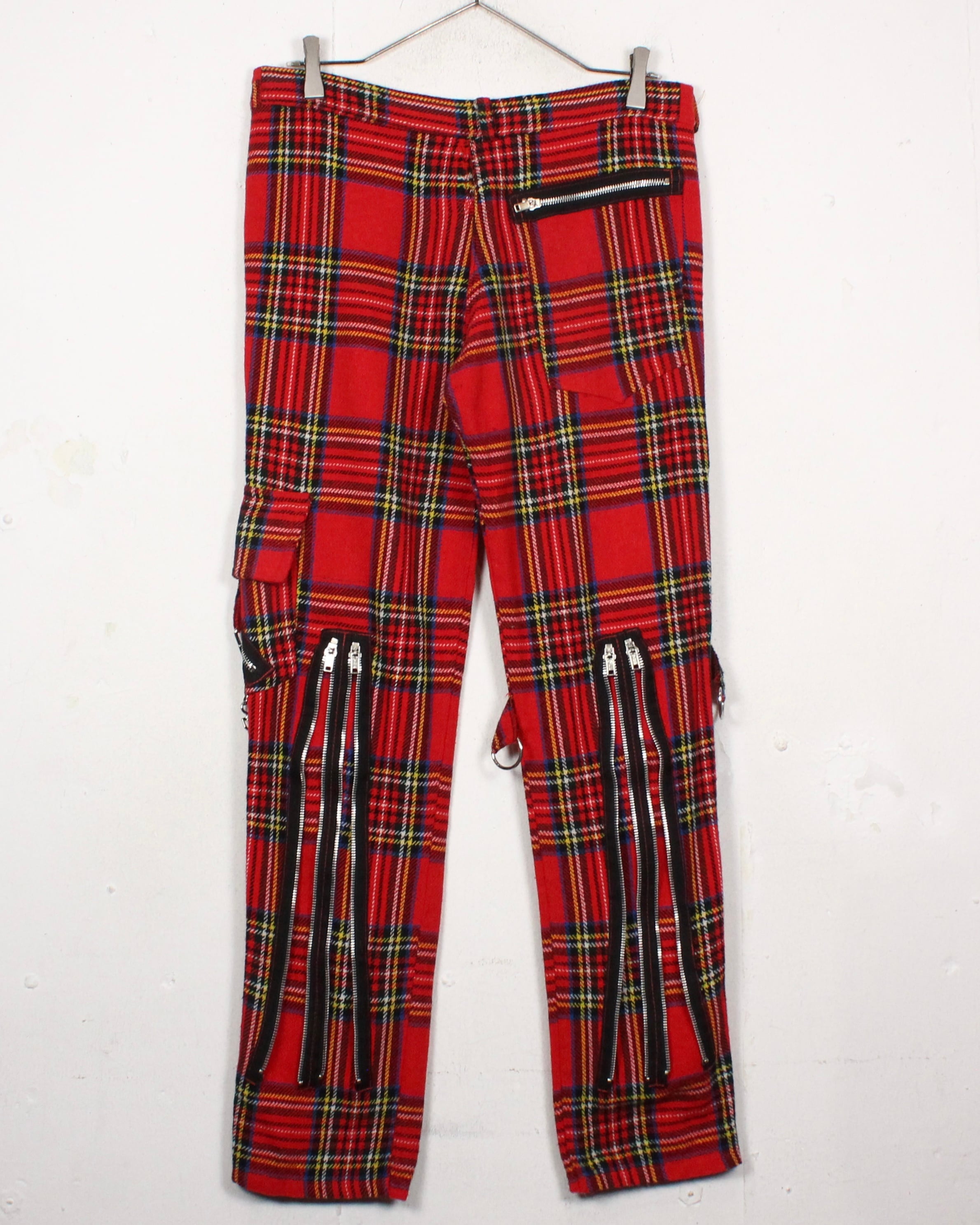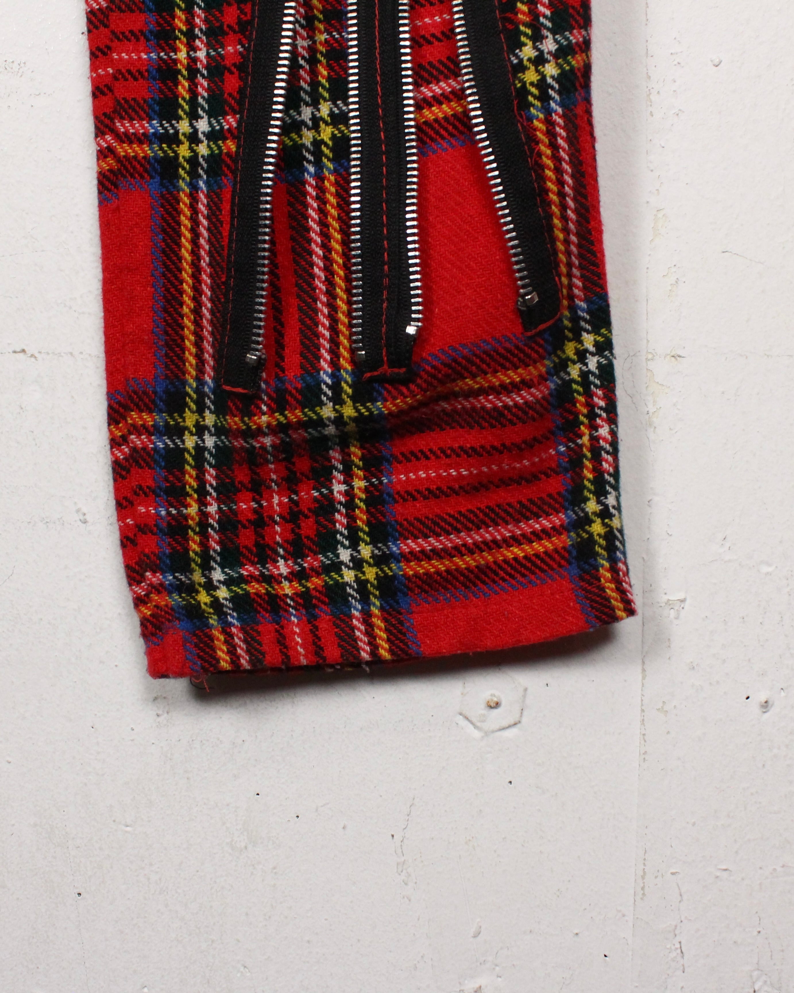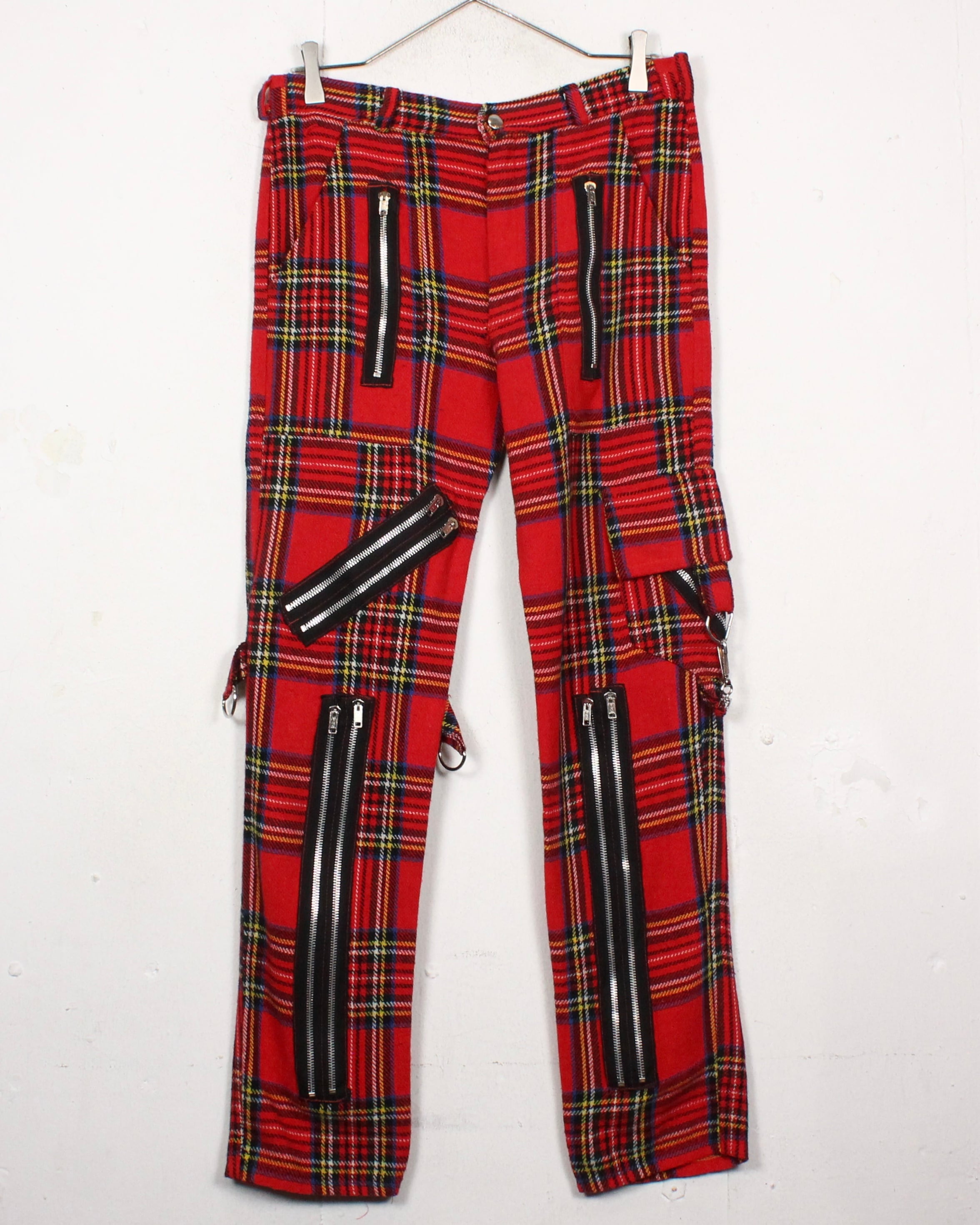 レッドタータンの生地をベースに、全体へ大胆にジップを配置したボンテージパンツ。