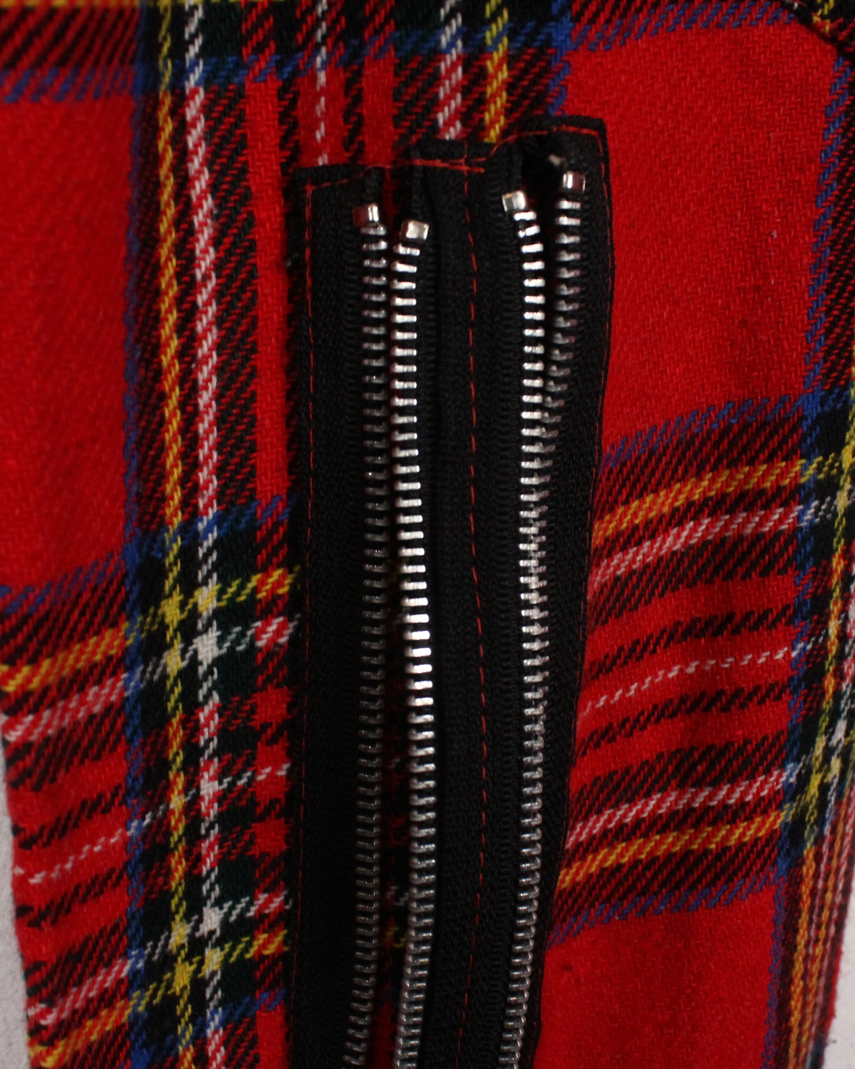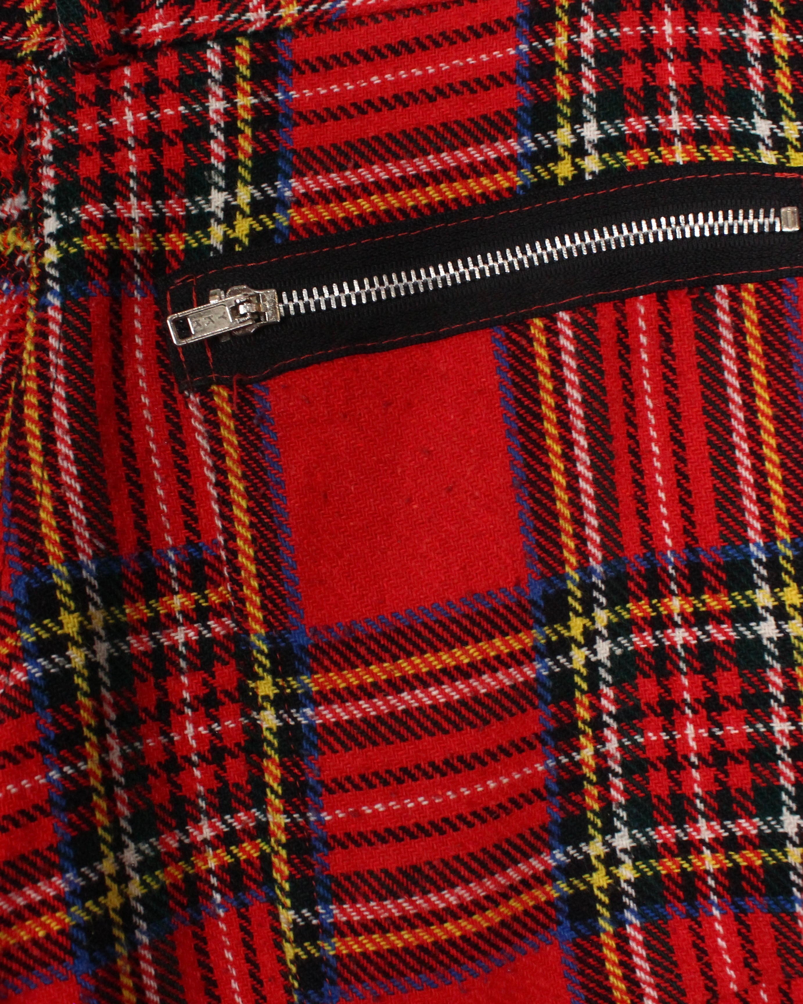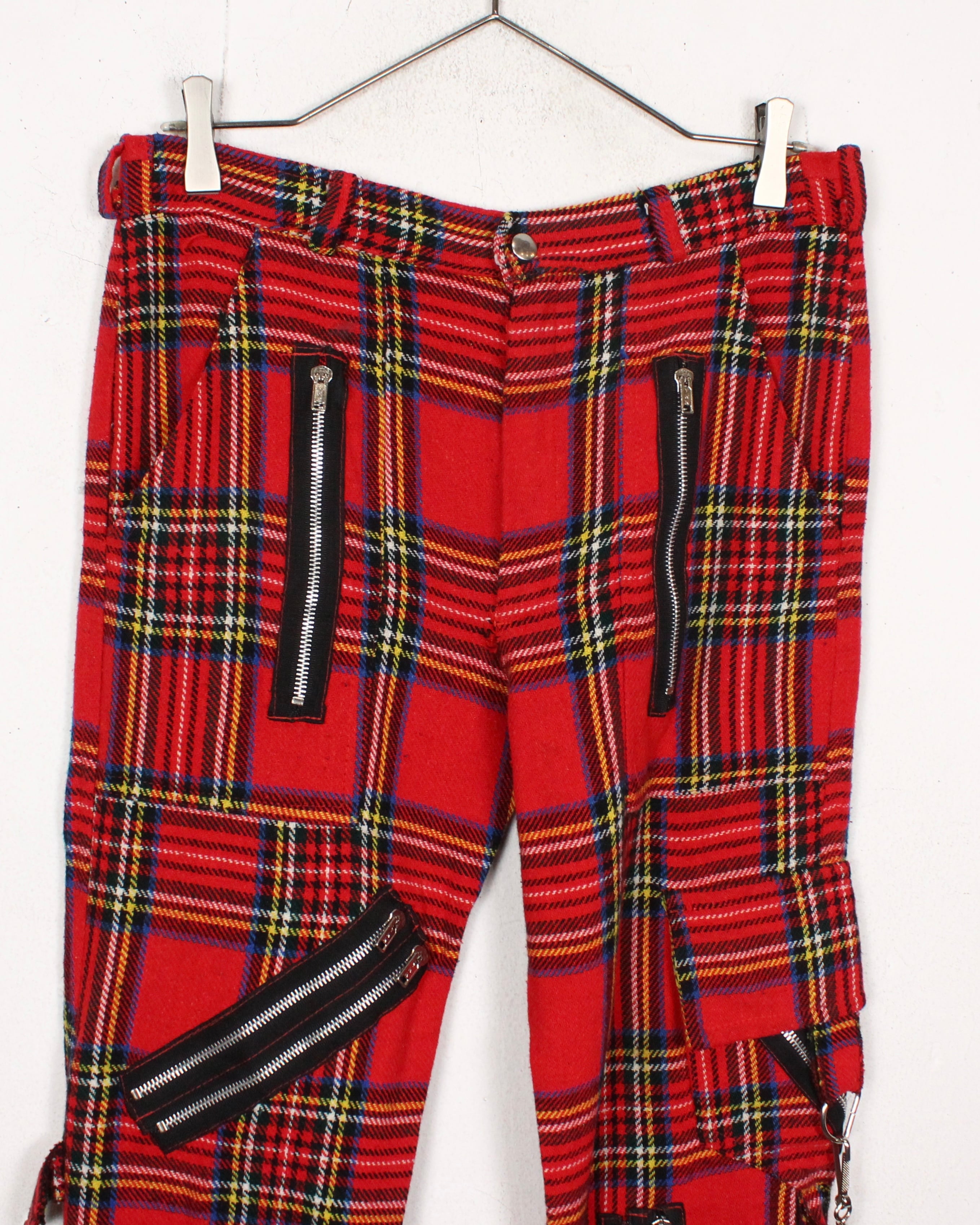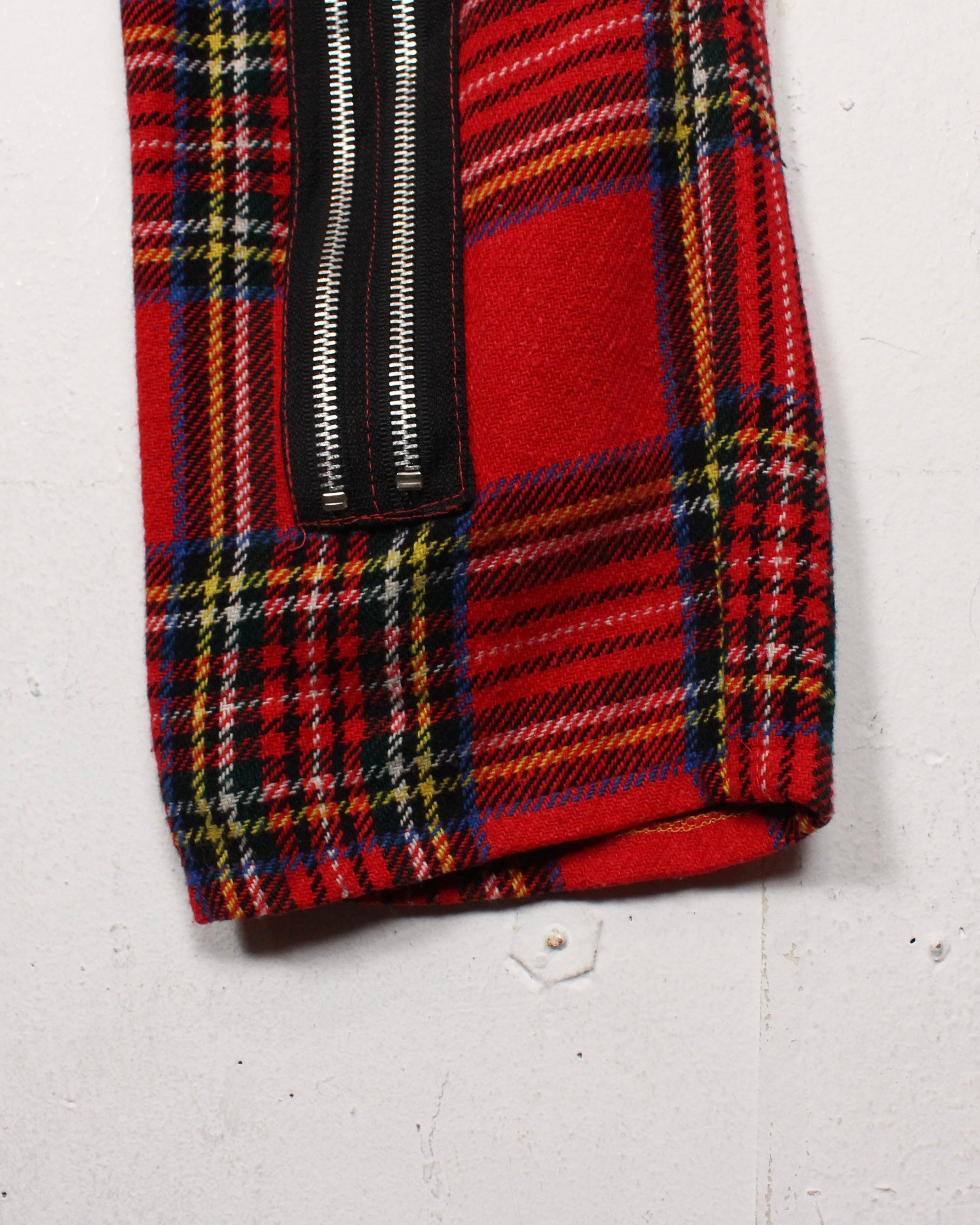 レッドタータンの生地をベースに、全体へ大胆にジップを配置したボンテージパンツ。