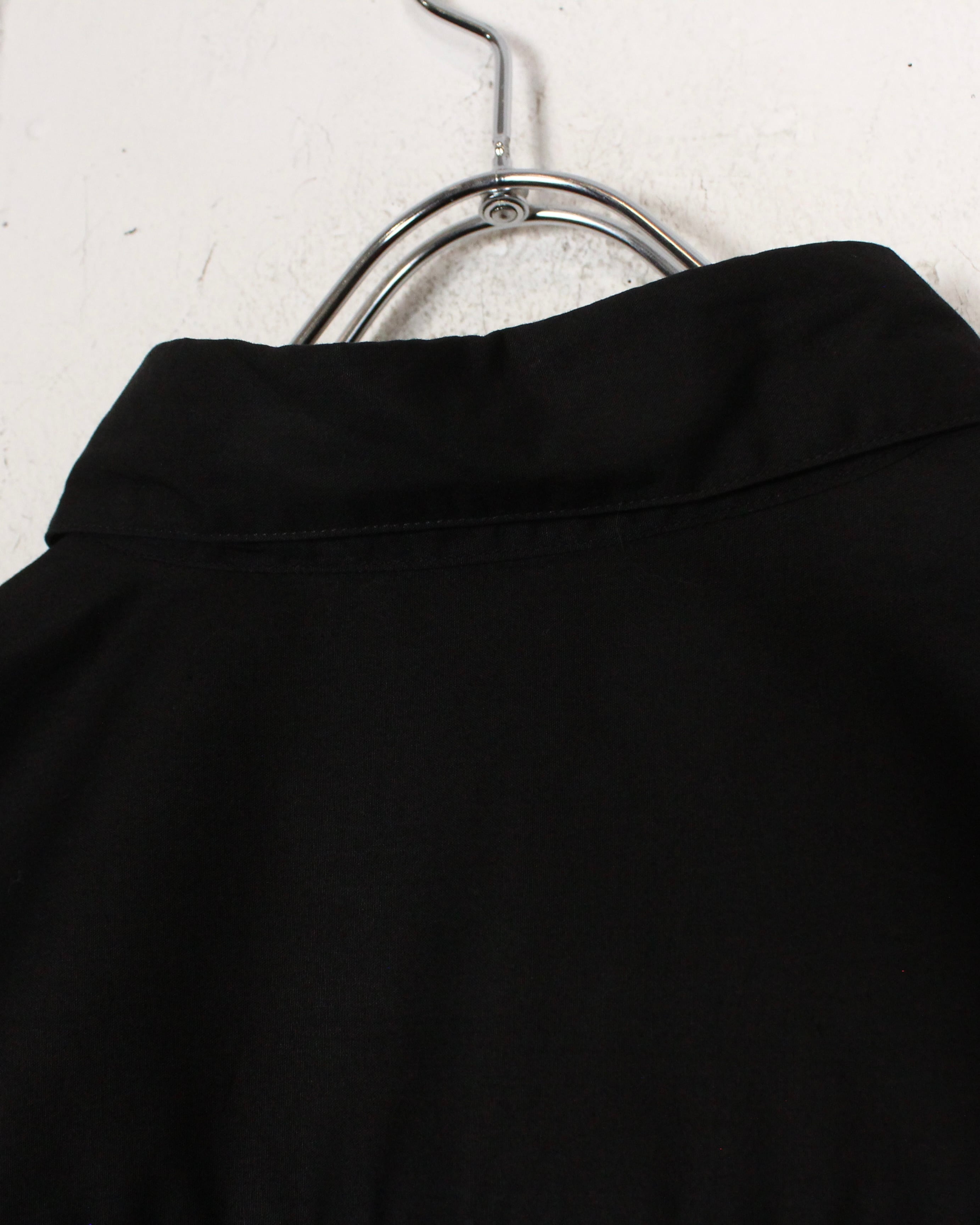 一見シンプルなブラックシャツながらも、胸元の切り替えが圧倒的な存在感を放ち、ラグジュアリーな艶感とモードな雰囲気を兼ね備えた一枚に仕上がっています。