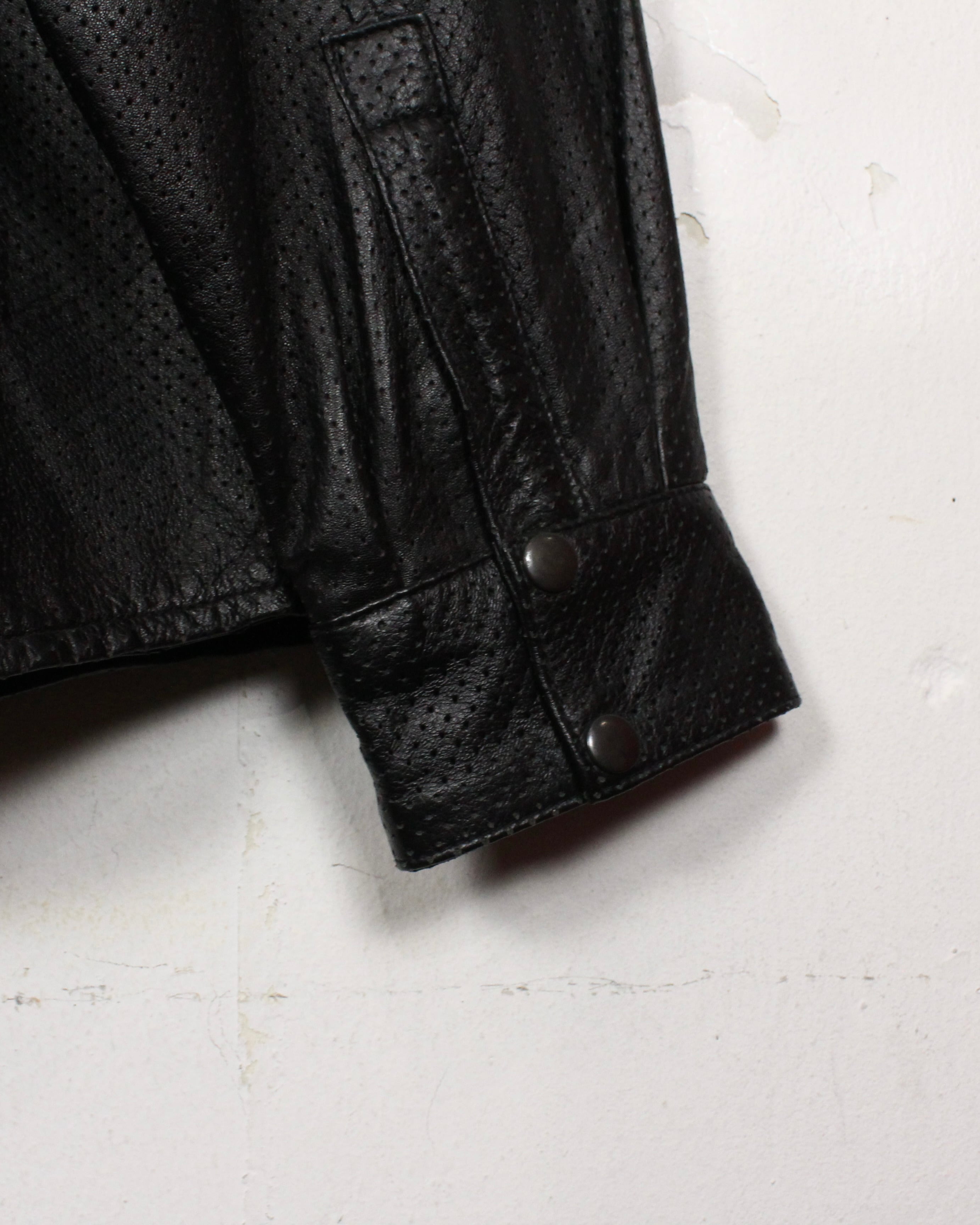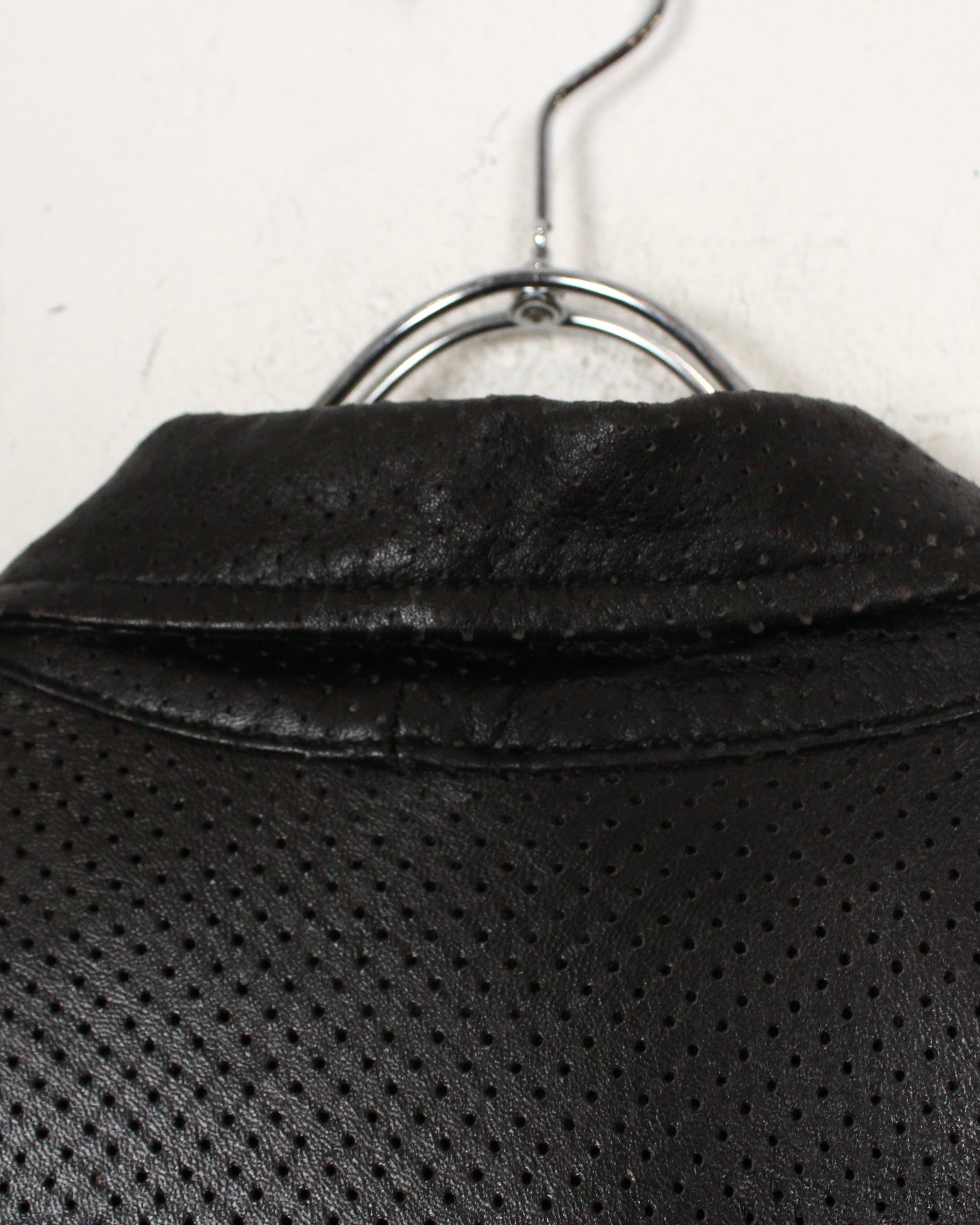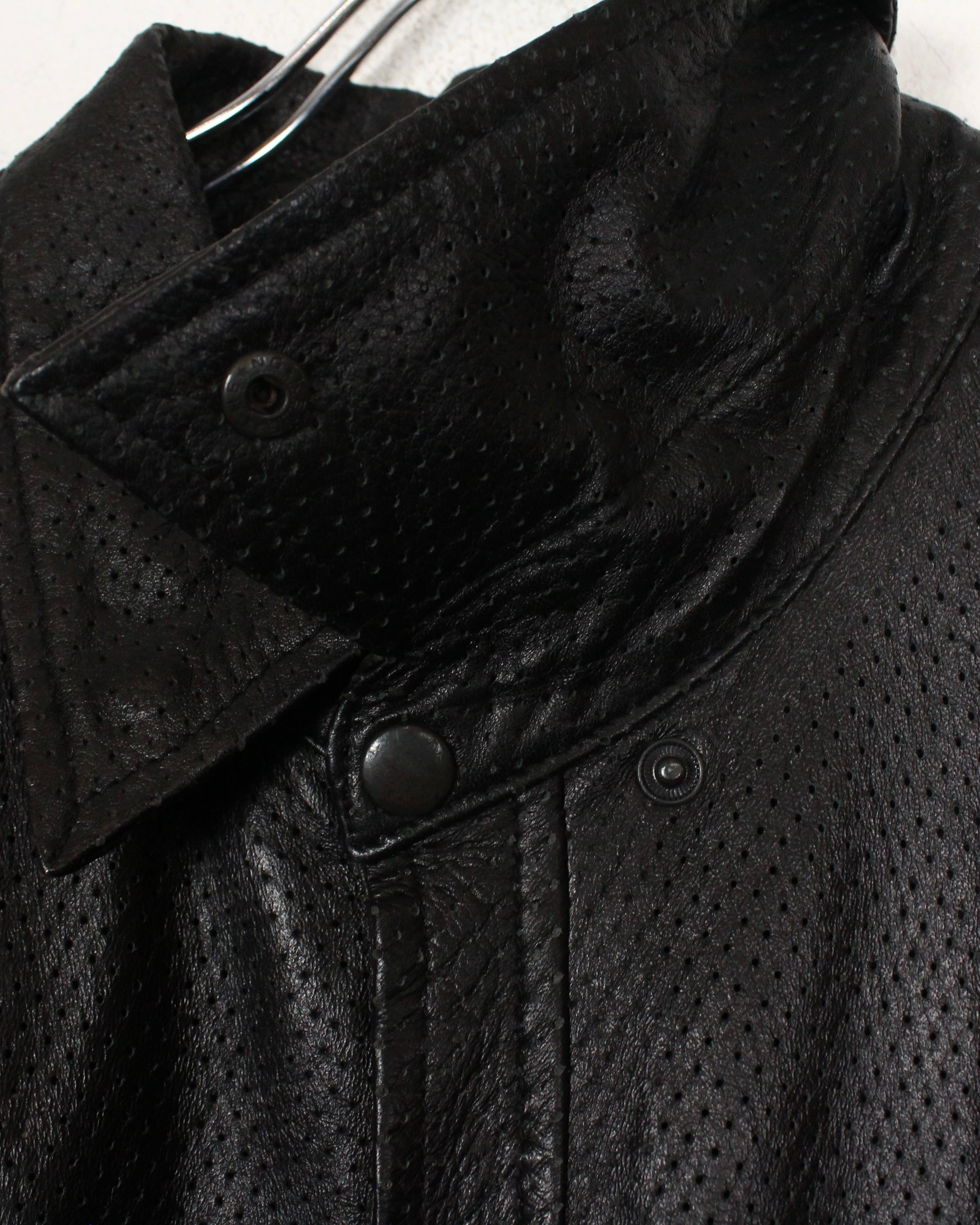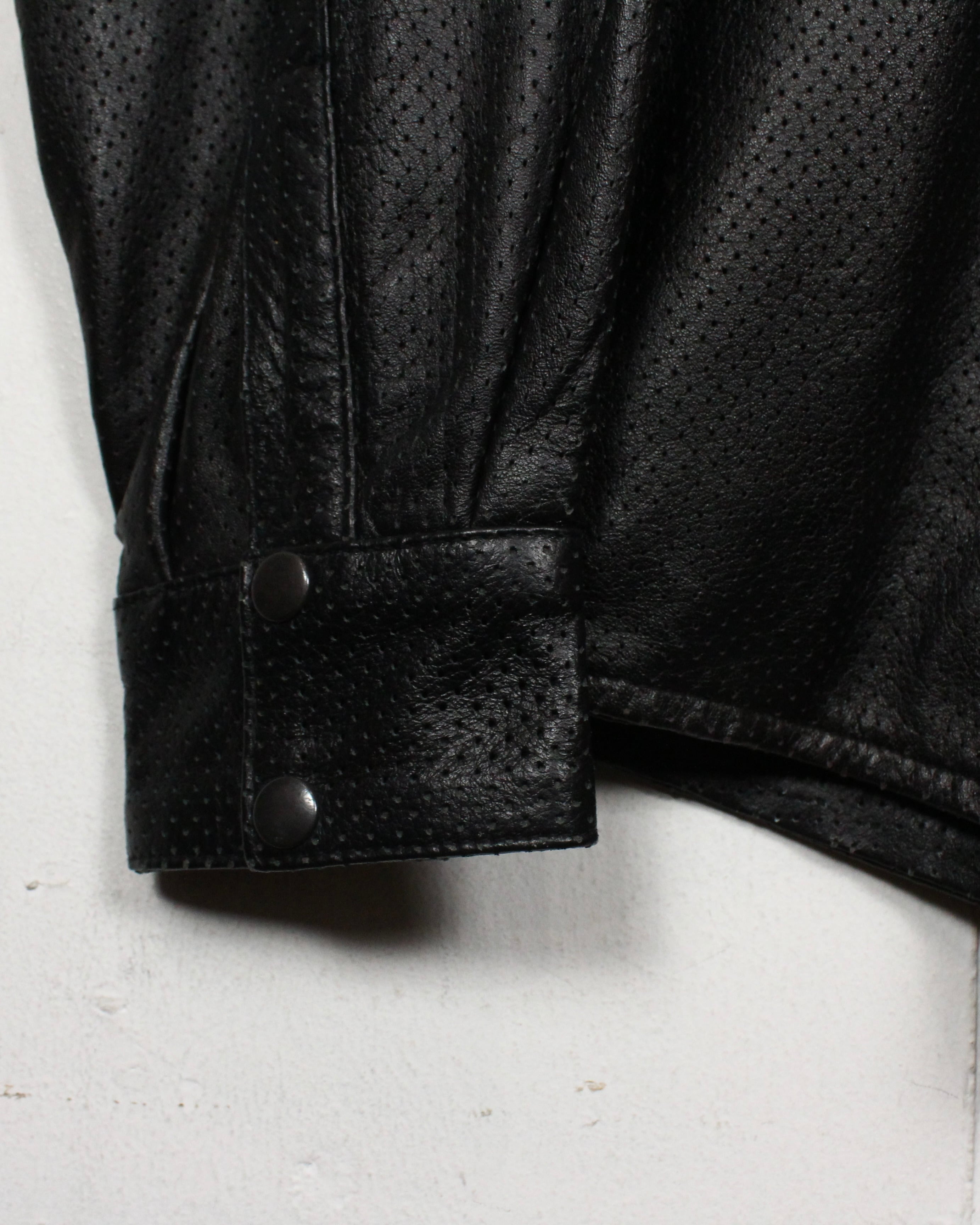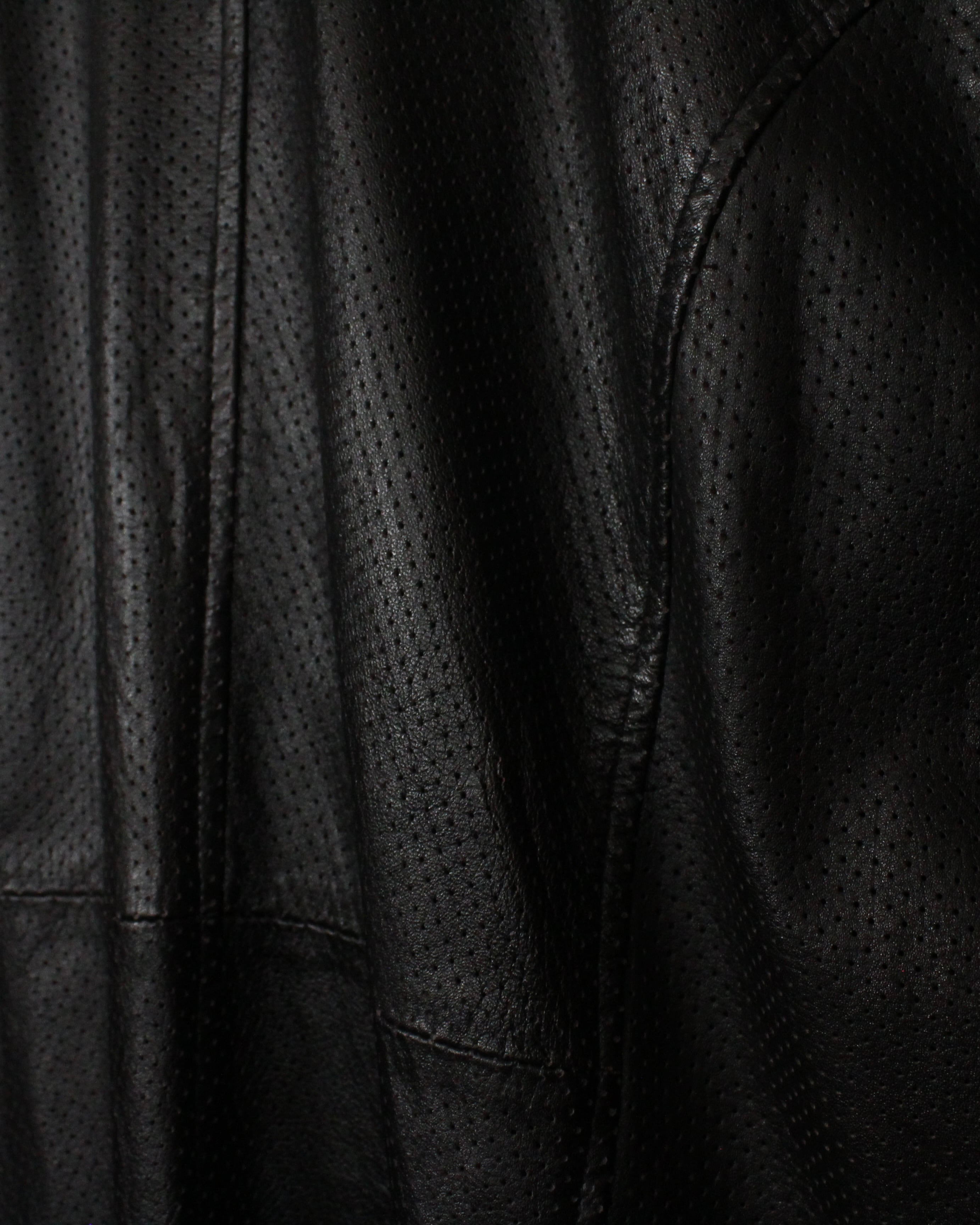 艶やかなブラックレザーを贅沢に使用しながらも、全体を通して施されたメッシュ加工によって軽やかさと通気性を兼ね備えた、非常に機能的な1着。
