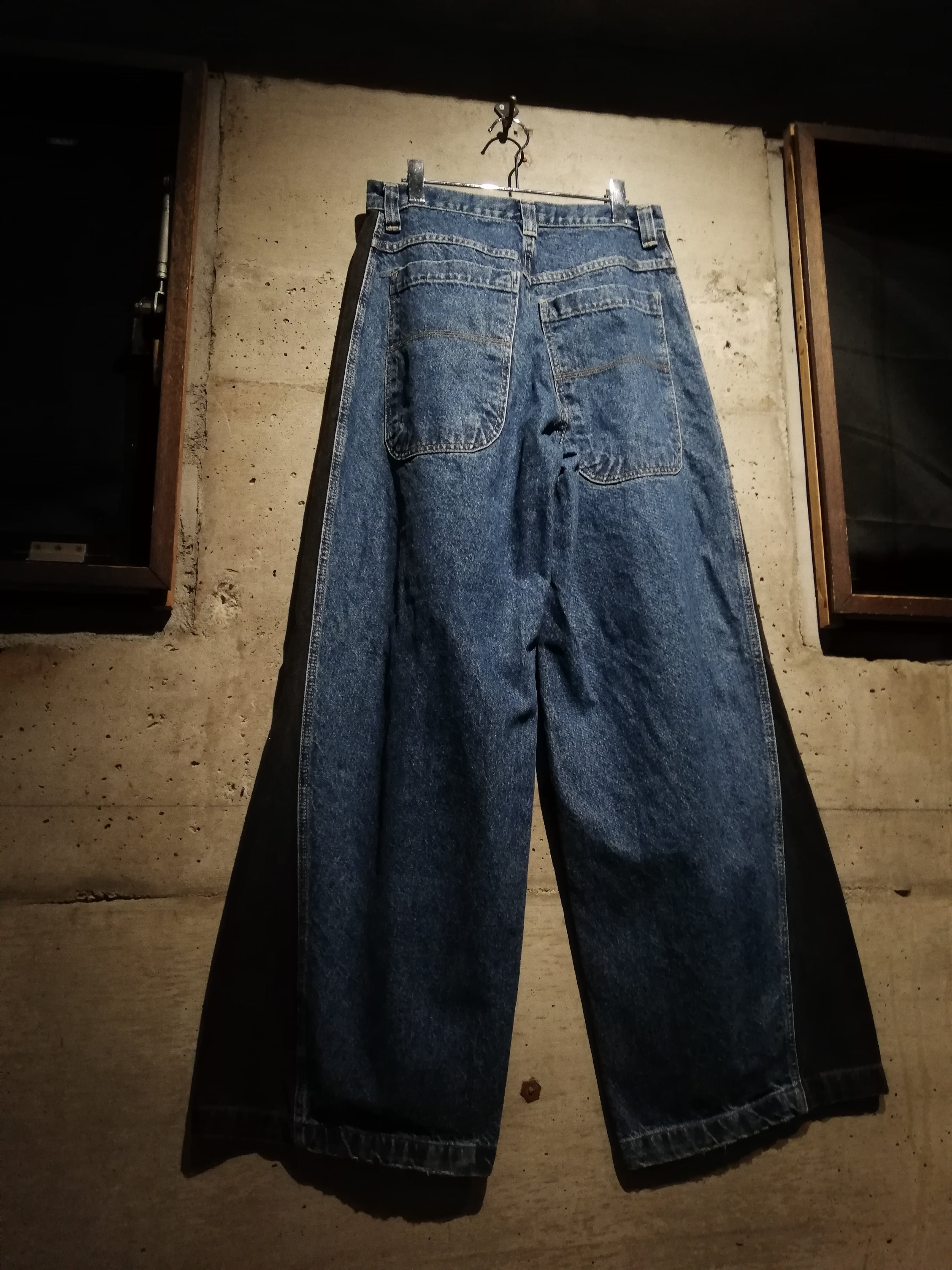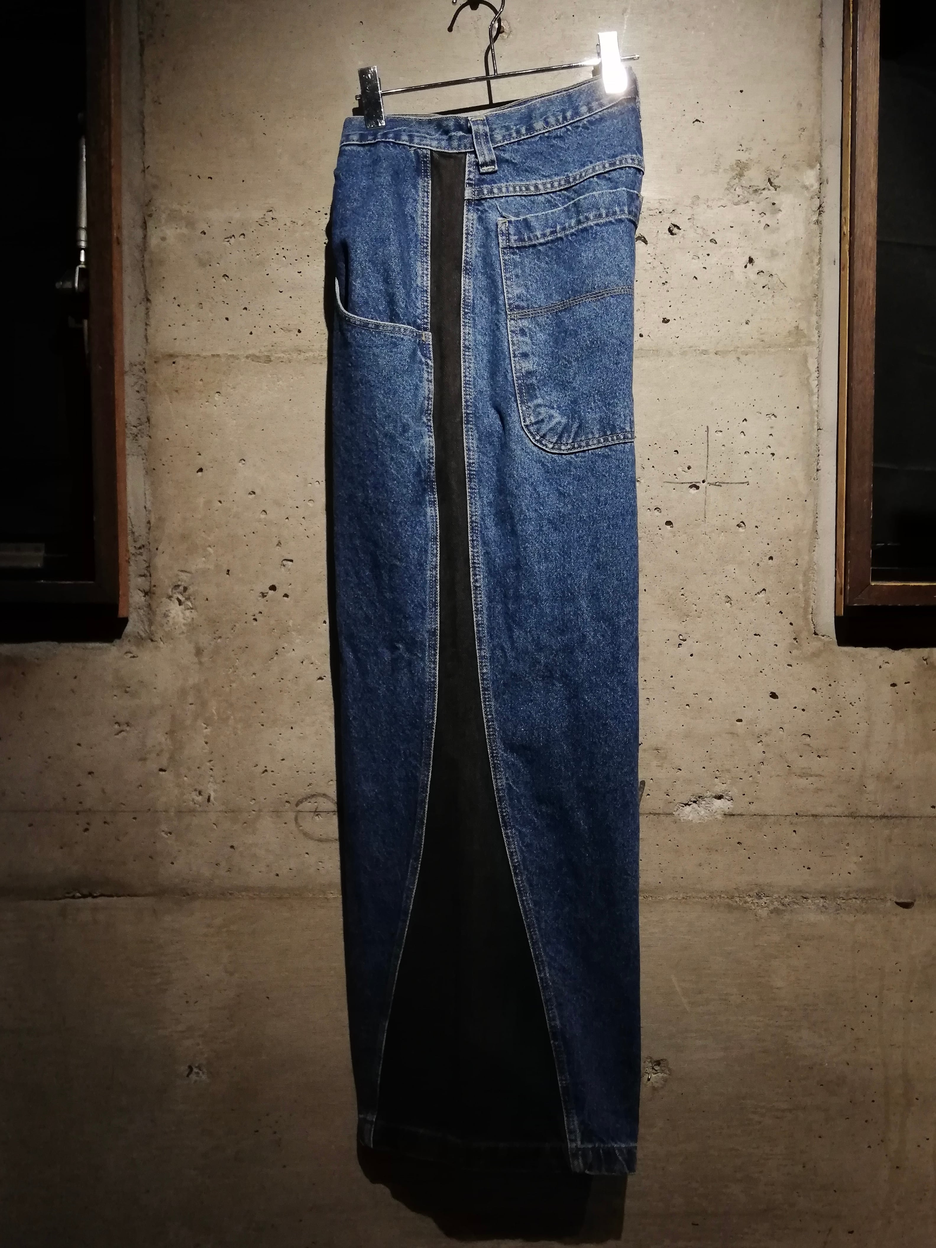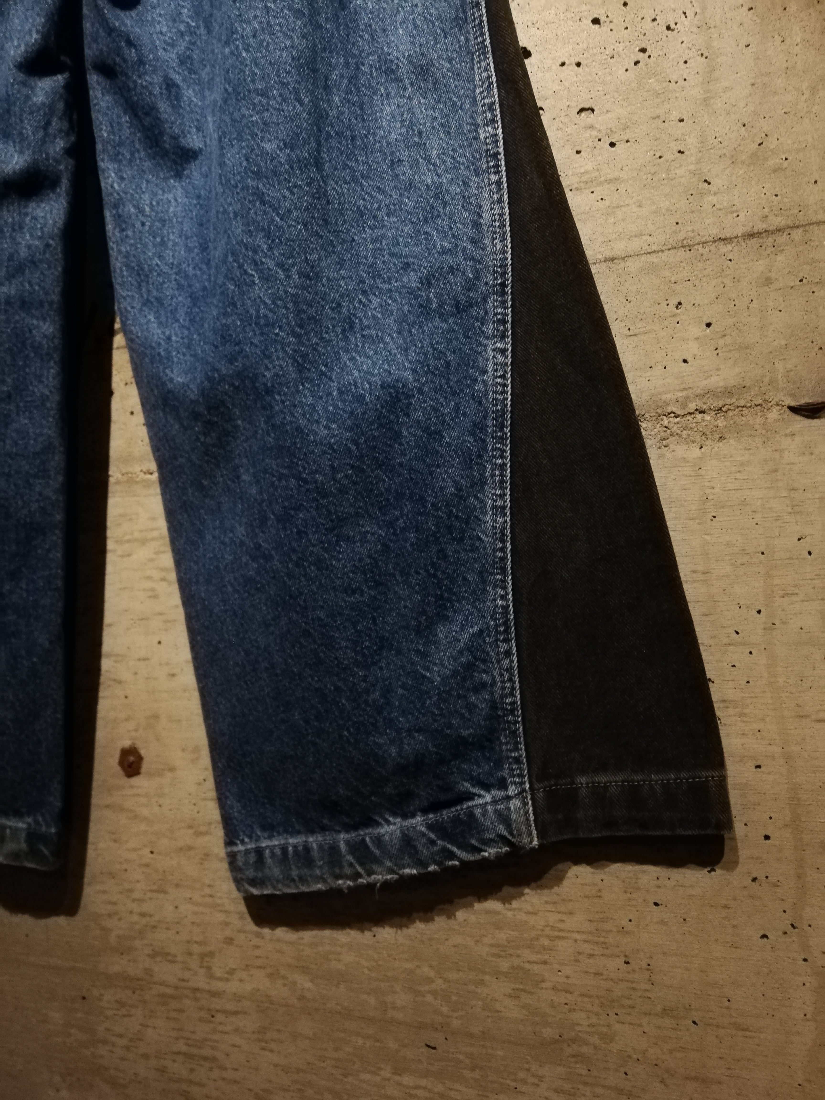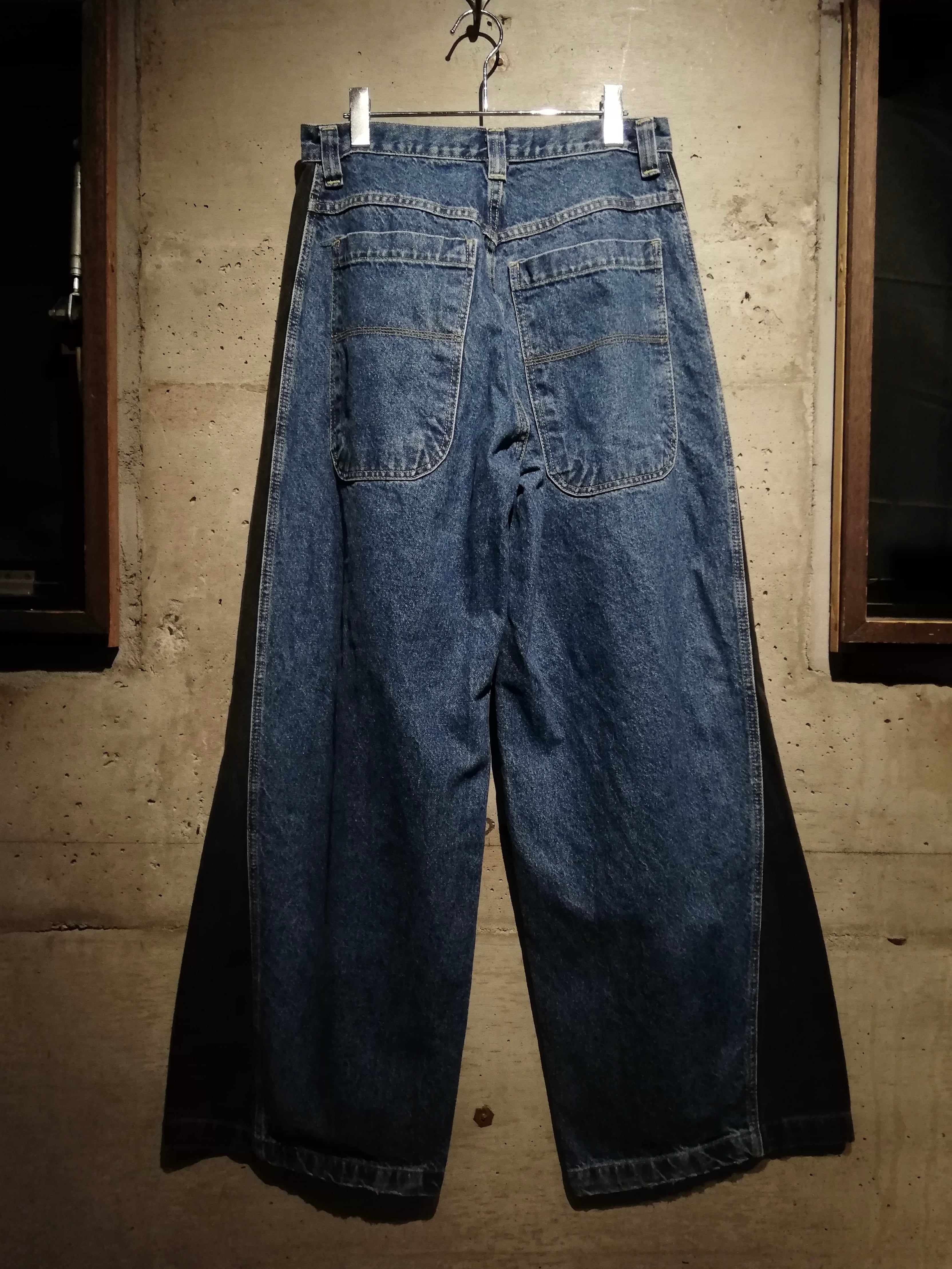 ライトブルーのデニムをベースに、サイドにかけて濃色のデニムを切り替える大胆なブロッキングデザインを採用。直線的に走る切替が、立体感のあるワイドシルエットをさらに強調し、視覚的にも強いインパクトを放っています。