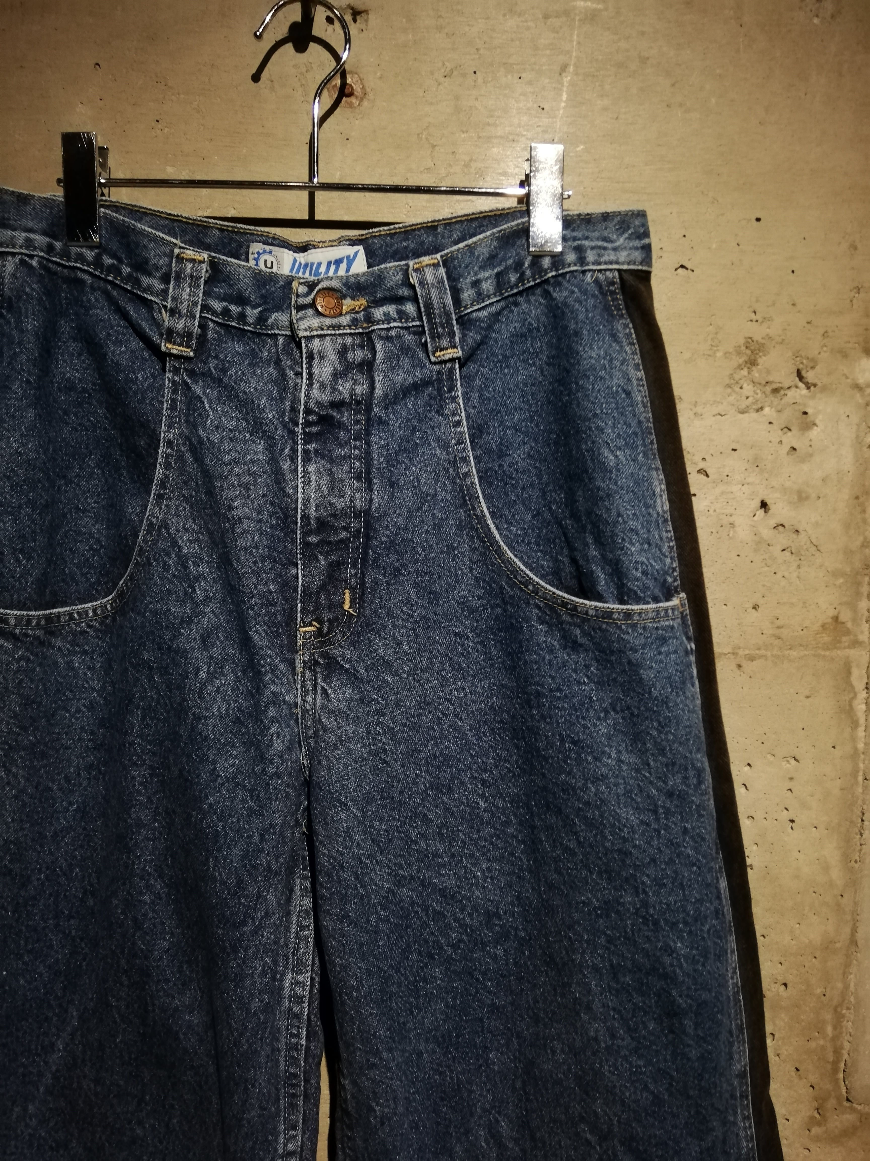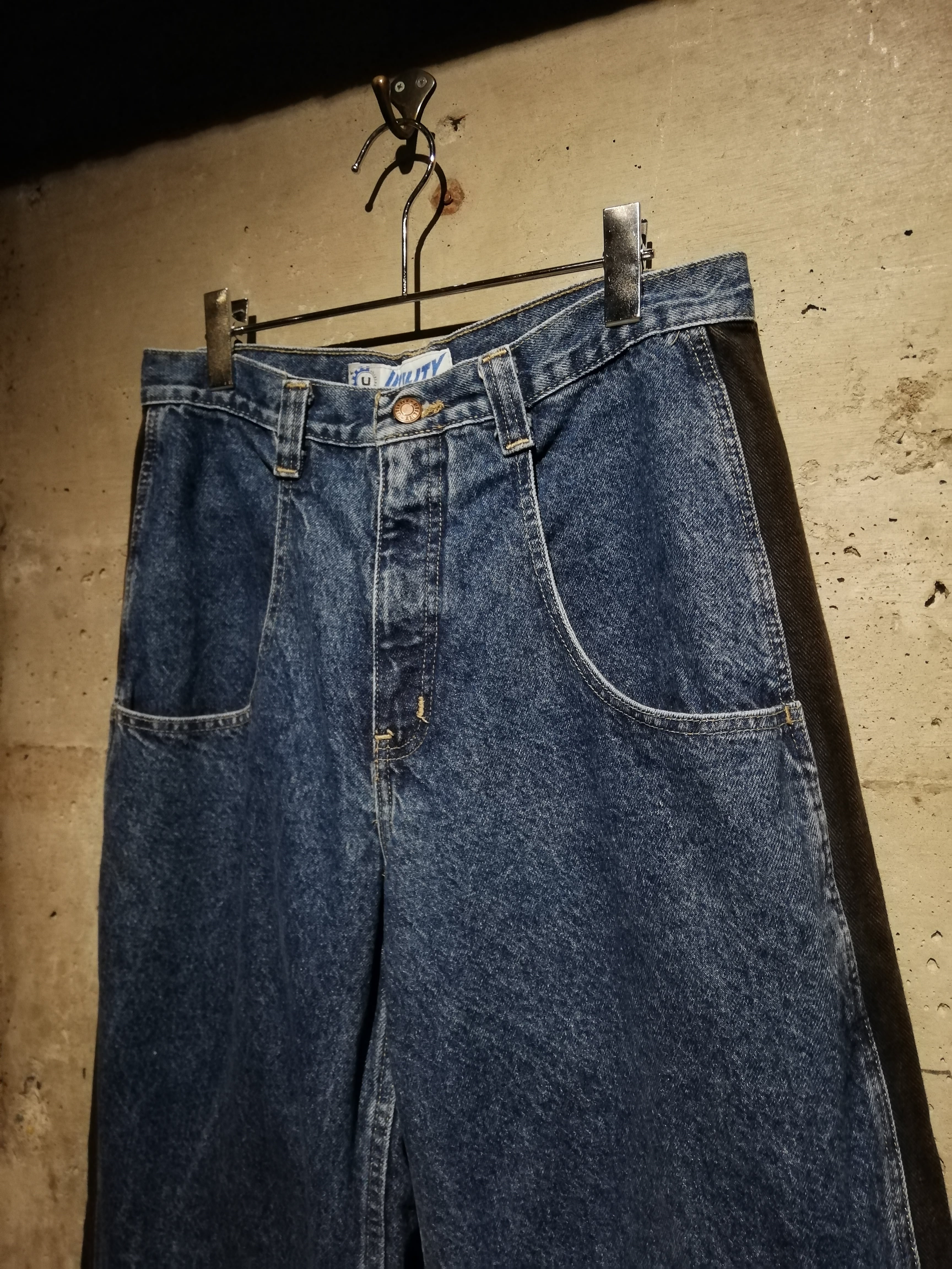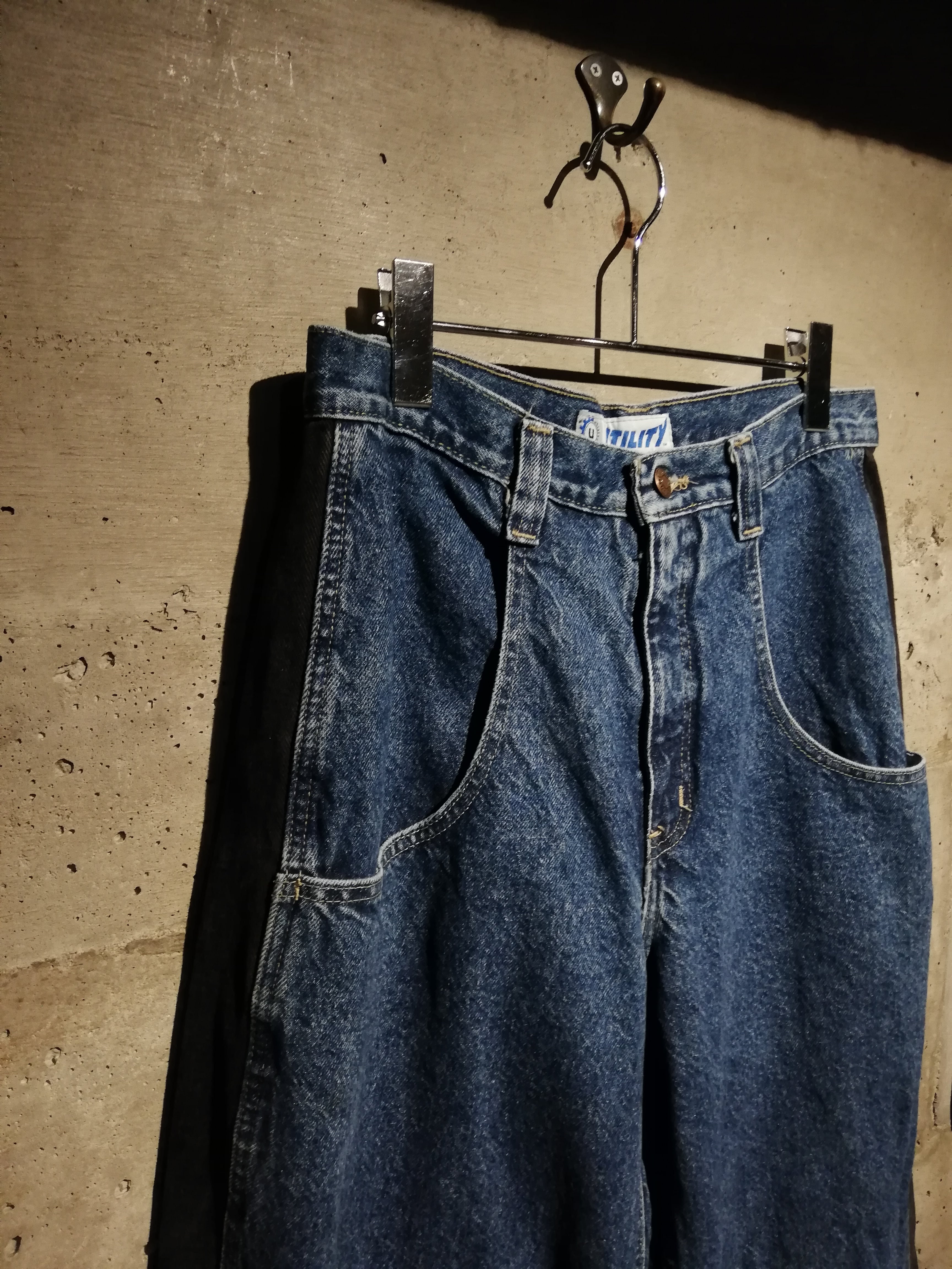 レイヴカルチャー全盛期を彷彿とさせる、独特なツートーン切り替え仕様の“UTILITY”レイヴデニムパンツ。