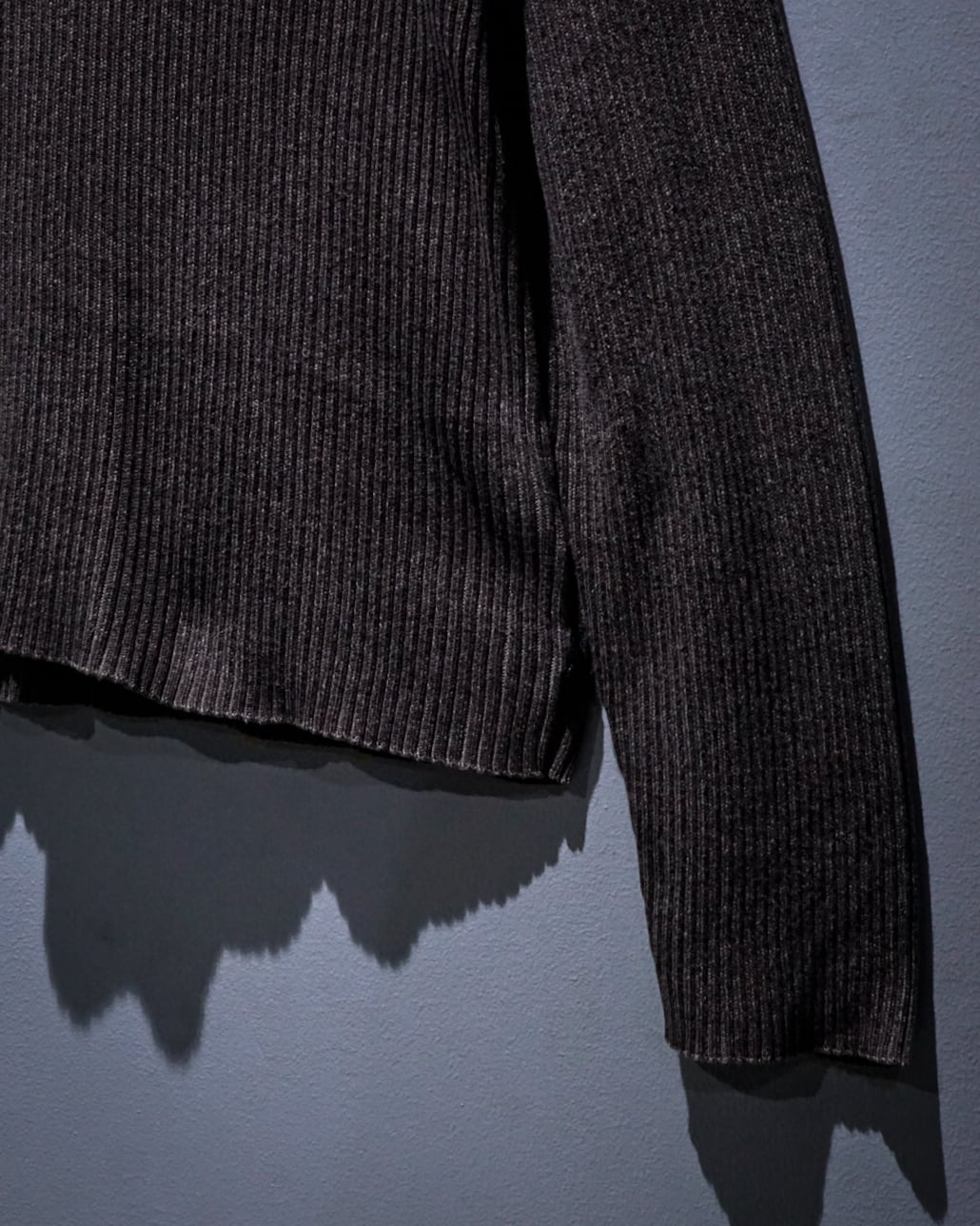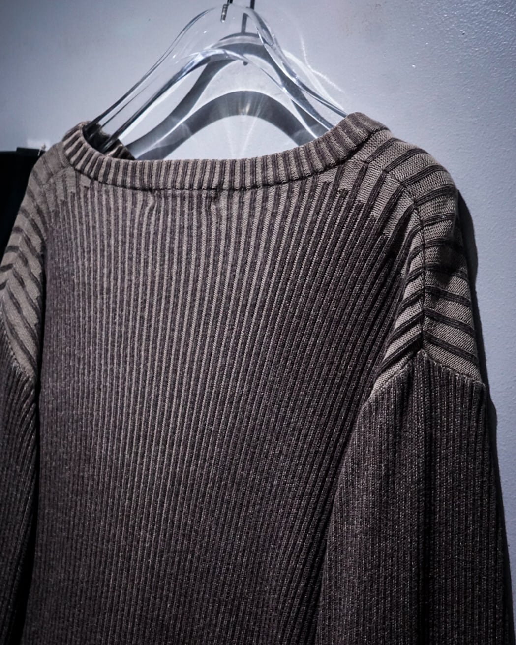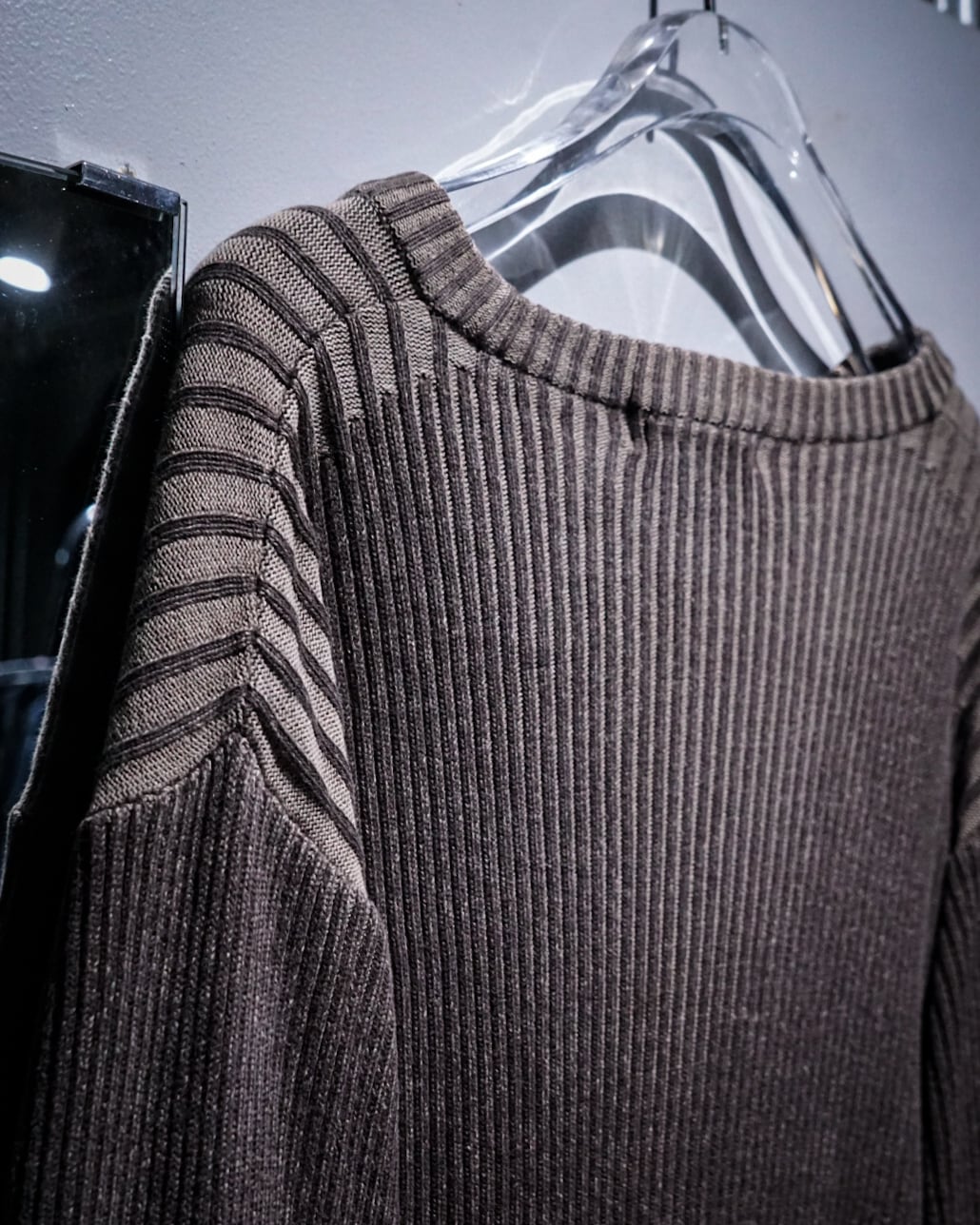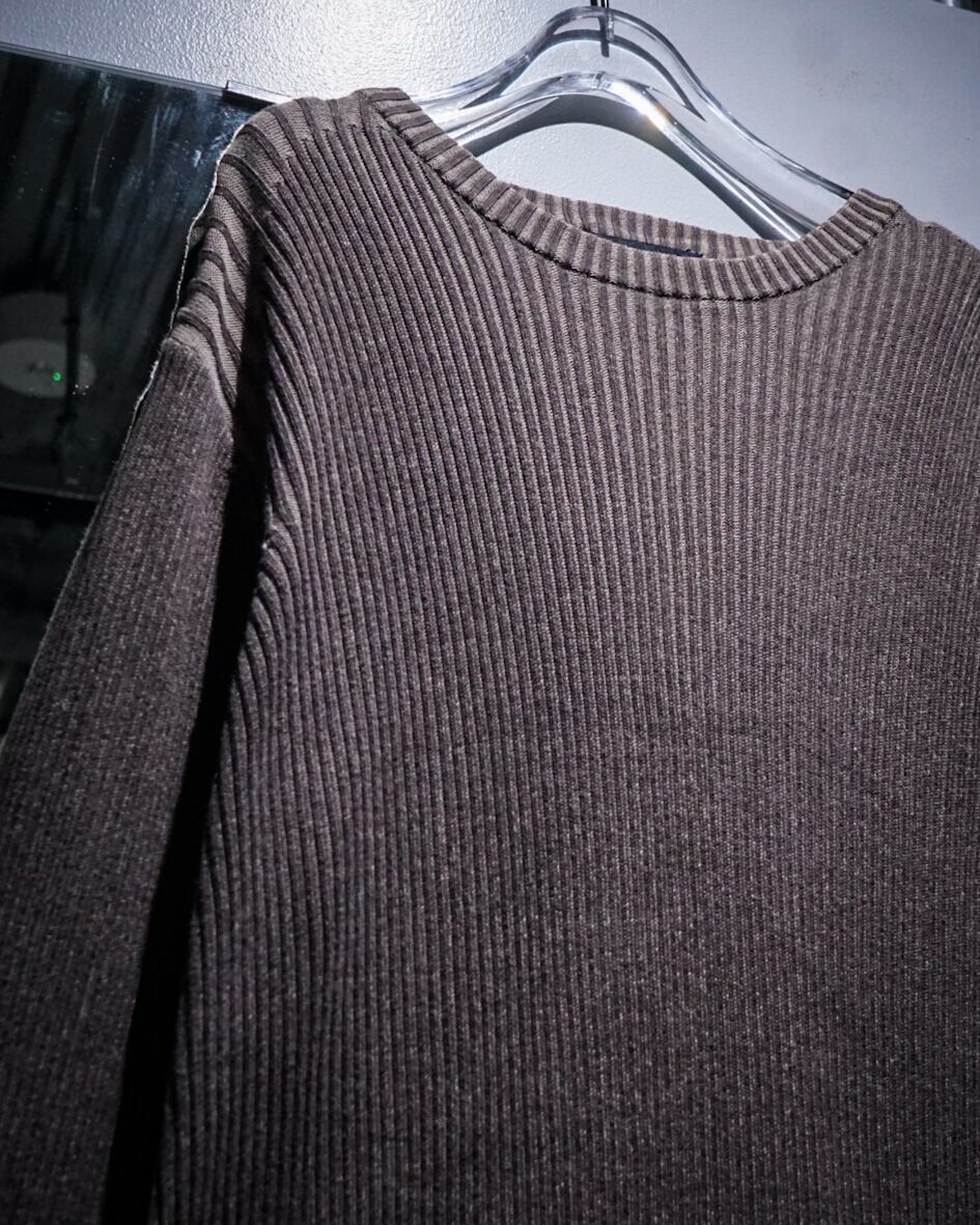 ブラウンベージュの落ち着いたトーンを纏ったリブ編みニット。全体を覆う縦畝のリブがシルエットを縦方向に美しく引き伸ばし、視覚的にもスッキリとしたラインを演出しています。
