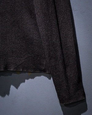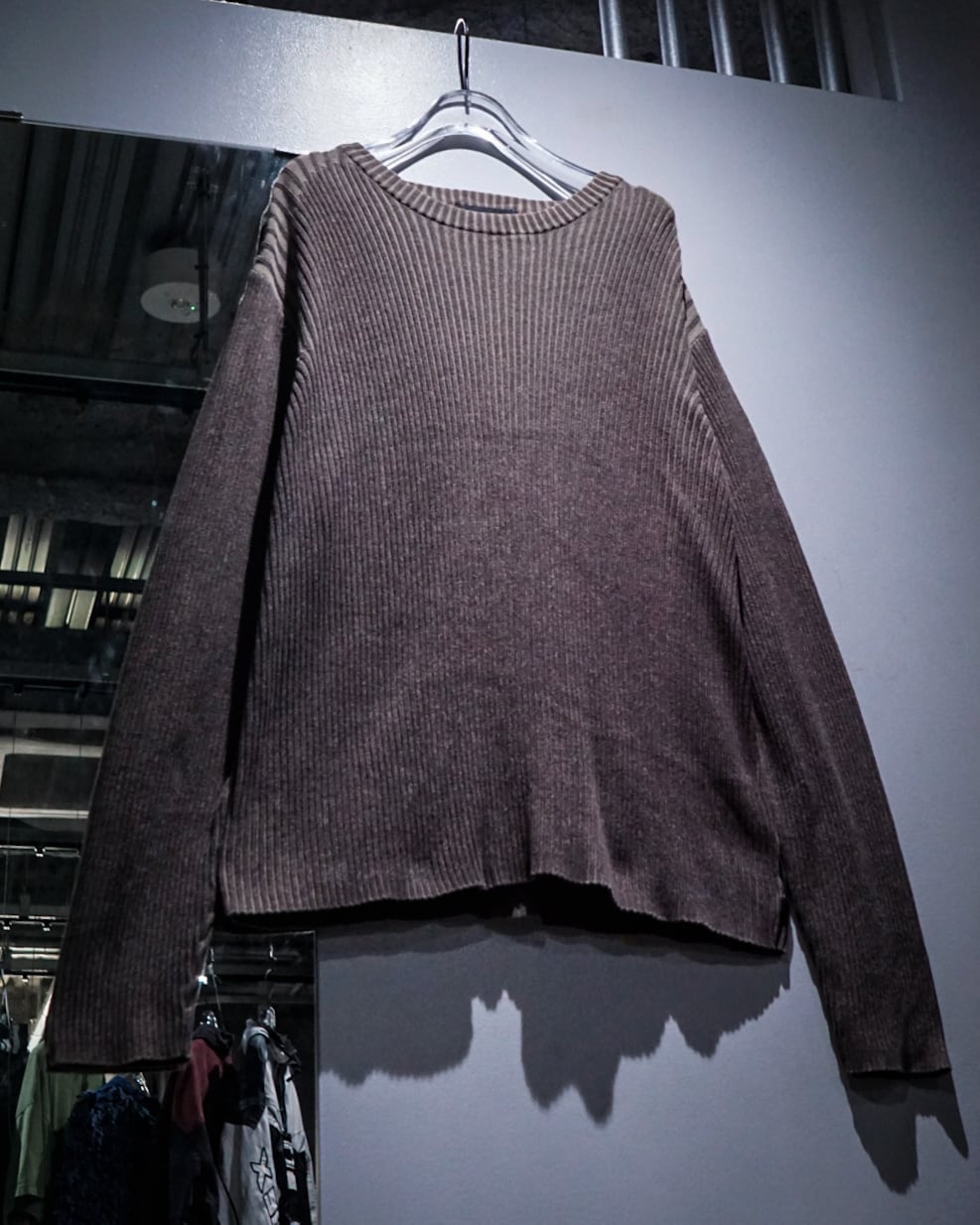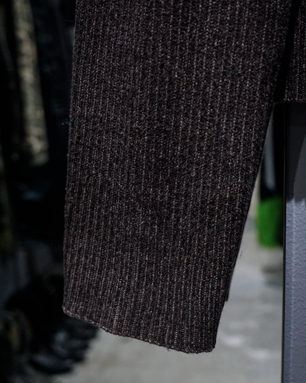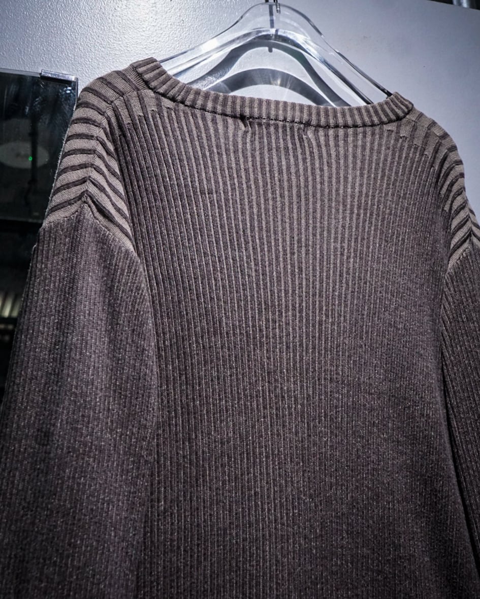 ブラウンベージュの落ち着いたトーンを纏ったリブ編みニット。全体を覆う縦畝のリブがシルエットを縦方向に美しく引き伸ばし、視覚的にもスッキリとしたラインを演出しています。