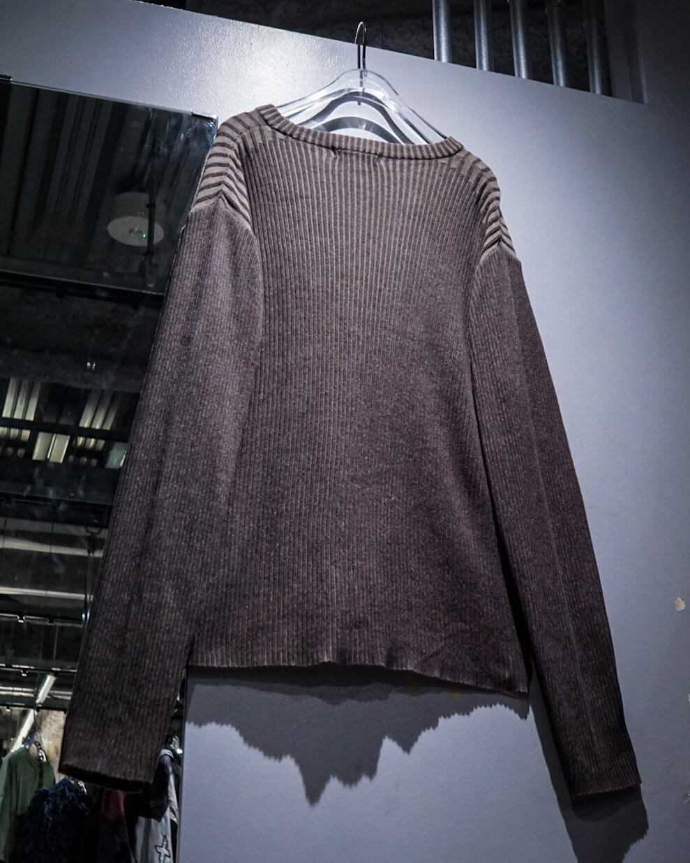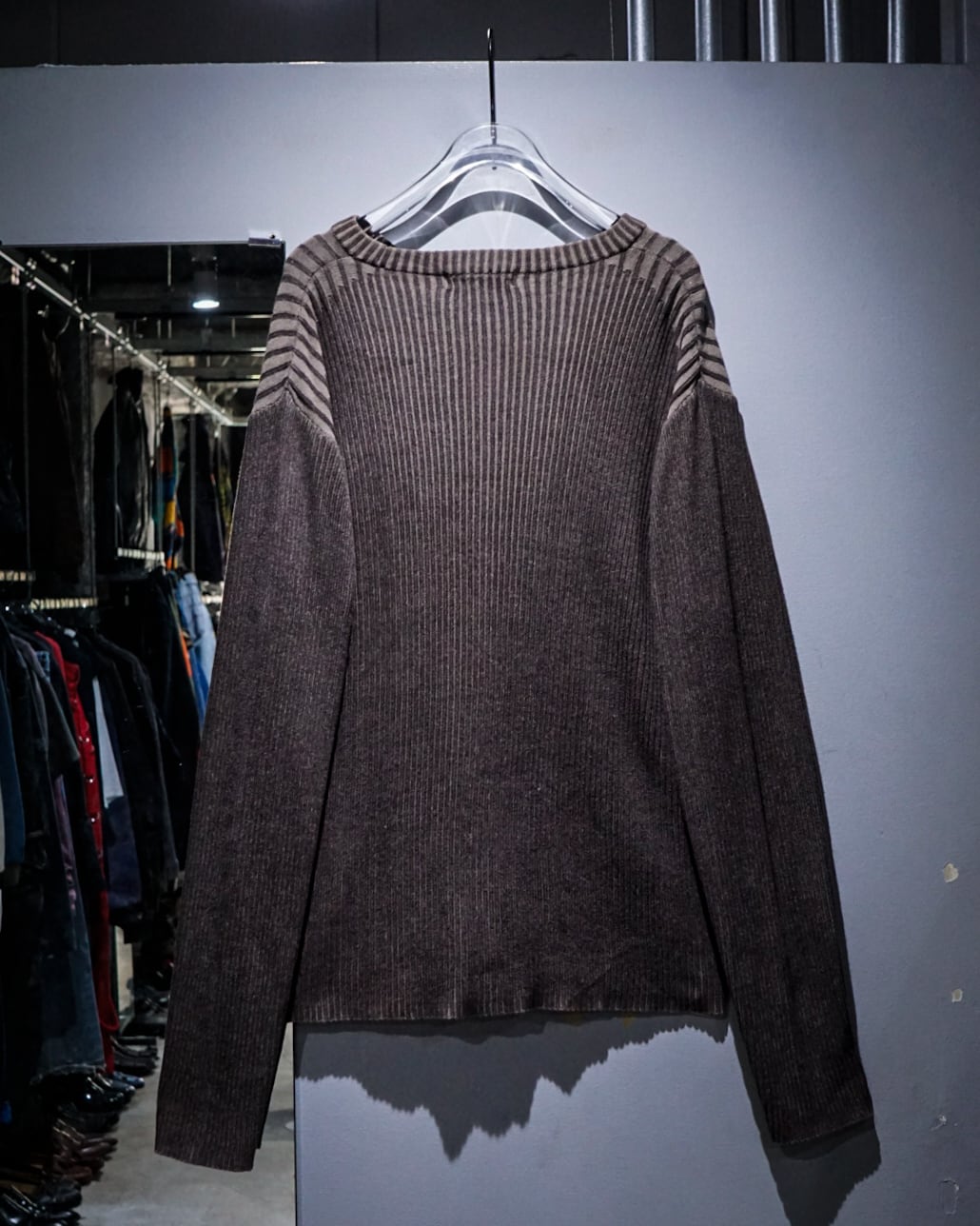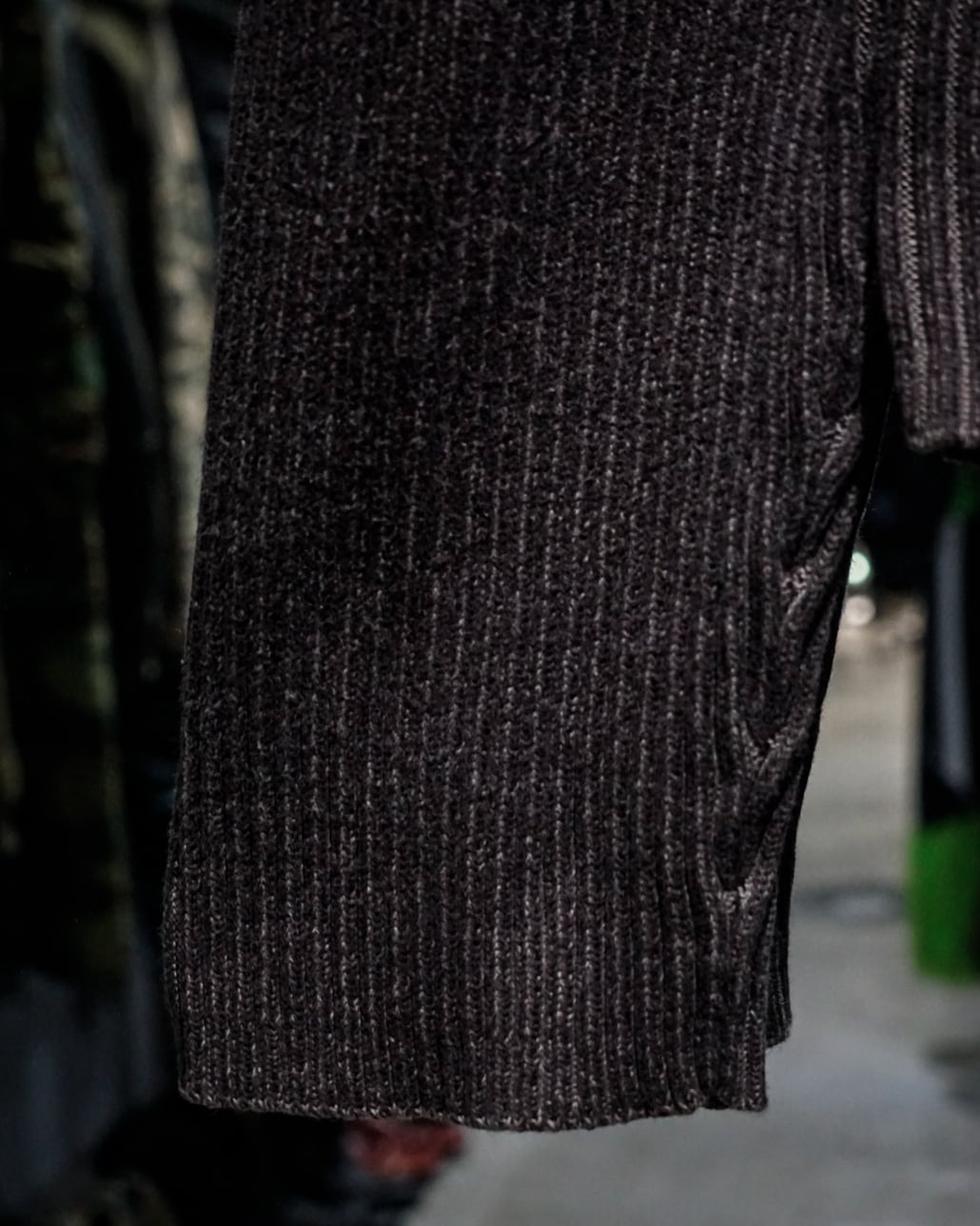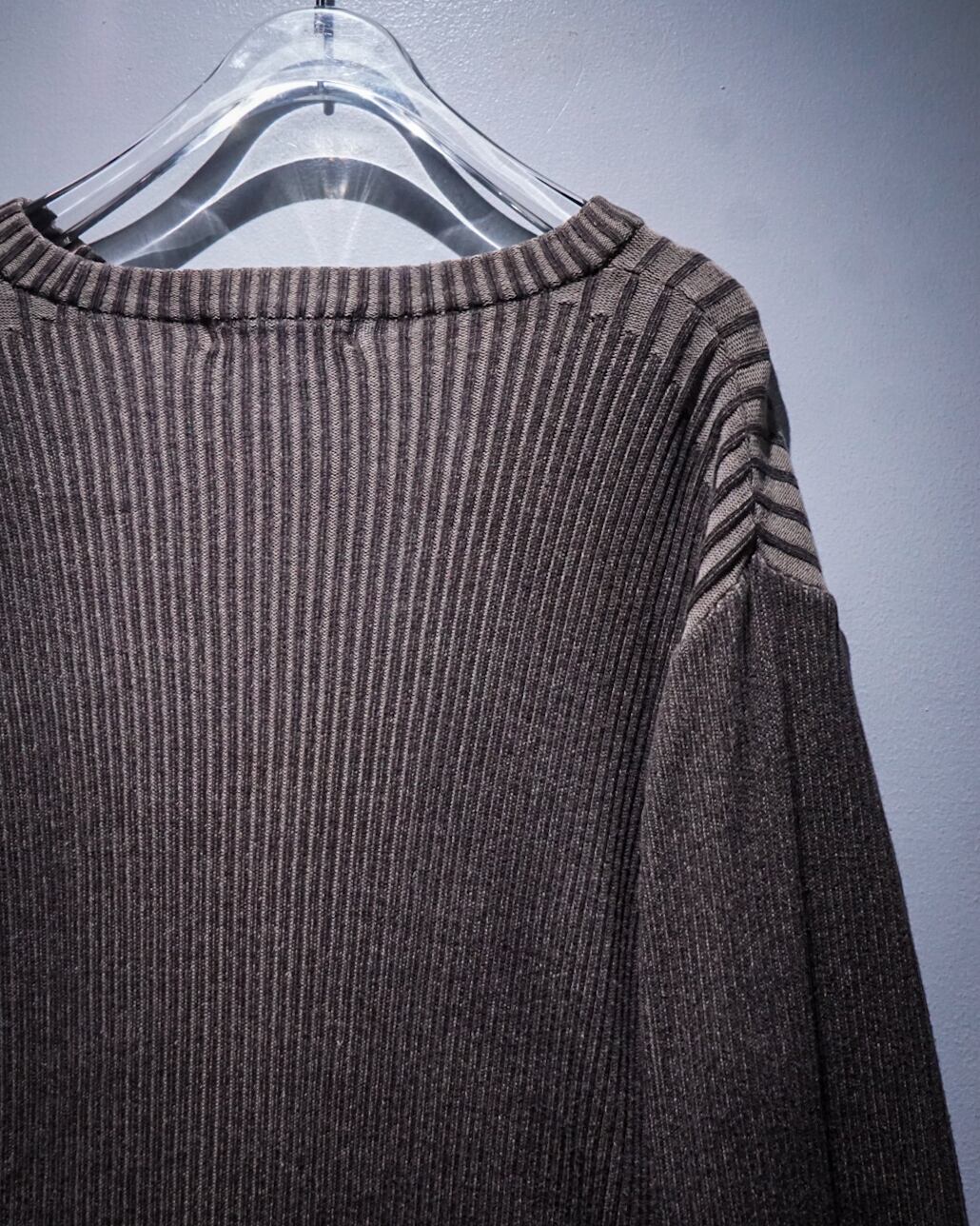 ブラウンベージュの落ち着いたトーンを纏ったリブ編みニット。全体を覆う縦畝のリブがシルエットを縦方向に美しく引き伸ばし、視覚的にもスッキリとしたラインを演出しています。