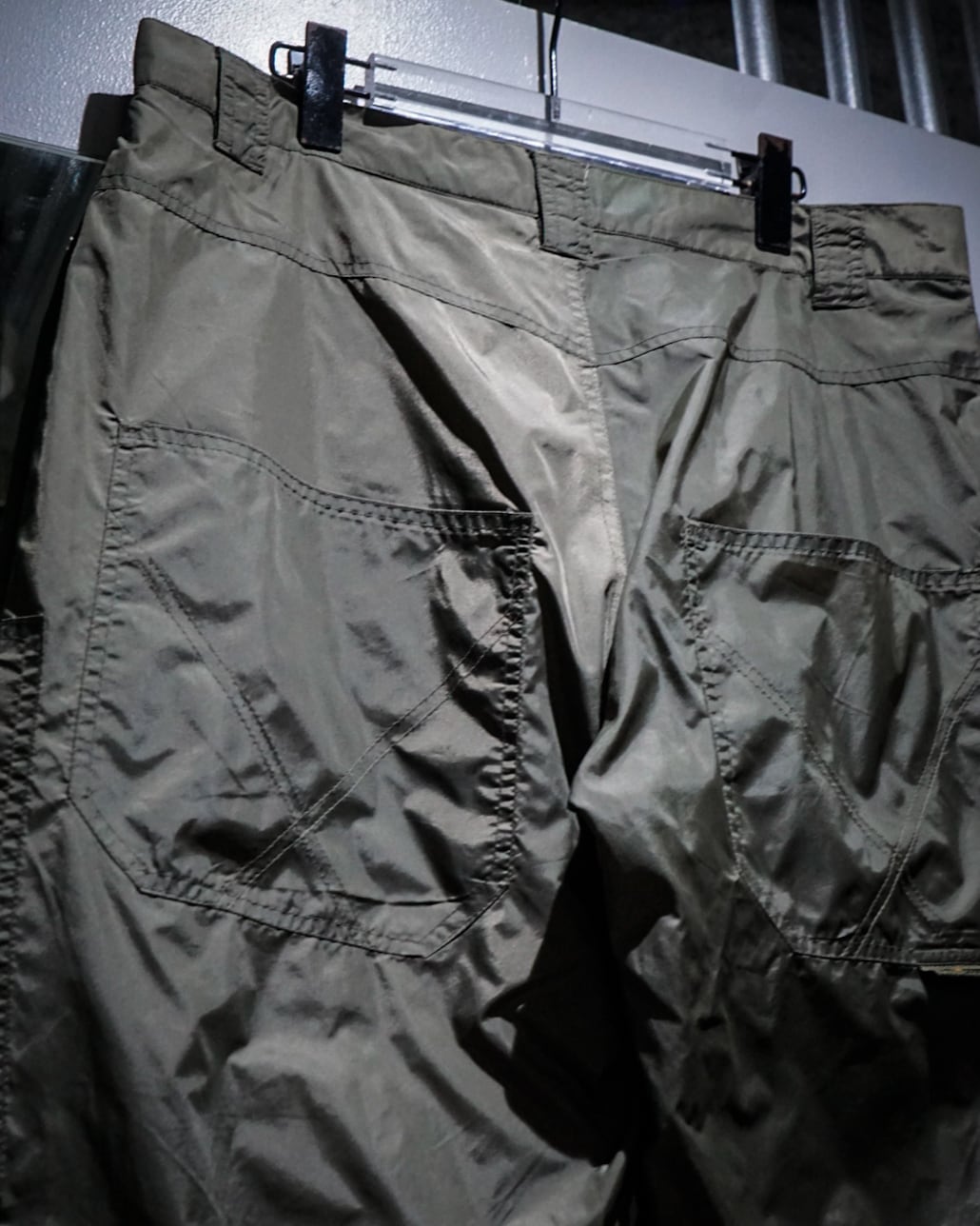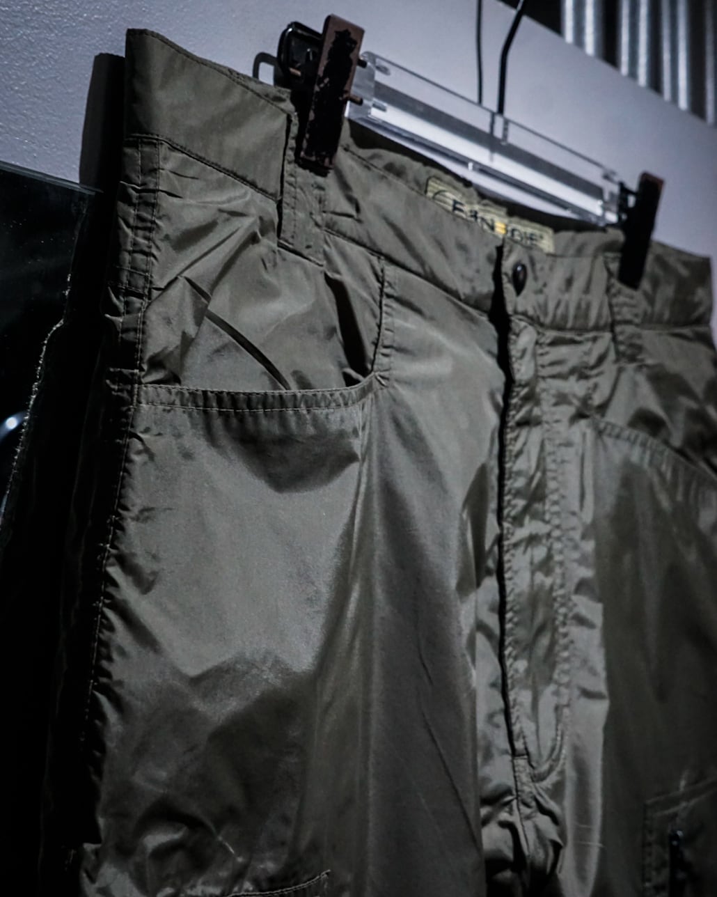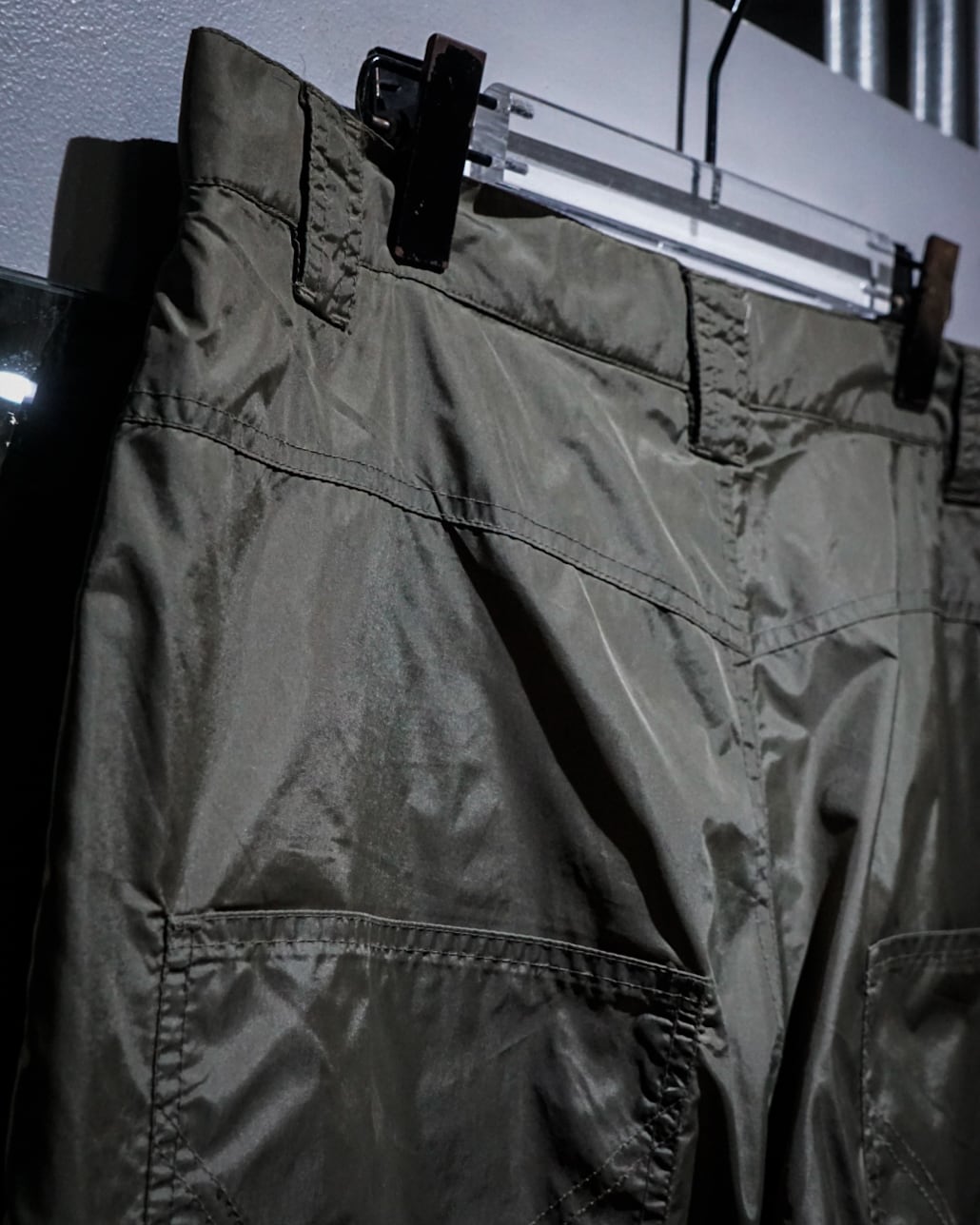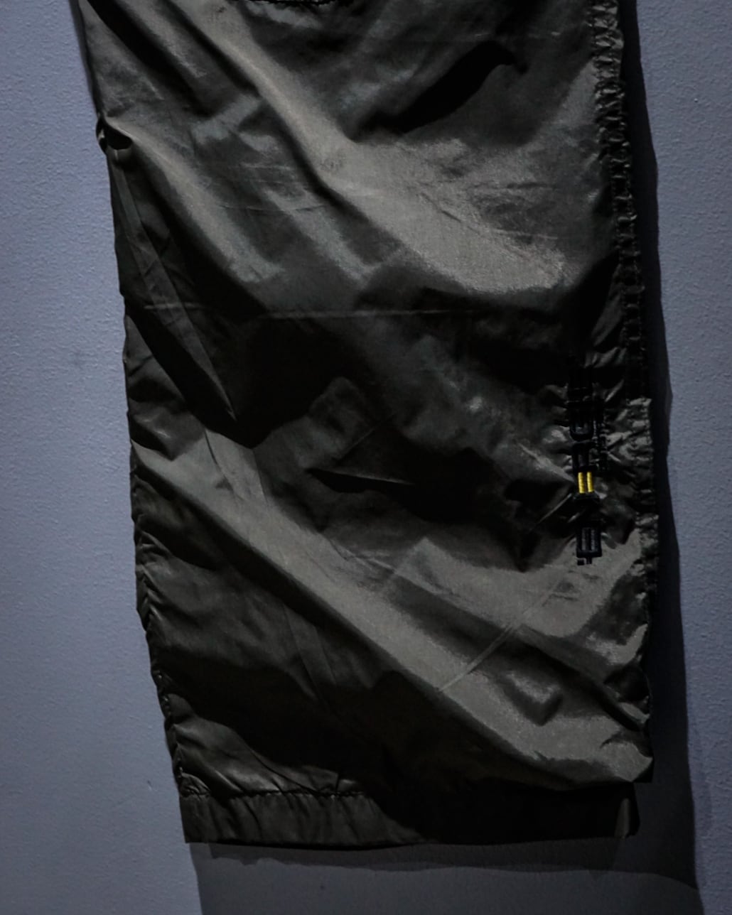 ハリと光沢を帯びたオリーブトーンのナイロンボディは、光の角度で表情を変えながらも都会的なムードを演出。膝部分には補強を兼ねたダブルニー切り替えが入り、立体的なシルエットを生み出しているのも見逃せません。