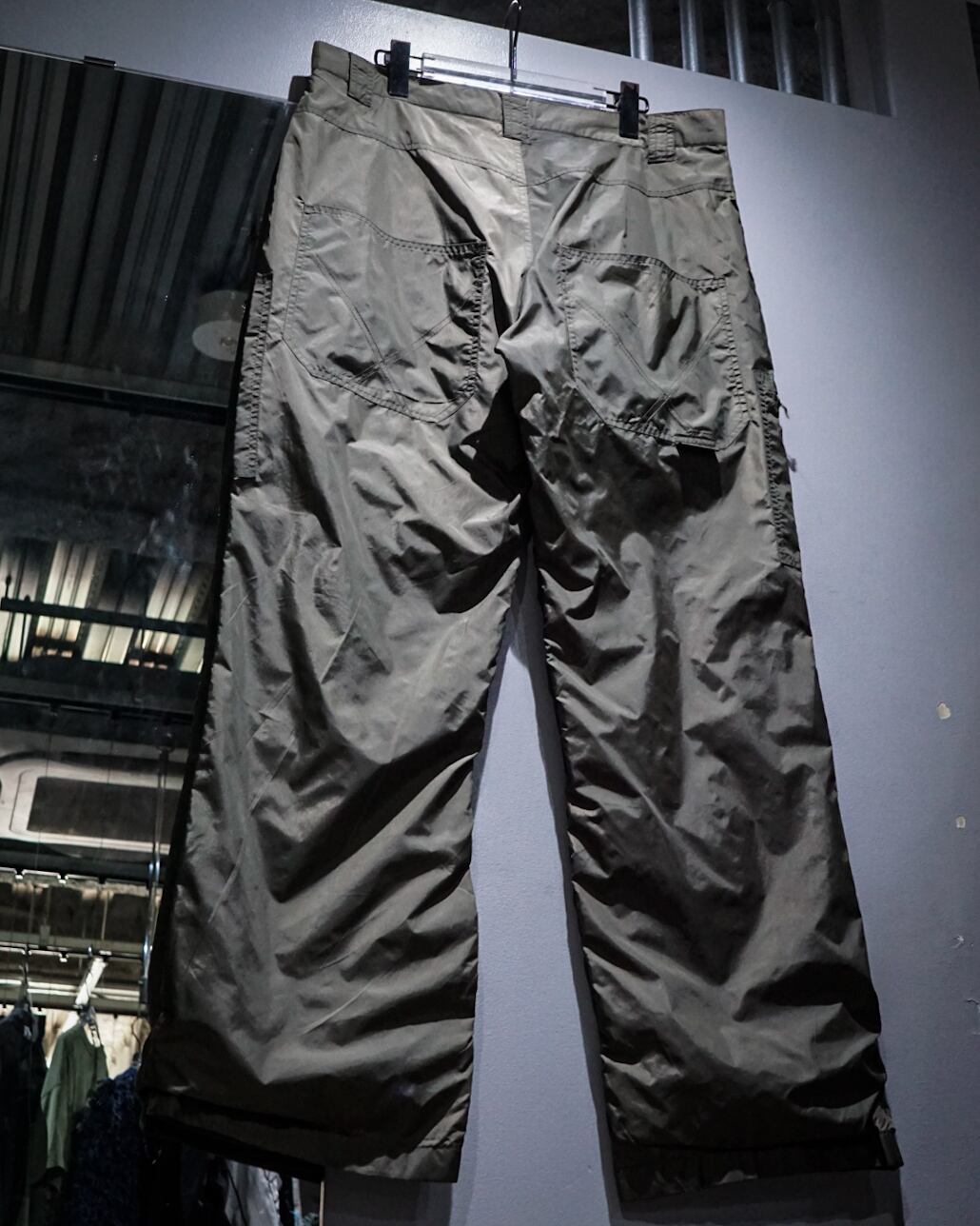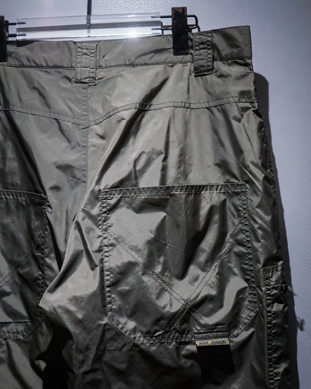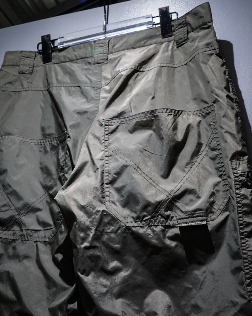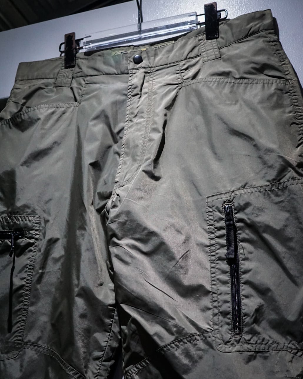 ハリと光沢を帯びたオリーブトーンのナイロンボディは、光の角度で表情を変えながらも都会的なムードを演出。膝部分には補強を兼ねたダブルニー切り替えが入り、立体的なシルエットを生み出しているのも見逃せません。
