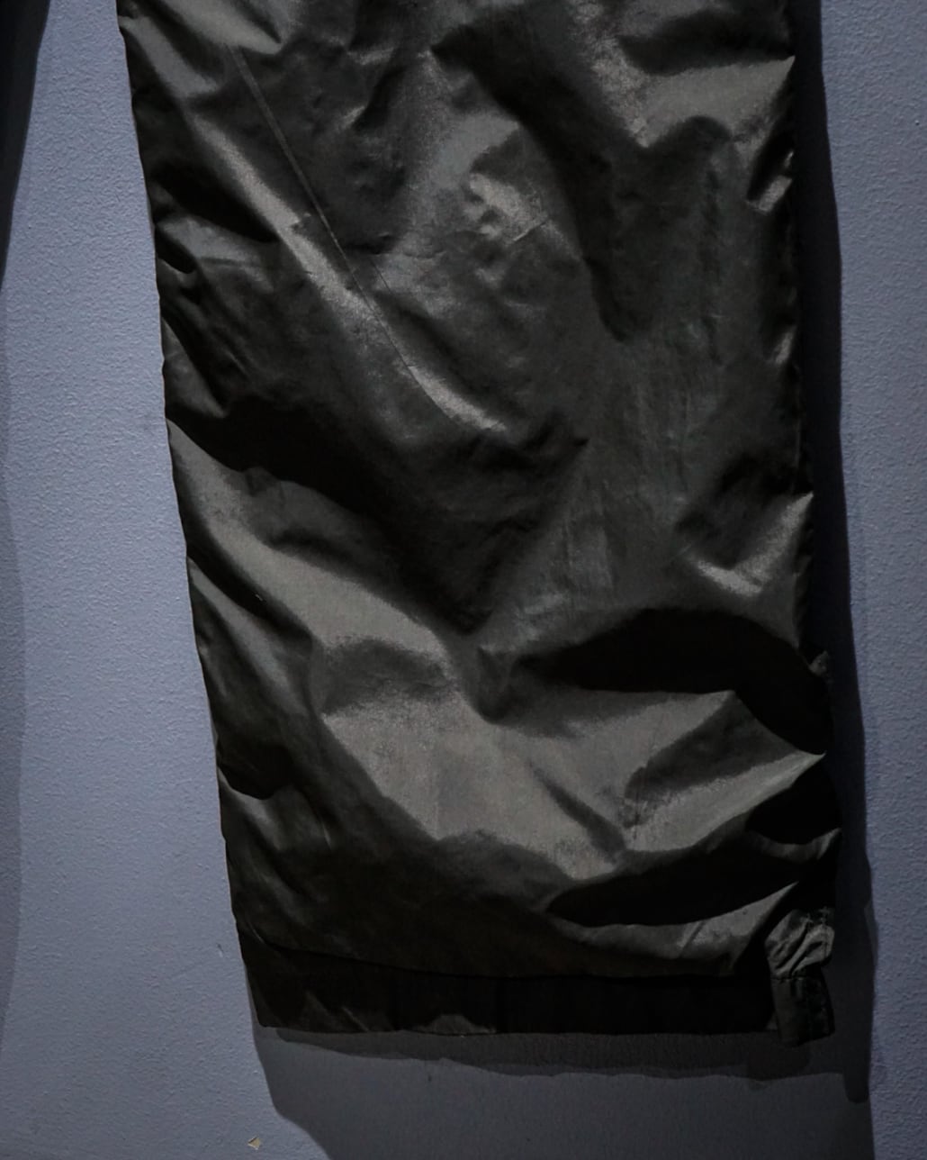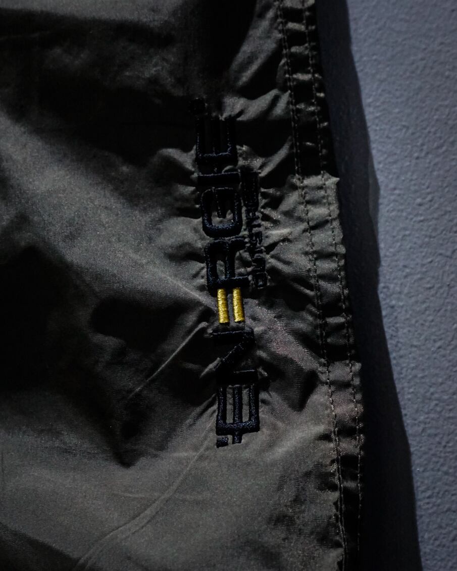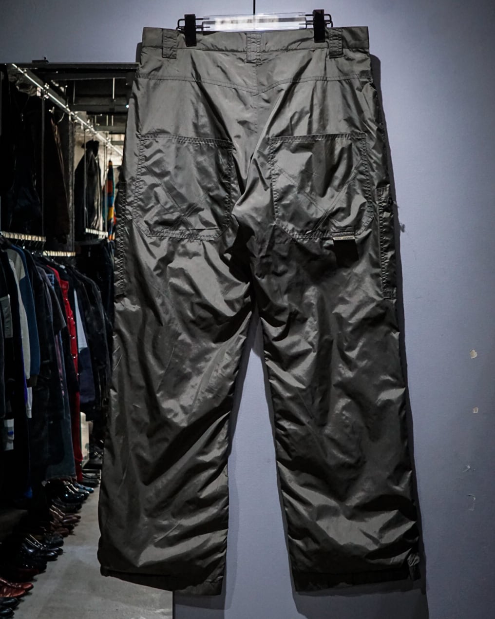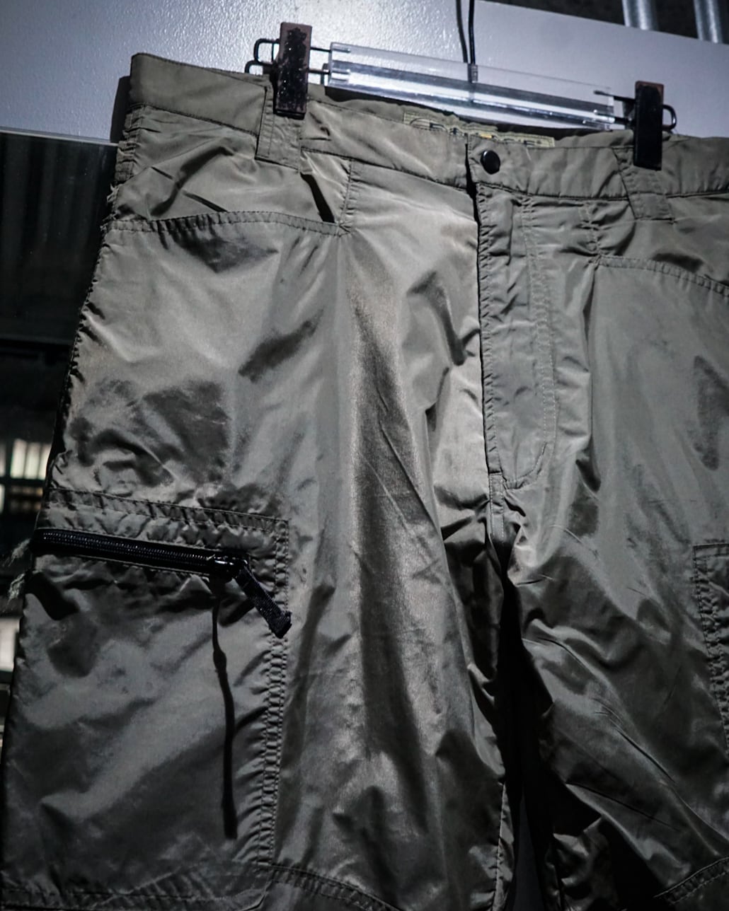 ハリと光沢を帯びたオリーブトーンのナイロンボディは、光の角度で表情を変えながらも都会的なムードを演出。膝部分には補強を兼ねたダブルニー切り替えが入り、立体的なシルエットを生み出しているのも見逃せません。