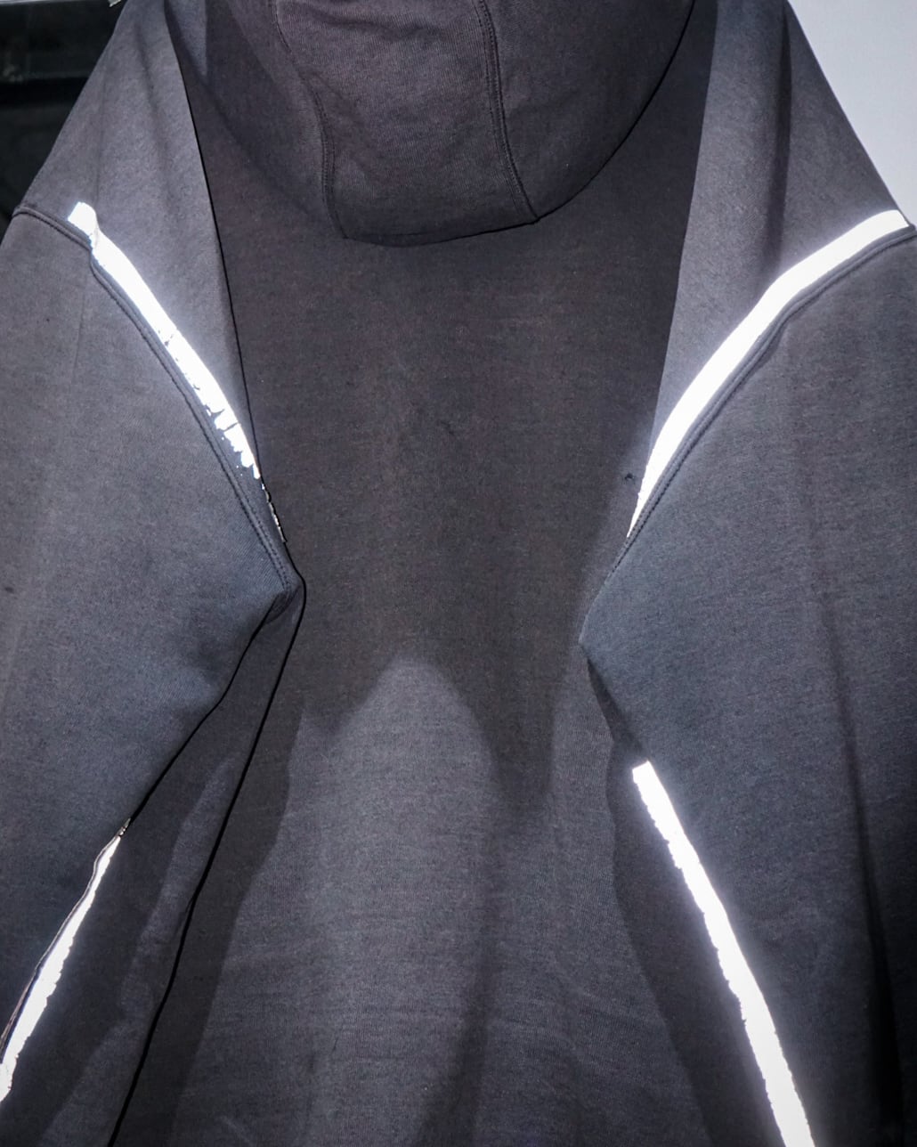 リフレクターによる直線的なラインワークと、アーティスティックなハンドペイントがワークウェアの無骨さにストリート的なエッジを注ぎ込み、カルチャーと共鳴するような、他では手に入らないスタイルを確立しています。特にリフレクターは光を反射することで視覚的なアクセントとなり、夜間のシーンでもその存在感を際立たせます。