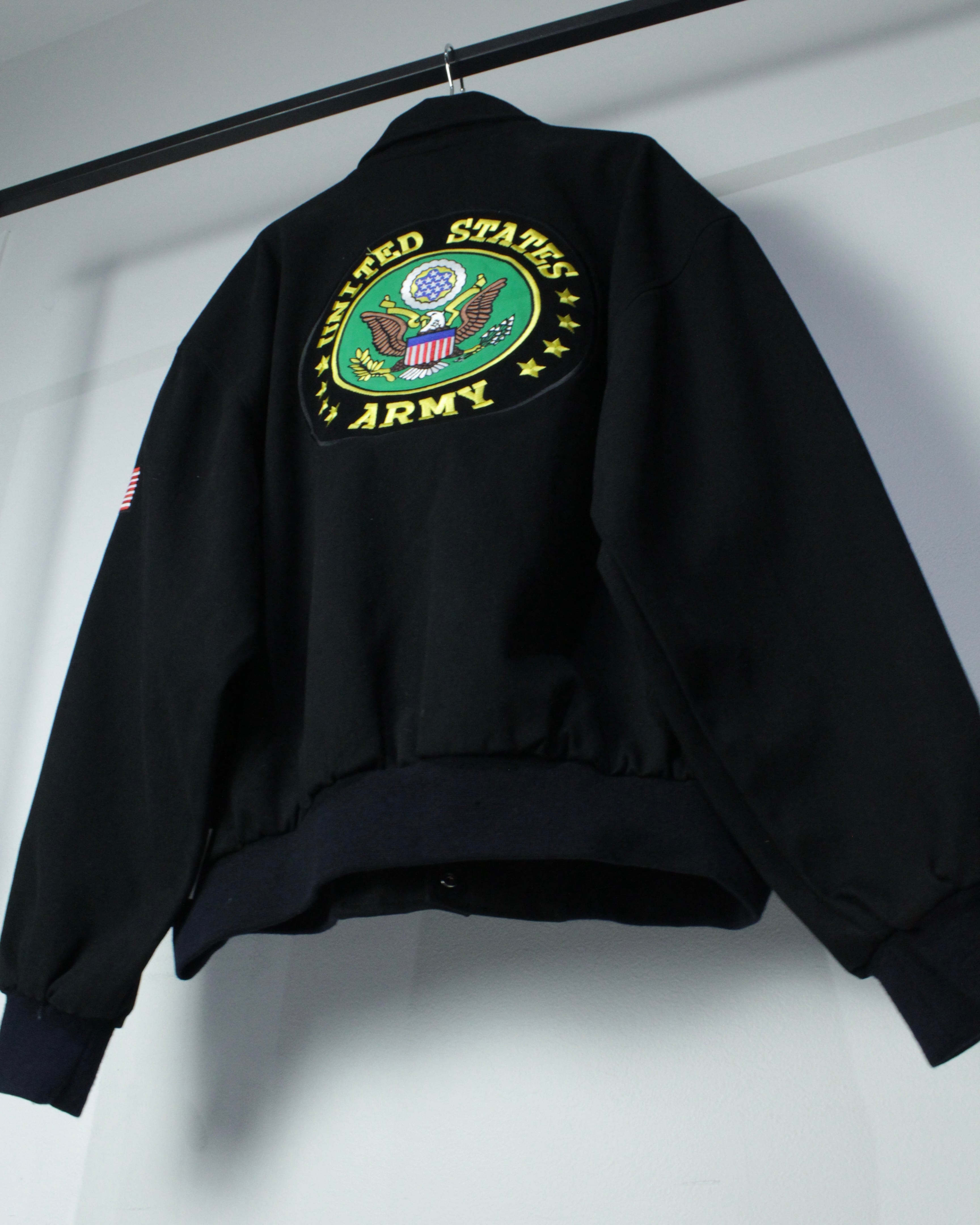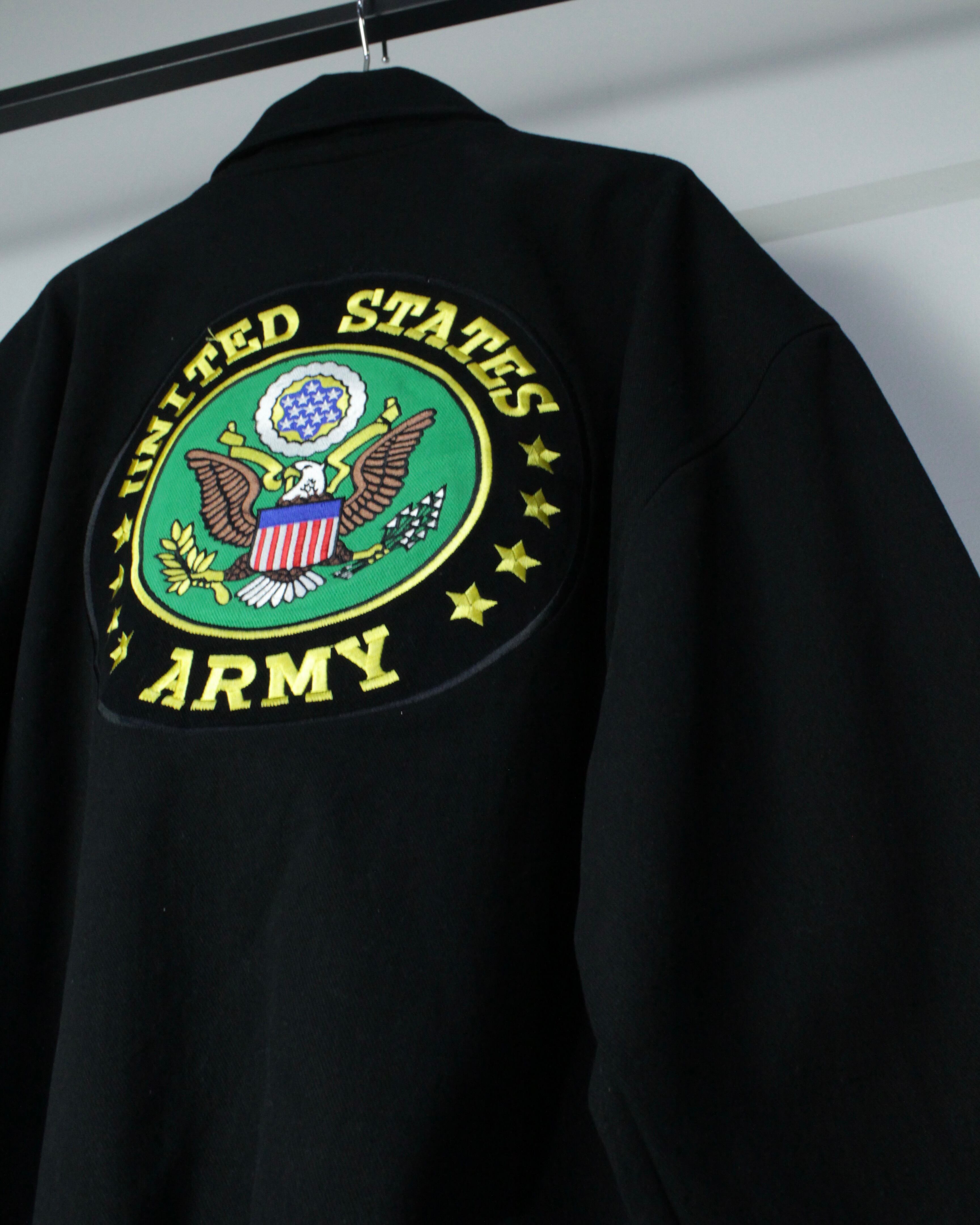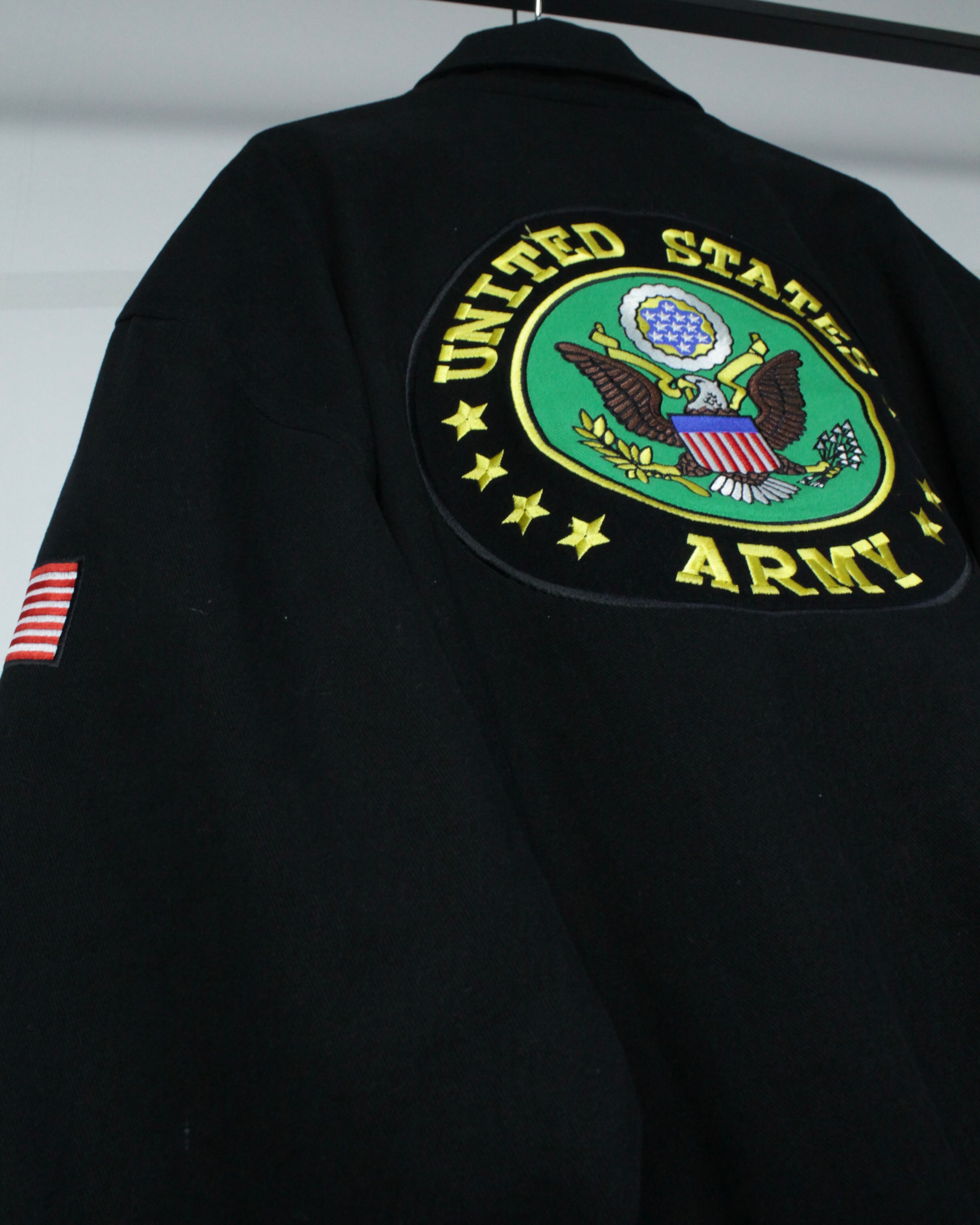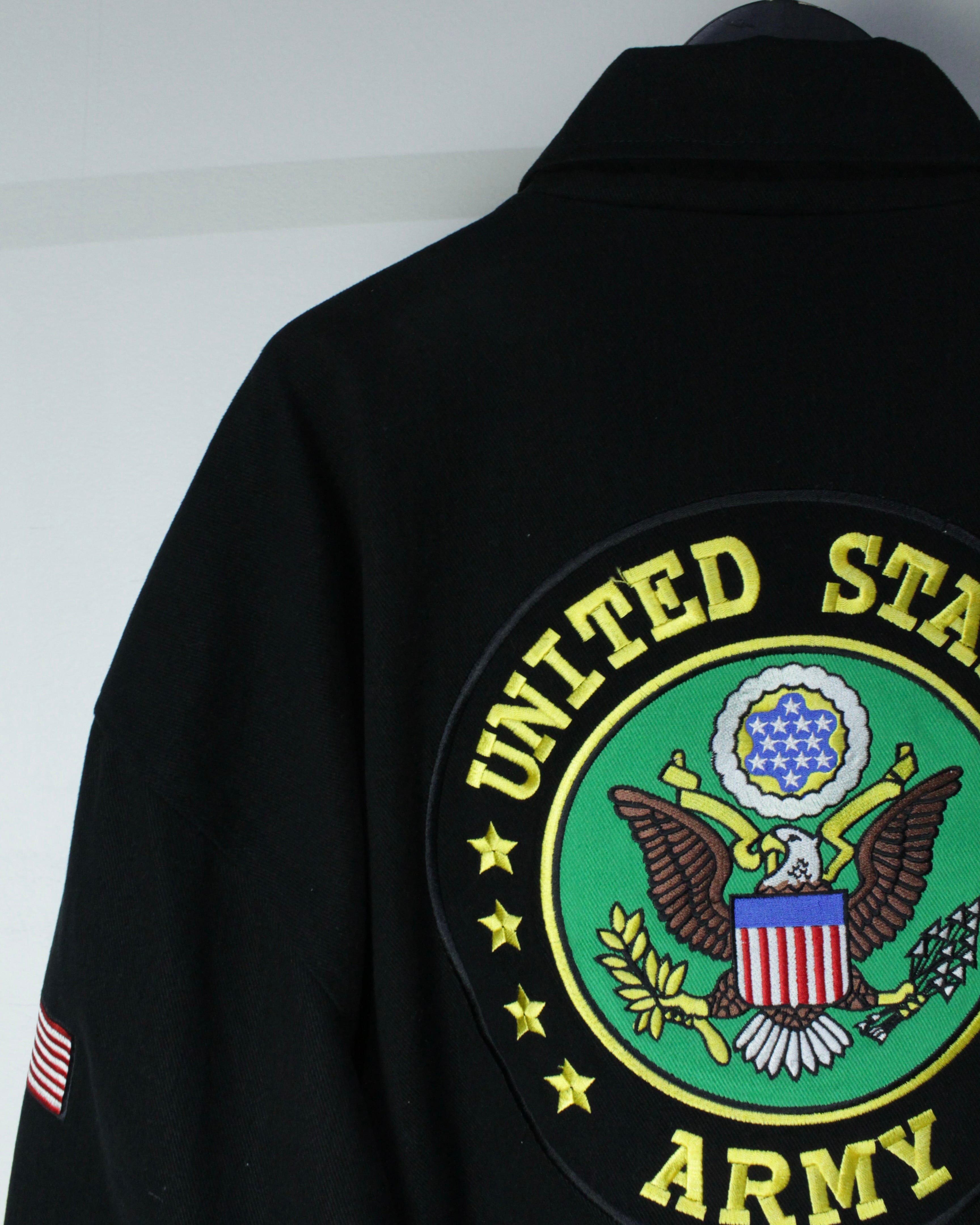 ブラックの生地をキャンバスに、フロントには「U.S.ARMY」ロゴとスターを配したアイコニックなパッチ、袖には星条旗ワッペン、そして背面には圧倒的存在感の特大エンブレム刺繍をON。全方位から視線を惹きつける、ミリタリーとストリートの融合を体現した1着。